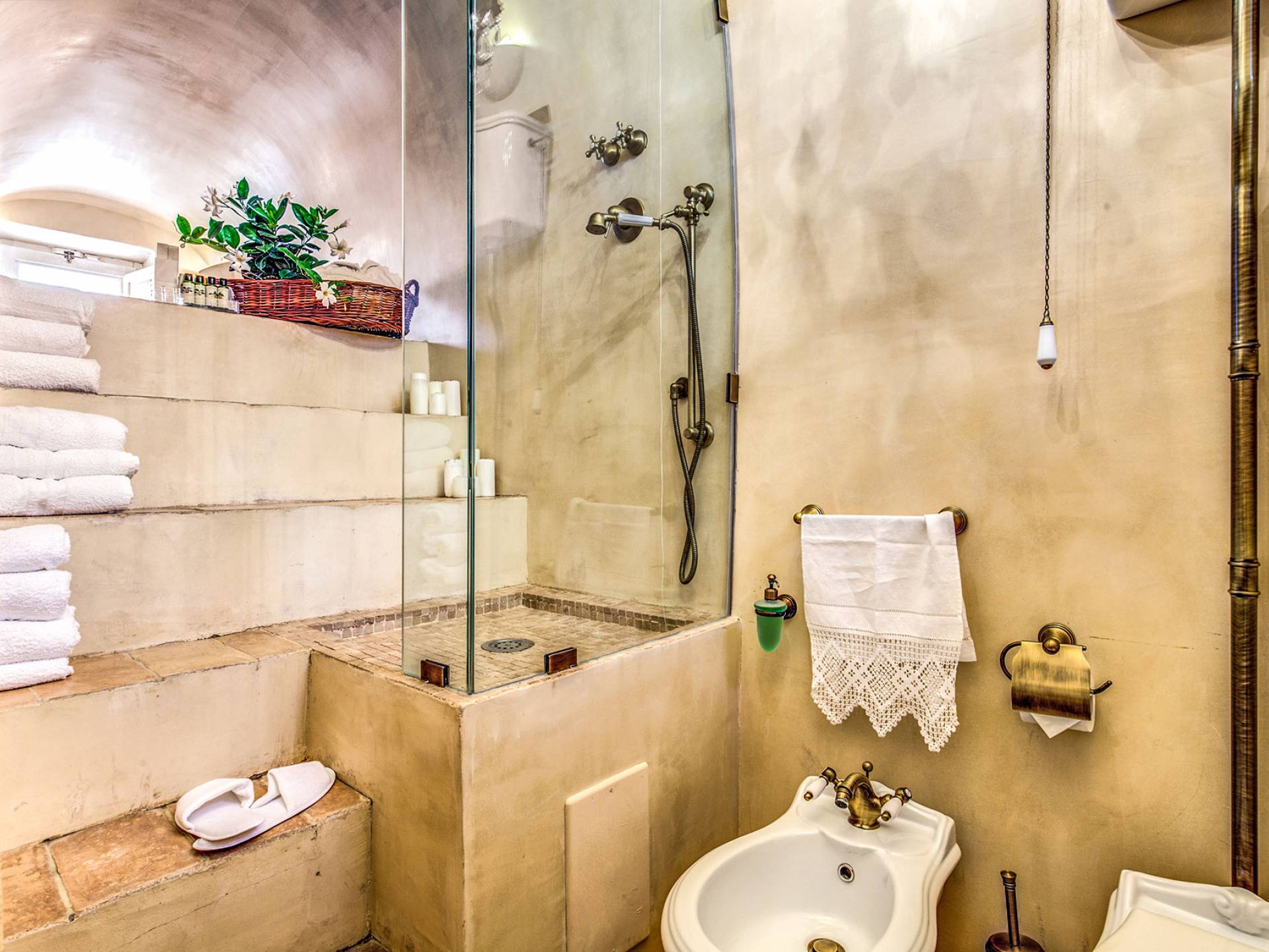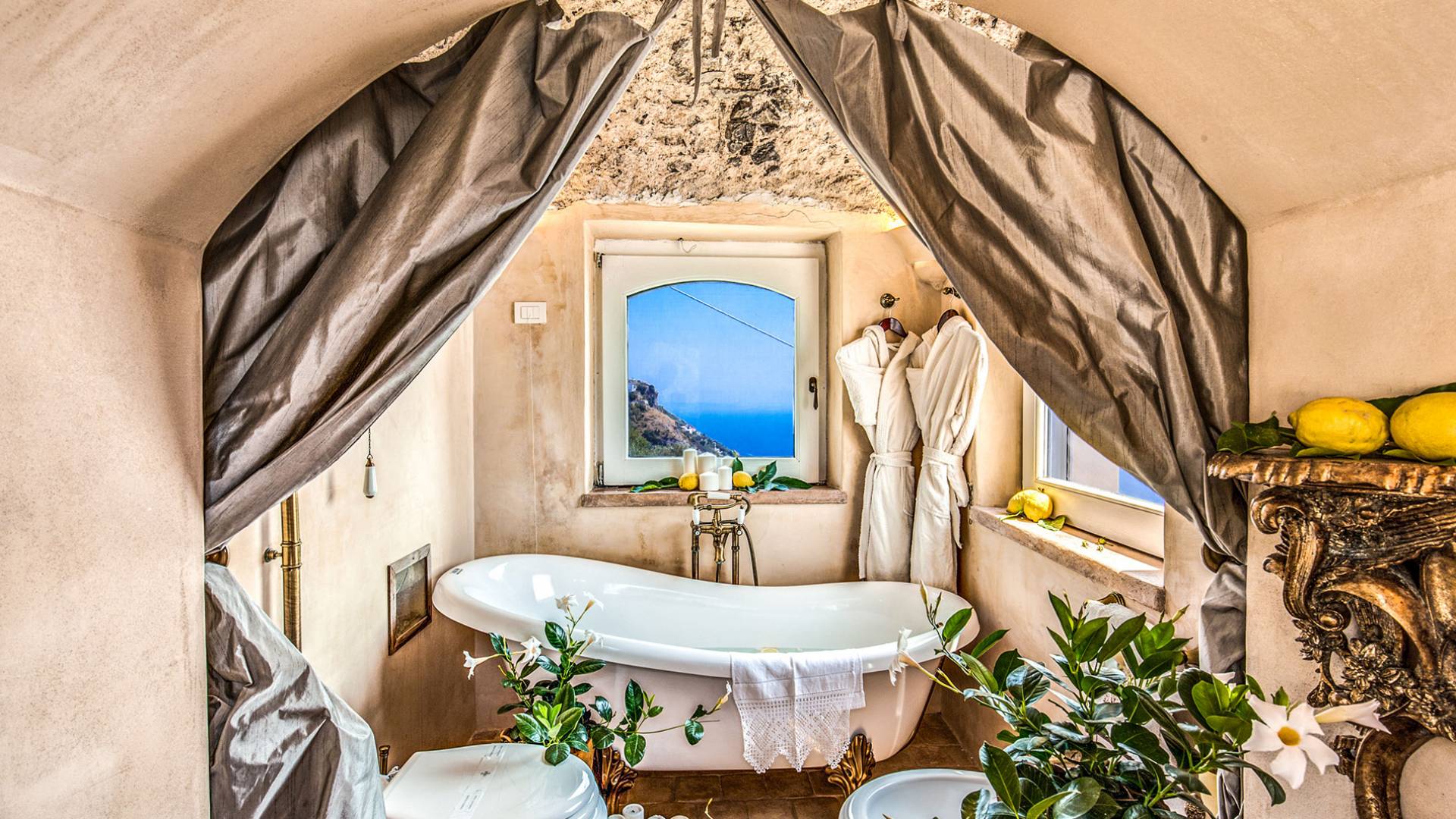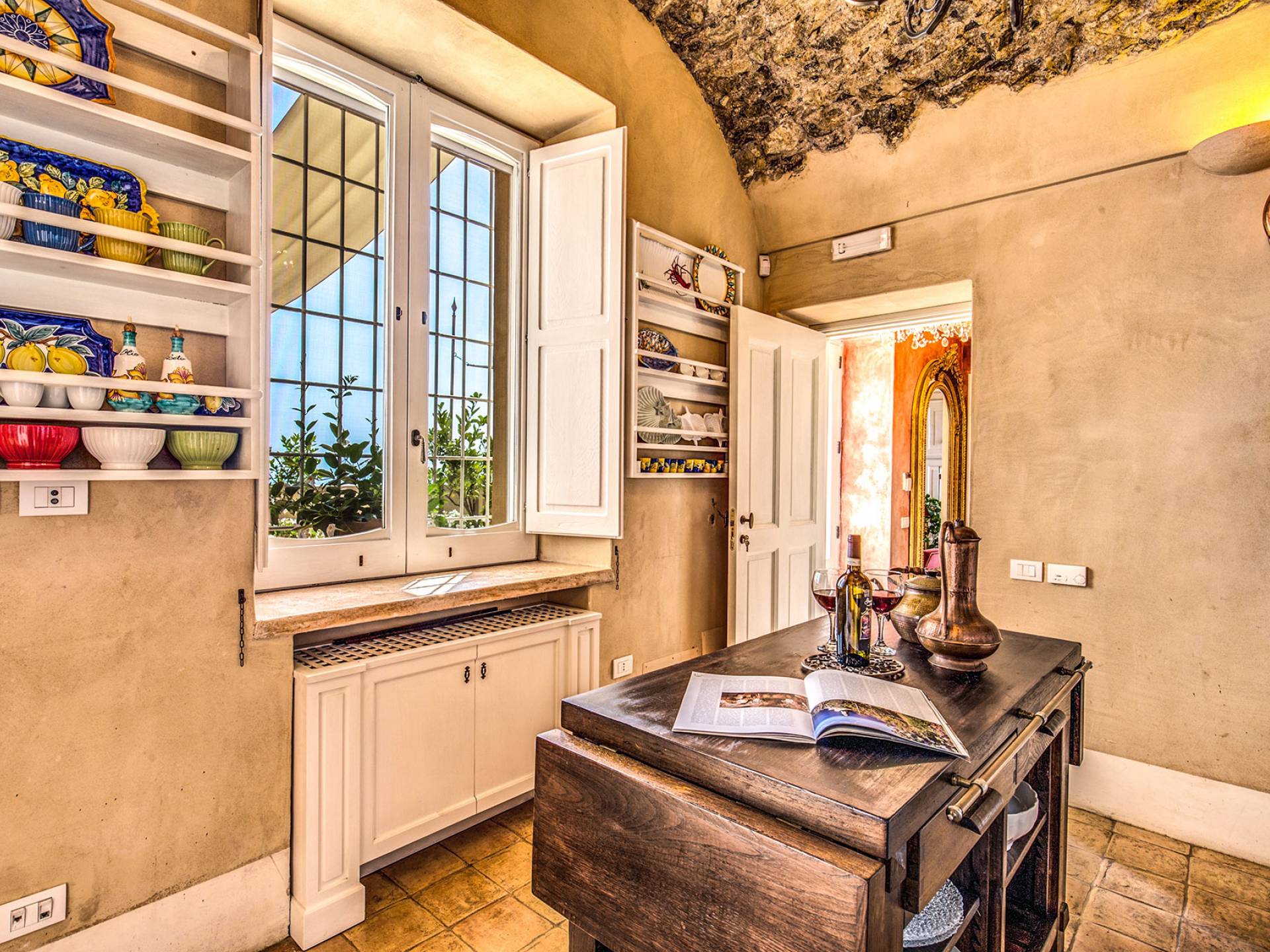 The limonaia offers a double bedroomed suite for 4 people with a private bathroom, making this villa perfect for families. The property overlooks a garden with ancient olive trees and a unique view of the sea, together with a sea-salt infinity swimming pool which is one of the ten bests of the entire Amalfi Coast. The garden surrounding the villa is spread across several terraces facing the sea and it’s planted with old olive trees and maritime pines.