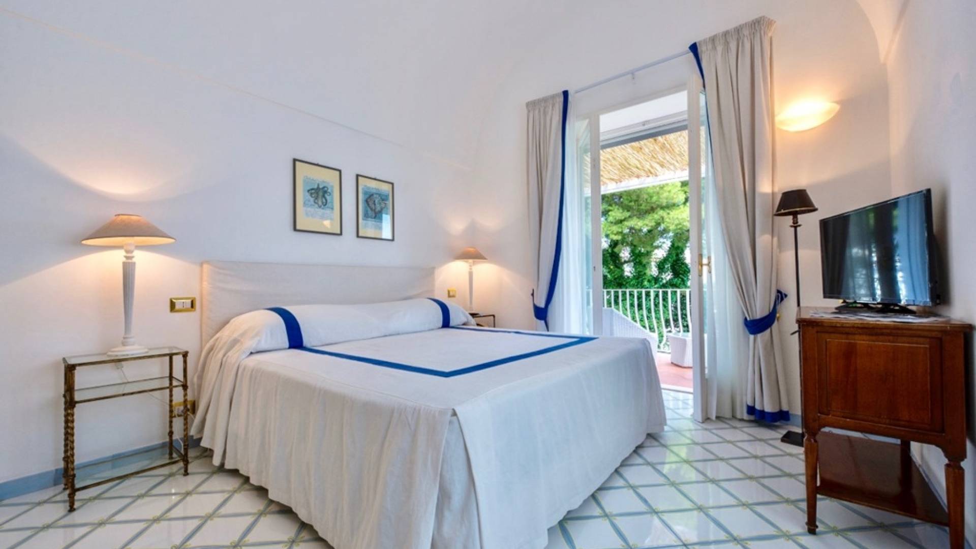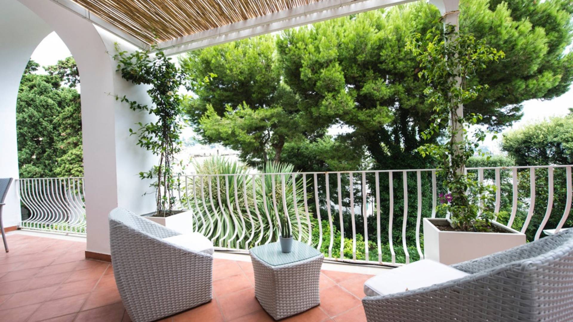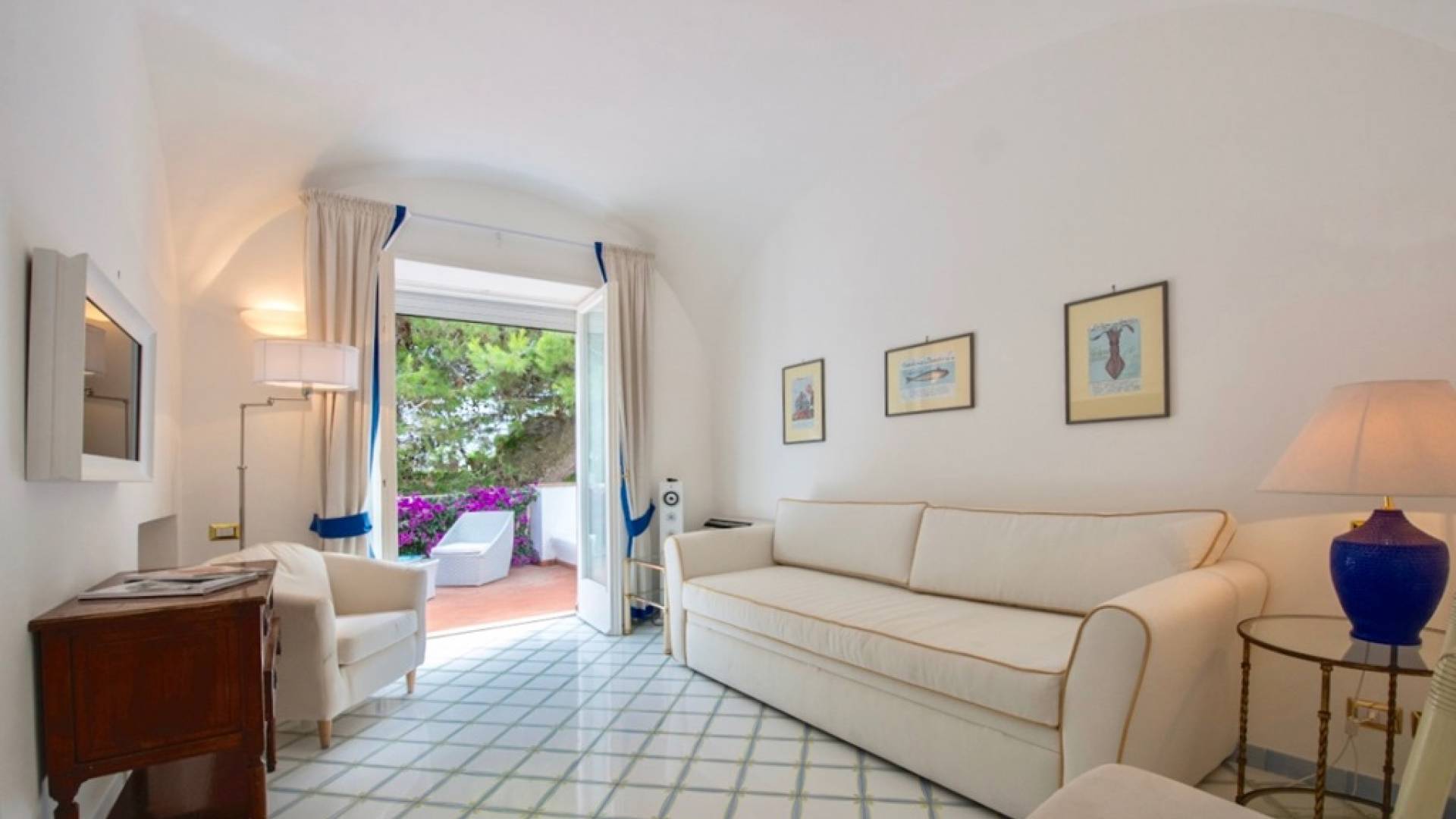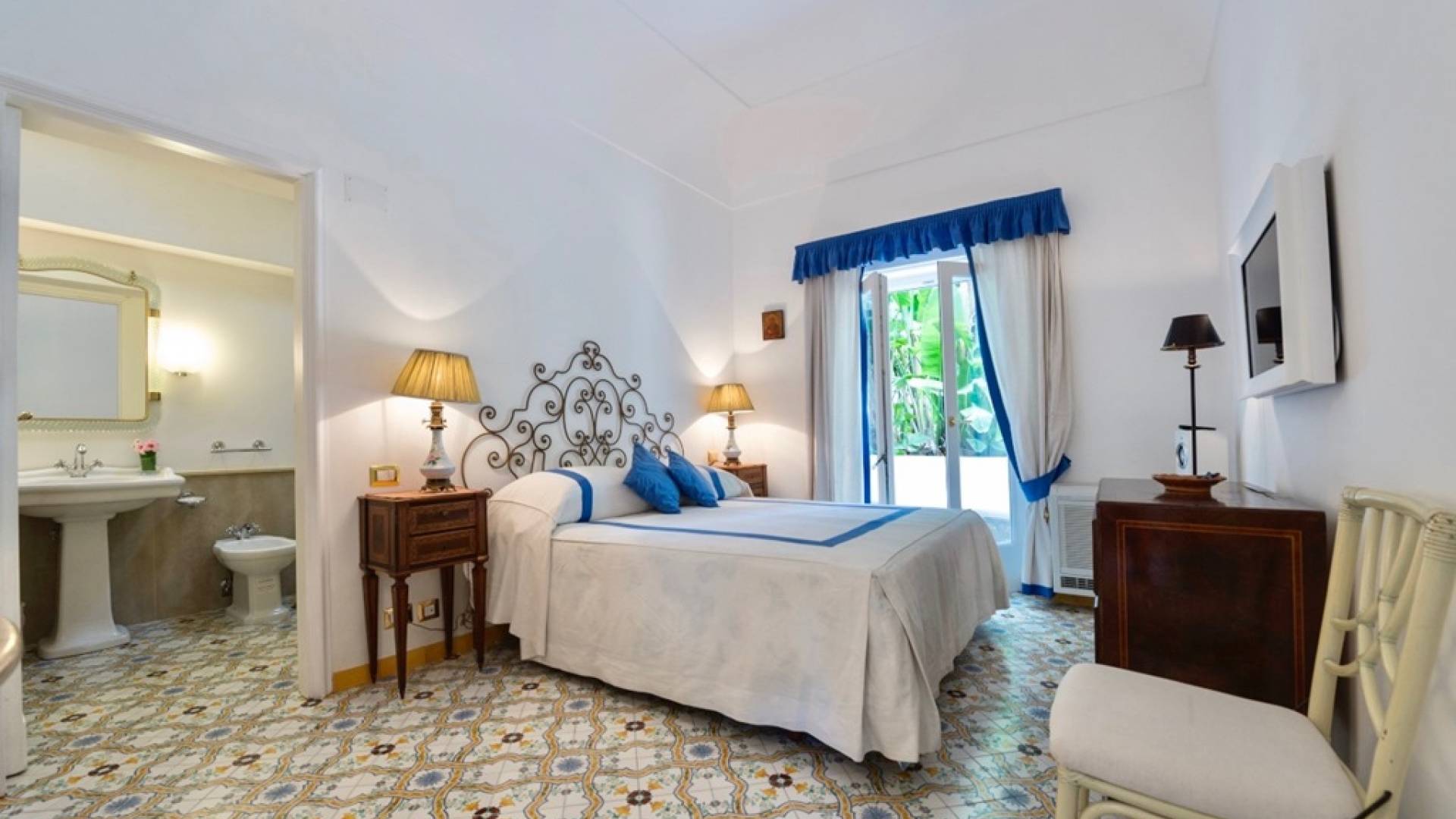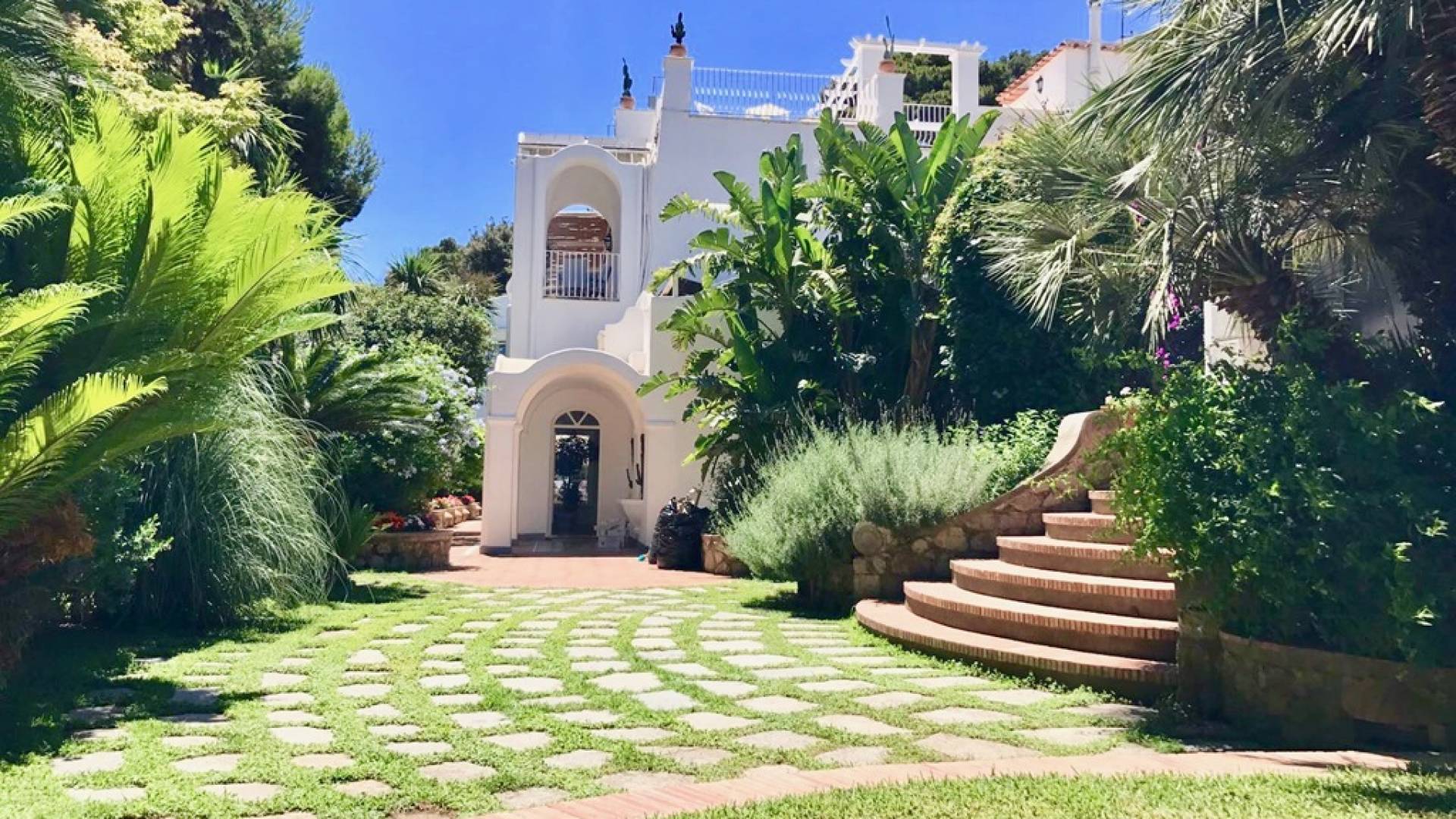 It hosts a maximum of ten adults in five bedrooms and six bathrooms, this is one of the very few properties with direct access to the square: this villa is conveniently located off of the main square of Capri and thanks to its position in the residential area of Capri, it enjoys fantastic views over the Faraglioni and the Mediterranean Sea. Access to the property is easy and stair-free through a small alleyway leading off of the main square, through a private gate leading through 8 steps down to the villa.