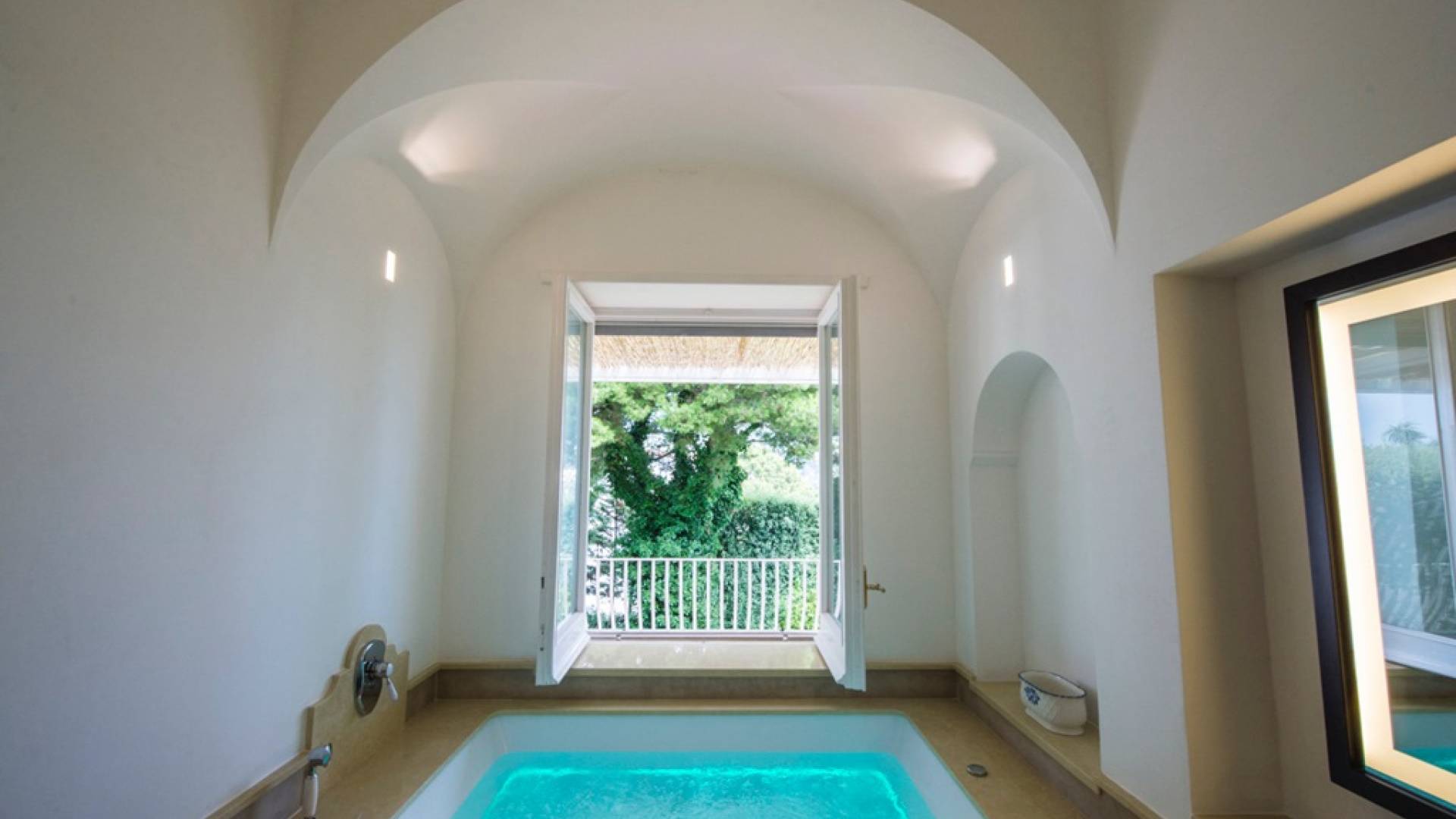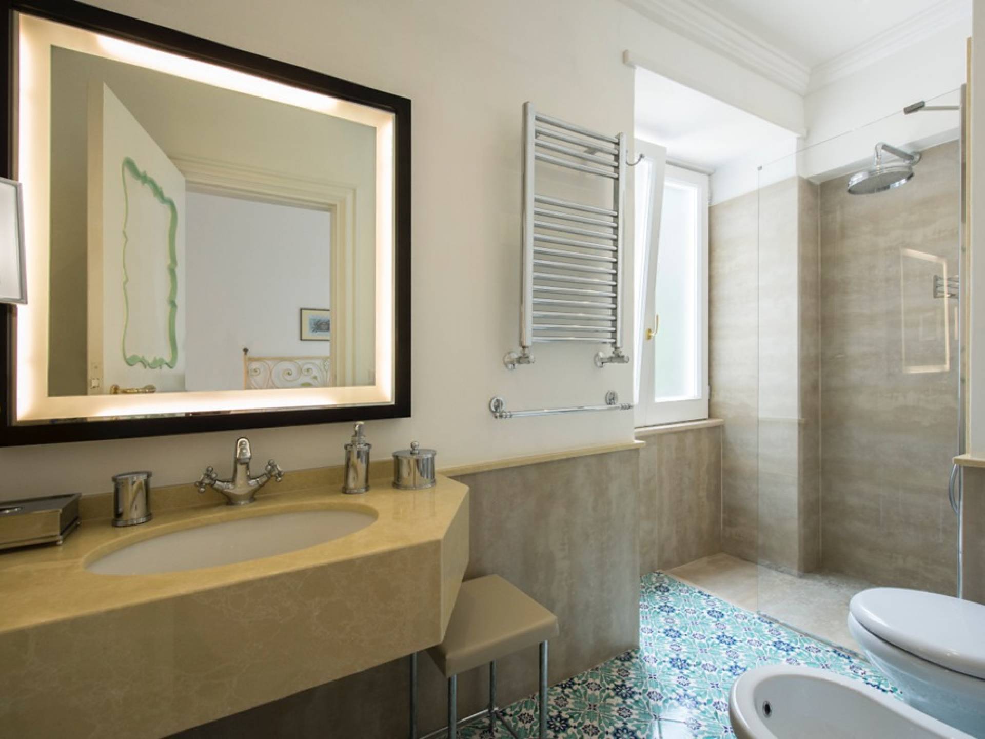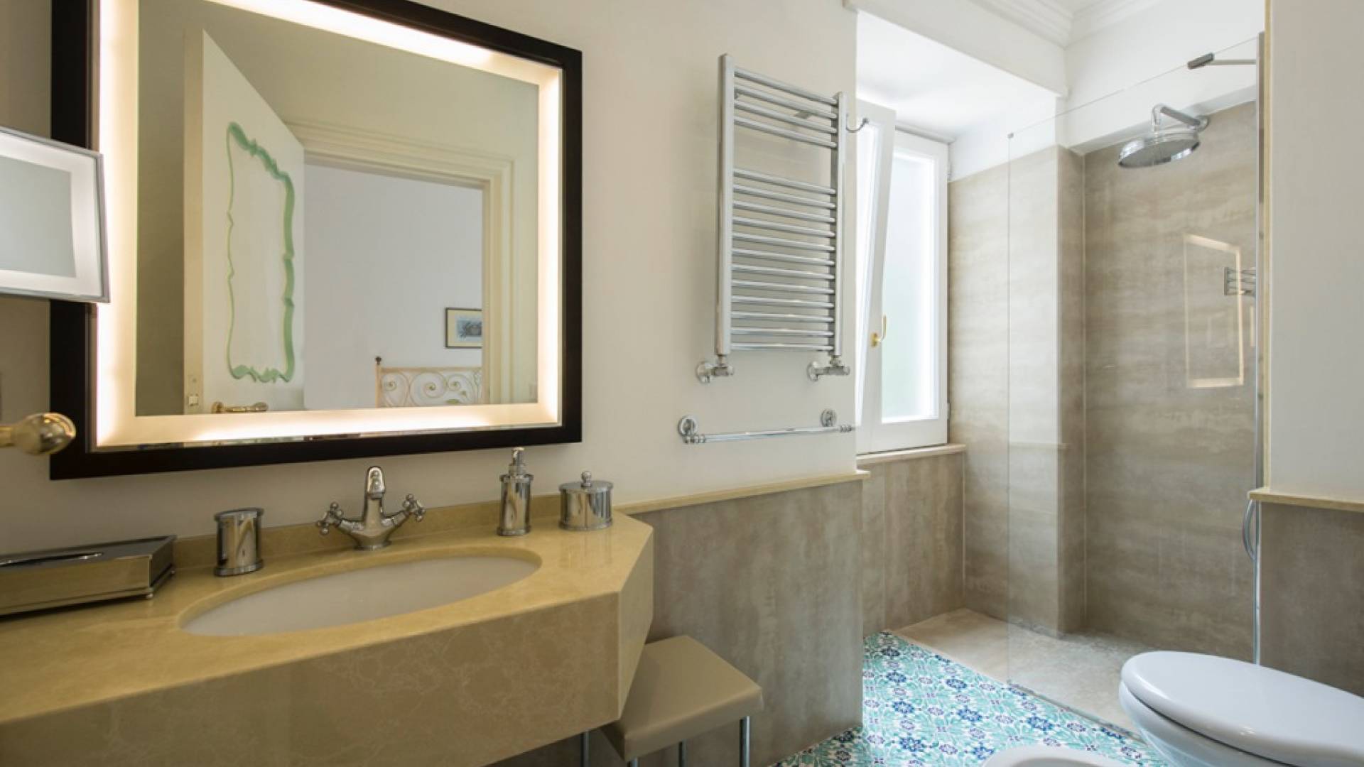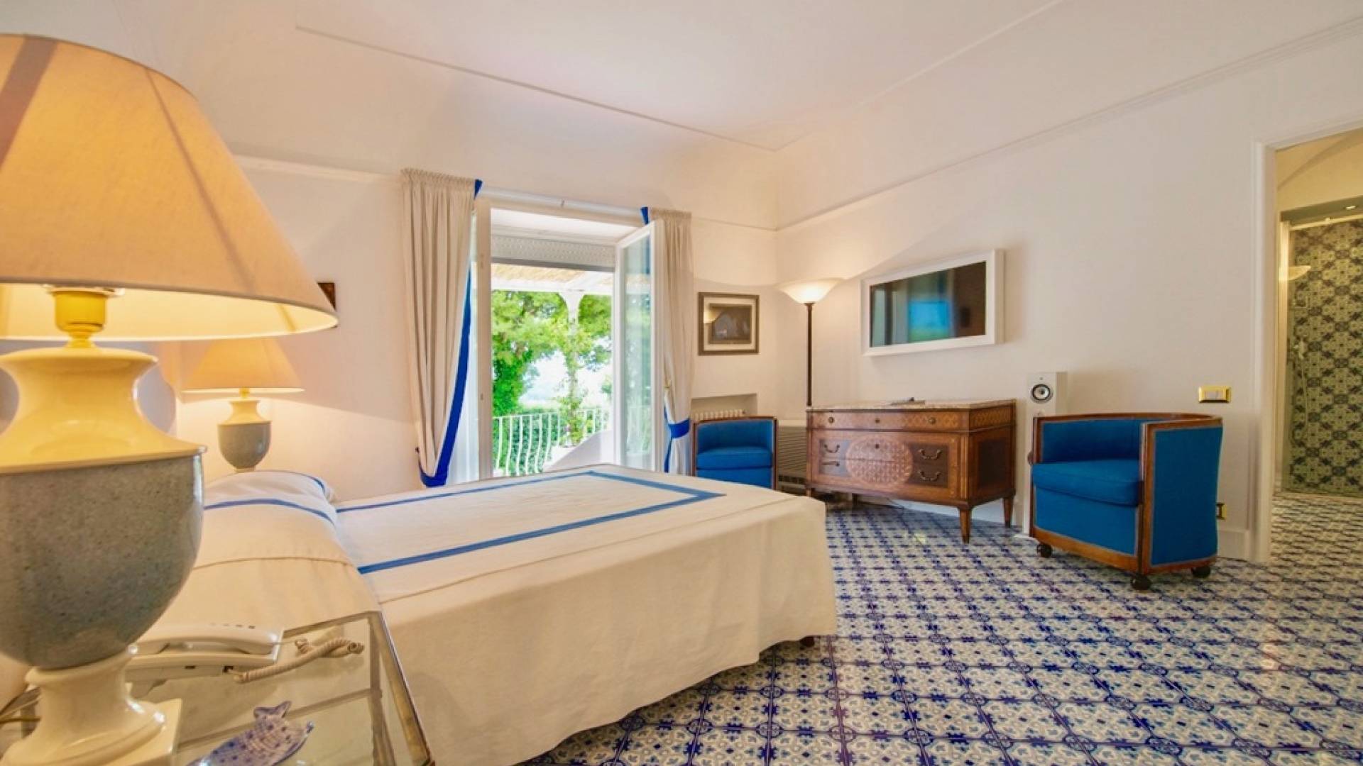 It hosts a maximum of ten adults in five bedrooms and six bathrooms, this is one of the very few properties with direct access to the square: this villa is conveniently located off of the main square of Capri and thanks to its position in the residential area of Capri, it enjoys fantastic views over the Faraglioni and the Mediterranean Sea. Access to the property is easy and stair-free through a small alleyway leading off of the main square, through a private gate leading through 8 steps down to the villa.