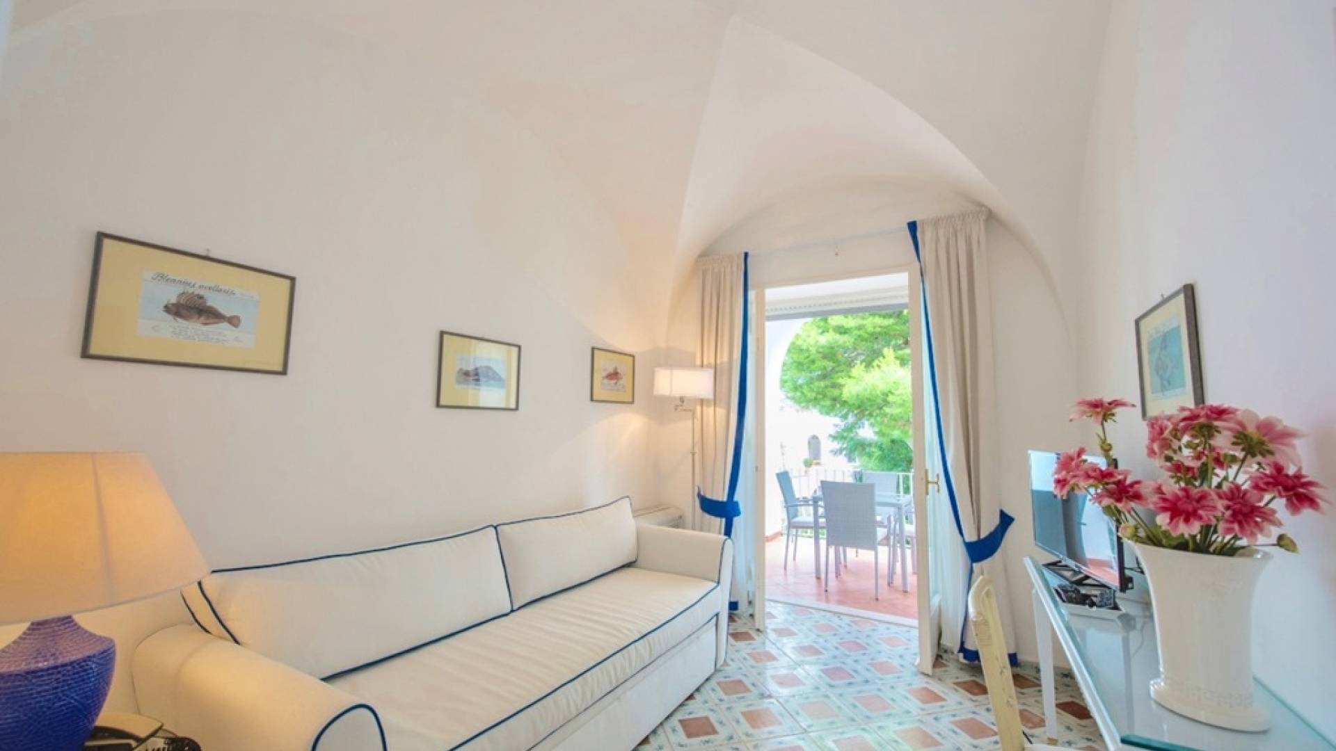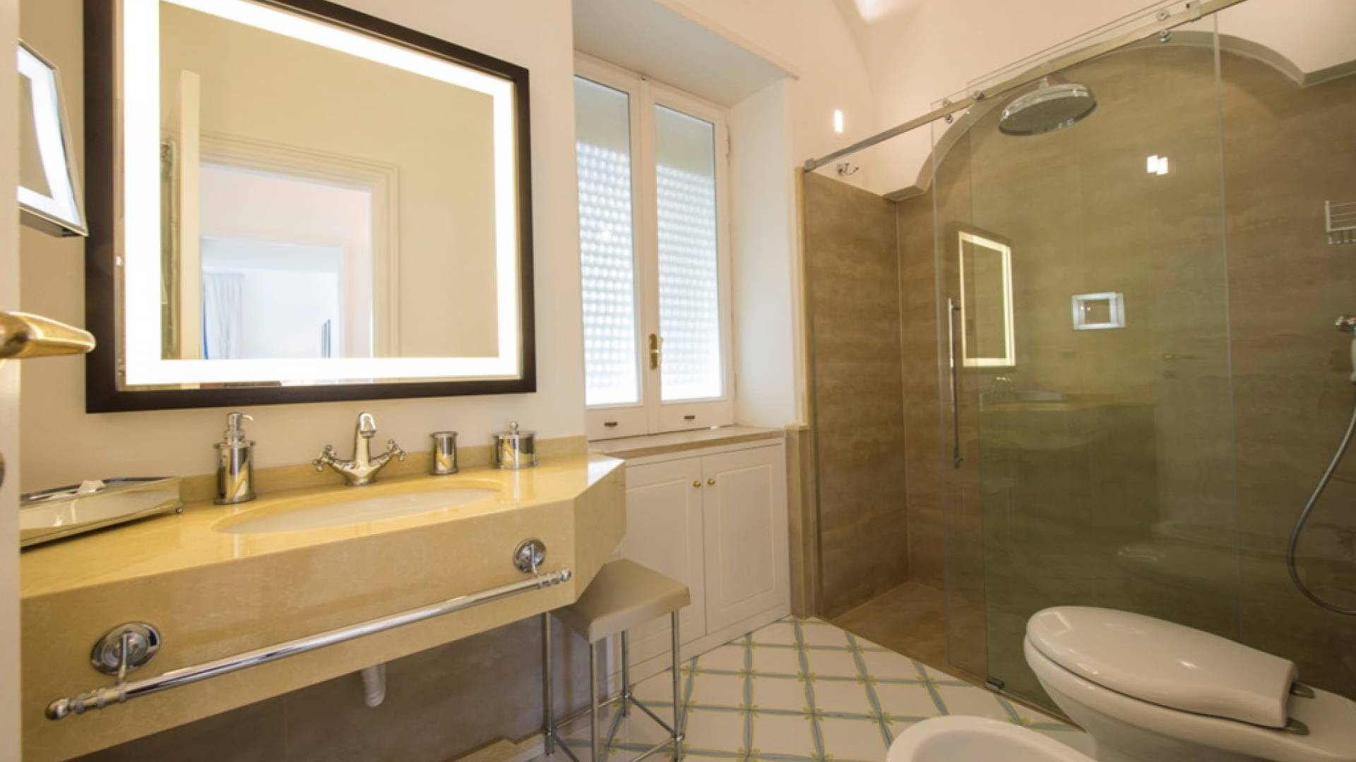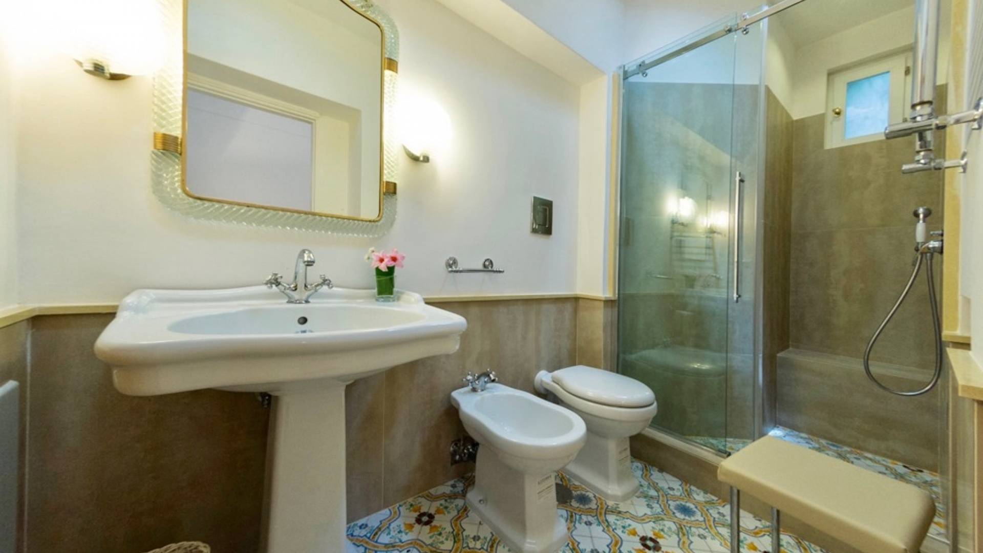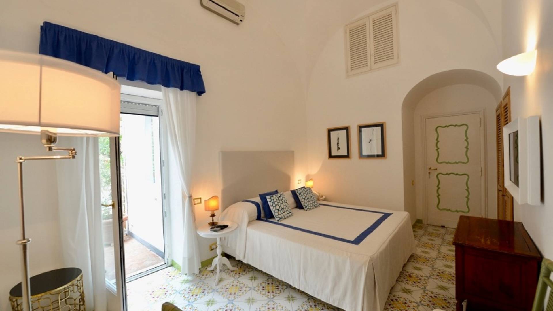 It hosts a maximum of ten adults in five bedrooms and six bathrooms, this is one of the very few properties with direct access to the square: this villa is conveniently located off of the main square of Capri and thanks to its position in the residential area of Capri, it enjoys fantastic views over the Faraglioni and the Mediterranean Sea. Access to the property is easy and stair-free through a small alleyway leading off of the main square, through a private gate leading through 8 steps down to the villa.