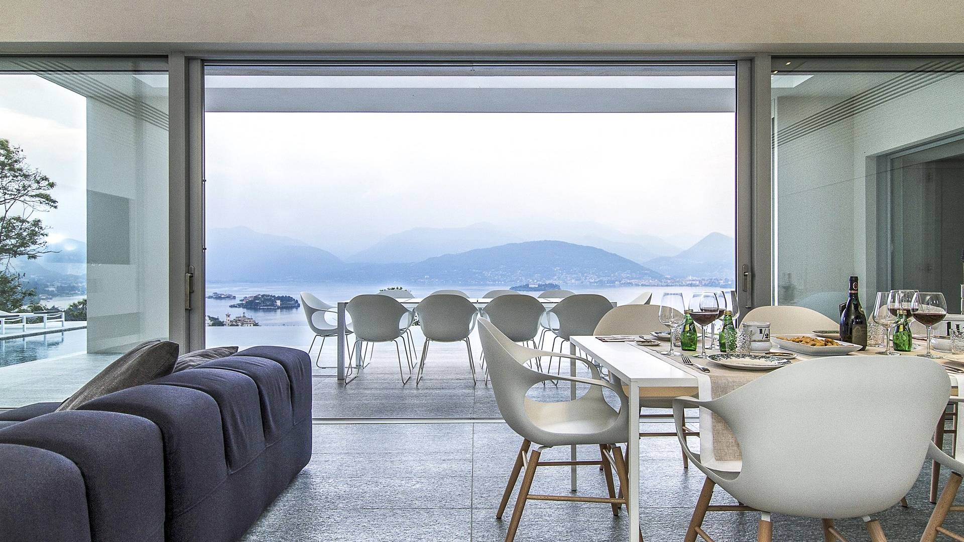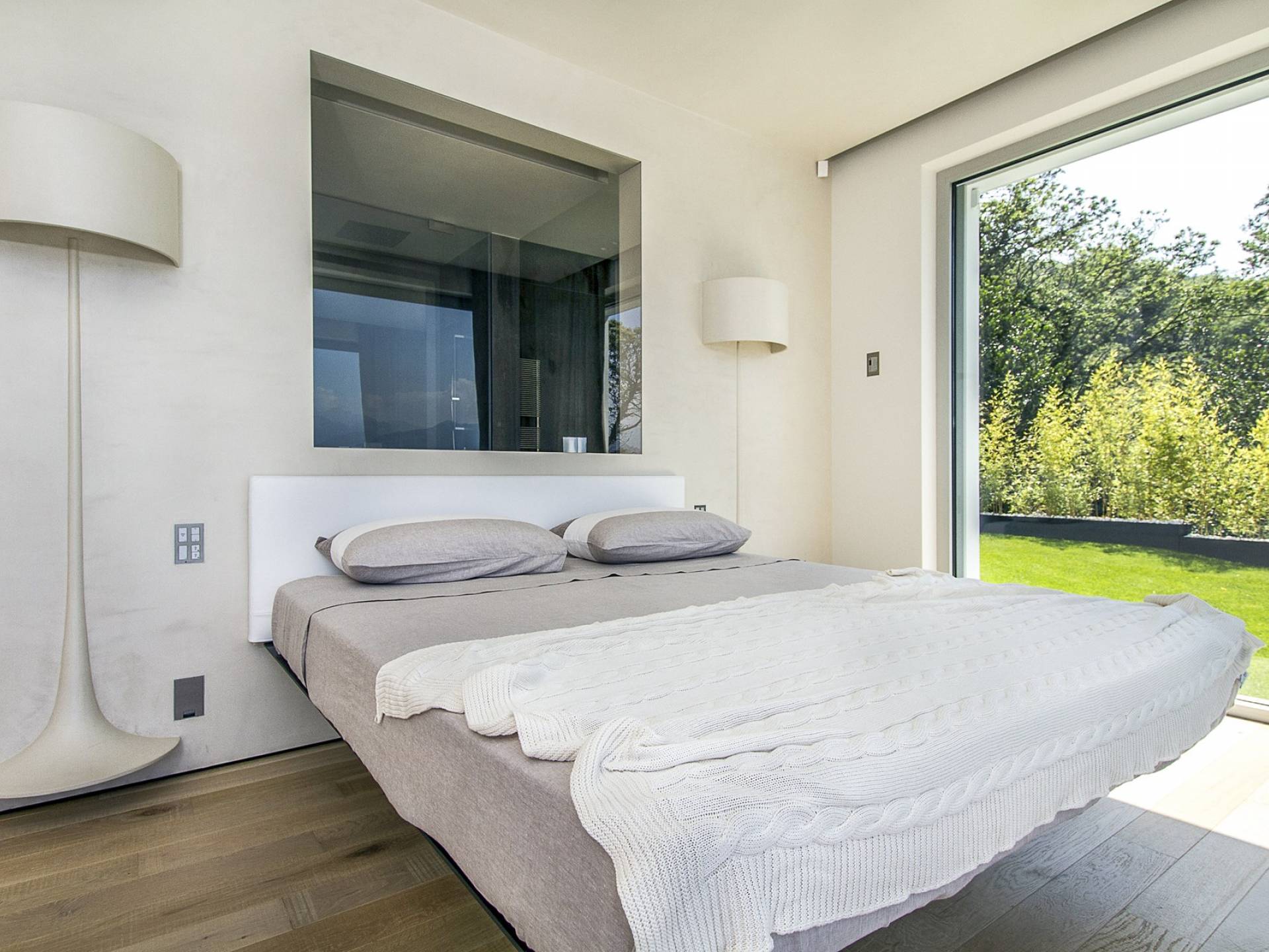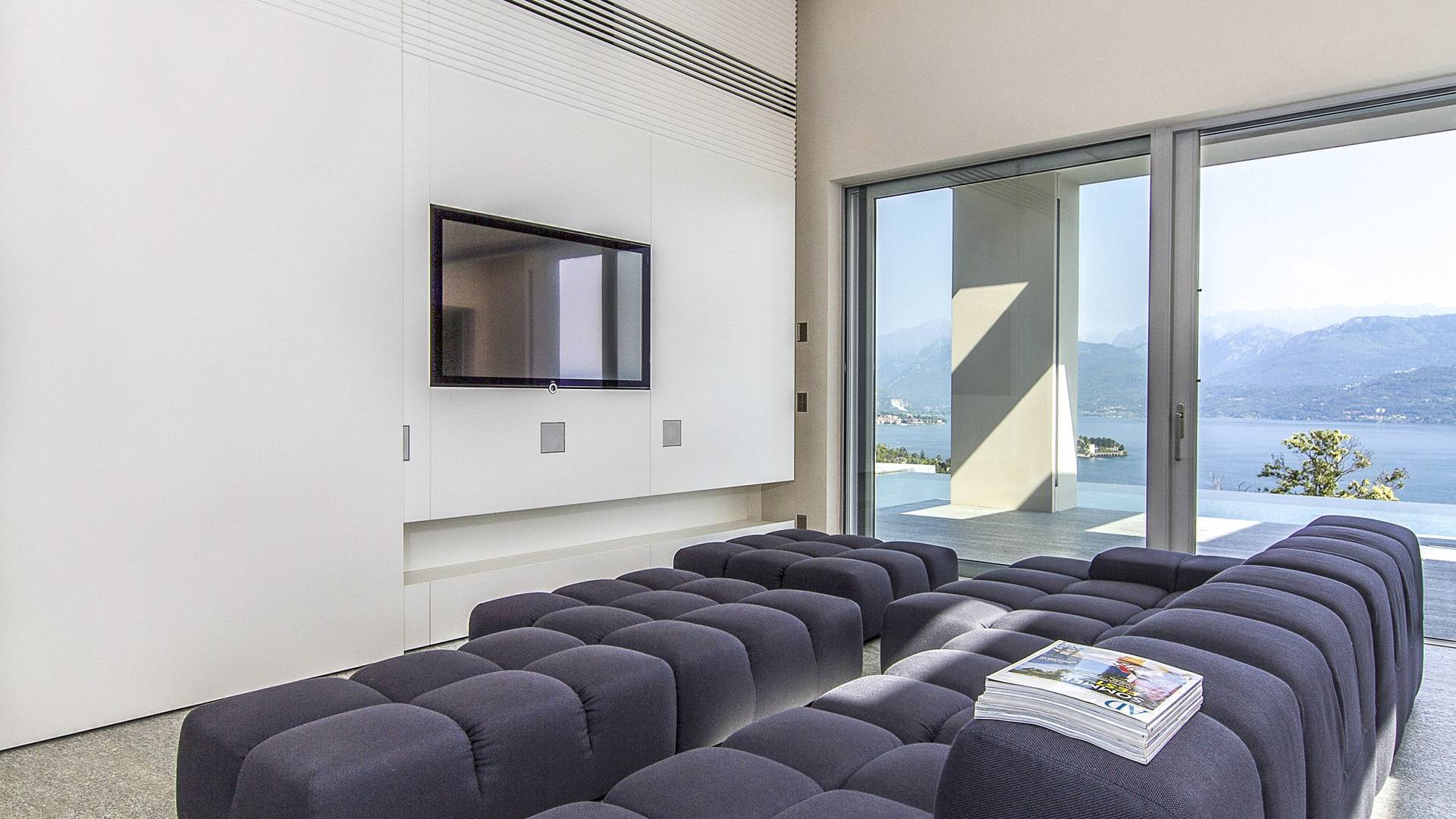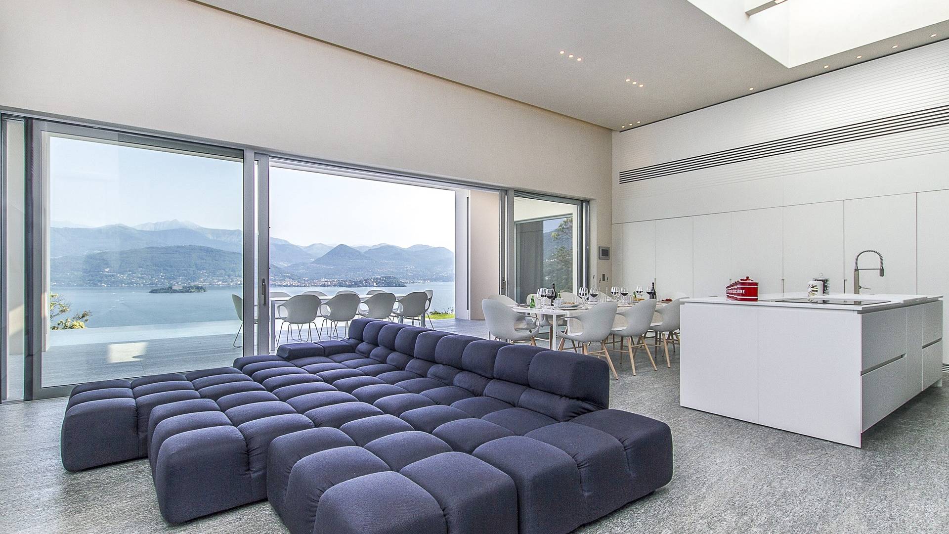 Villa Camilla Lake Maggiore has flat roofs planted with greenery and is built over two floors (each 200m²). The side of the villa facing the road is covered in local stone giving it a traditional appearance. The other sides are painted in soft pastel colors to blend with the surrounding landscape. The villa is designed in a modern and minimalist concept but at the same time creates a comfortable atmosphere that will make you feel completely at home.