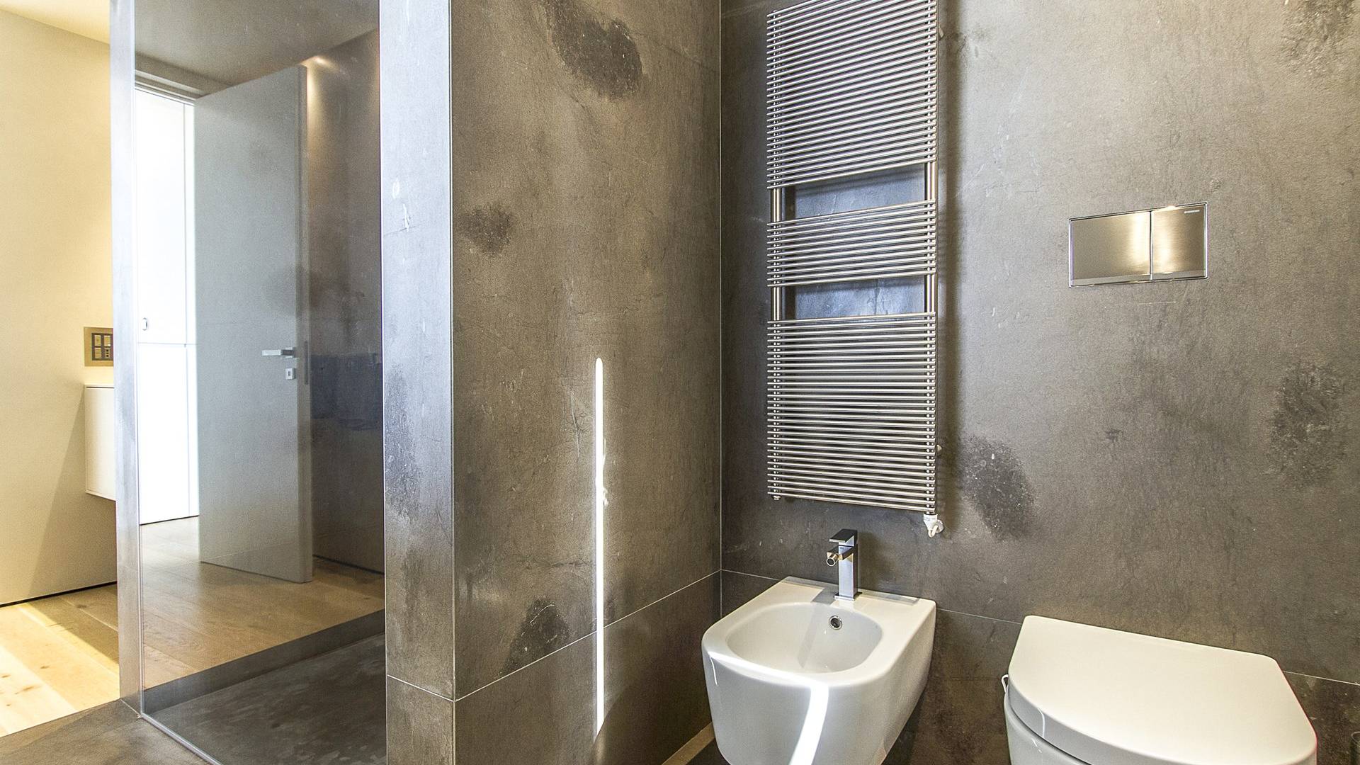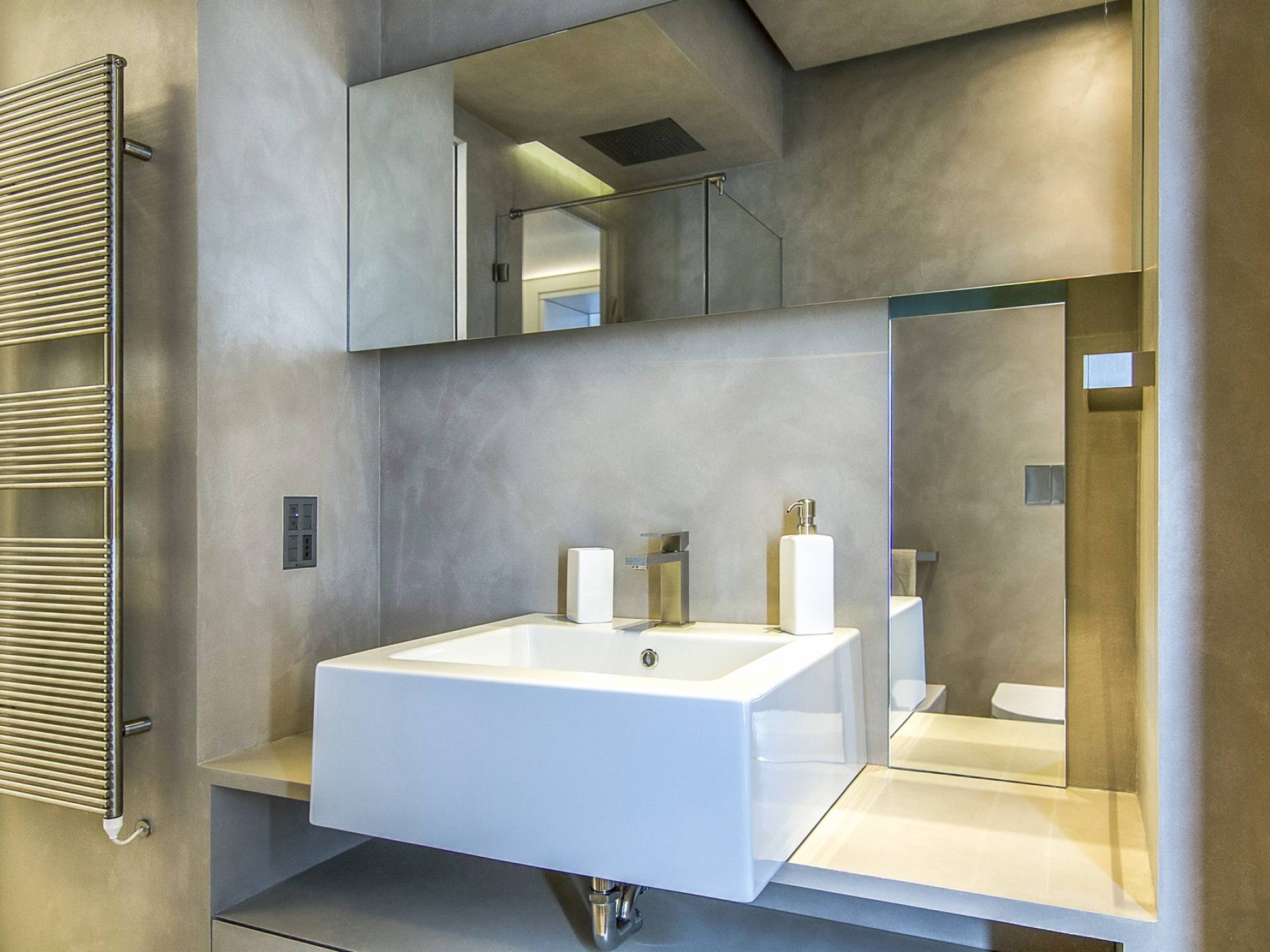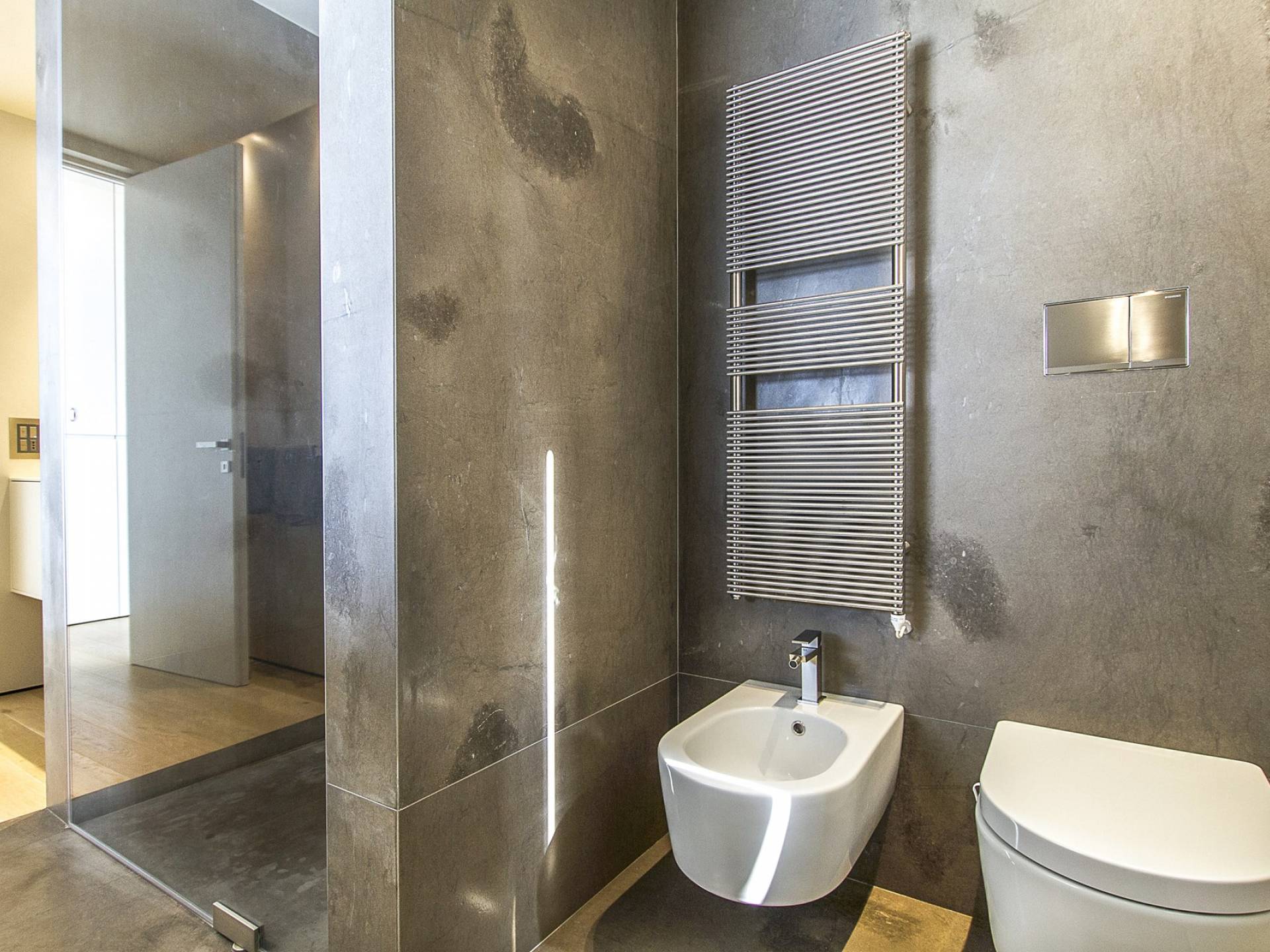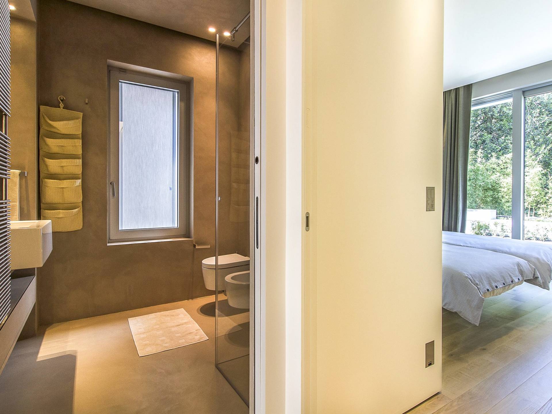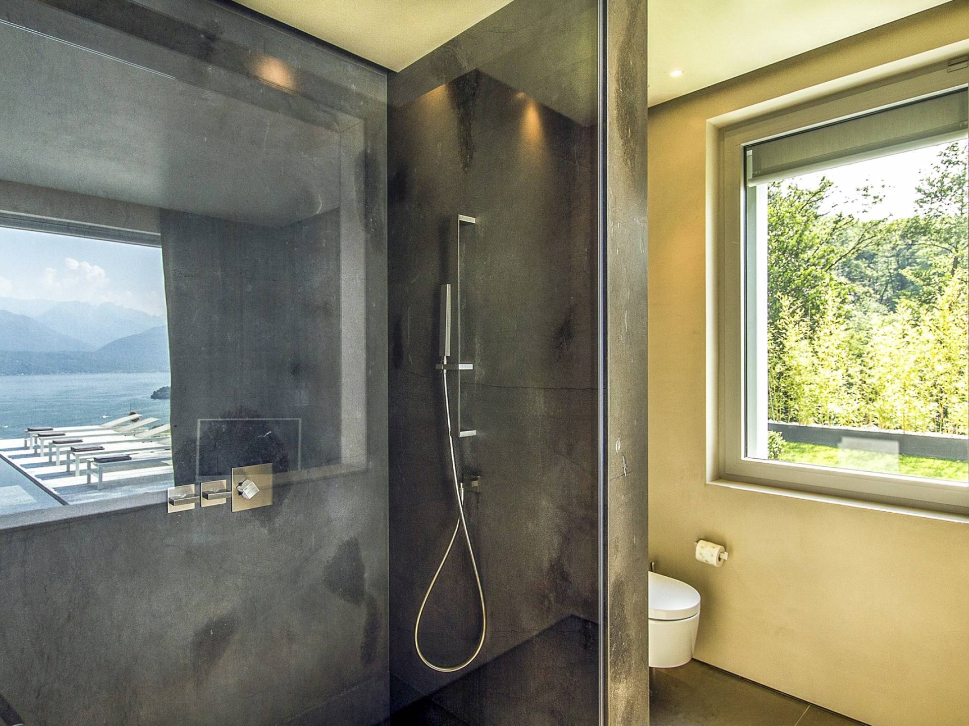 The same stone inside as well as outside the pool has been used to create a sense of continuity of the water and colors towards the lake. There’s an outdoor hot and cold shower and at night the LED spotlights give eye-catching visual effects.