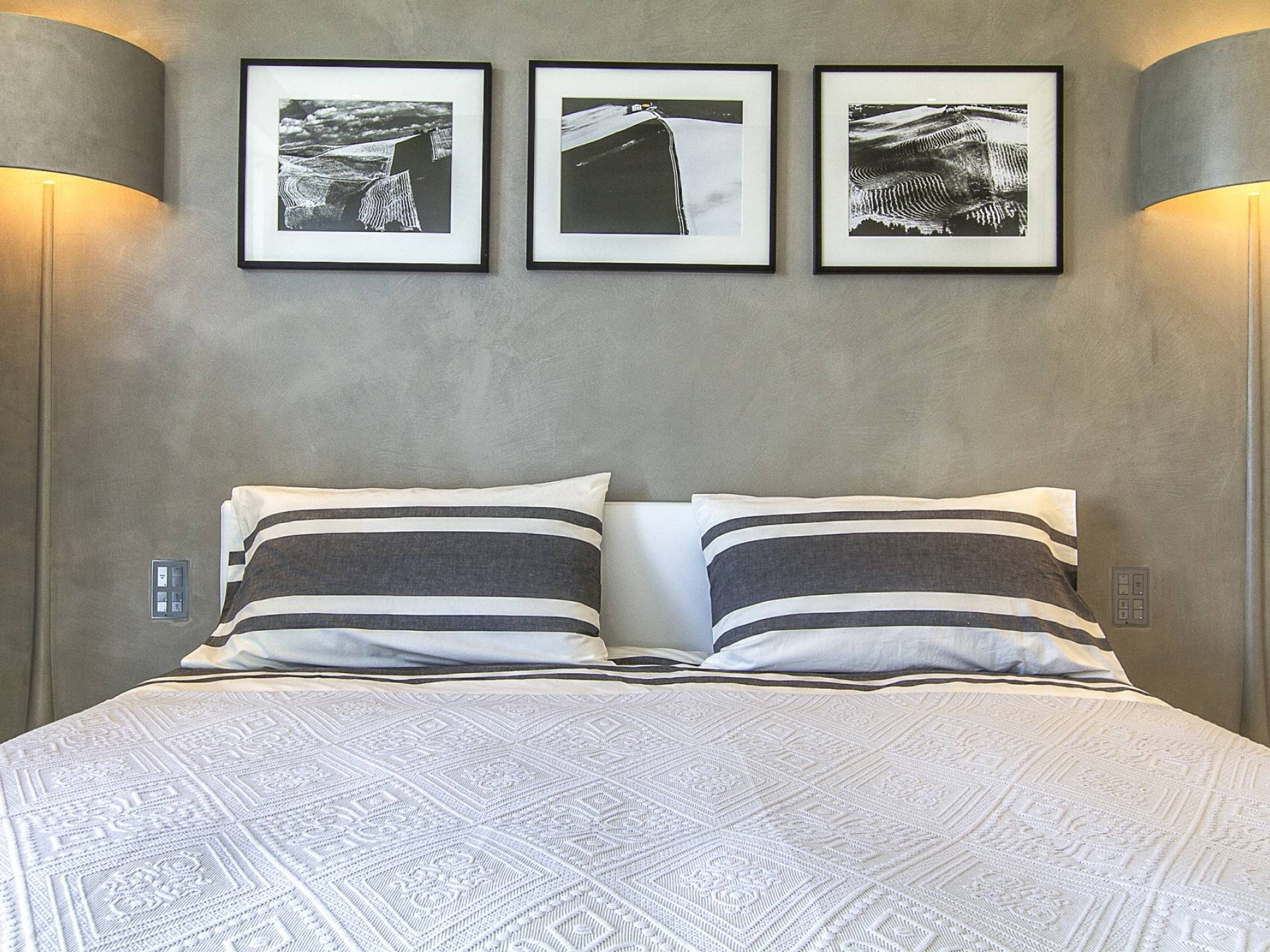 The ground floor comprises an impressive open-air living room with walls of windows that open onto the covered patio and endless views. More natural light comes from the roof windows with remote-controlled Velux skylights. The centerpiece of the kitchen is the Corian topped island with an induction hob and extractor hood, built-in dishwasher, inset sink, and utensil drawers.