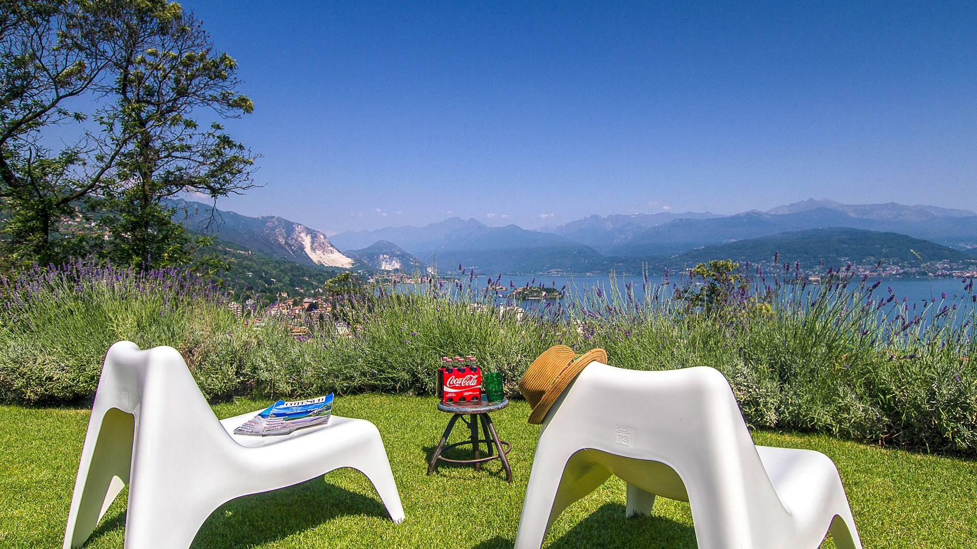 Villa Camilla Lake Maggiore stands on a 1000m² plot boasting a spacious covered terrace and a landscaped lawn with native trees in a clean minimalist layout enriched by lavender and other fragrant plants. The stunning infinity swimming pool with views over the town, the lake, and the surrounding mountains create the ideal setting for winding down and enjoying your dream vacation. The pool (14×4.5m) has easy access steps and includes internal bench seats for relaxing and admiring the views.