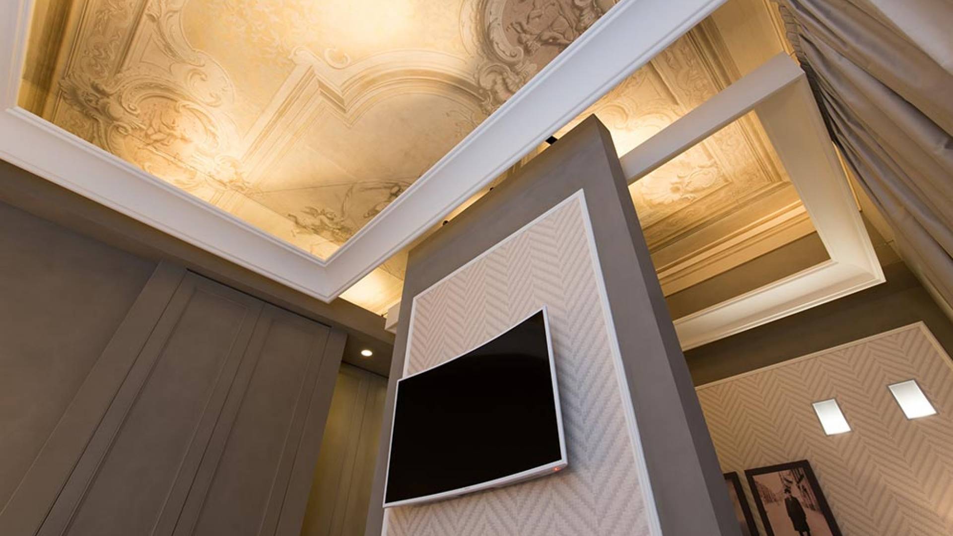 A double room totaling 35 square meters, WHITE is “Le Quattro Dame”’s unique jewel, boasting a marvelous Fresco recently restored to its original beauty. The modern interior design blends with the marvelous Fresco as the white colour is chosen throughout and two enormous wooden frames mounted in mid air immortalise it. The room offers a separate living area with a sofa bed by Campeggi, its own HD 48” satellite TV and it’s equipped with a private kitchenette offering Nespresso coffee machine, well-stocked fridge and snacks to ensure the extra comfort.