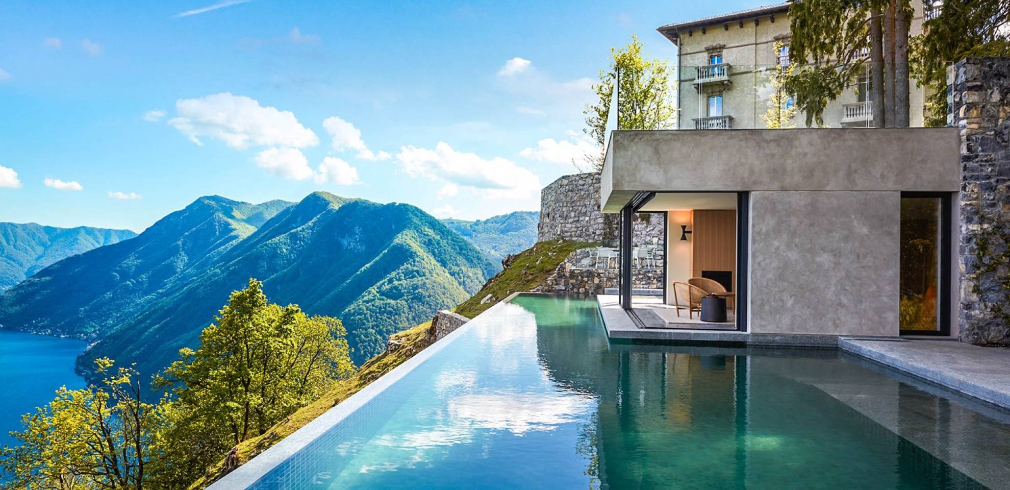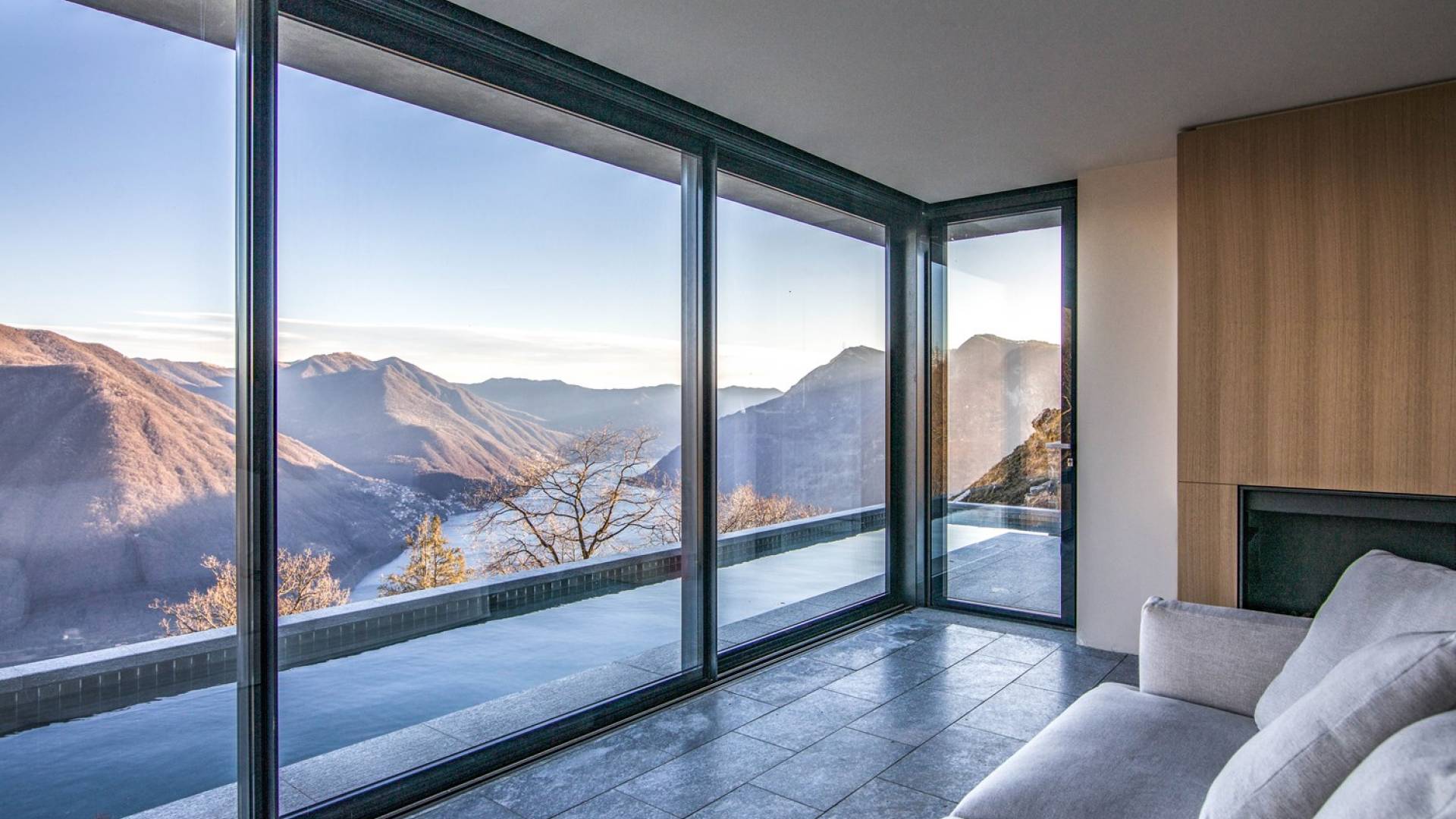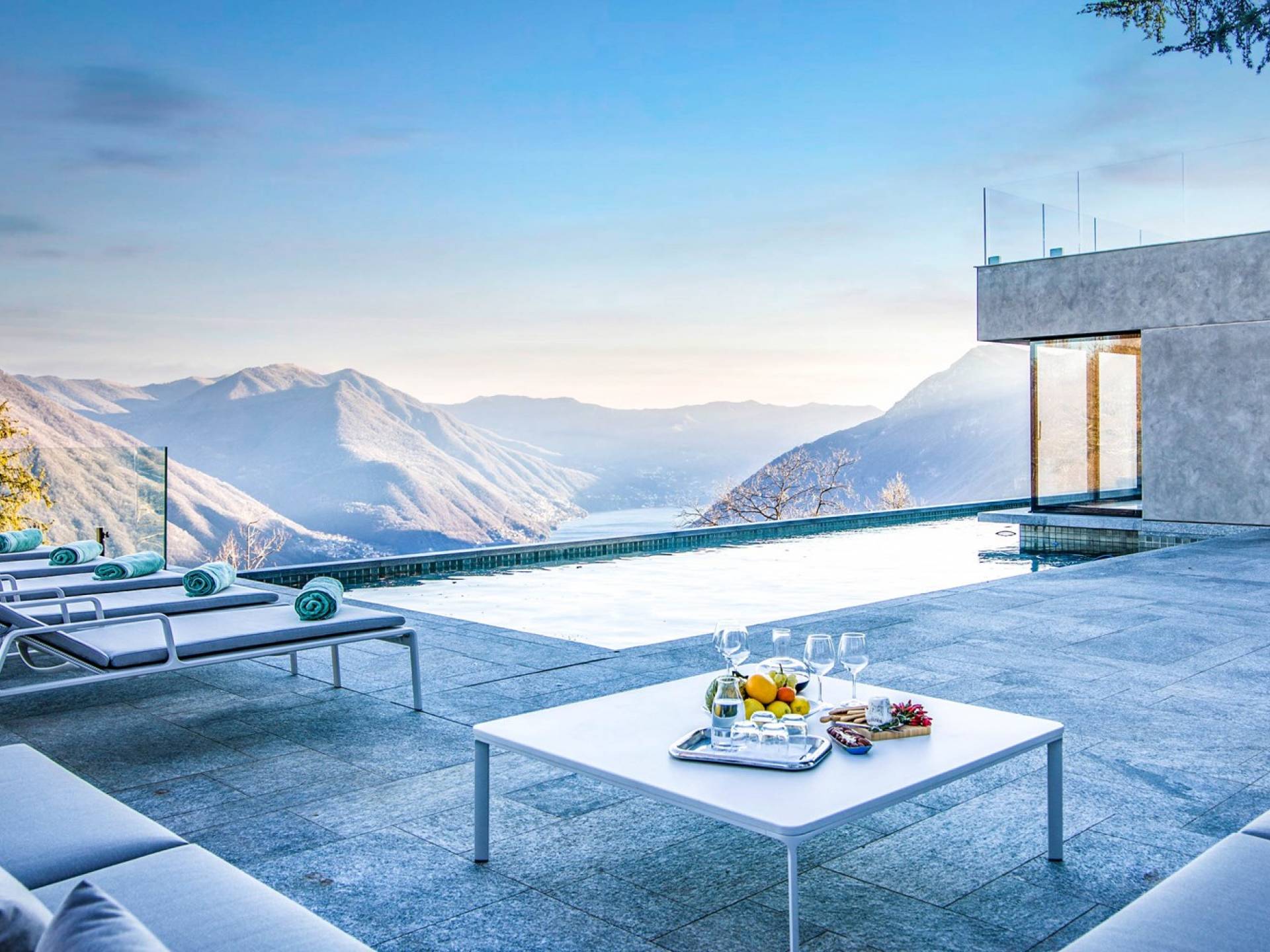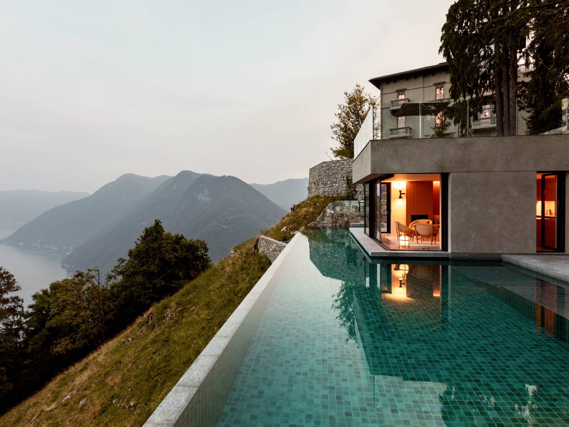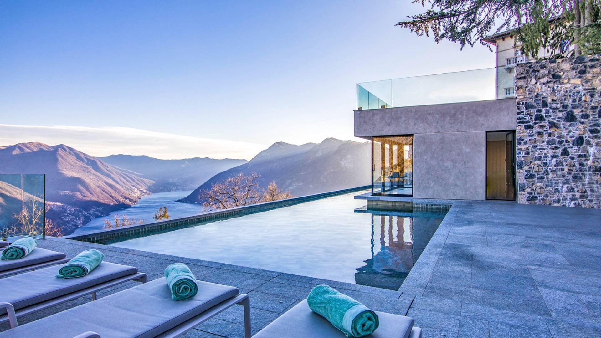 The views from south facing Villa Peduzzi are truly stunning – a combination of a wide blue lake and green mountain vistas rounded off with glorious golden sunsets. These can be enjoyed from the balconies off every bedroom, the villa’s main surrounding terrace, and the extraordinary pool house with its green roof and infinity pool. Also making the most of this aspect are an exceptional yoga/wellness room that has been carved out of the cliff face and the rooftop terraces, bar, and entertainment area.