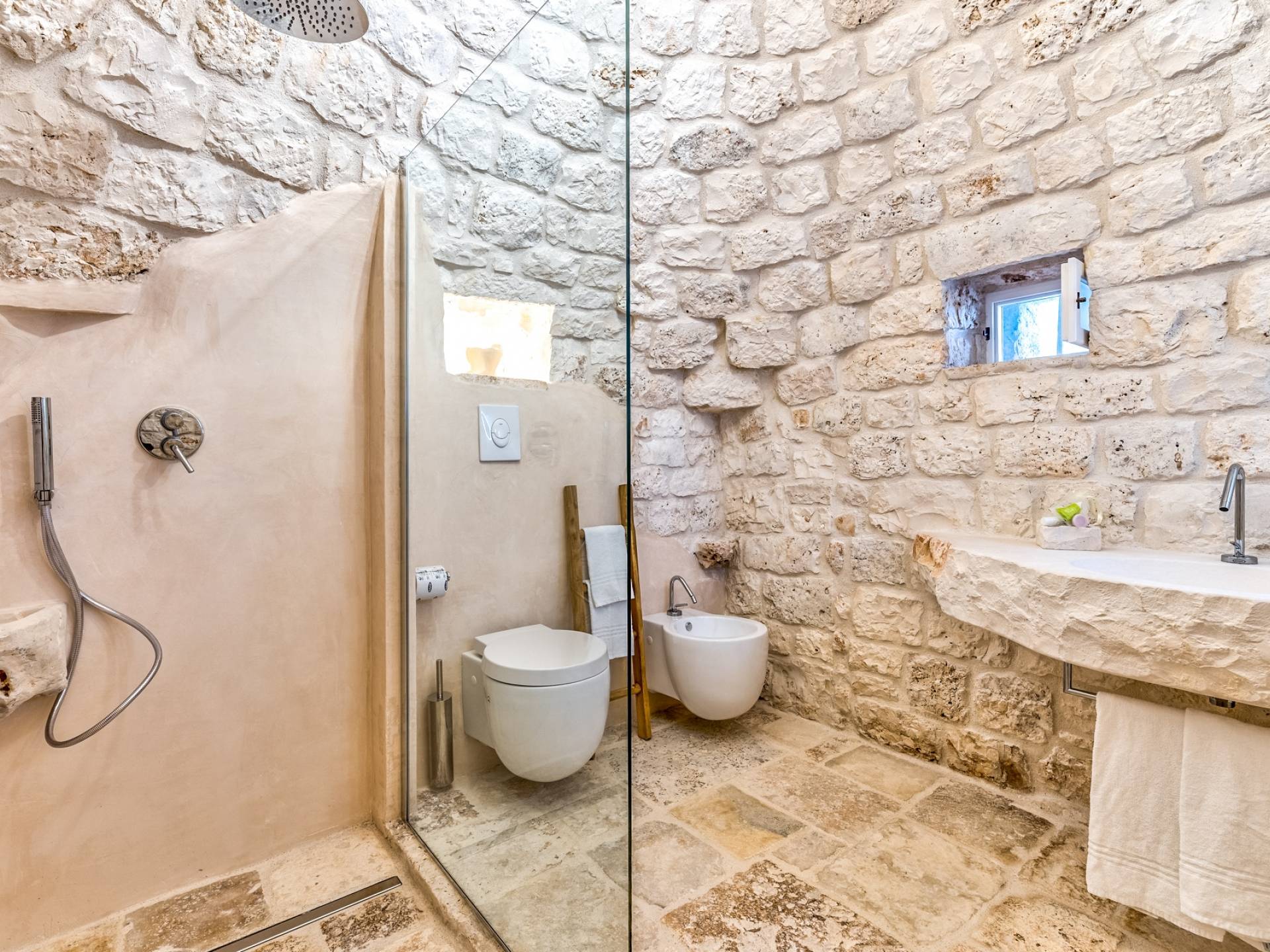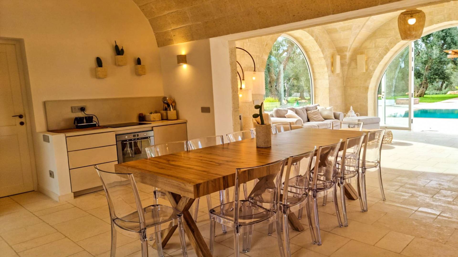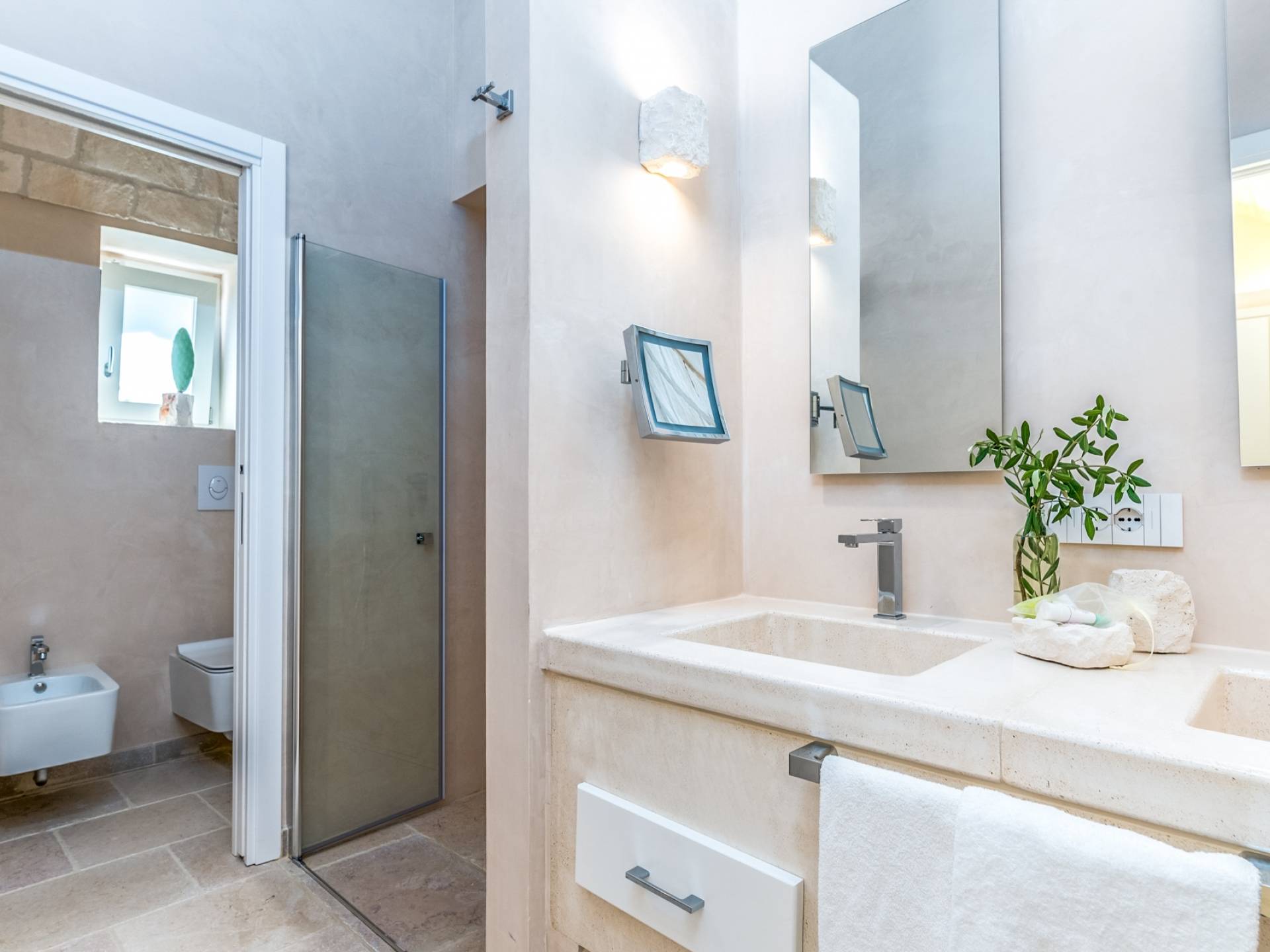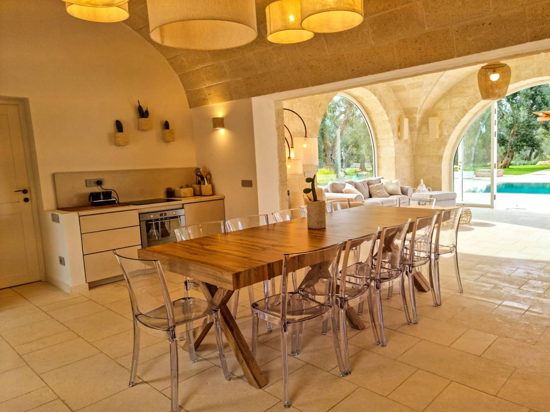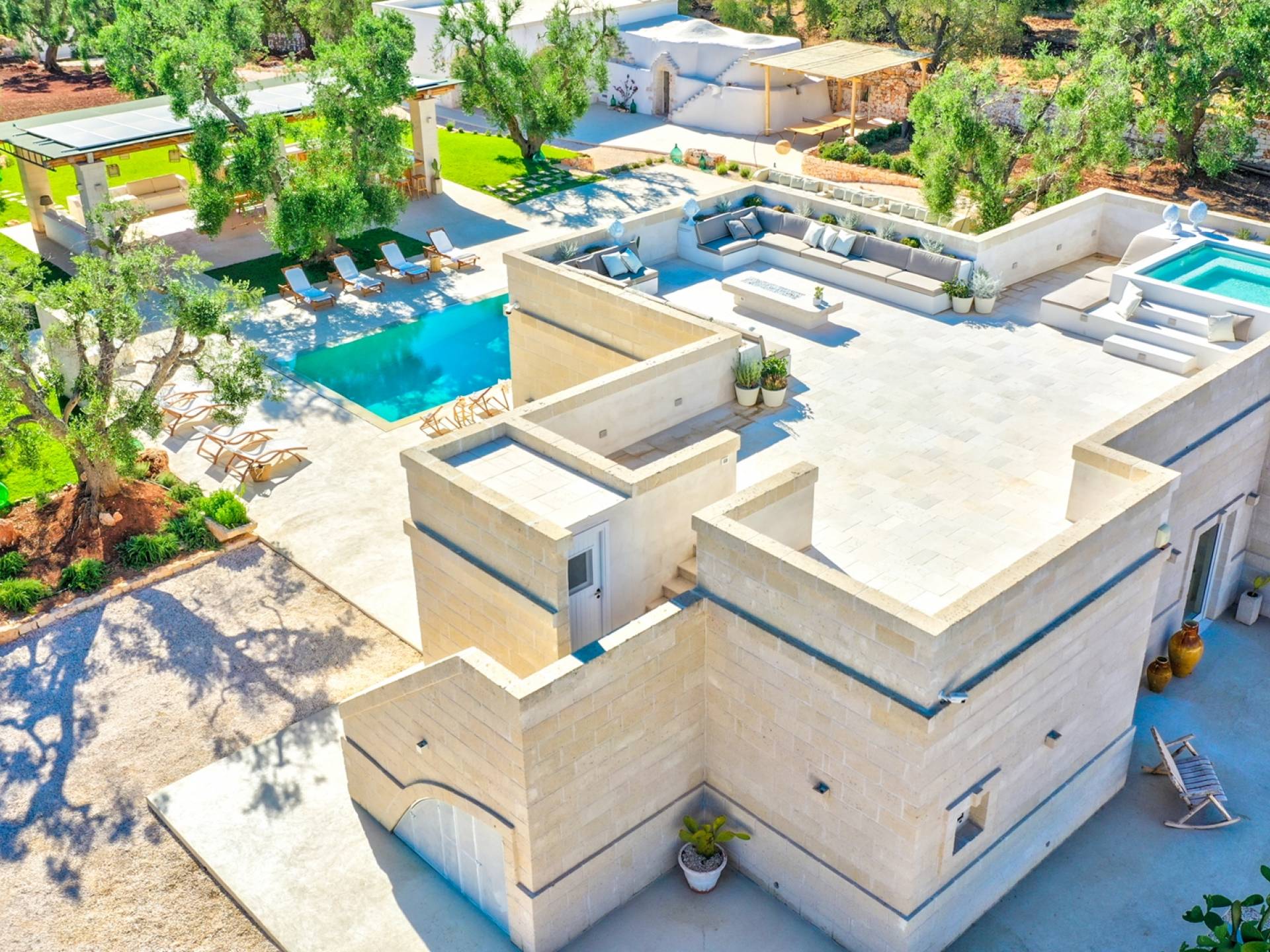 It can accommodate up to 12 people in six double bedrooms. Of the latest construction, the villa consists of 3 different areas: the main residence, with two bedrooms with en suite bathroom (consisting of double sinks and shower with two shower heads), kitchen, and living room. The dependence with the typical trullo with a romantic atmosphere and three bedrooms (all with private bathroom), two of which are communicating. In total there are 6 bedrooms. All the rooms are equipped with independent air conditioning and heating; The three bedrooms in the annex and the trullo have underfloor heating.