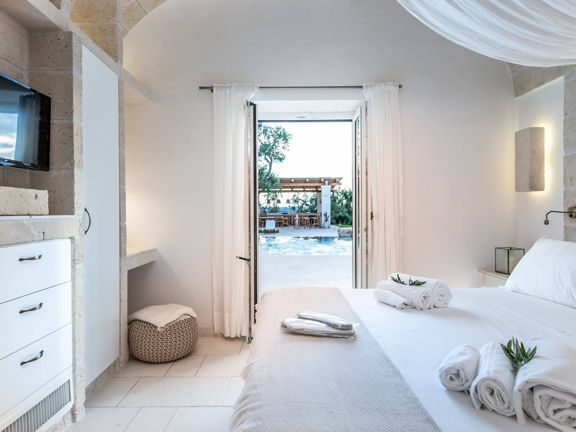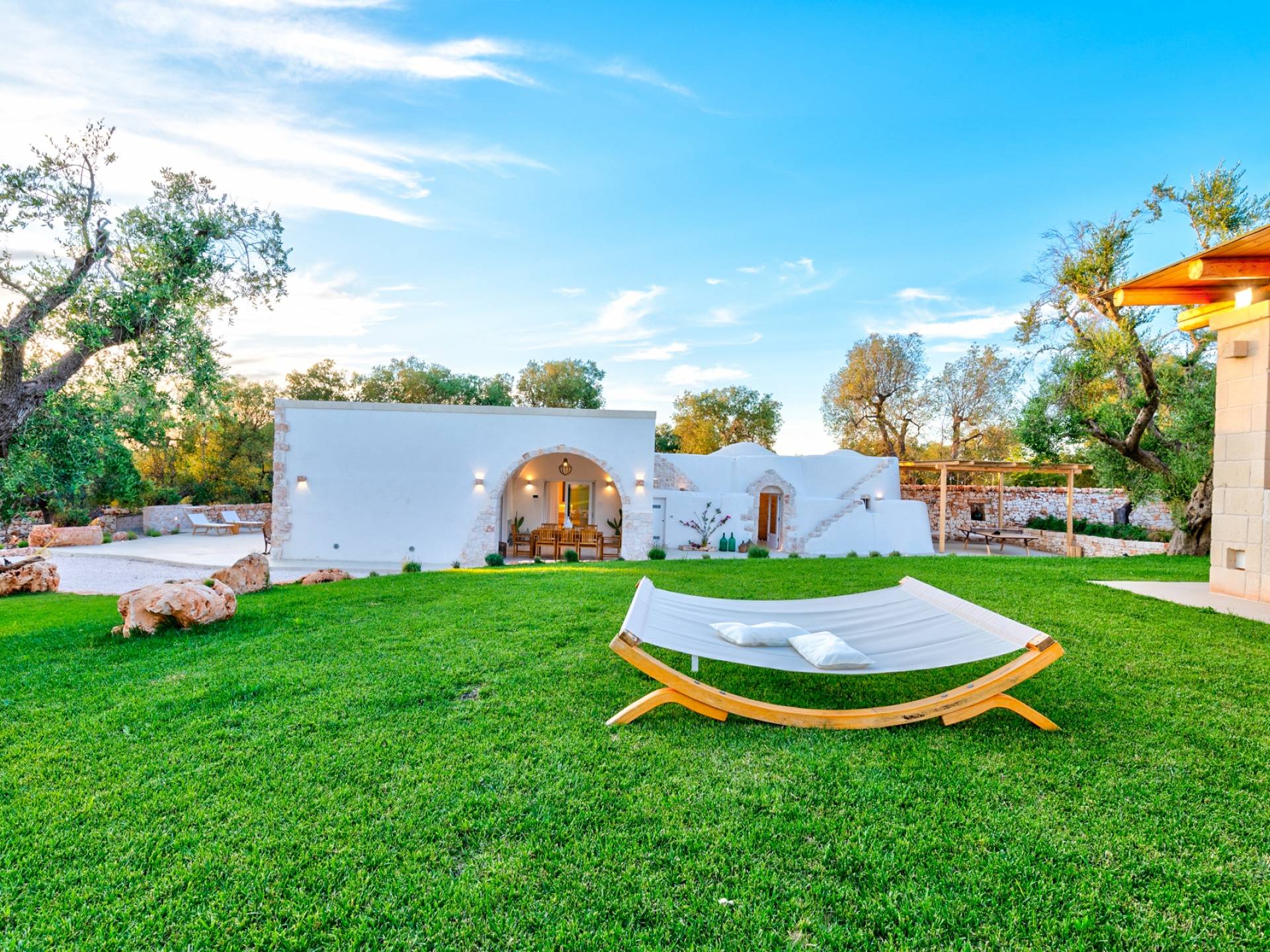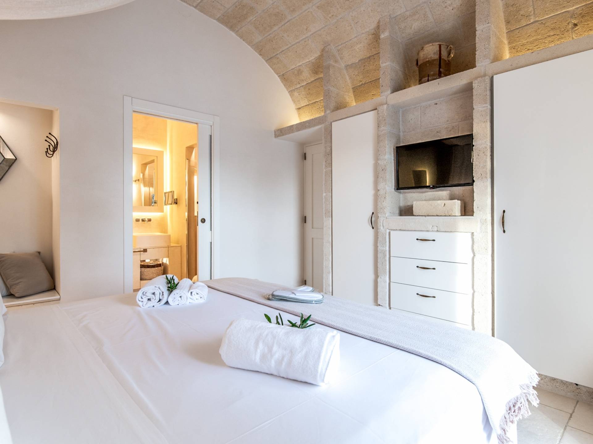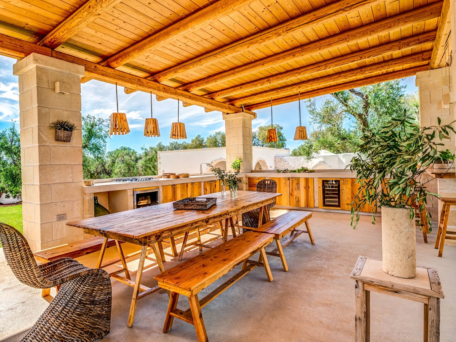 It can accommodate up to 12 people in six double bedrooms. Of the latest construction, the villa consists of 3 different areas: the main residence, with two bedrooms with en suite bathroom (consisting of double sinks and shower with two shower heads), kitchen, and living room. The dependence with the typical trullo with a romantic atmosphere and three bedrooms (all with private bathroom), two of which are communicating. In total there are 6 bedrooms. All the rooms are equipped with independent air conditioning and heating; The three bedrooms in the annex and the trullo have underfloor heating.