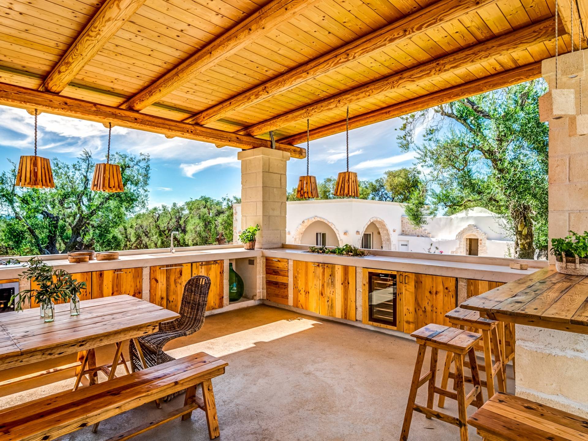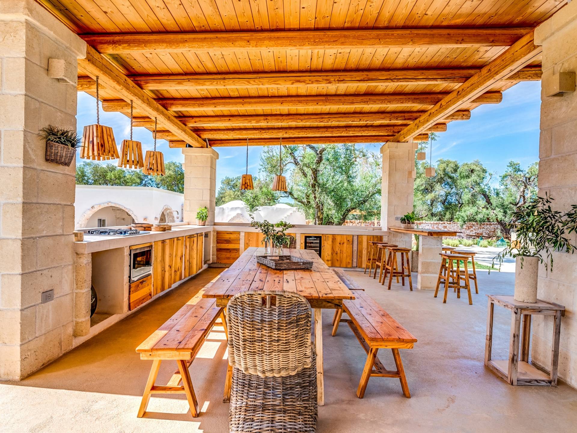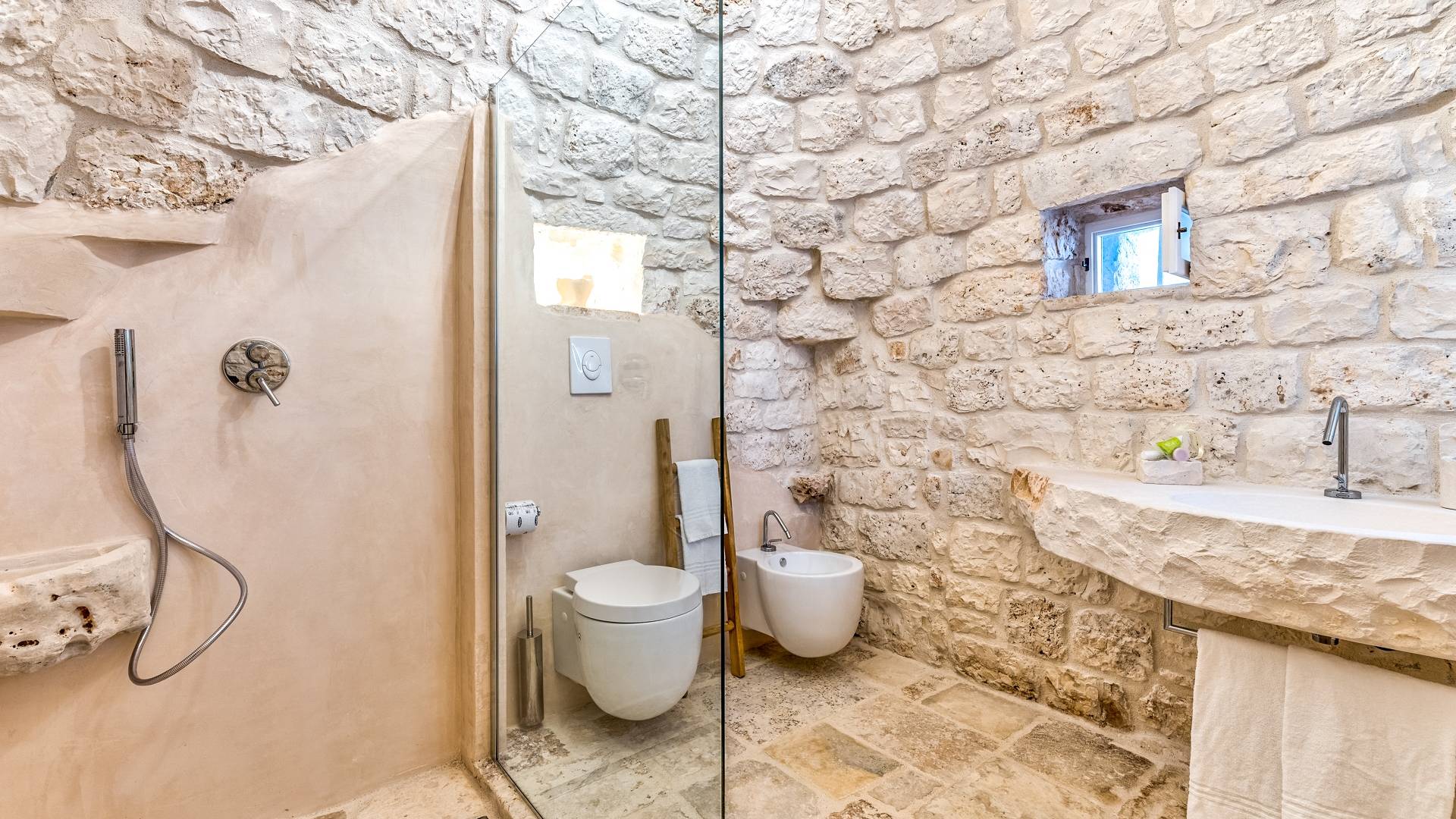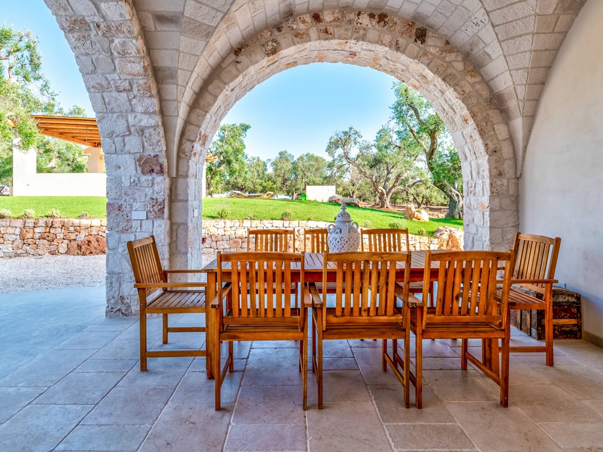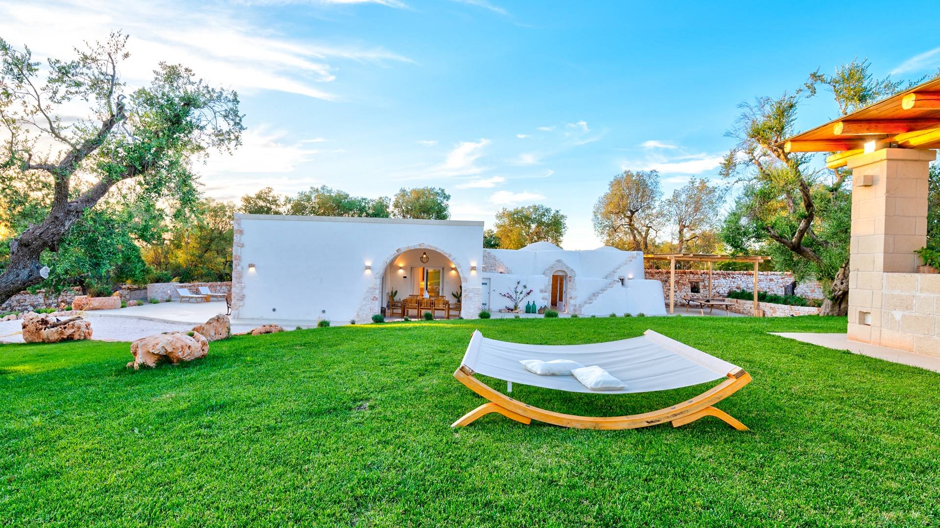 It can accommodate up to 12 people in six double bedrooms. Of the latest construction, the villa consists of 3 different areas: the main residence, with two bedrooms with en suite bathroom (consisting of double sinks and shower with two shower heads), kitchen, and living room. The dependence with the typical trullo with a romantic atmosphere and three bedrooms (all with private bathroom), two of which are communicating. In total there are 6 bedrooms. All the rooms are equipped with independent air conditioning and heating; The three bedrooms in the annex and the trullo have underfloor heating.