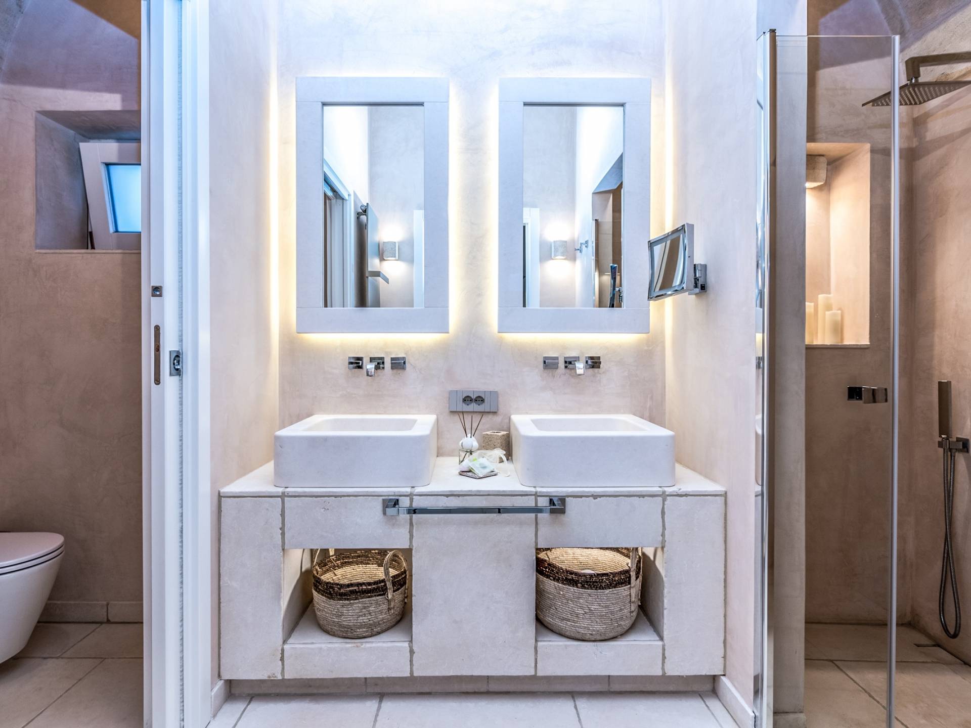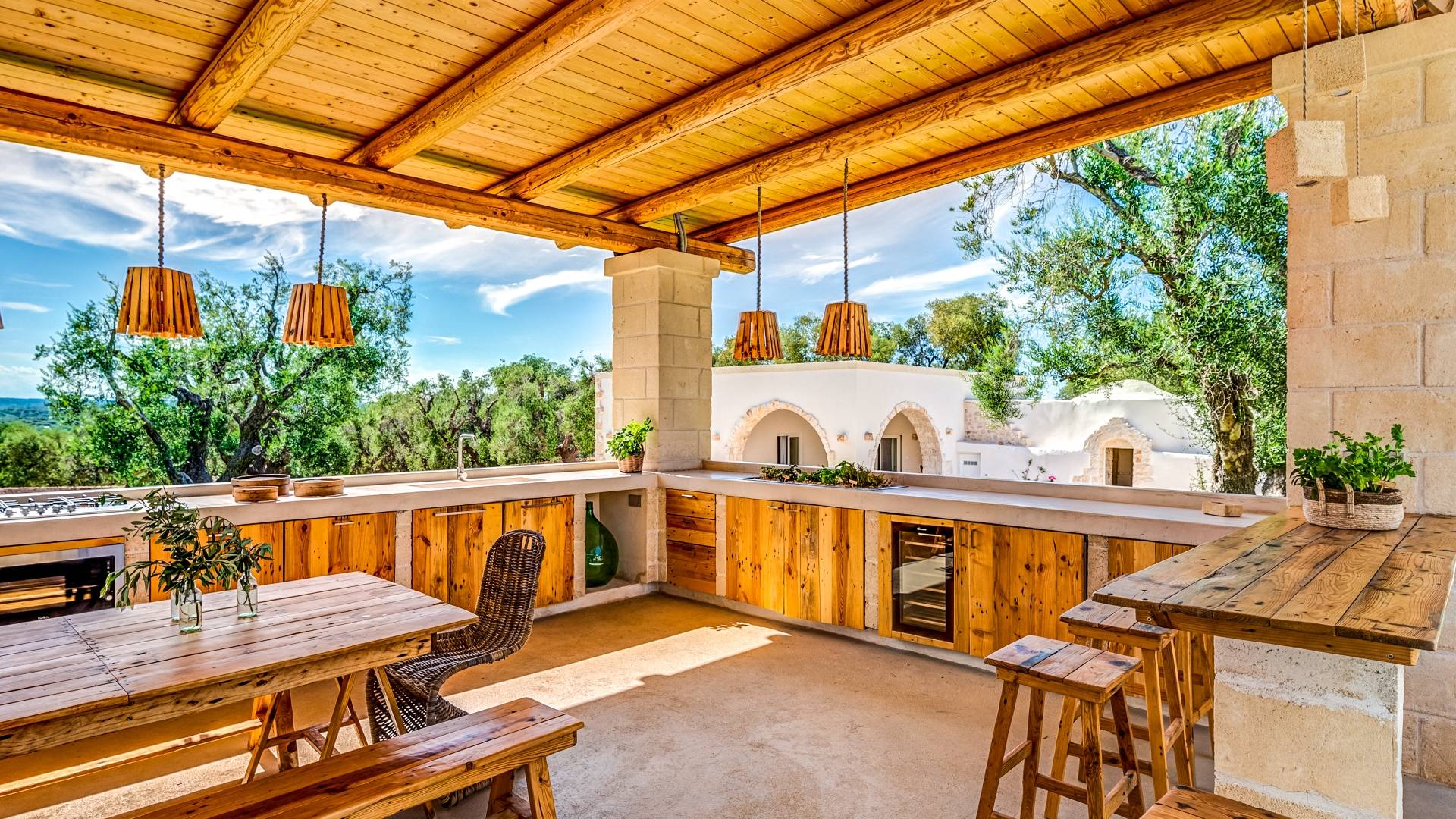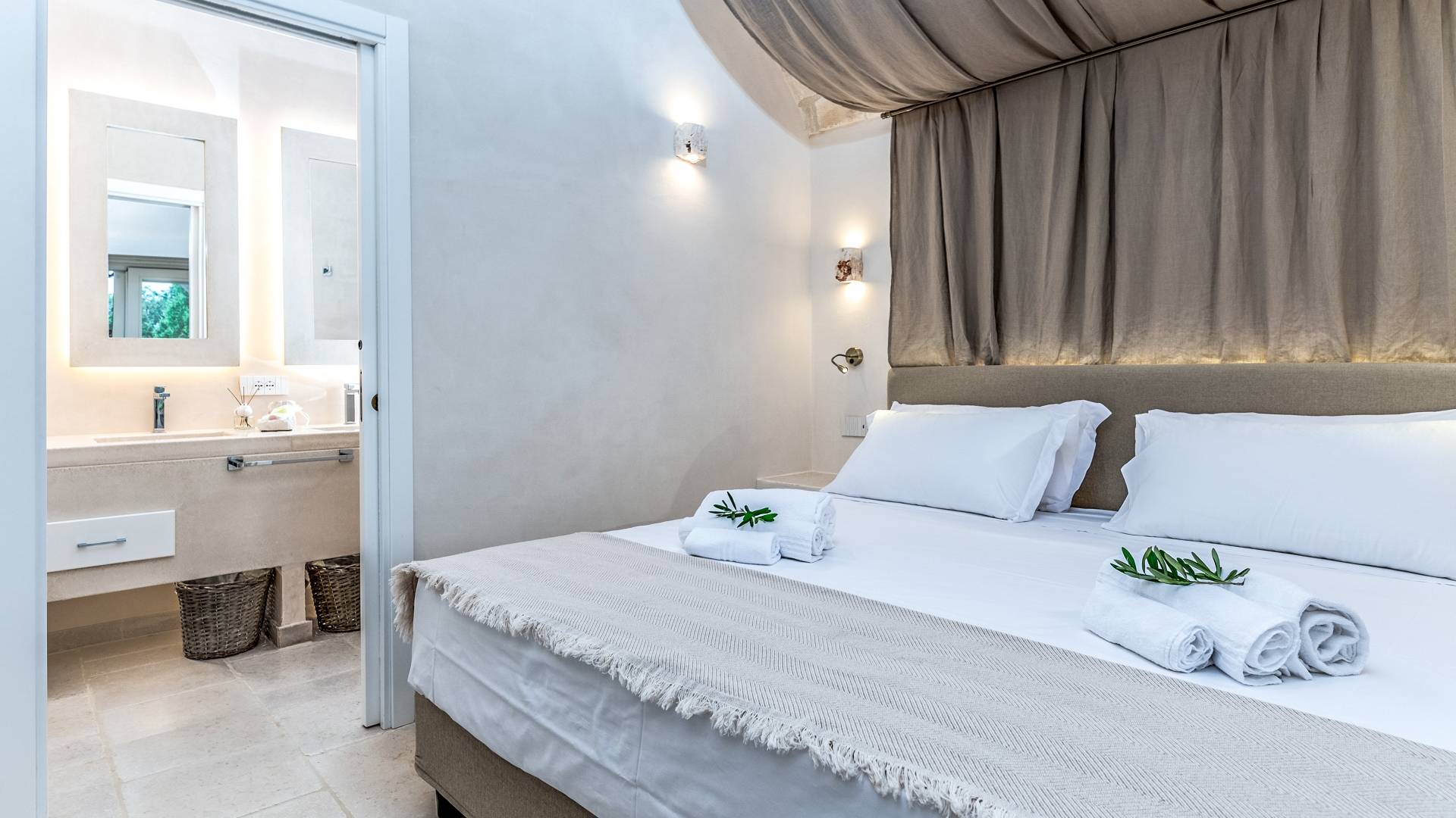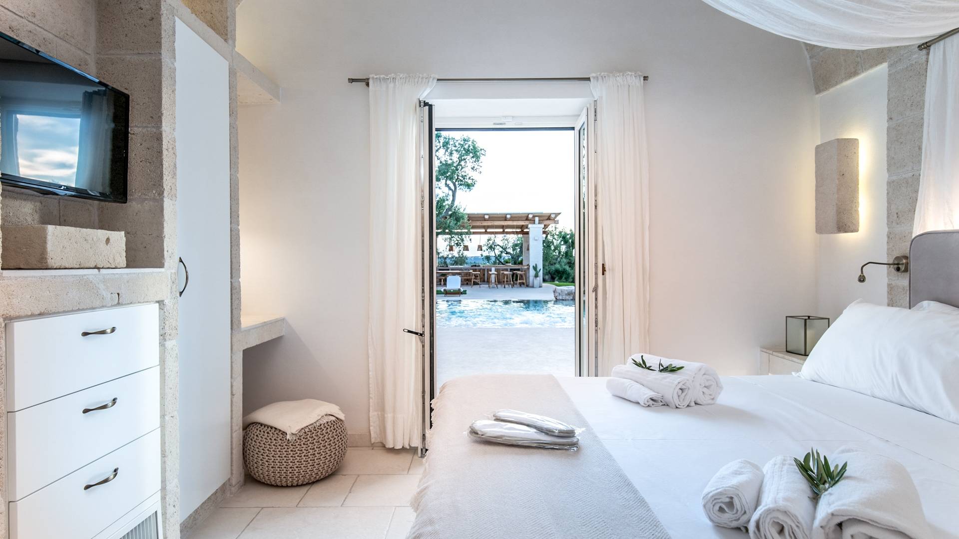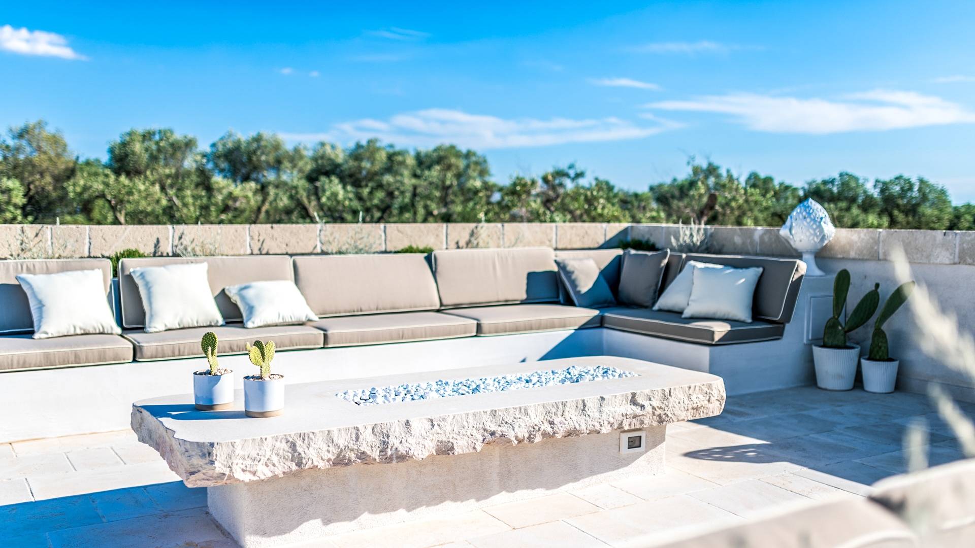 It can accommodate up to 12 people in six double bedrooms. Of the latest construction, the villa consists of 3 different areas: the main residence, with two bedrooms with en suite bathroom (consisting of double sinks and shower with two shower heads), kitchen, and living room. The dependence with the typical trullo with a romantic atmosphere and three bedrooms (all with private bathroom), two of which are communicating. In total there are 6 bedrooms. All the rooms are equipped with independent air conditioning and heating; The three bedrooms in the annex and the trullo have underfloor heating.