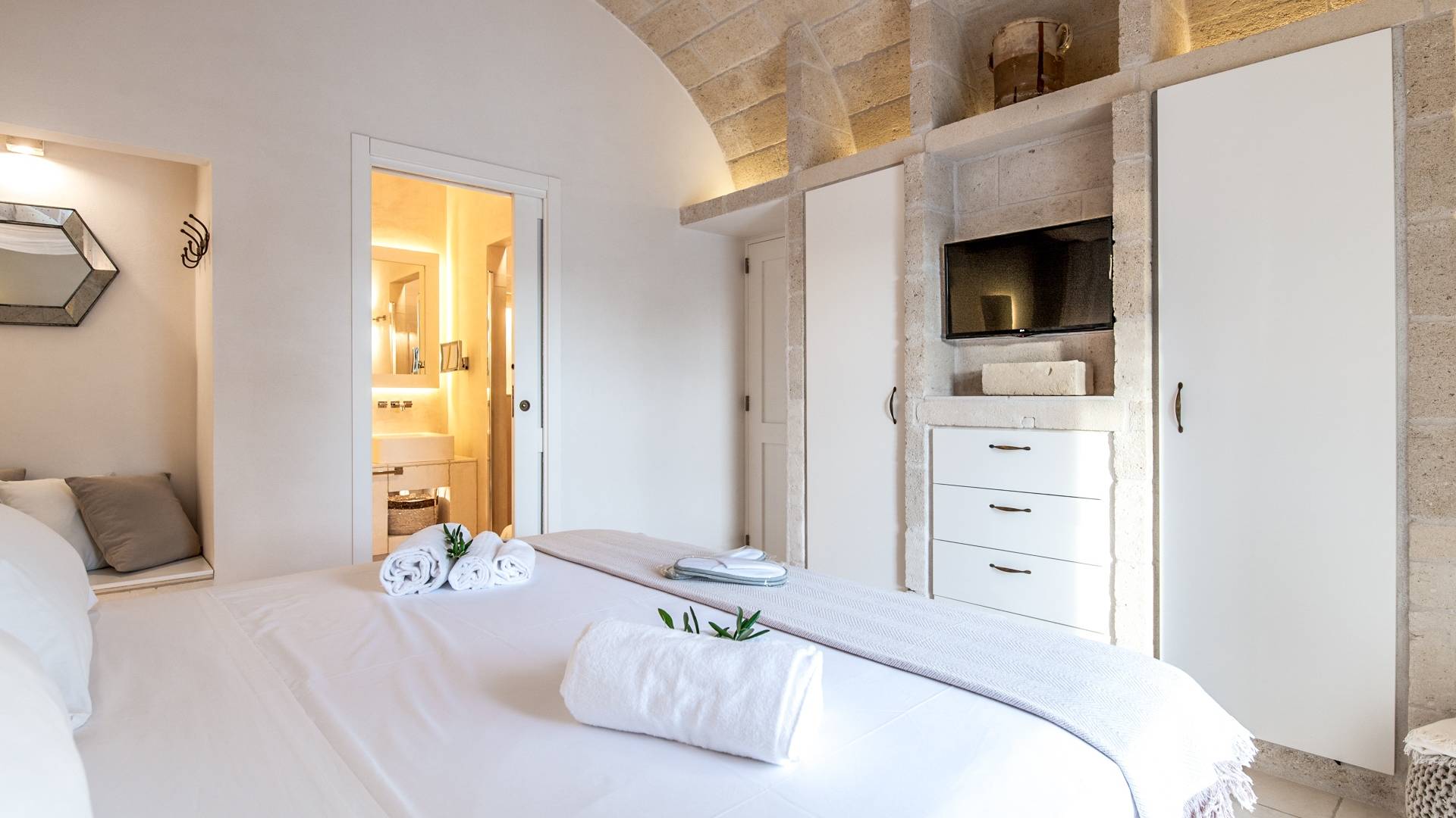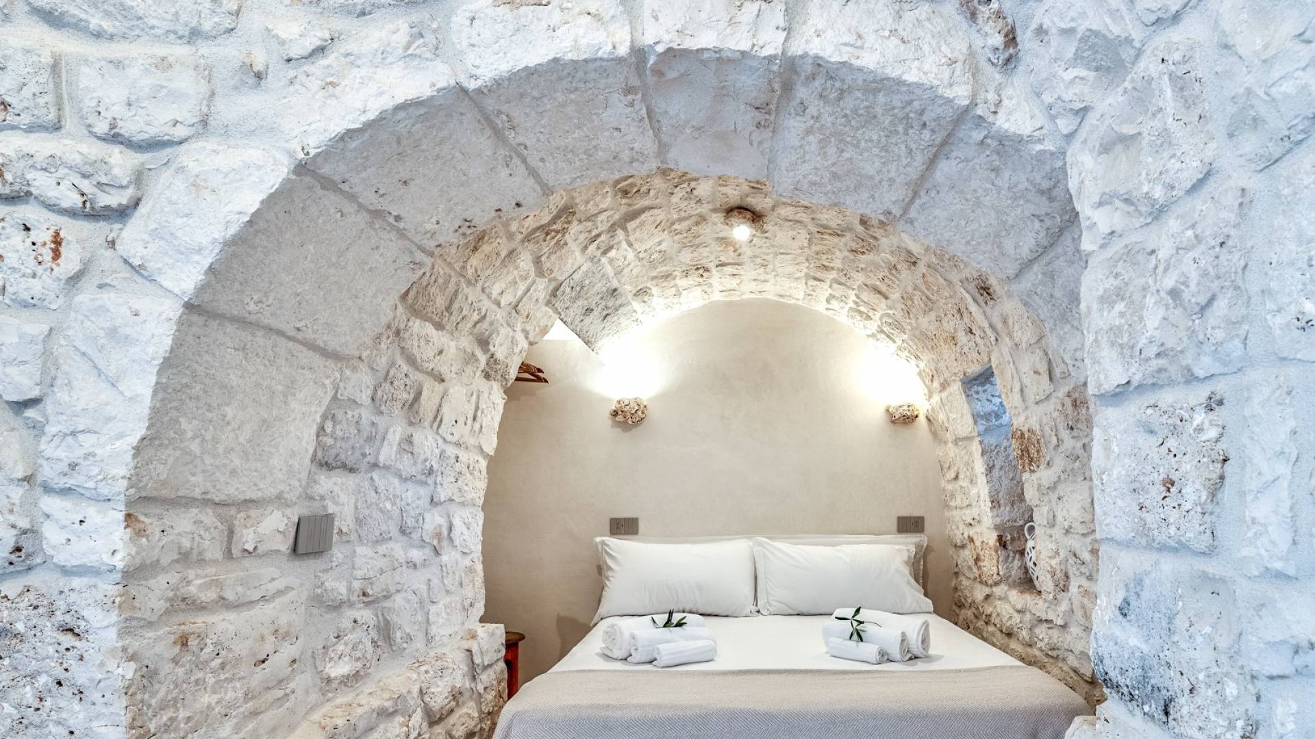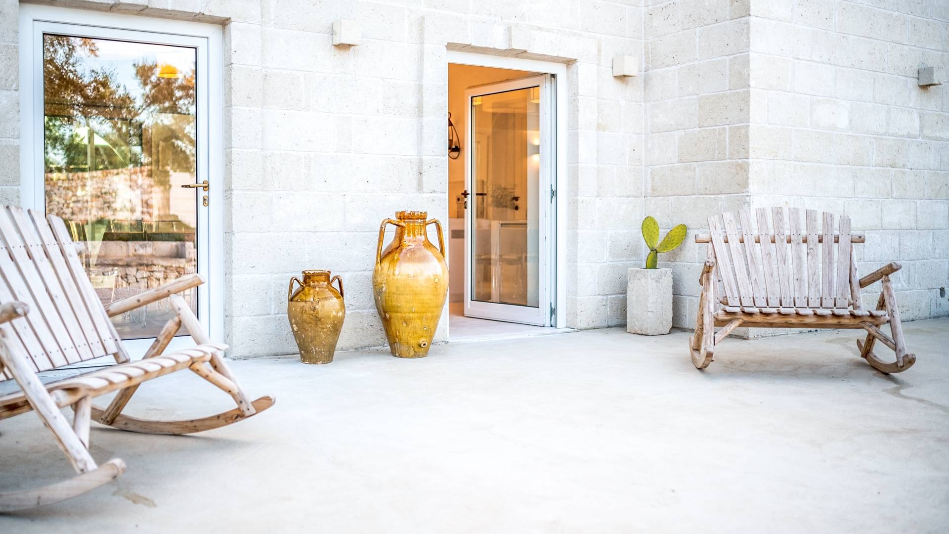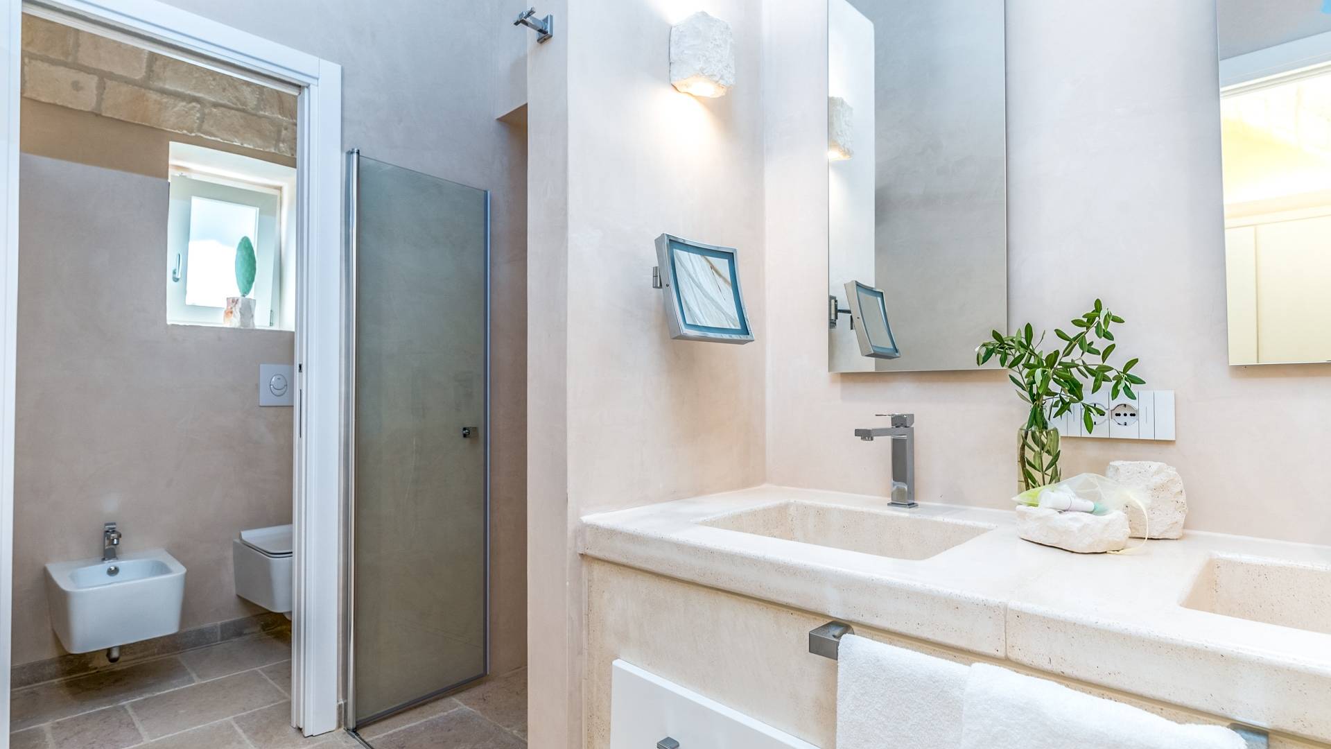 It can accommodate up to 12 people in six double bedrooms. Of the latest construction, the villa consists of 3 different areas: the main residence, with two bedrooms with en suite bathroom (consisting of double sinks and shower with two shower heads), kitchen, and living room. The dependence with the typical trullo with a romantic atmosphere and three bedrooms (all with private bathroom), two of which are communicating. In total there are 6 bedrooms. All the rooms are equipped with independent air conditioning and heating; The three bedrooms in the annex and the trullo have underfloor heating.