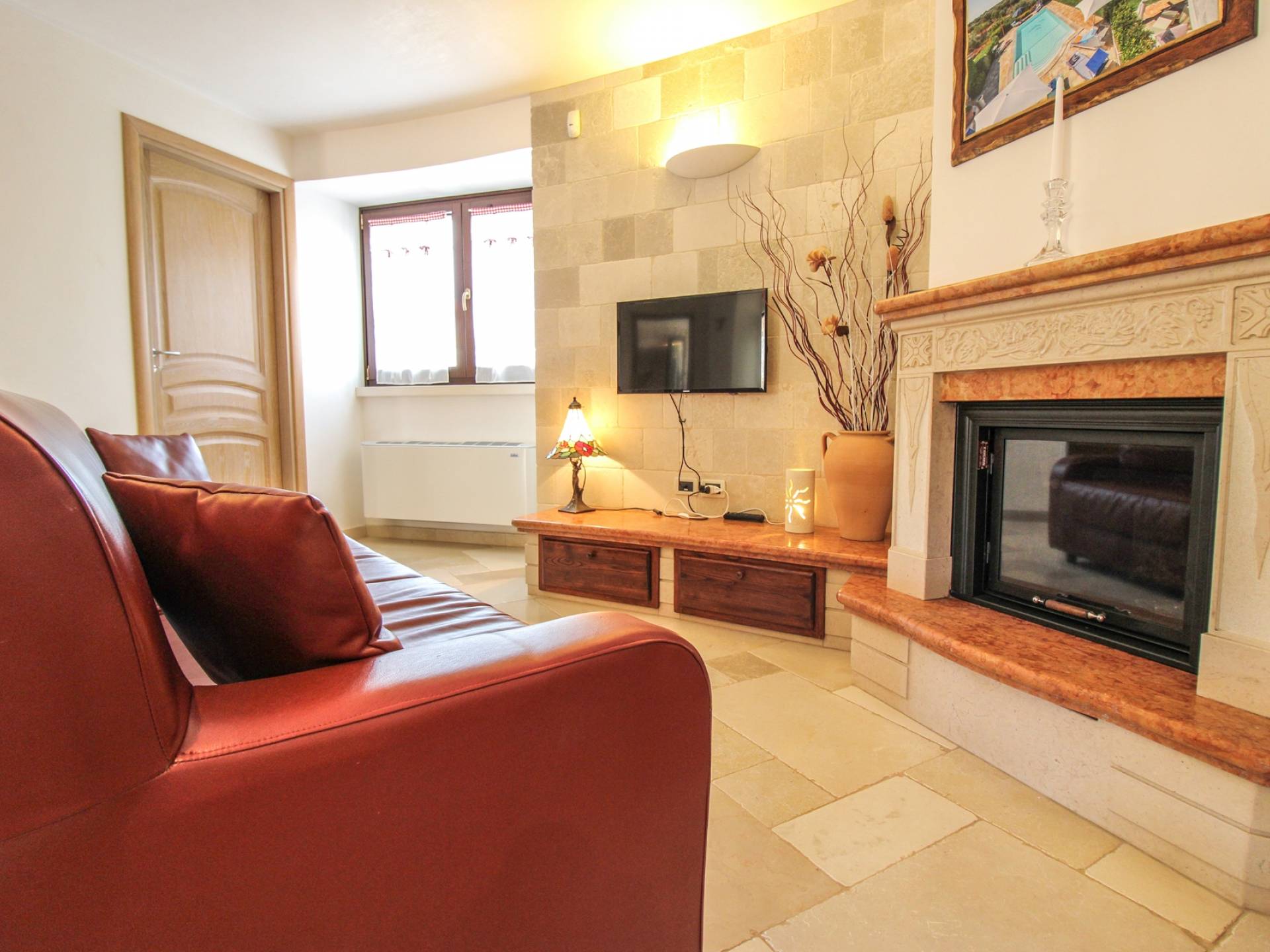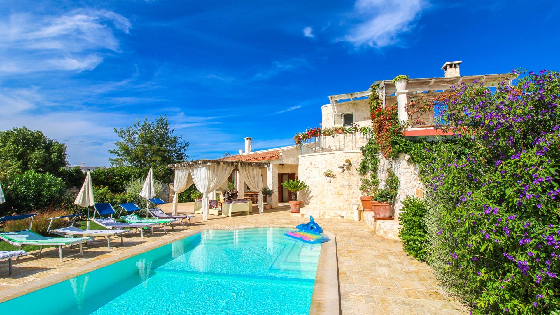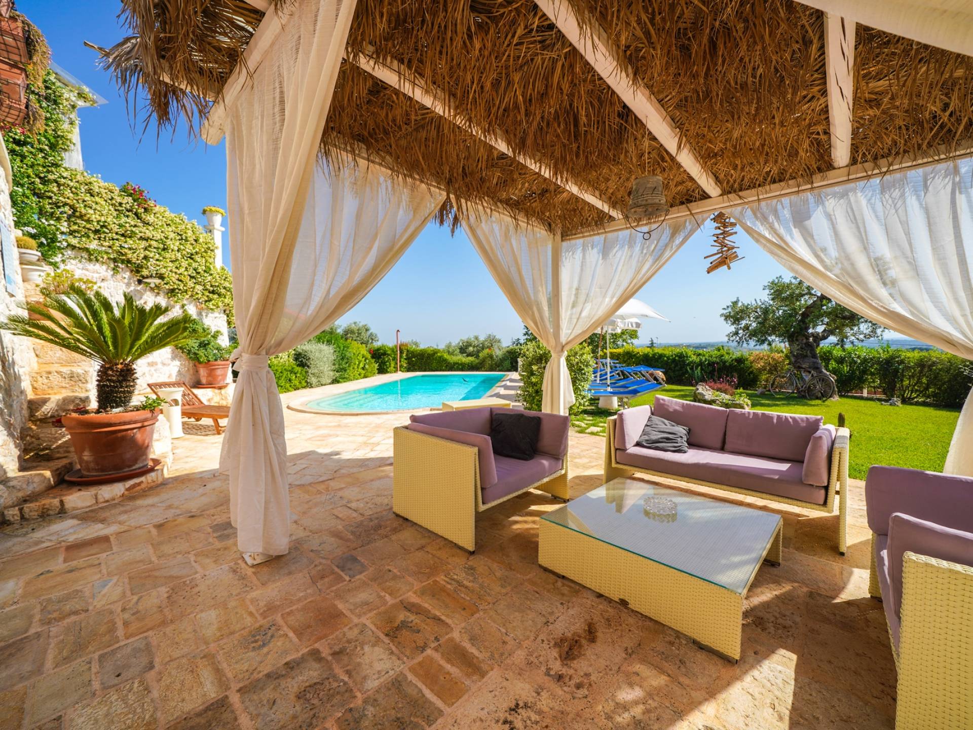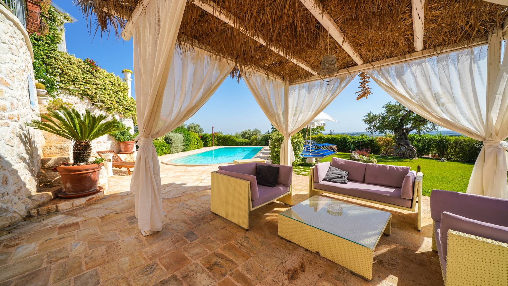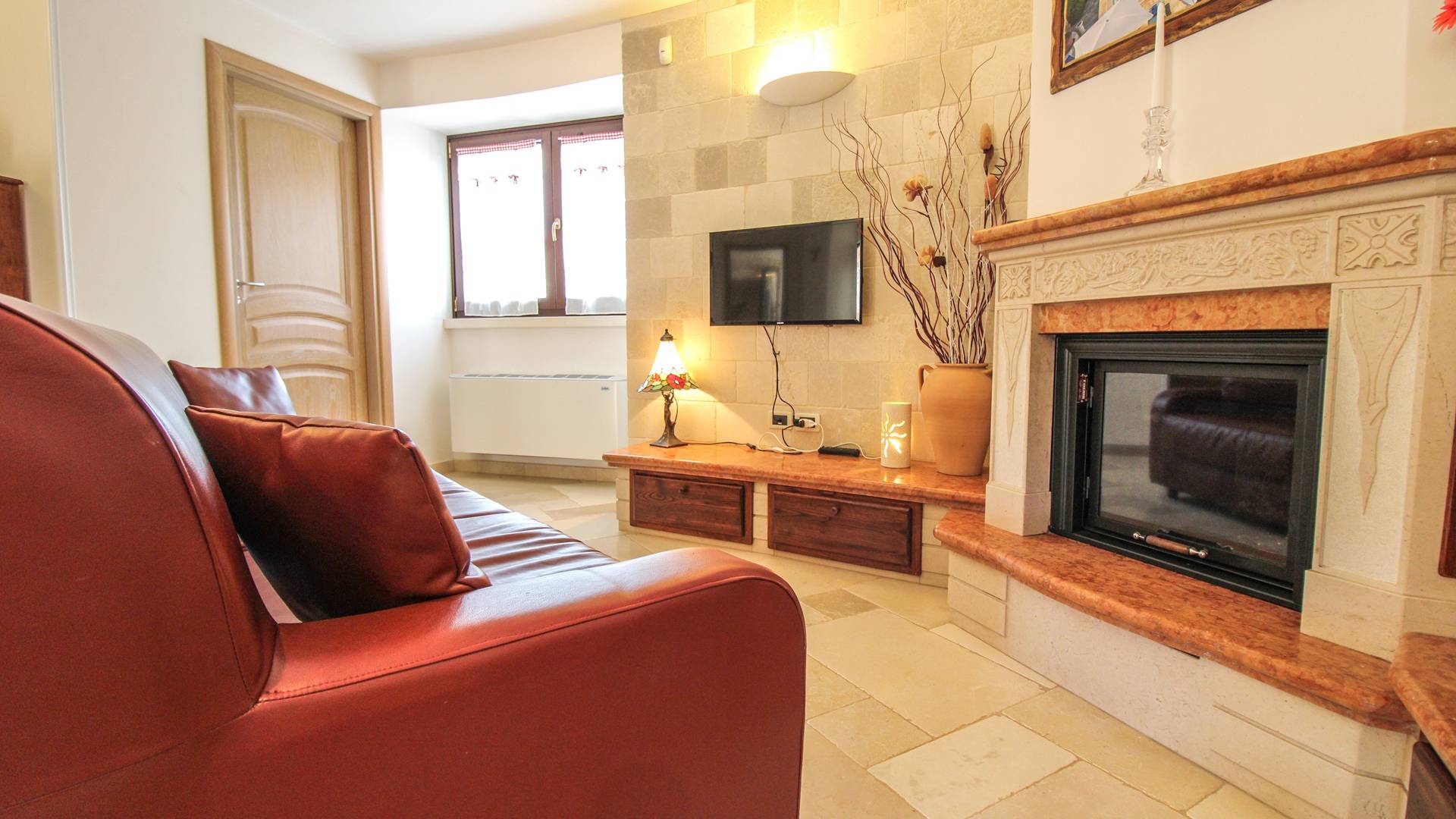 All the outdoor spaces are to be experienced, with the verdant garden in the center of which you will find the large double-bottomed swimming pool, the solarium with sun loungers and umbrellas, the patio where you can spend moments in the company and in joy, a comfortable gazebo with a low table, sofas, and armchairs. Inside, however, you will be welcomed by a charming living room with vaulted stone walls and ceilings, equipped with a fireplace and a large leather corner sofa. You will feel the embrace of one of the typical houses in the area. The large space also reserves a pleasant corner bar.