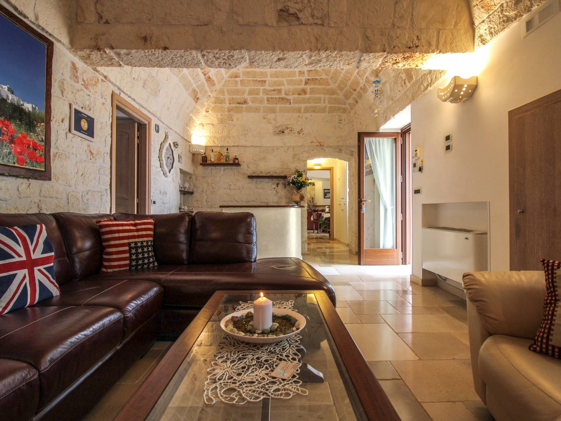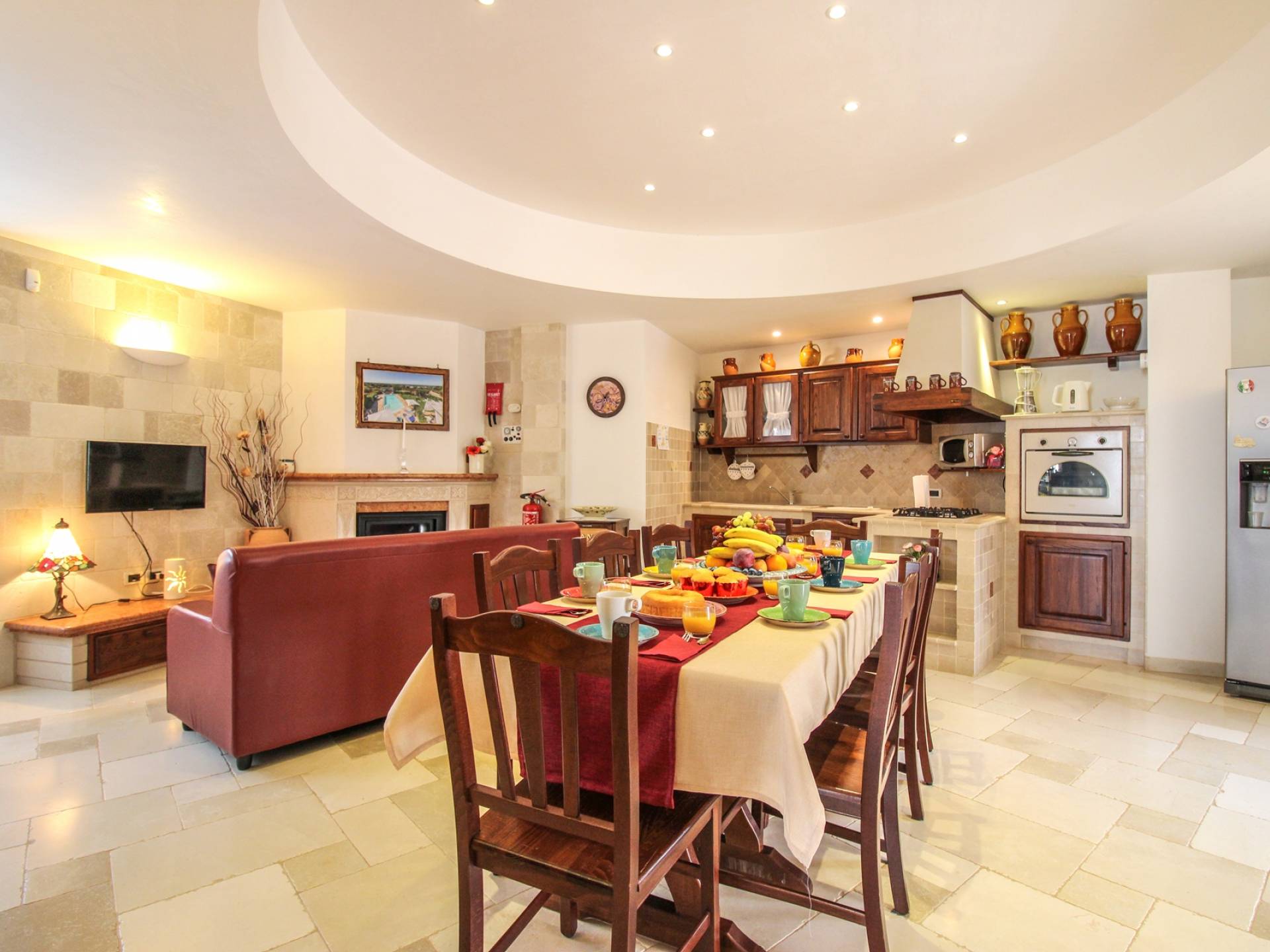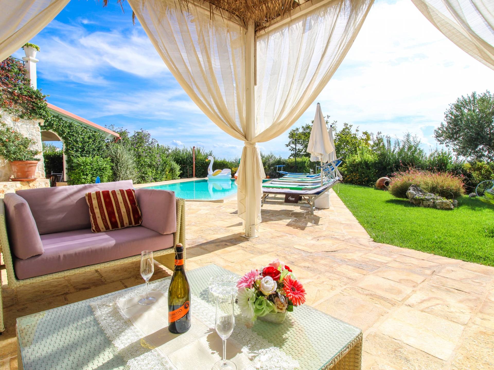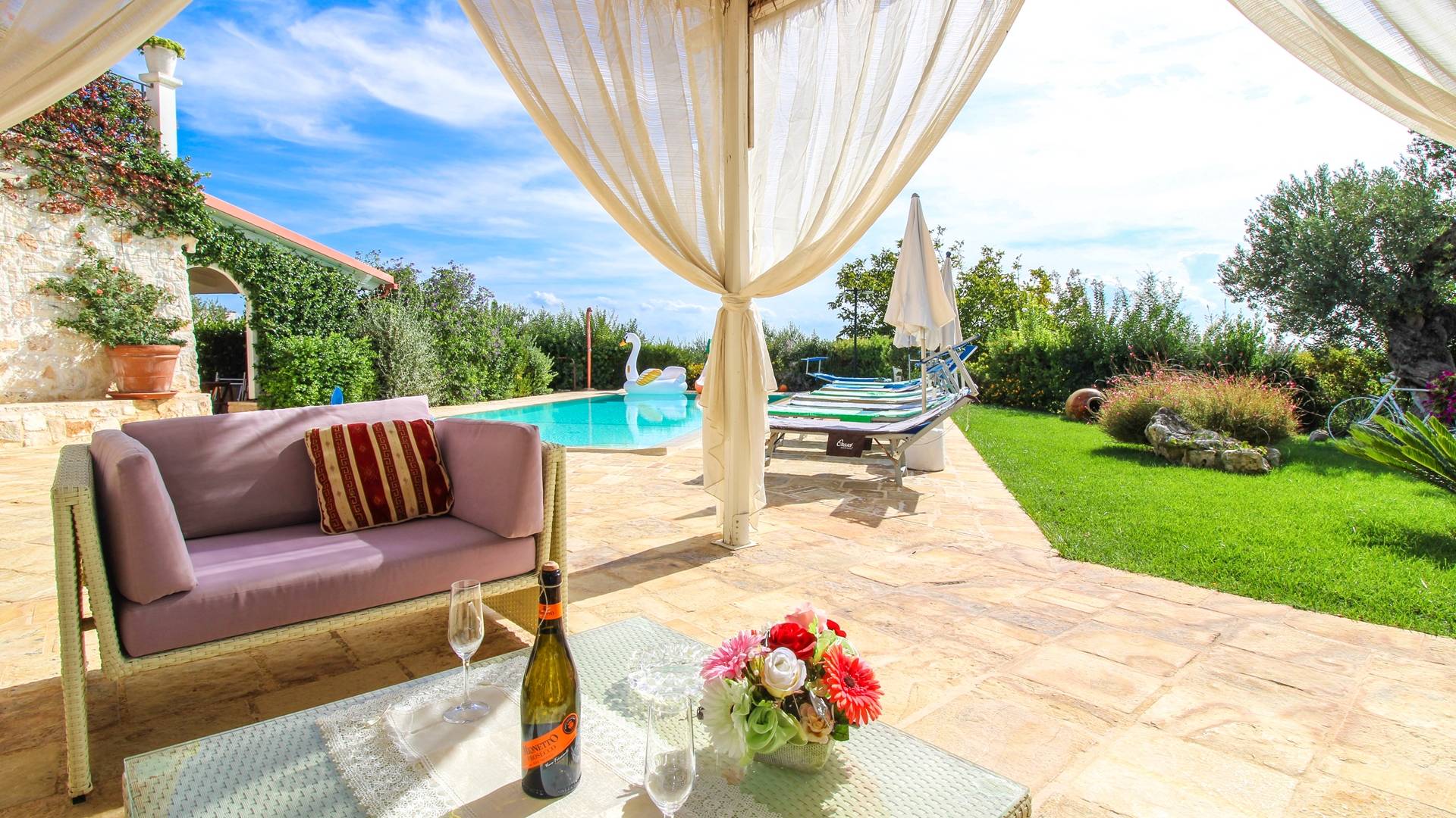All the outdoor spaces are to be experienced, with the verdant garden in the center of which you will find the large double-bottomed swimming pool, the solarium with sun loungers and umbrellas, the patio where you can spend moments in the company and in joy, a comfortable gazebo with a low table, sofas, and armchairs. Inside, however, you will be welcomed by a charming living room with vaulted stone walls and ceilings, equipped with a fireplace and a large leather corner sofa. You will feel the embrace of one of the typical houses in the area. The large space also reserves a pleasant corner bar.