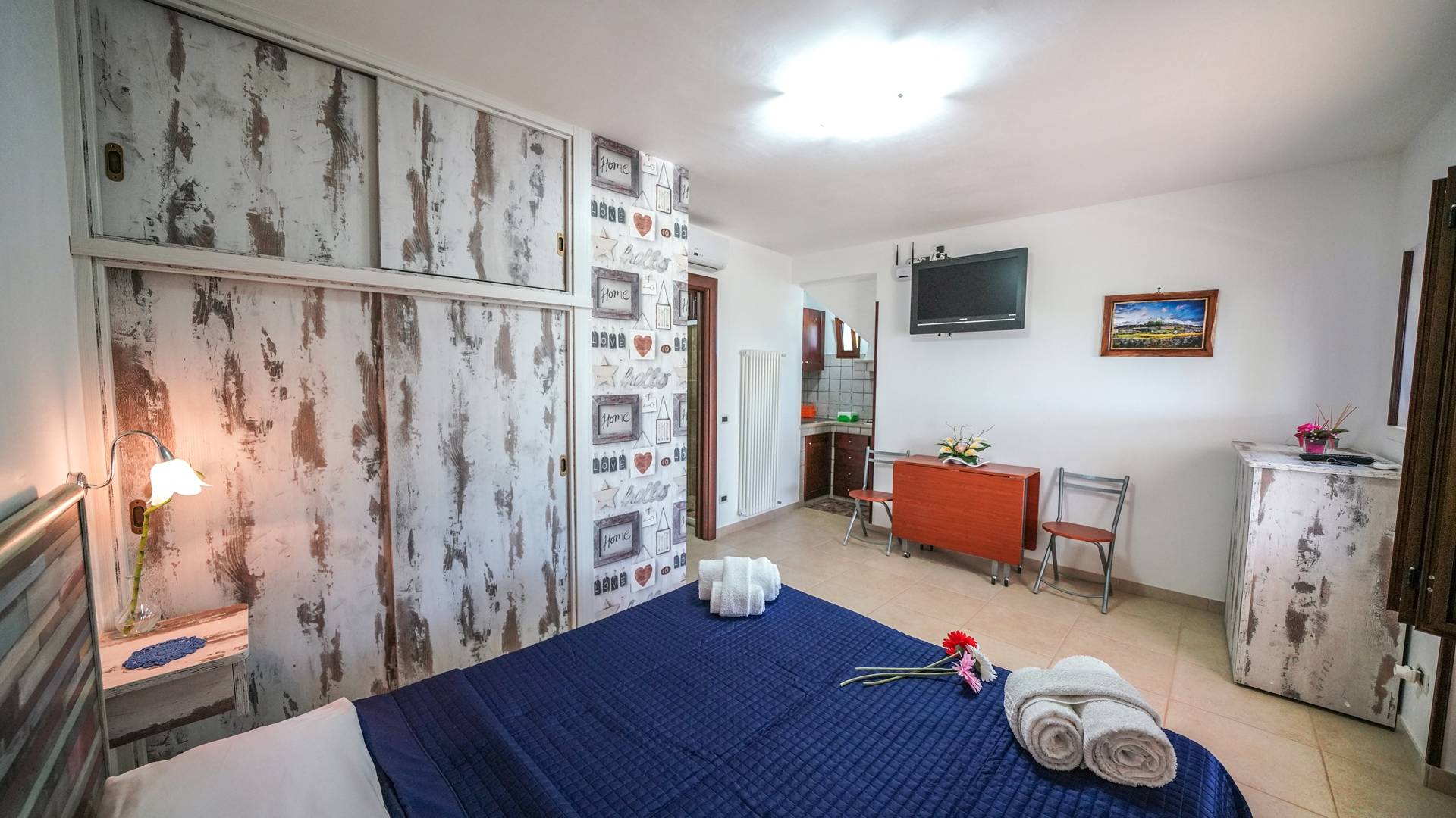 An arched entrance connects to the kitchen and dining room. The first one is equipped with everything you need: a five-burner hob, oven, double sink, dishwasher, microwave, extractor hood, dishes, utensils, and a table for 8 people. In the kitchen, you will also find a fireplace, dressers, and solid wood furniture. In the sleeping area, large and bright rooms will make you feel at ease. The house also has a beautiful terrace overlooking the surrounding countryside.