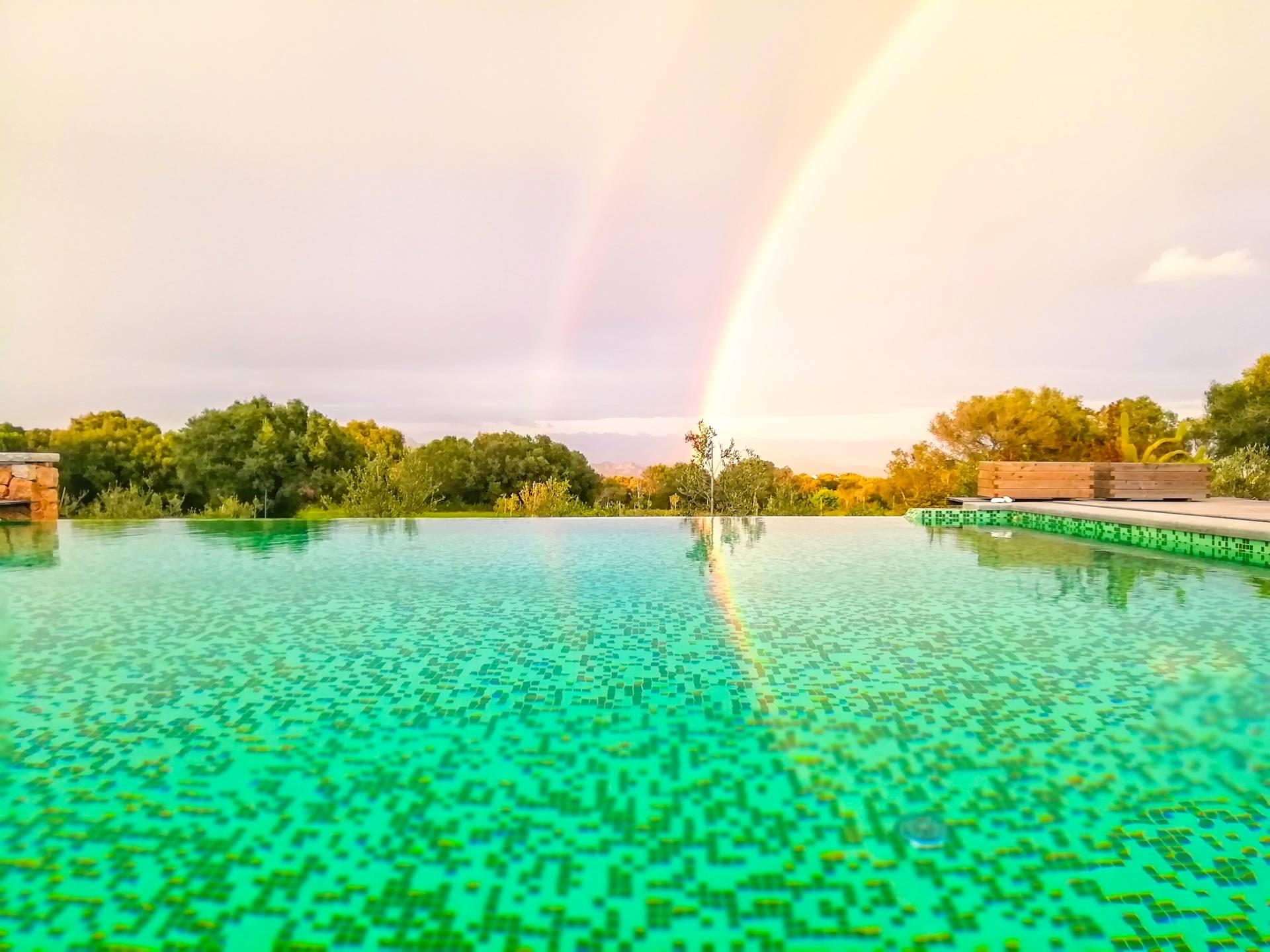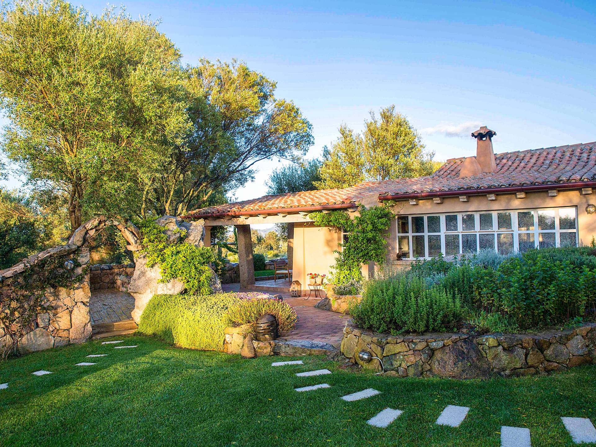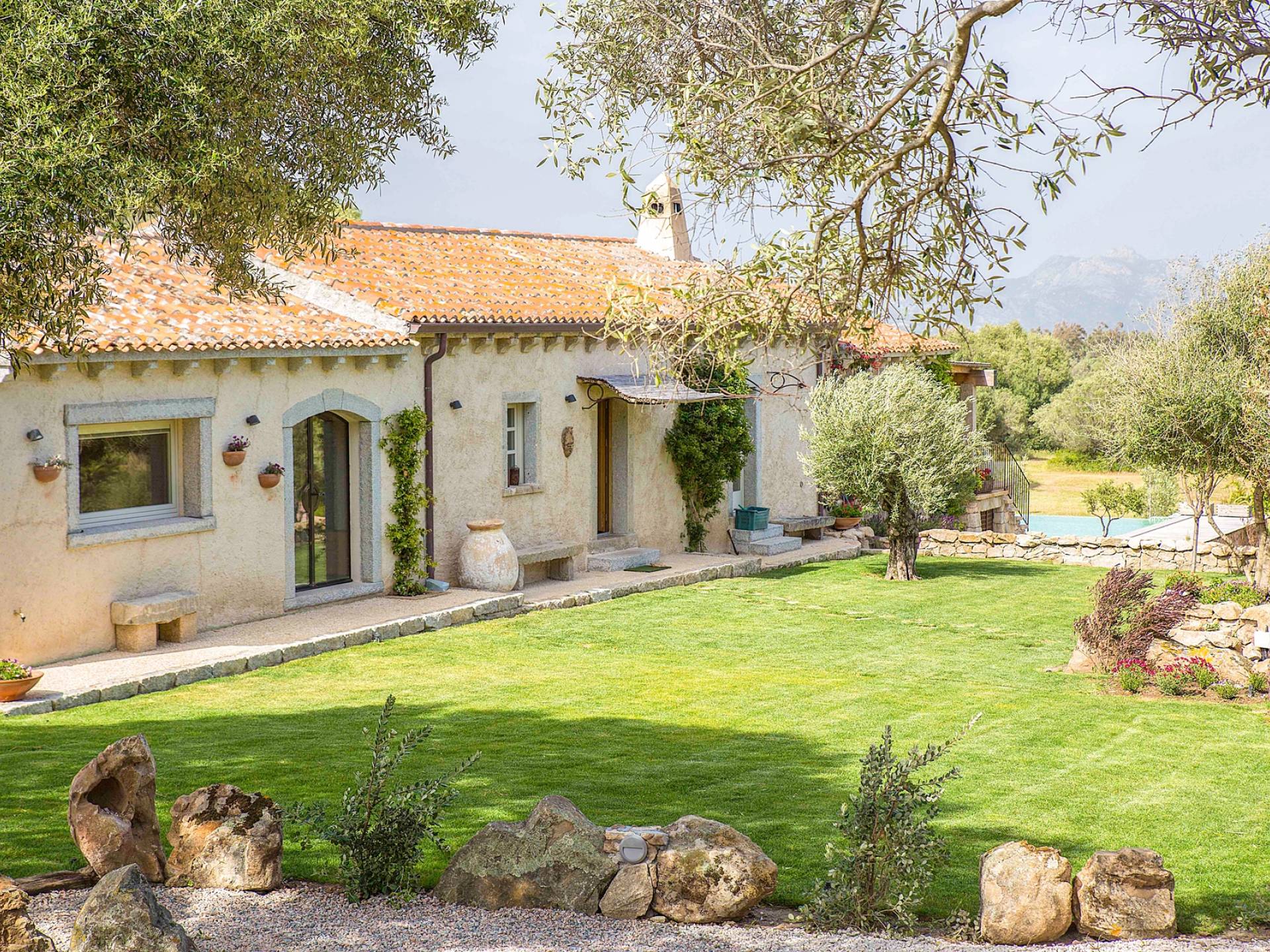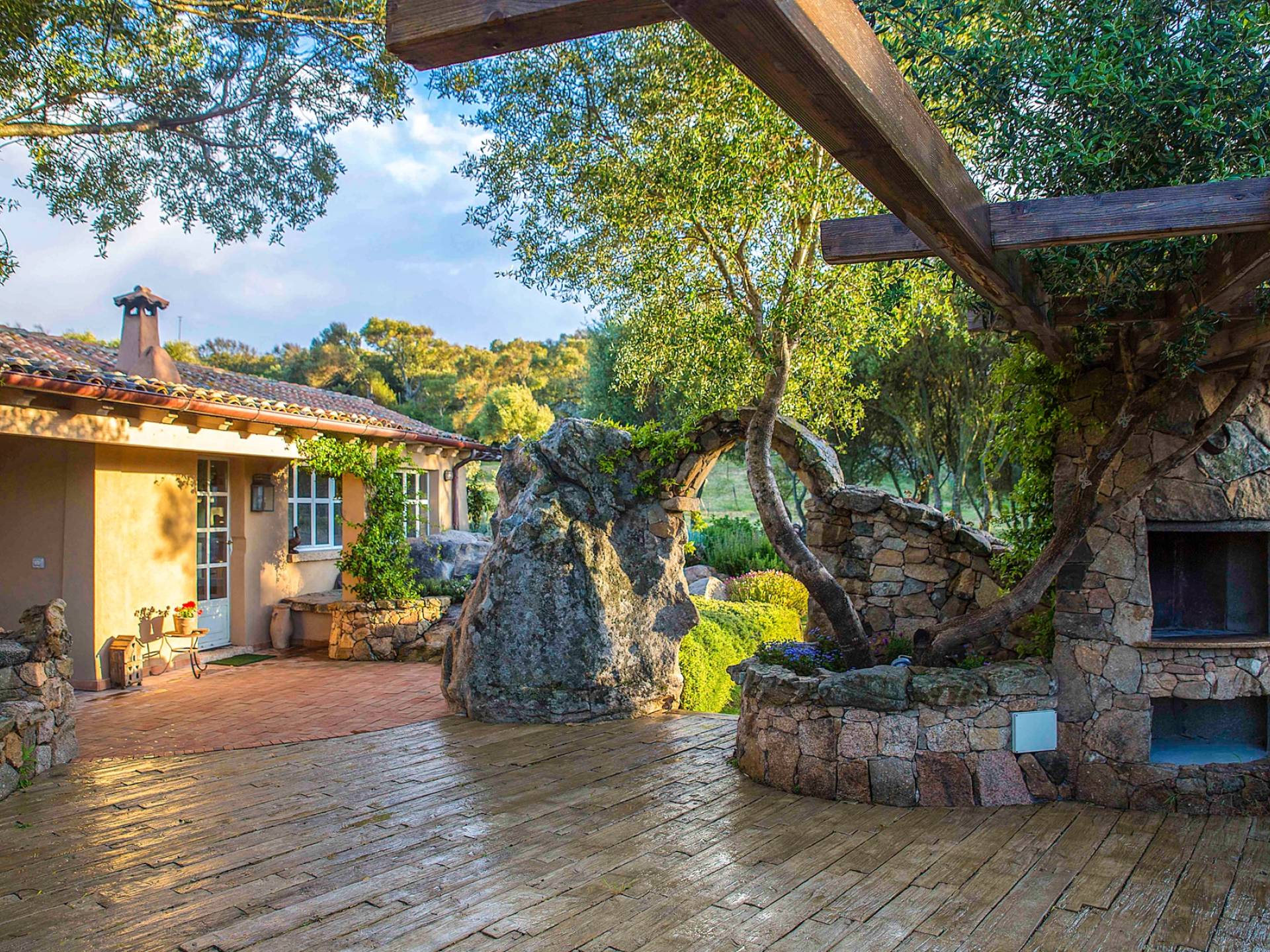 Nature blending with quality. Welcome to Villa Calicanto, a romantic residence on the Costa Smeralda. The property consists of two old country houses, completely renovated and restructured, made of stone around which a large green garden develops and houses a fantastic swimming pool immersed in the greenery of an extraordinary park of olive trees. The property boasts 40 thousand square meters of land, 280 of which are covered. And then there are several terraces, two barbecue areas, and a countryside that extends as far as the eye can see, and there you will find centuries-old olive trees but also fruit trees and plants typical of the Mediterranean forest.