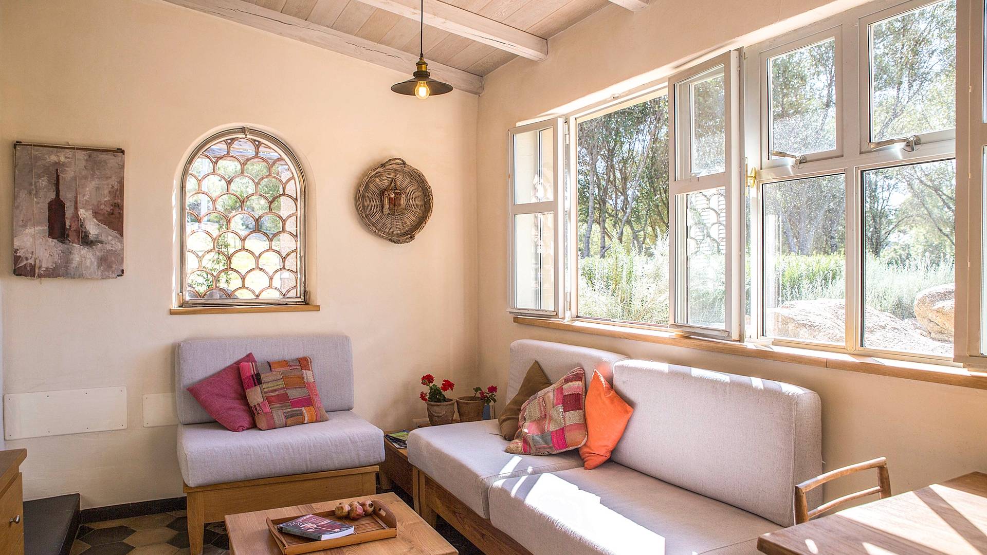 The living room and the equipped kitchen, connect the interiors with the garden through a huge window that overlooks the aromatic plants with a thousand scents. The house has its own nuragic-shaped barbecue area and a beautiful swimming pool immersed in the colors of the orchard.