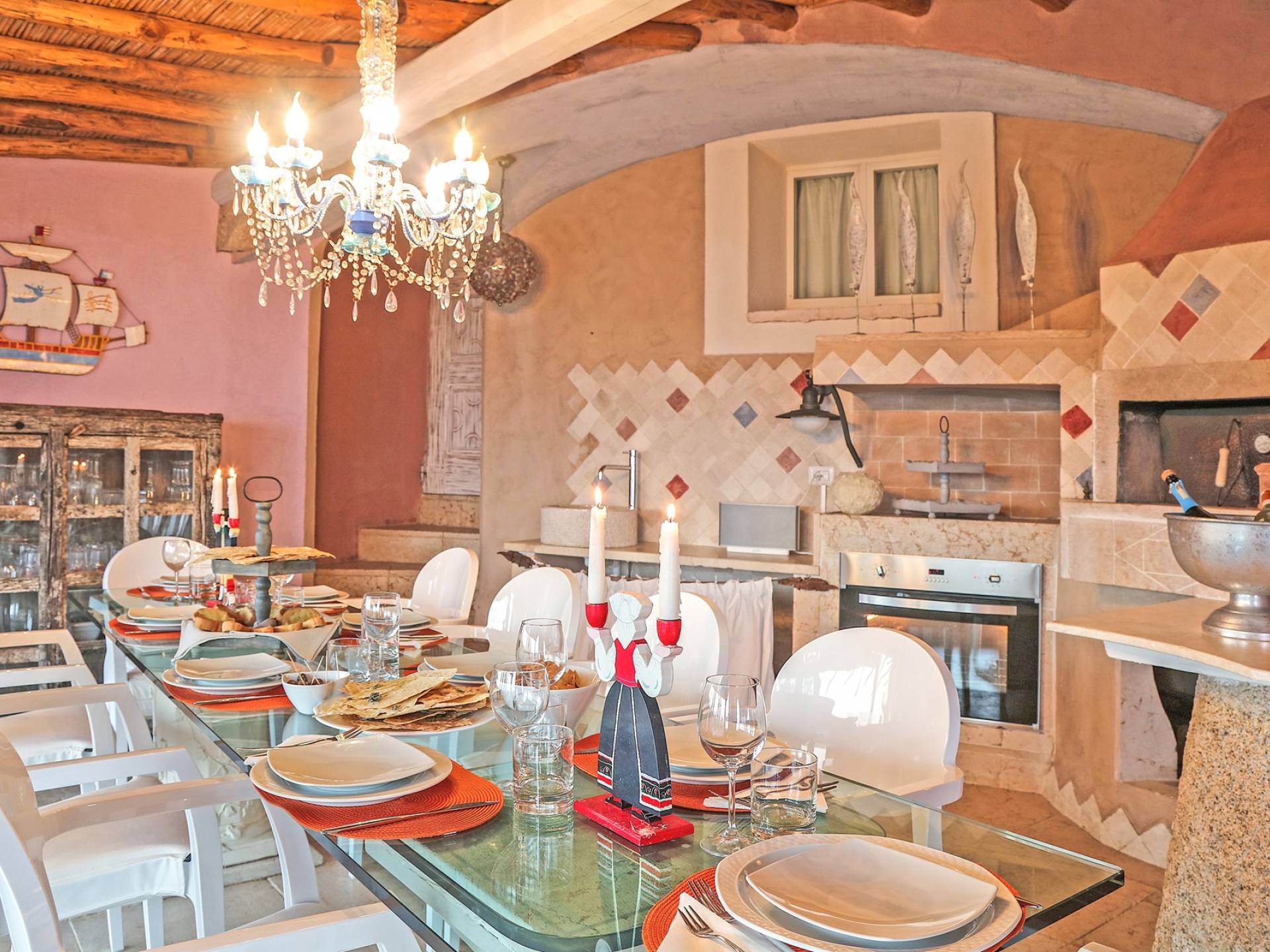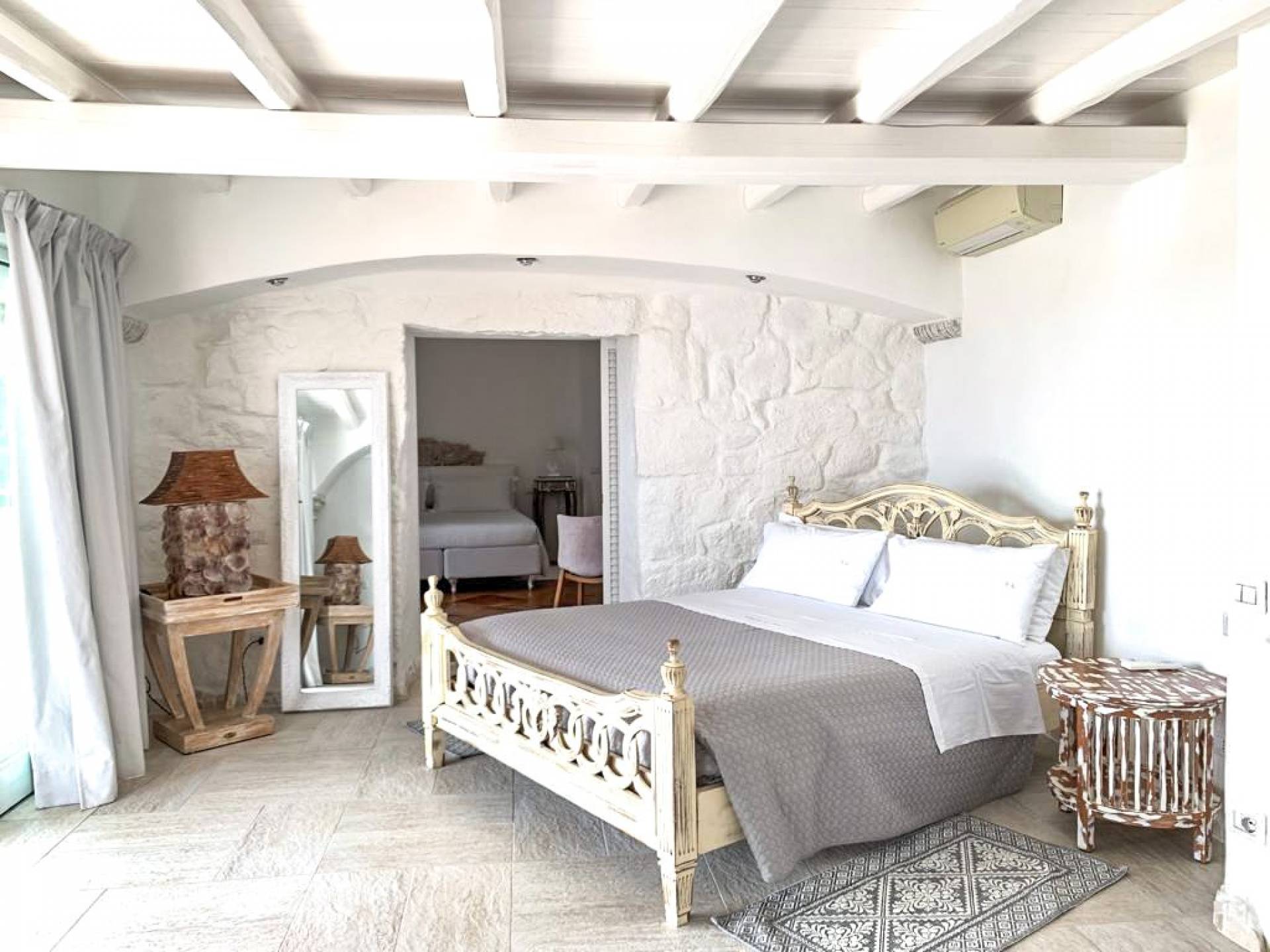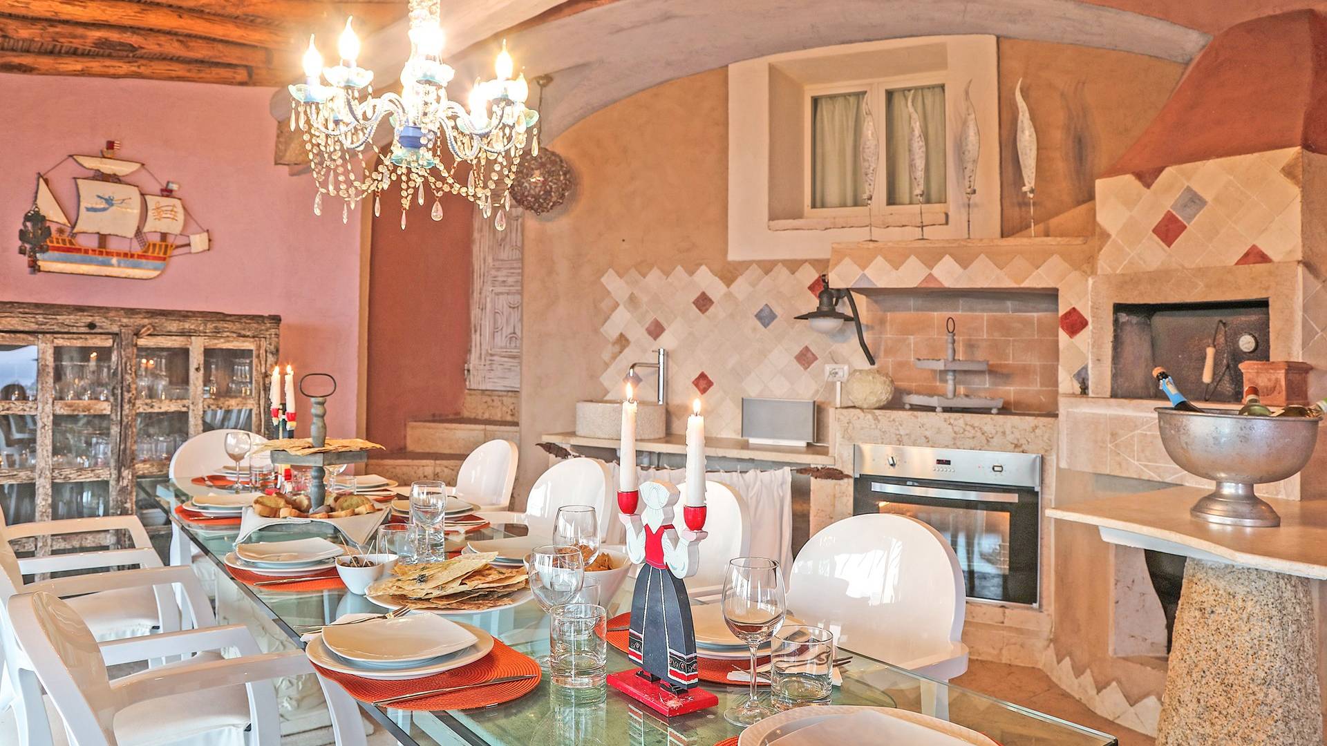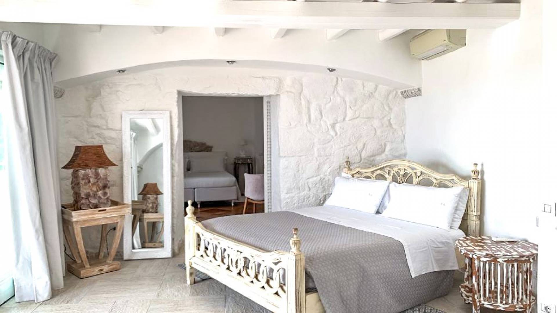 The charming mansion, designed by the famous architect Savin Couelle, is on two levels. You will be welcomed by a large living room connected to a kitchen with direct access to the barbecue area and outdoor spaces. The living room with fireplace and white leather sofas and high ceilings with exposed wooden beams will make you feel wrapped in a warm embrace. In the sleeping area, you will find at your disposal 6 ensuite bedrooms, two of which with independent entrances, capable of accommodating up to 13 guests. Particularly bright and very clean and refined are the interior spaces with furniture and linens that recall the tradition of the island.