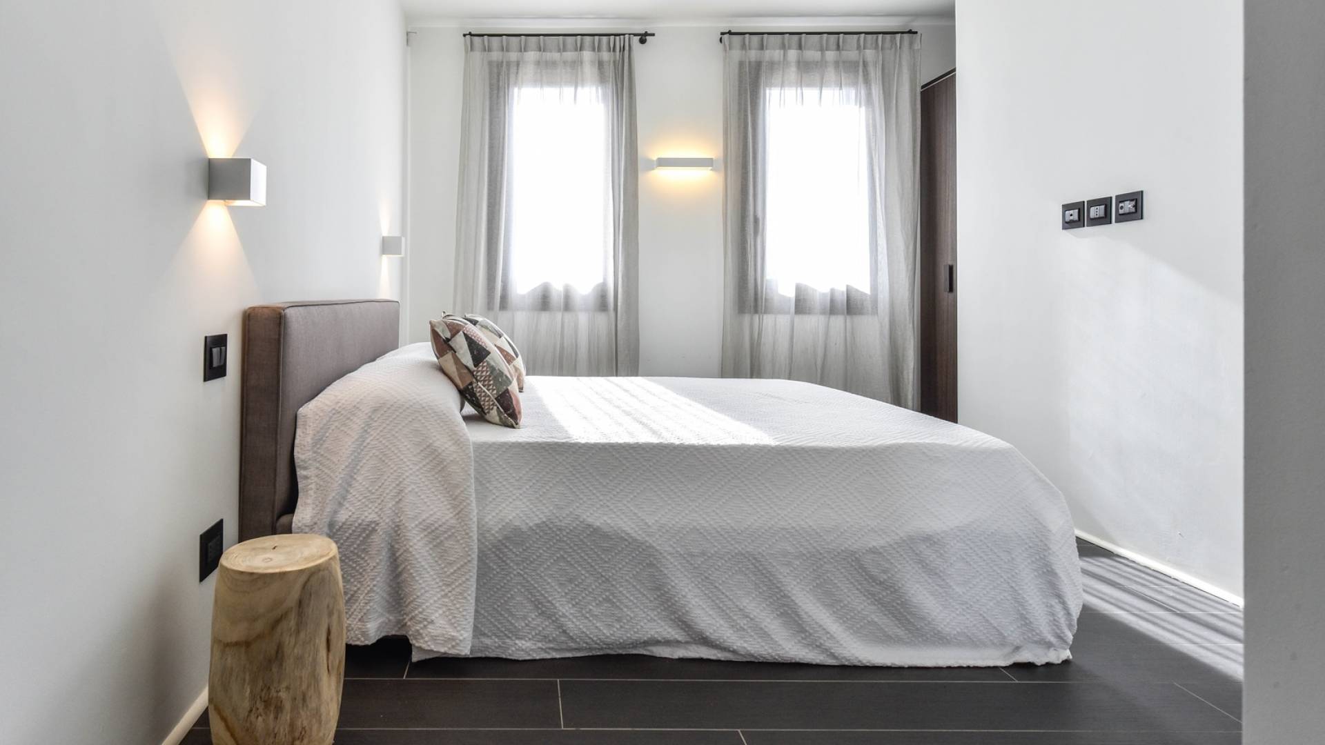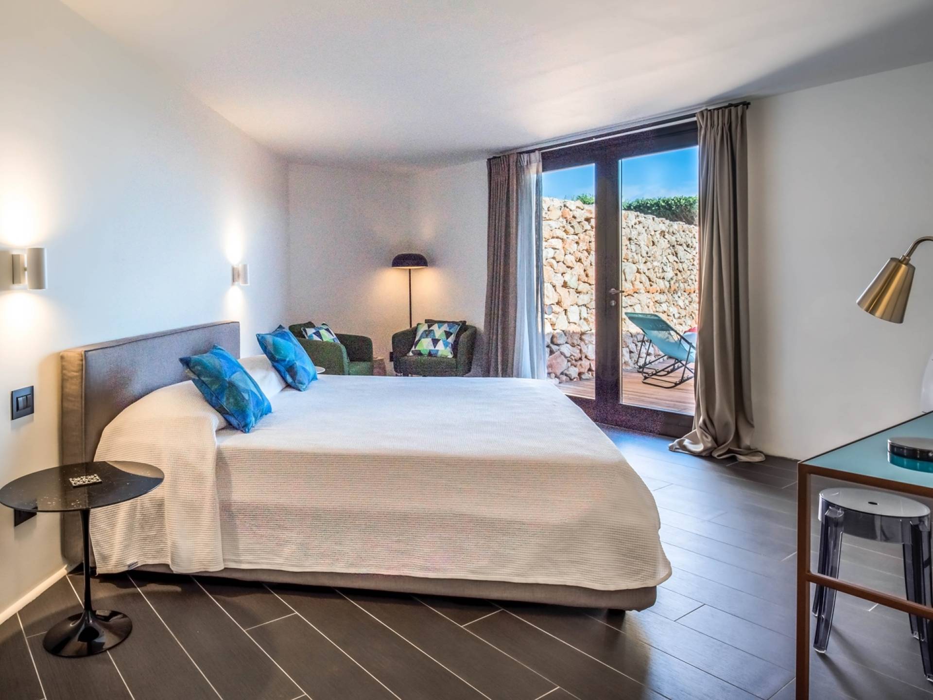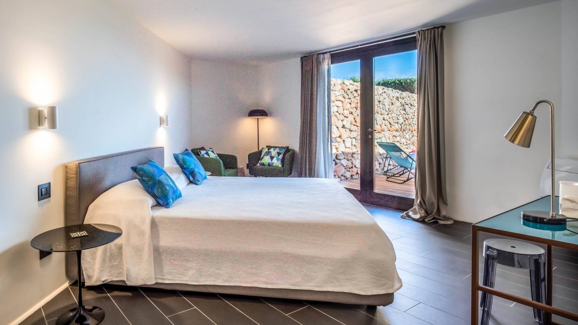The home design, approached with research in the historical context, results in a modern style with stone, modern tiled floors, and marble. The walls on the external side lend a contemporary feel while the interiors have clean and sharp lines of décor: the six bedrooms are all of the minimal architectural design, yet very comfortable, this is a contemporary retreat full of light and a welcoming vibe.