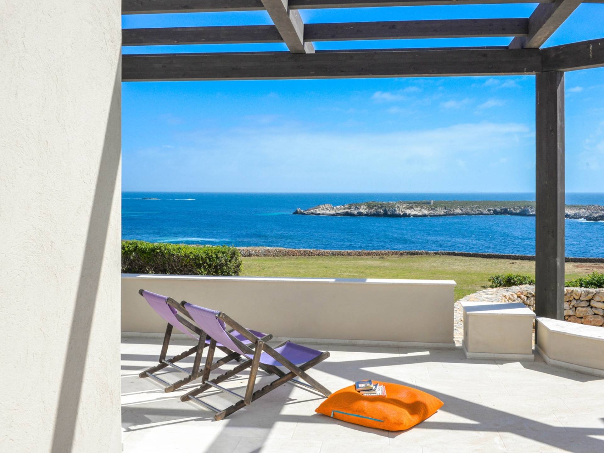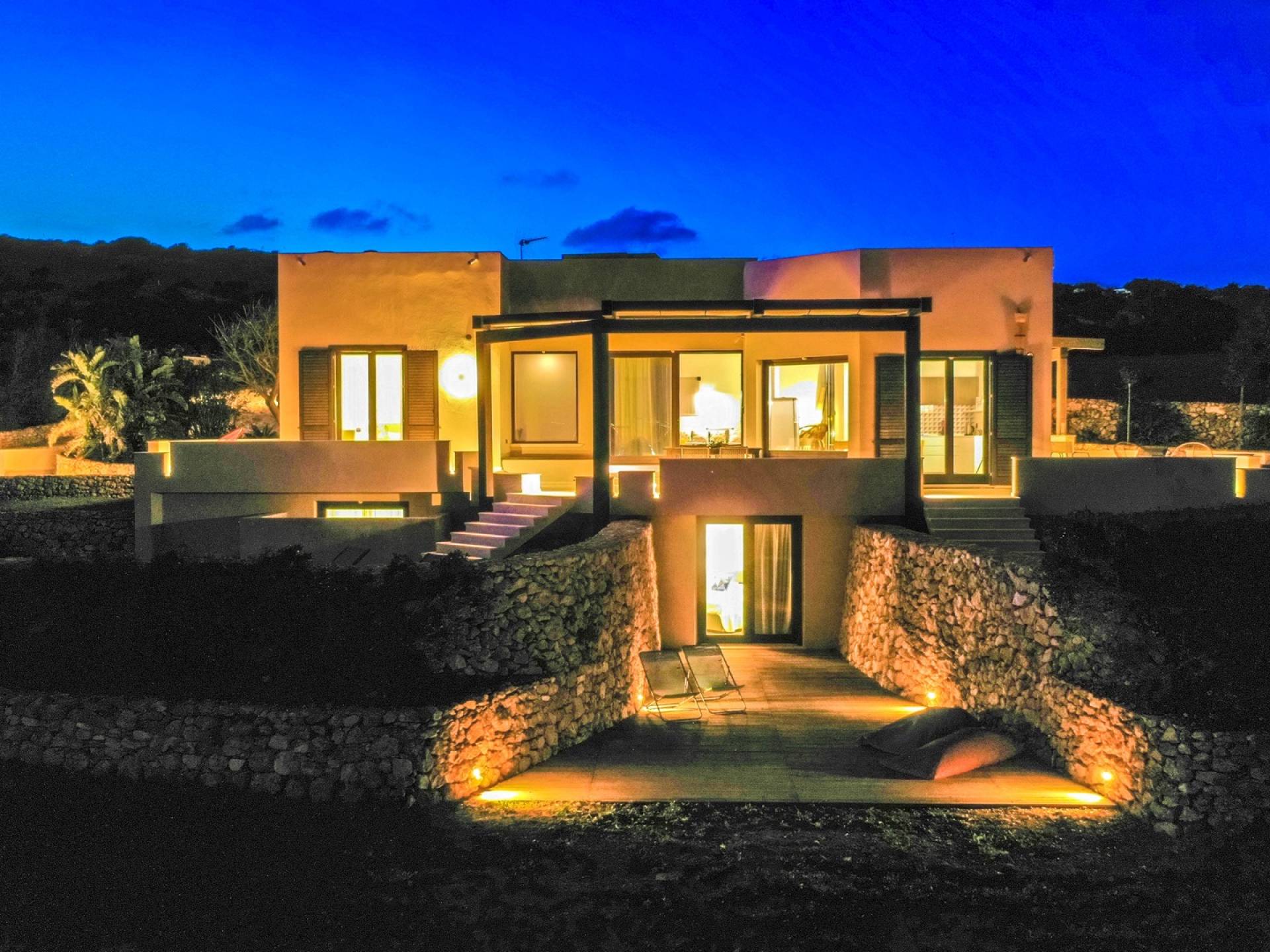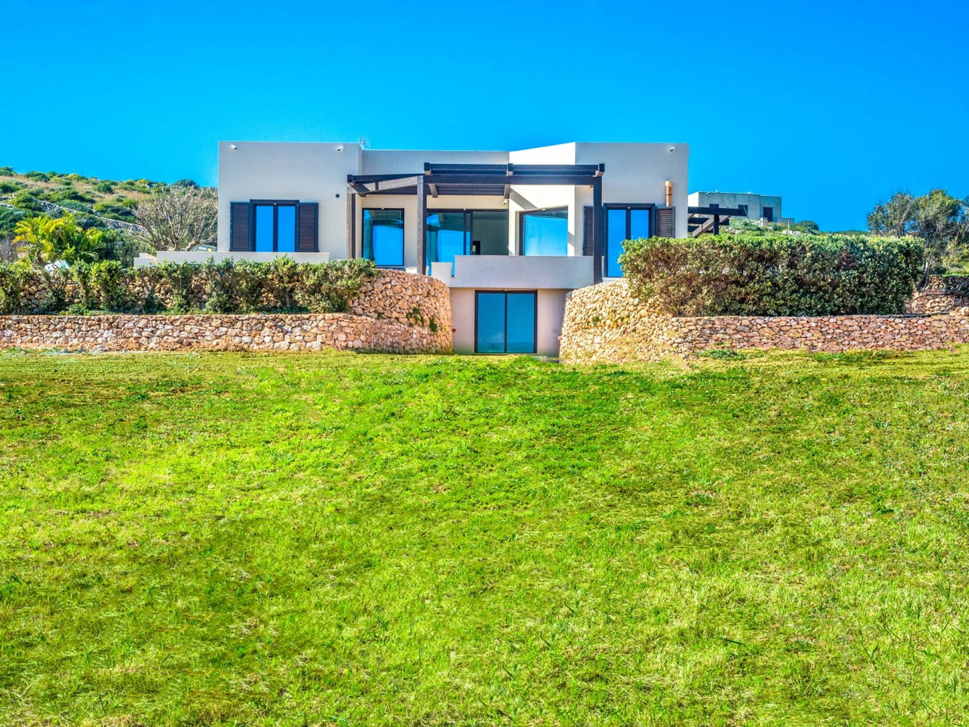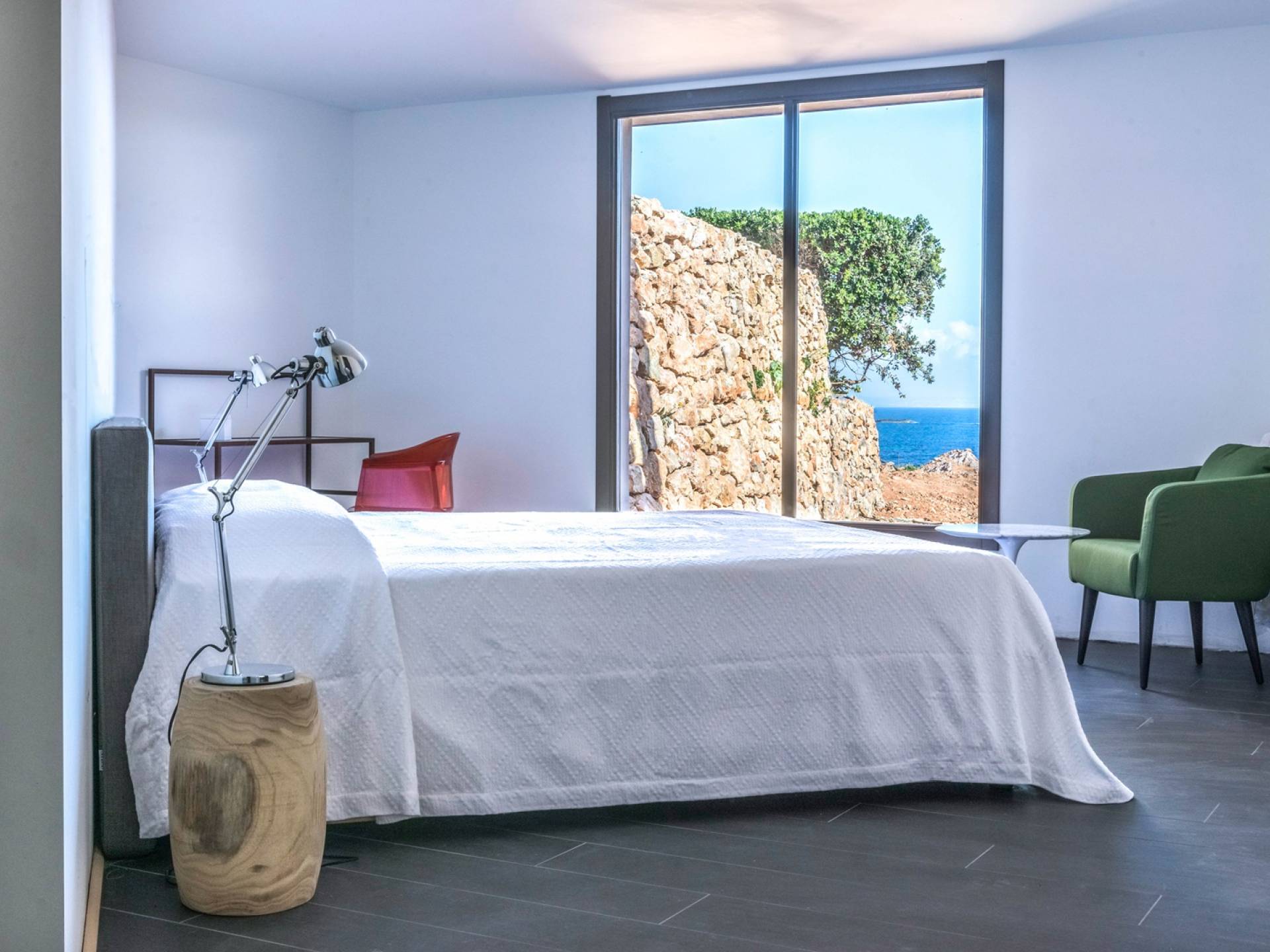 The interiors include a spacious living room, a sea view dining area with glass wall windows, and 2 eat-in well-equipped kitchens, the interior of the property measures 300 square meters and it can accommodate a total of 12 adults. A shelter of design and minimalism, that protects the inner environment with clean spaces and design items, in direct contraposition to the untouched sea life nature surrounding the house, with sunlight and sea breeze.