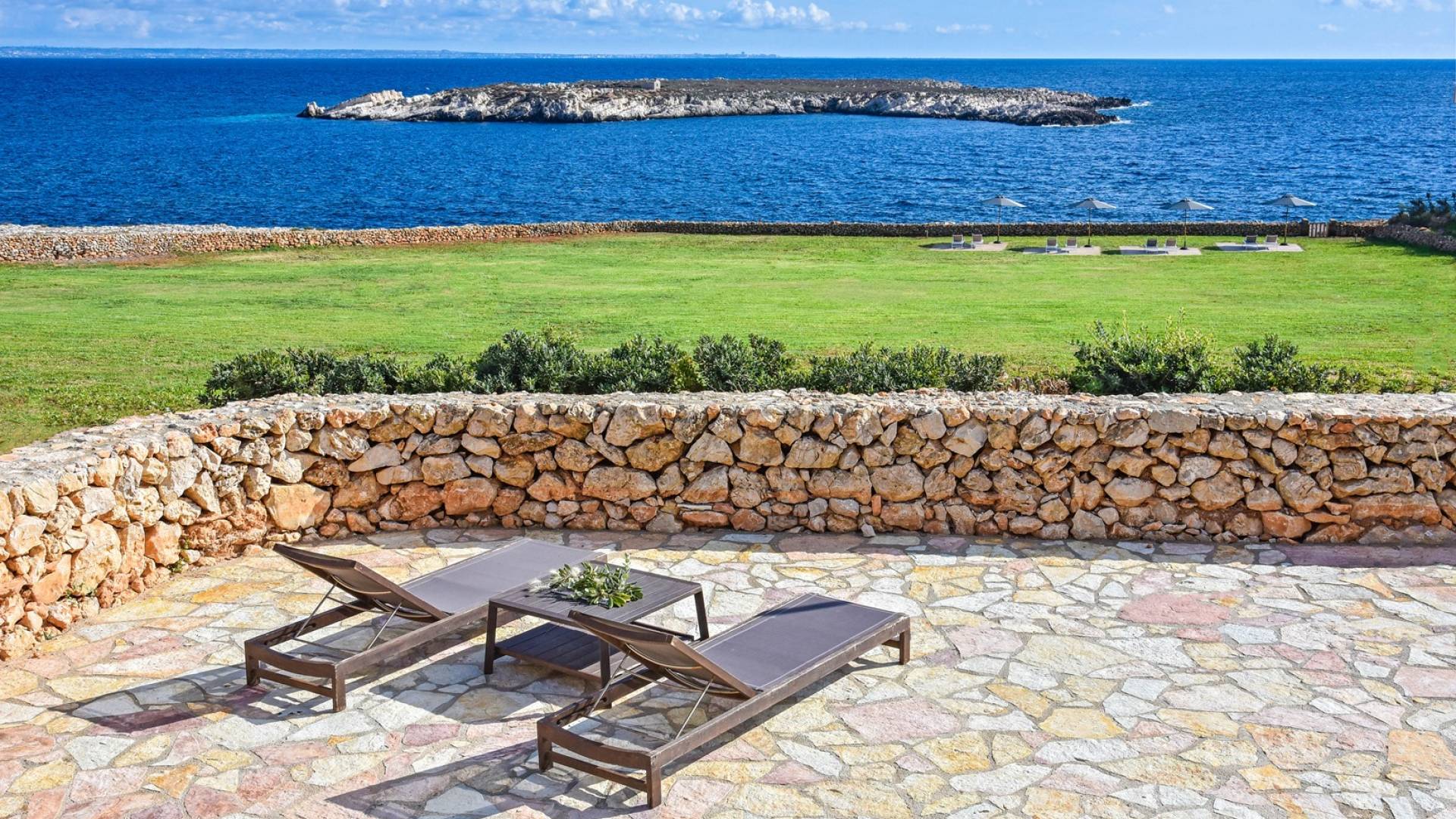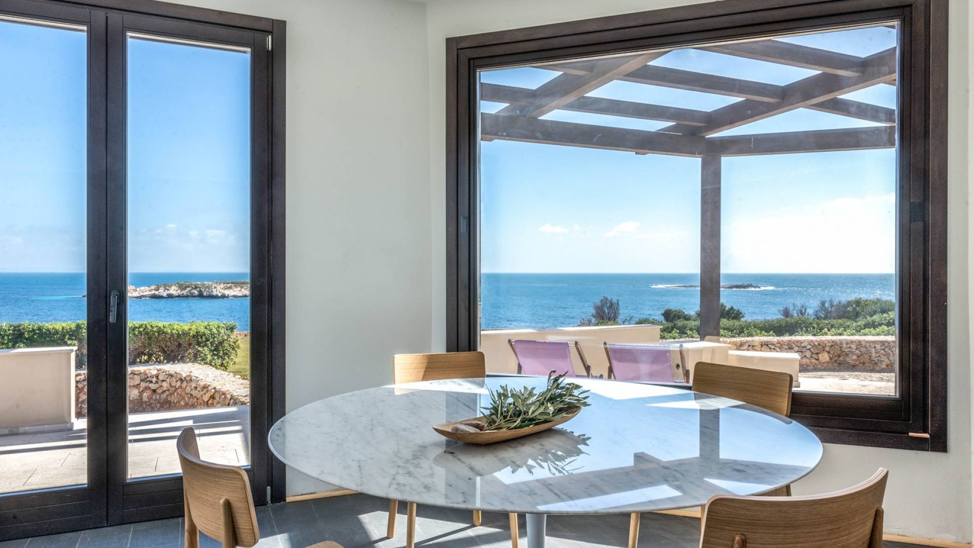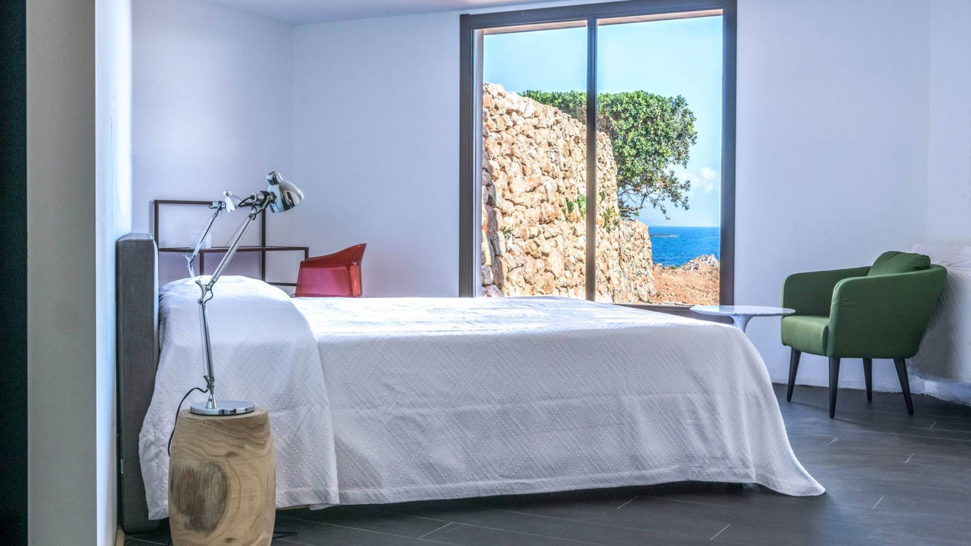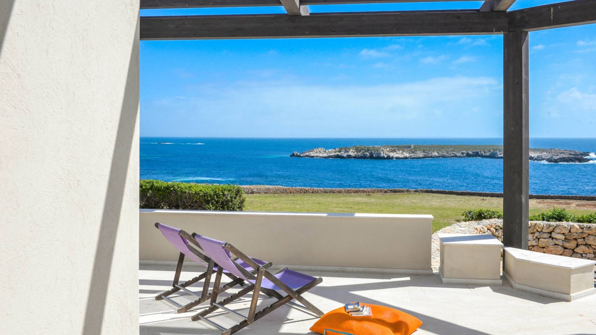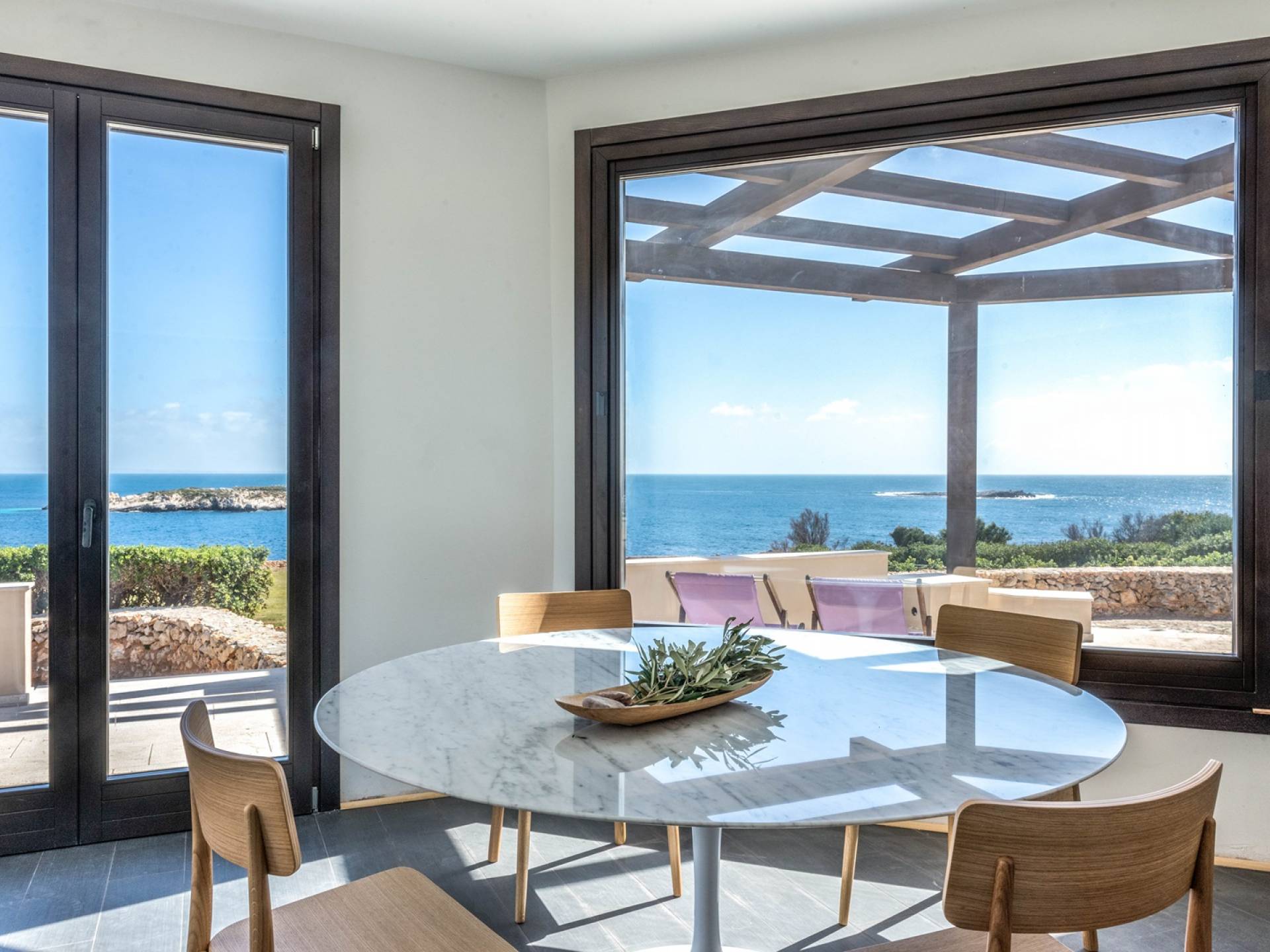 The interiors include a spacious living room, a sea view dining area with glass wall windows, and 2 eat-in well-equipped kitchens, the interior of the property measures 300 square meters and it can accommodate a total of 12 adults. A shelter of design and minimalism, that protects the inner environment with clean spaces and design items, in direct contraposition to the untouched sea life nature surrounding the house, with sunlight and sea breeze.