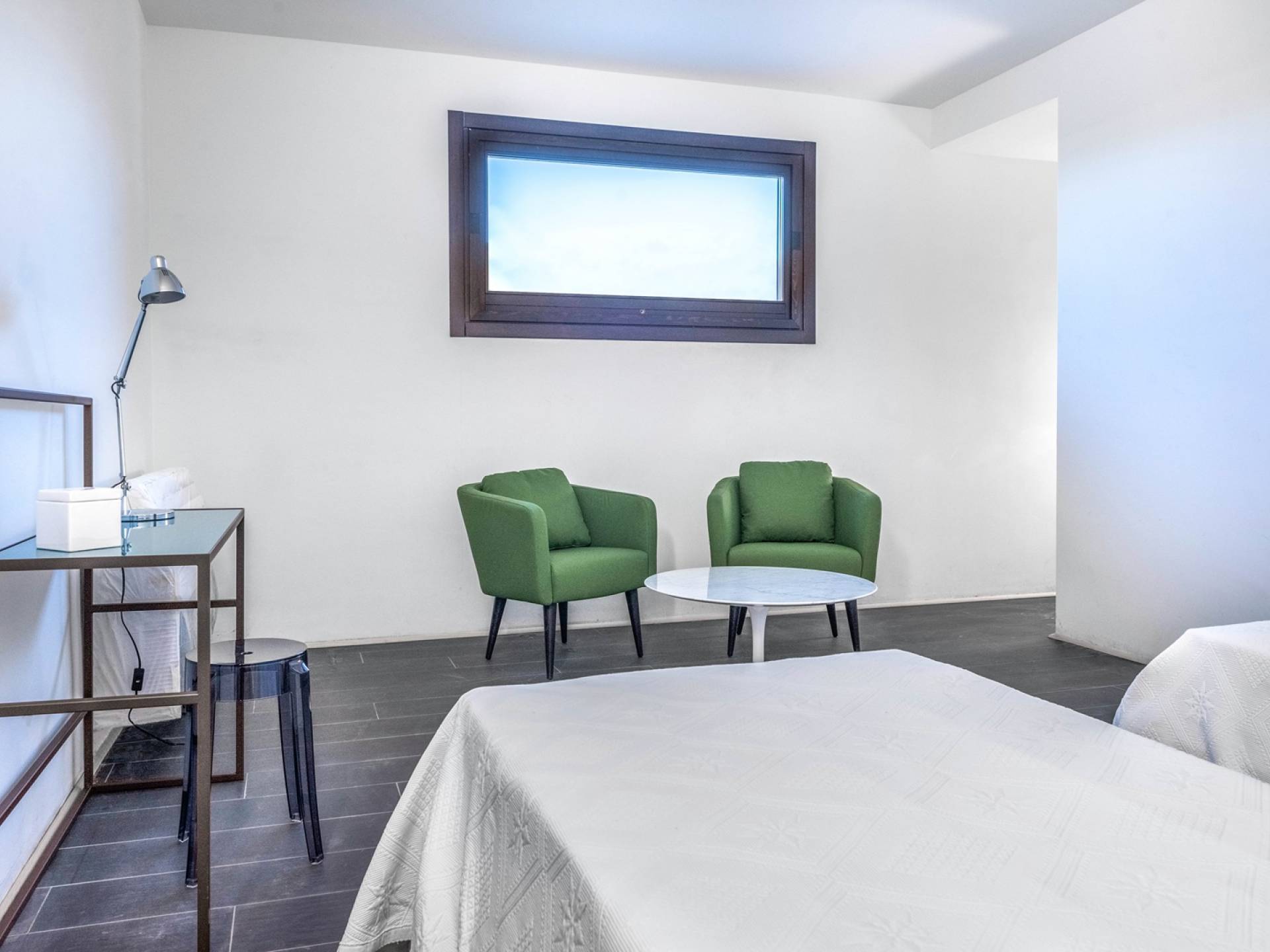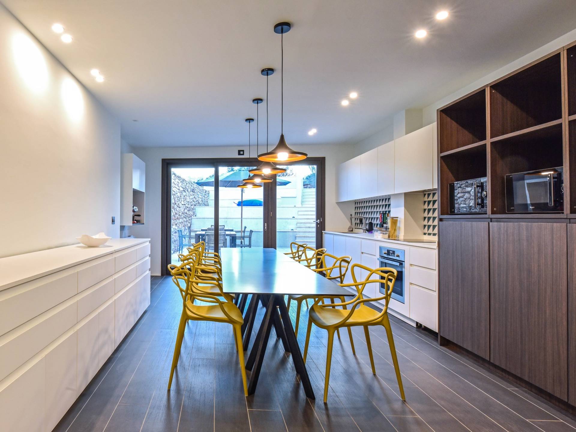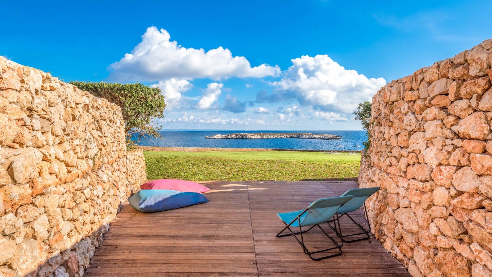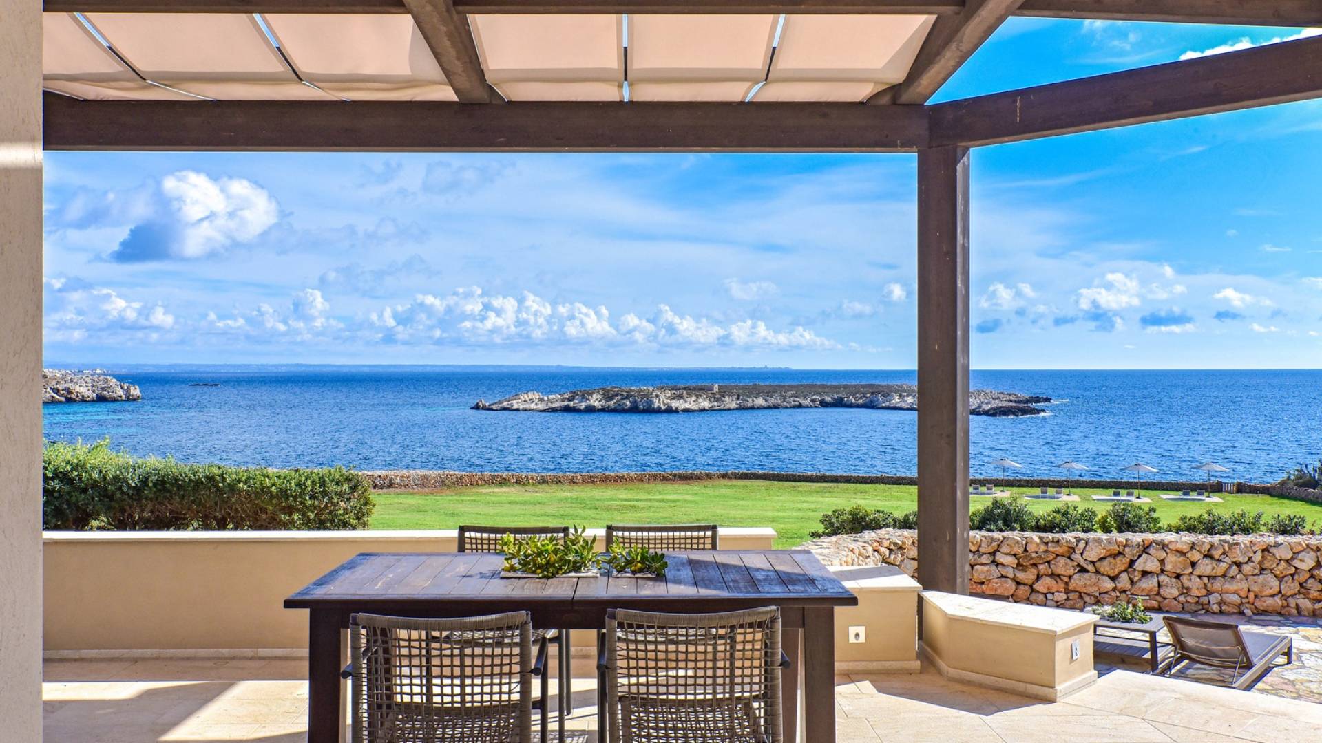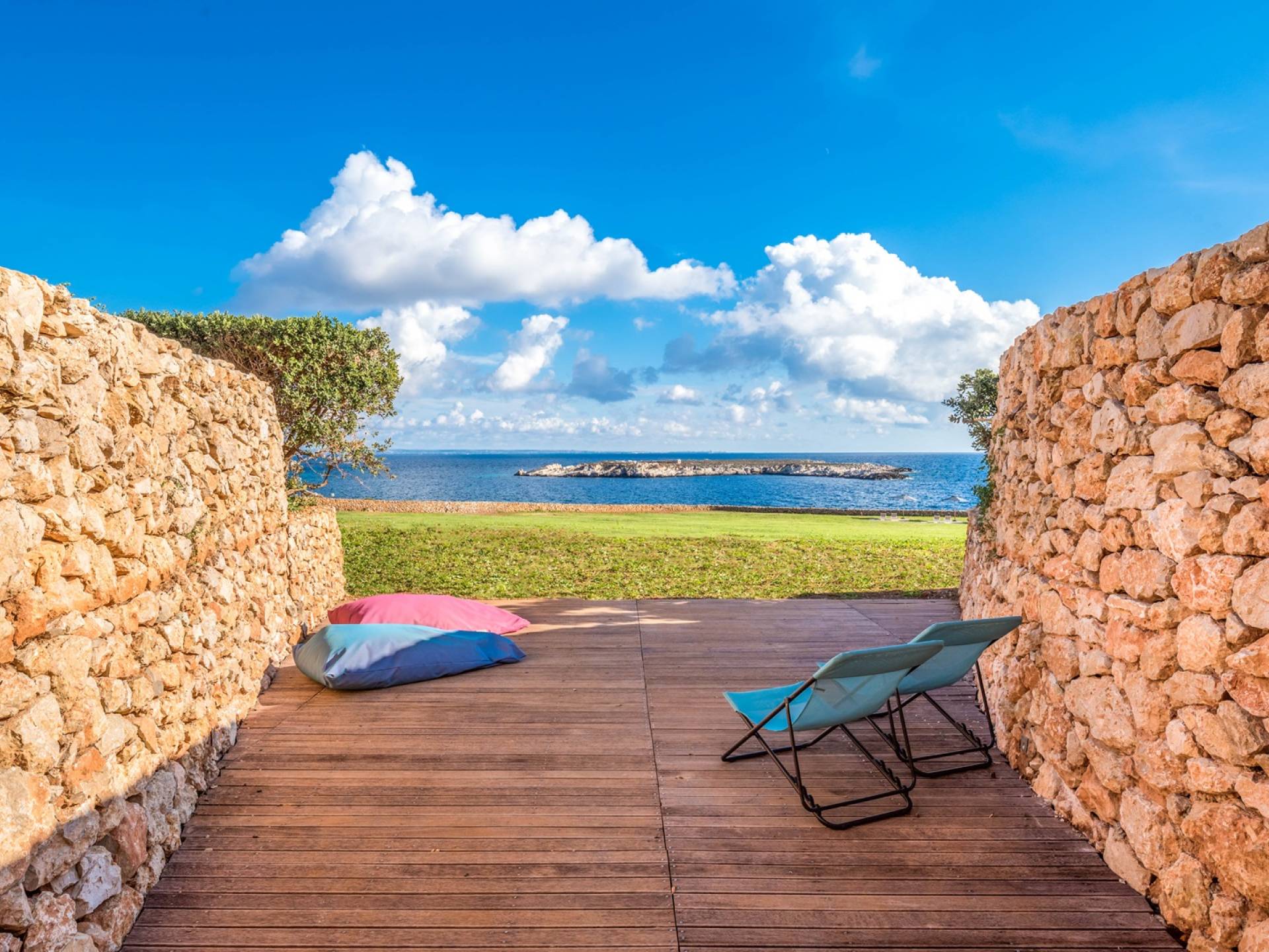 The interiors include a spacious living room, a sea view dining area with glass wall windows, and 2 eat-in well-equipped kitchens, the interior of the property measures 300 square meters and it can accommodate a total of 12 adults. A shelter of design and minimalism, that protects the inner environment with clean spaces and design items, in direct contraposition to the untouched sea life nature surrounding the house, with sunlight and sea breeze.