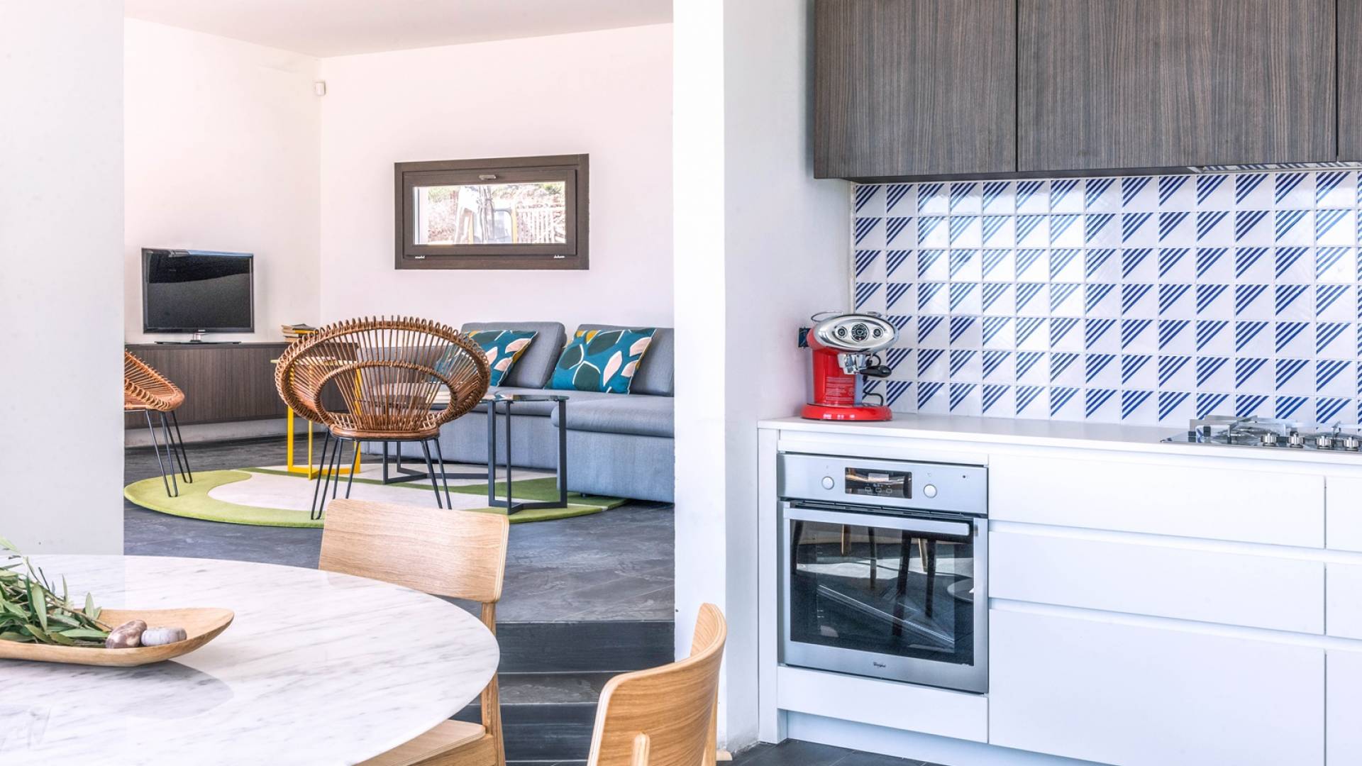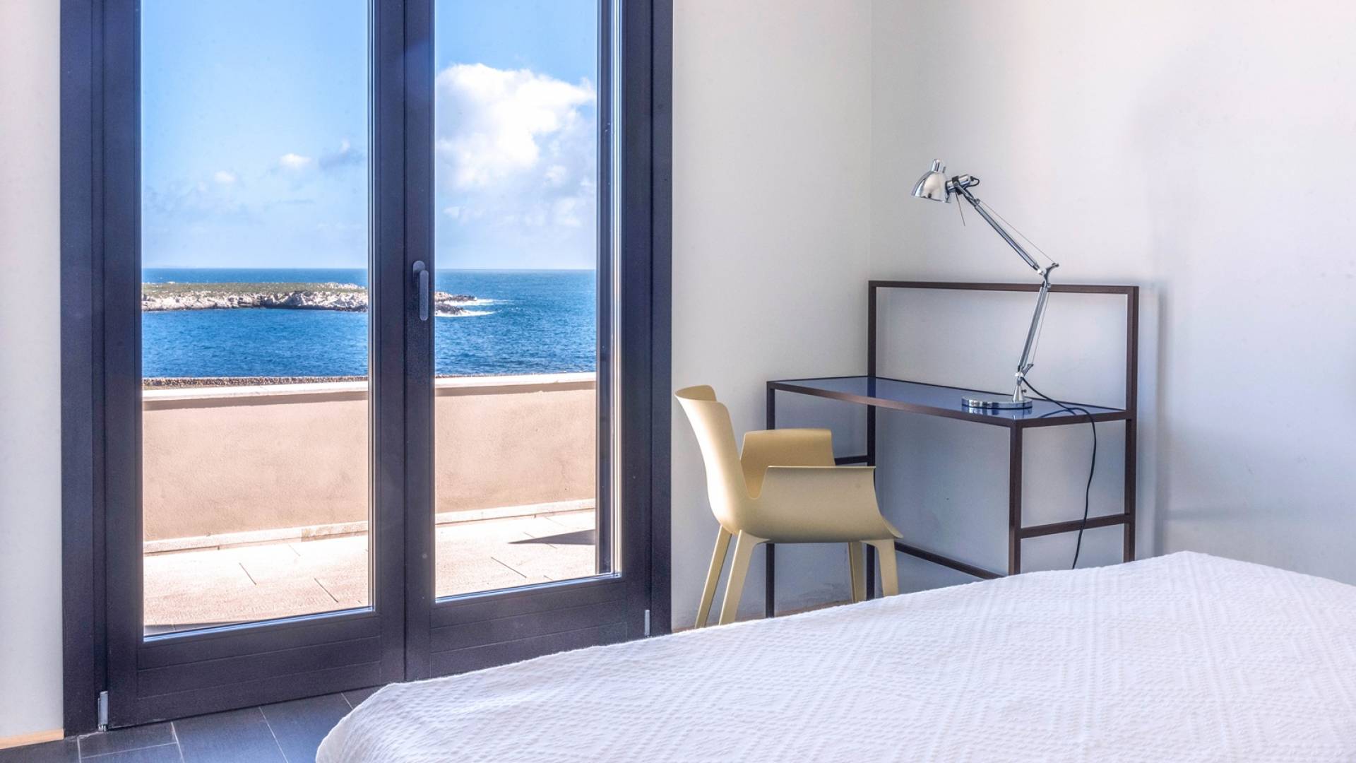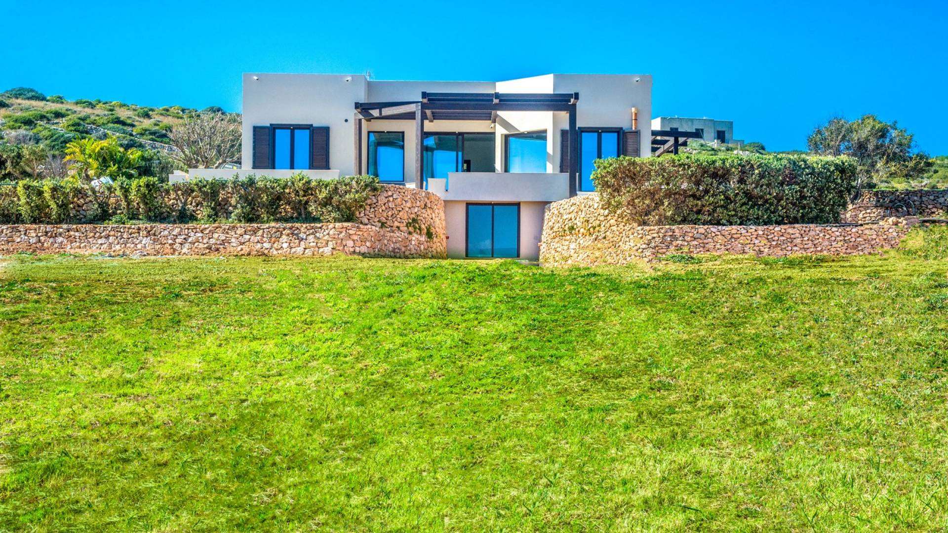 Villa Bisetta Favignana is situated in a way that the sun casts geometric shadows across the volumes of this modern seafront home, located on the evocative Favignana island, the queen of the Aegadian archipelago that has crystal-clear water, and surrounded by a bright grass field descending to the sea.