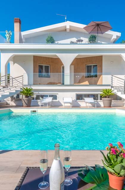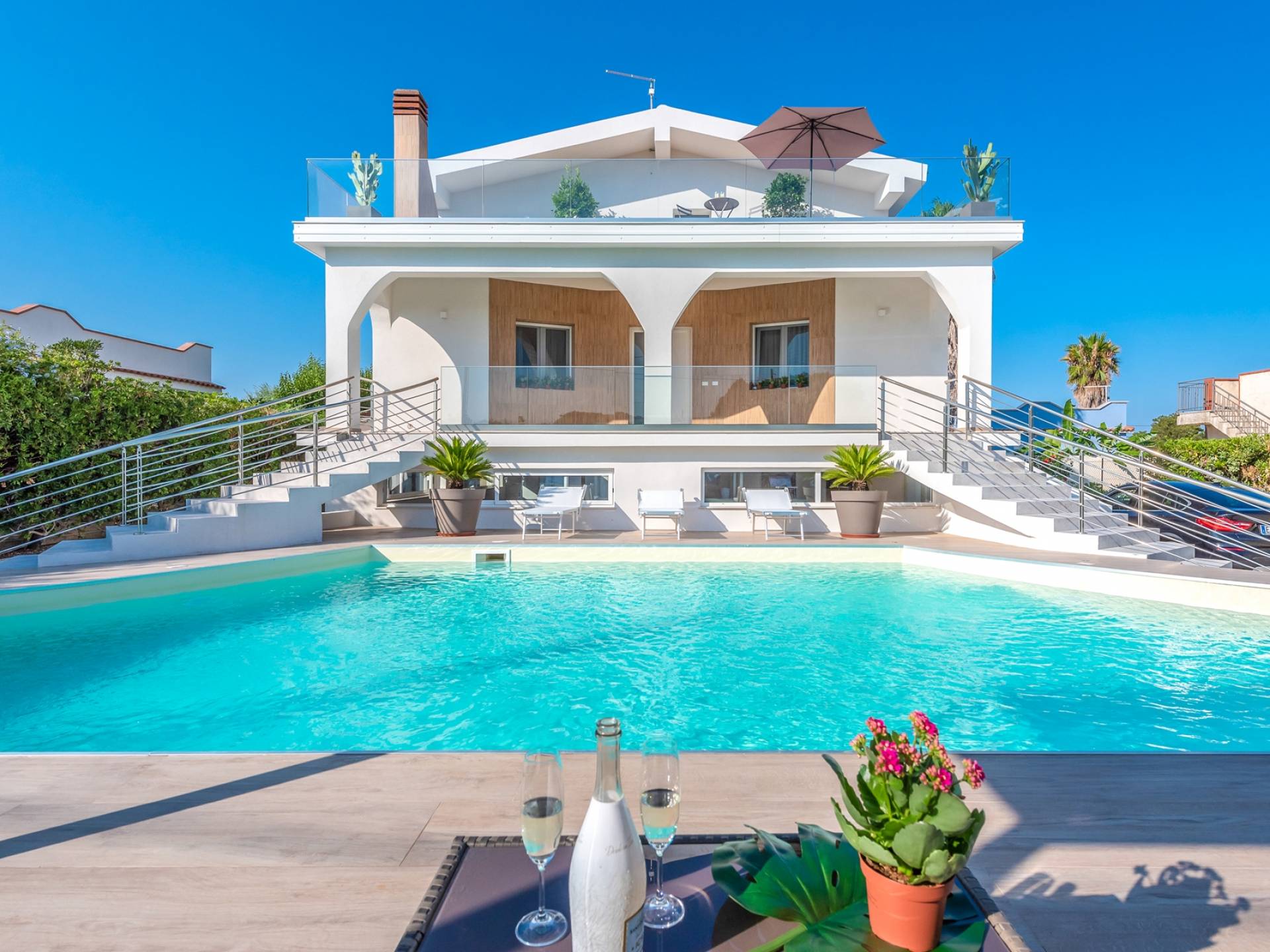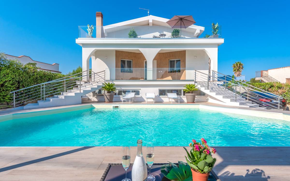 Villa Livia is a modern villa with a pool near the sea, completely renovated recently. The house is spread over 2 floors. The main level is a mezzanine floor which is accessed via the 2 external stairs of 10 steps. On this level, we find the kitchen, living room, 2 bedrooms, and 1 bathroom.