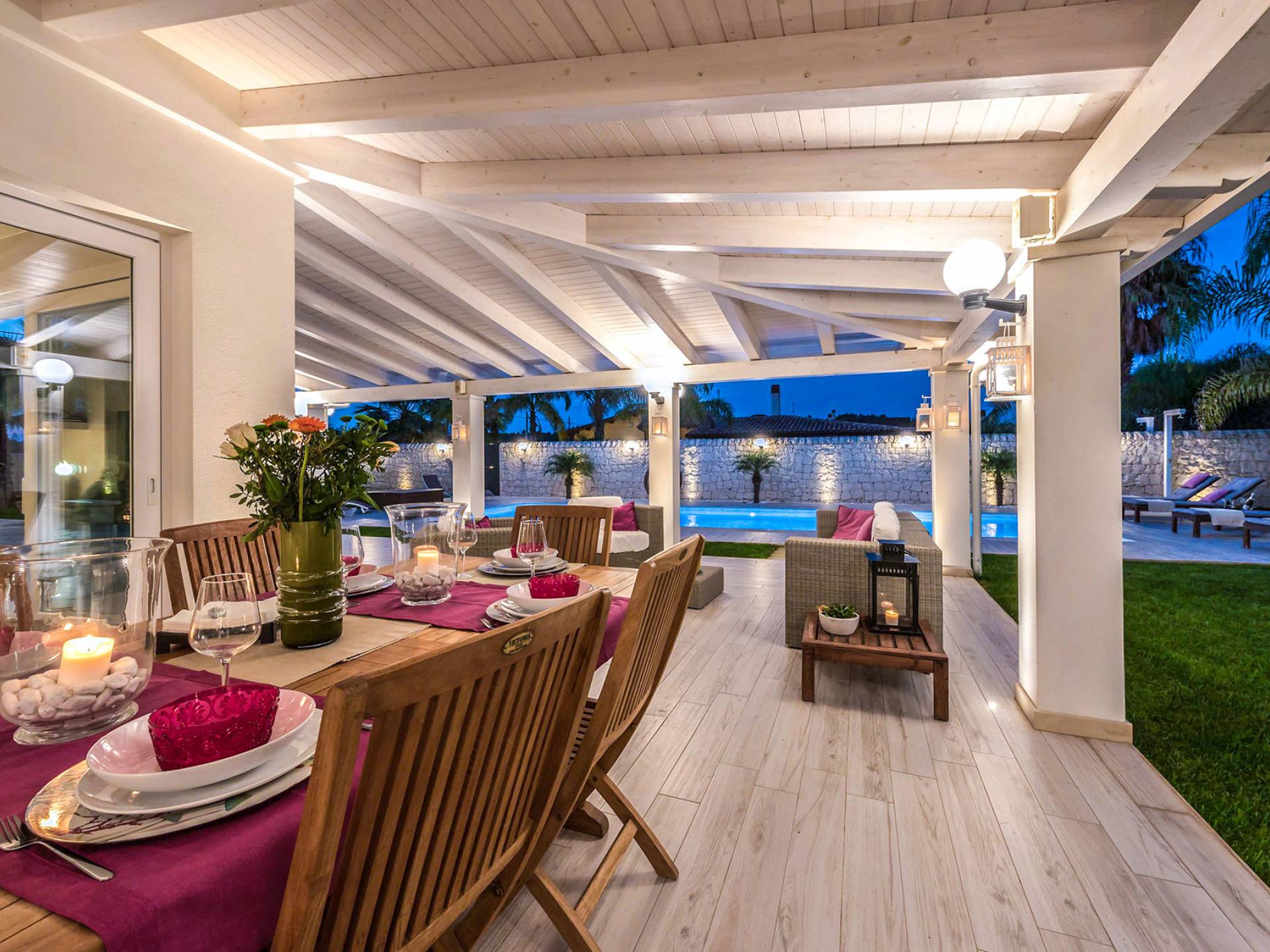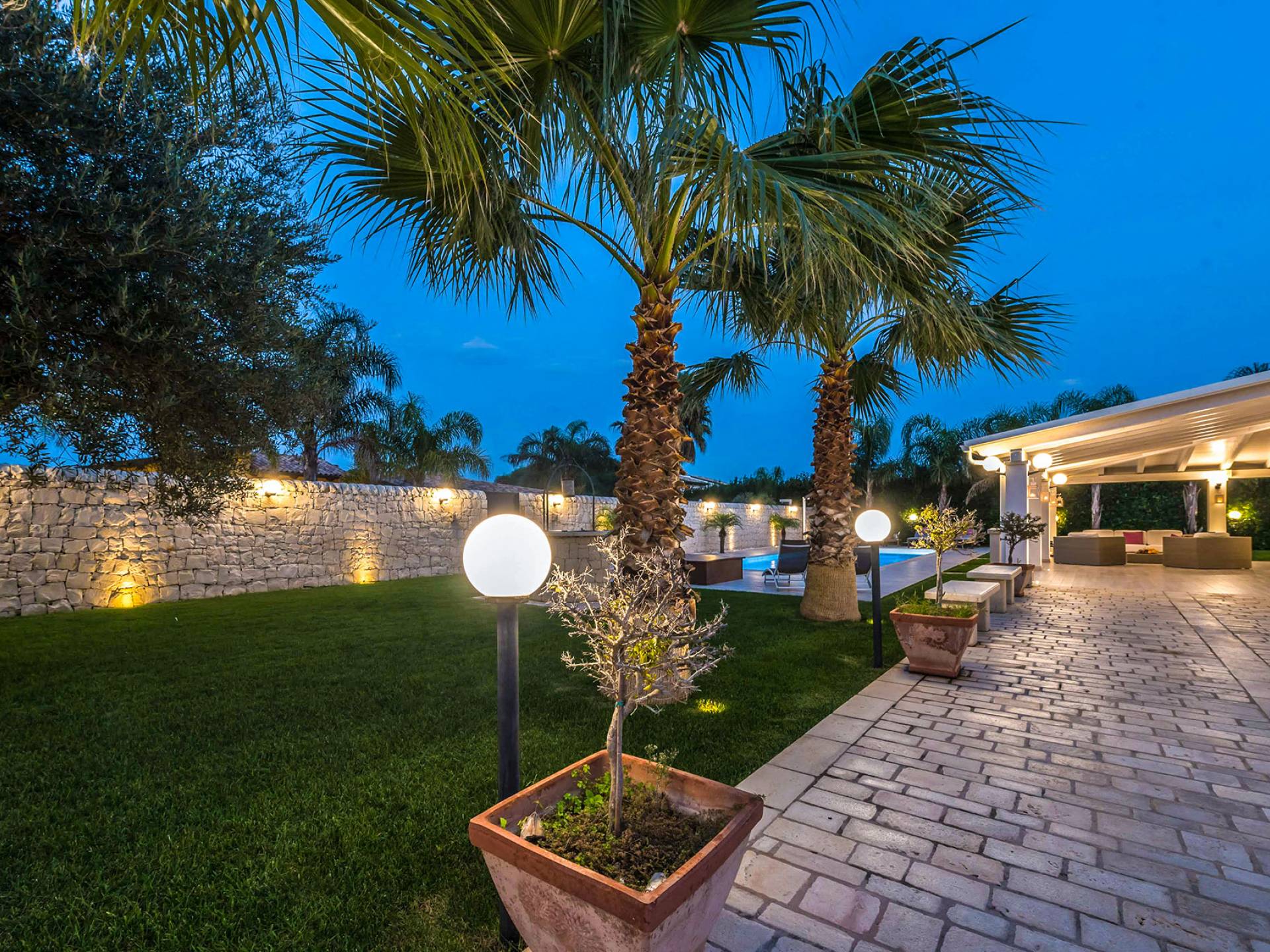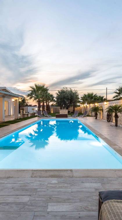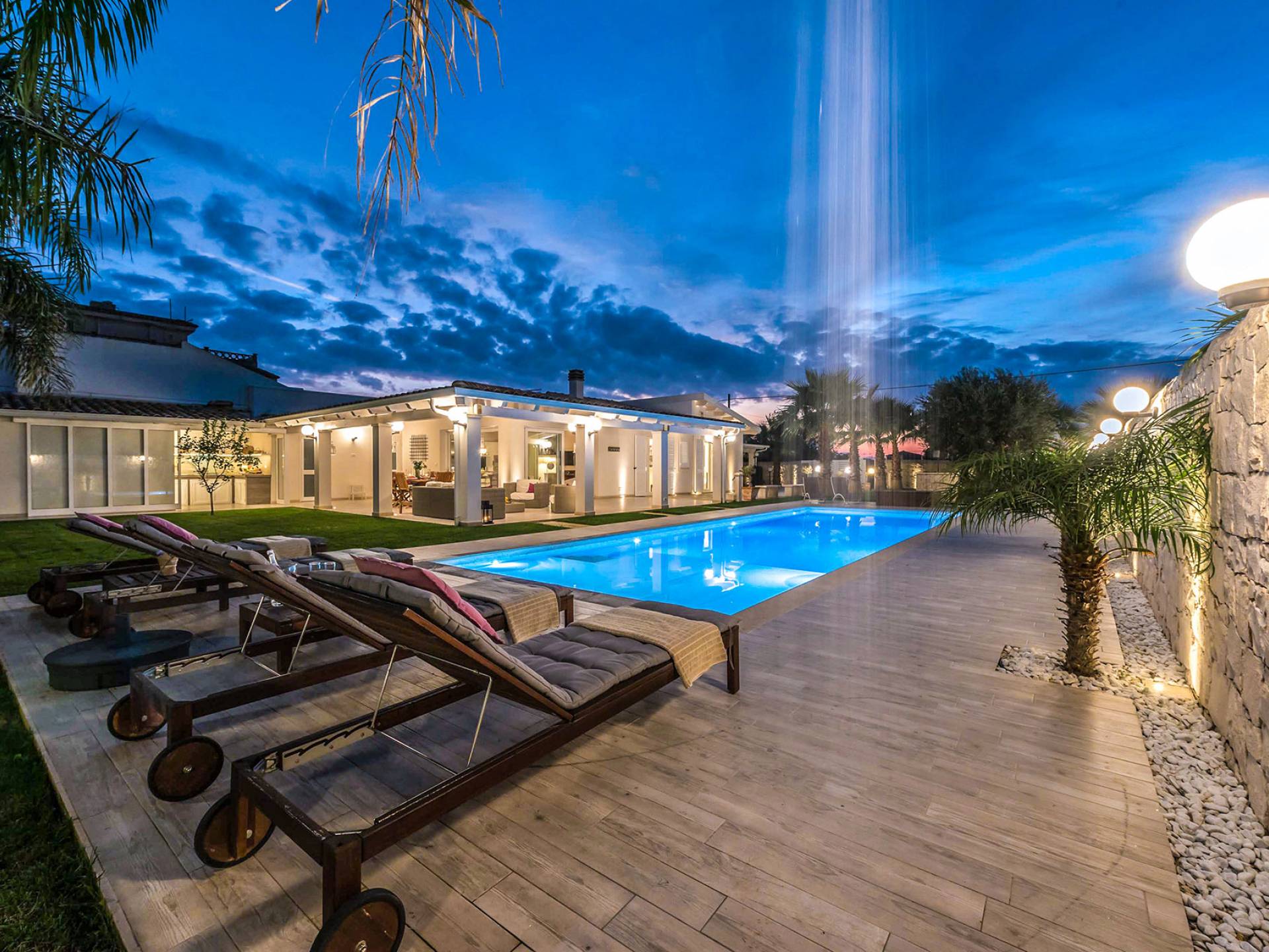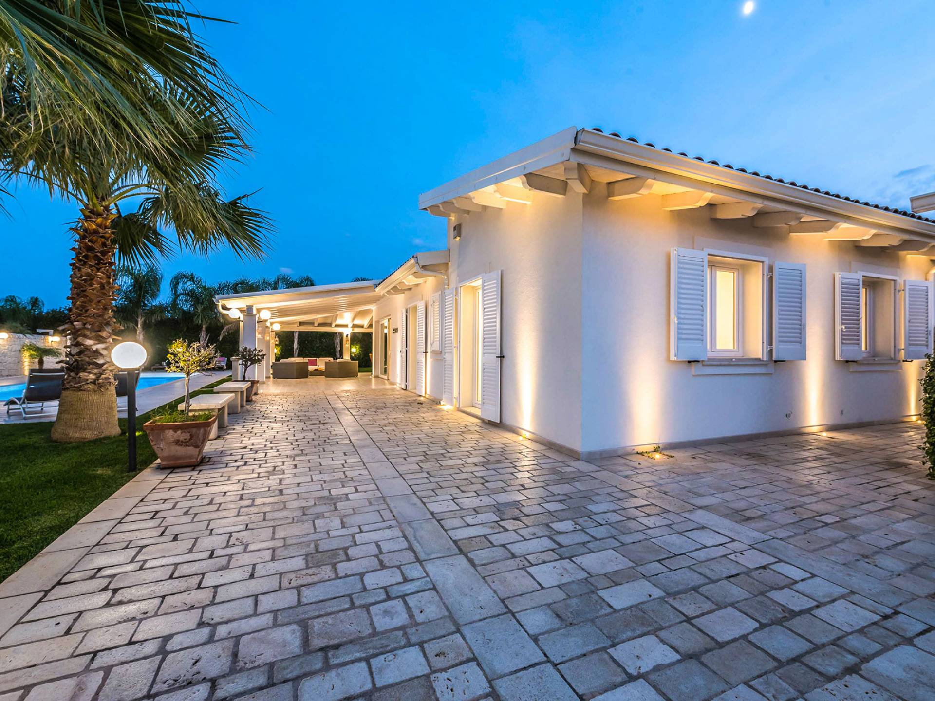 Villa le Palme is a newly built and elegant property a few steps from the sandy beach of Santa Maria del Focallo. Attention has been paid to the choice of furniture, interior, and exterior lighting, details, colors.