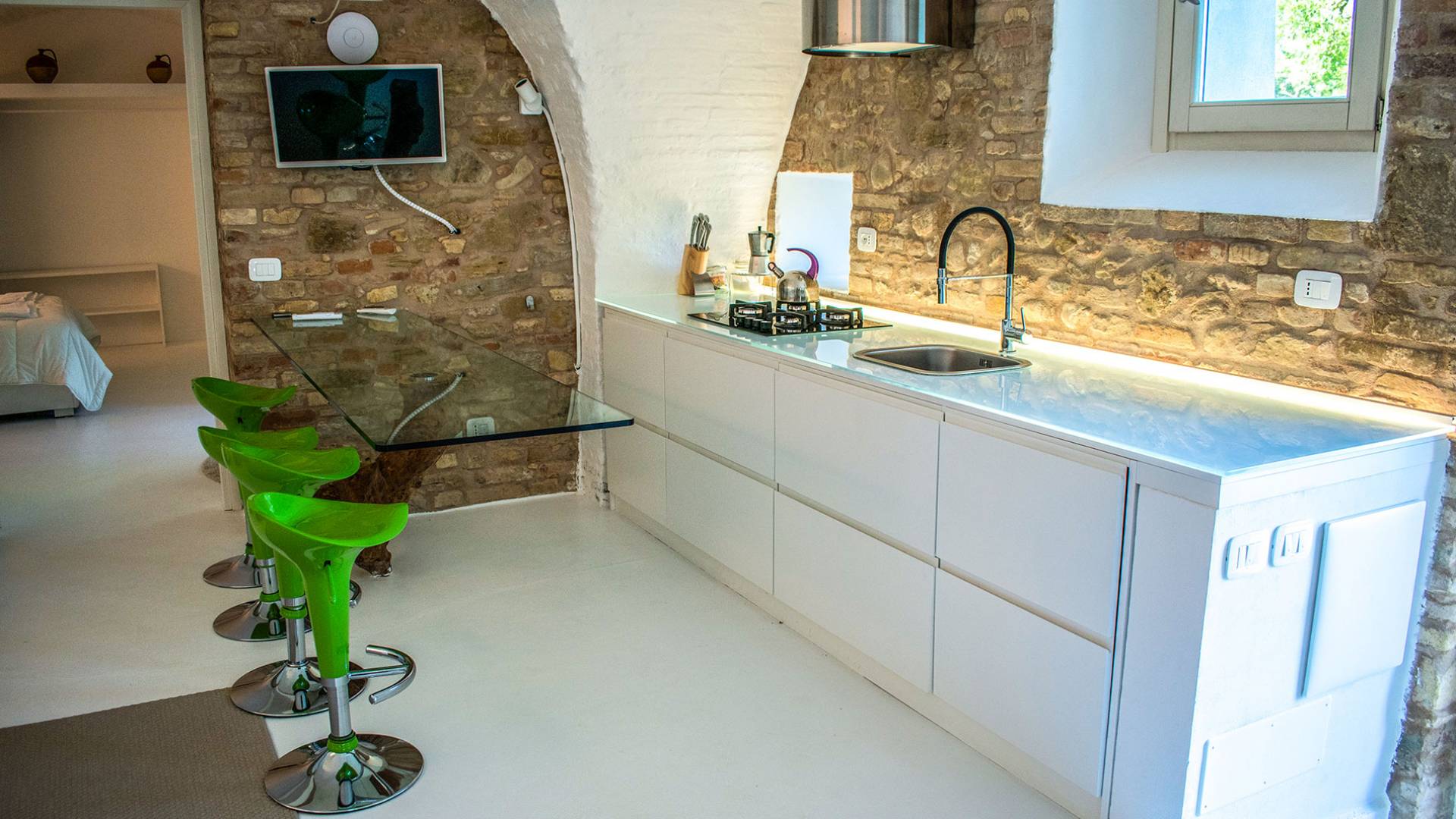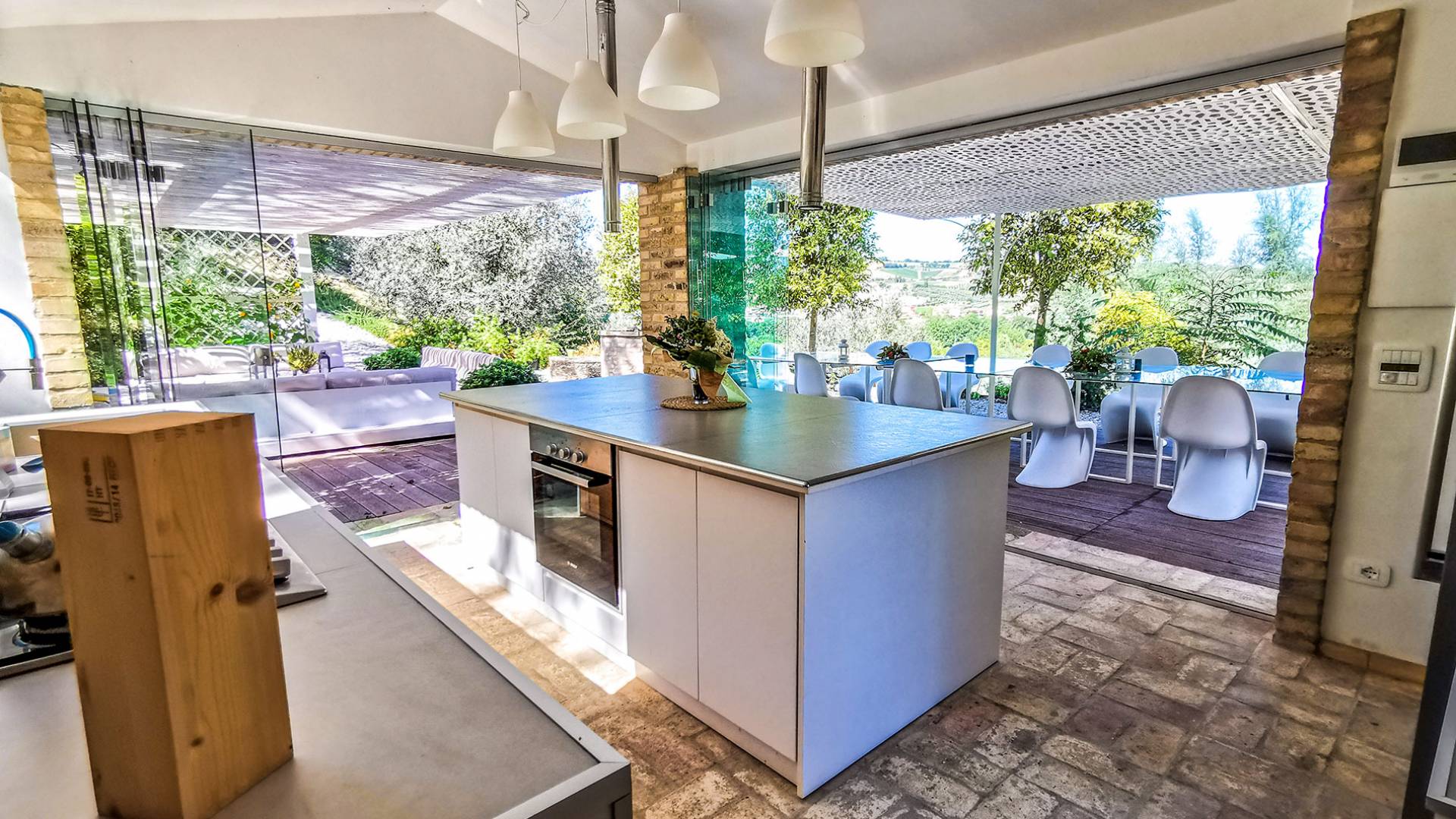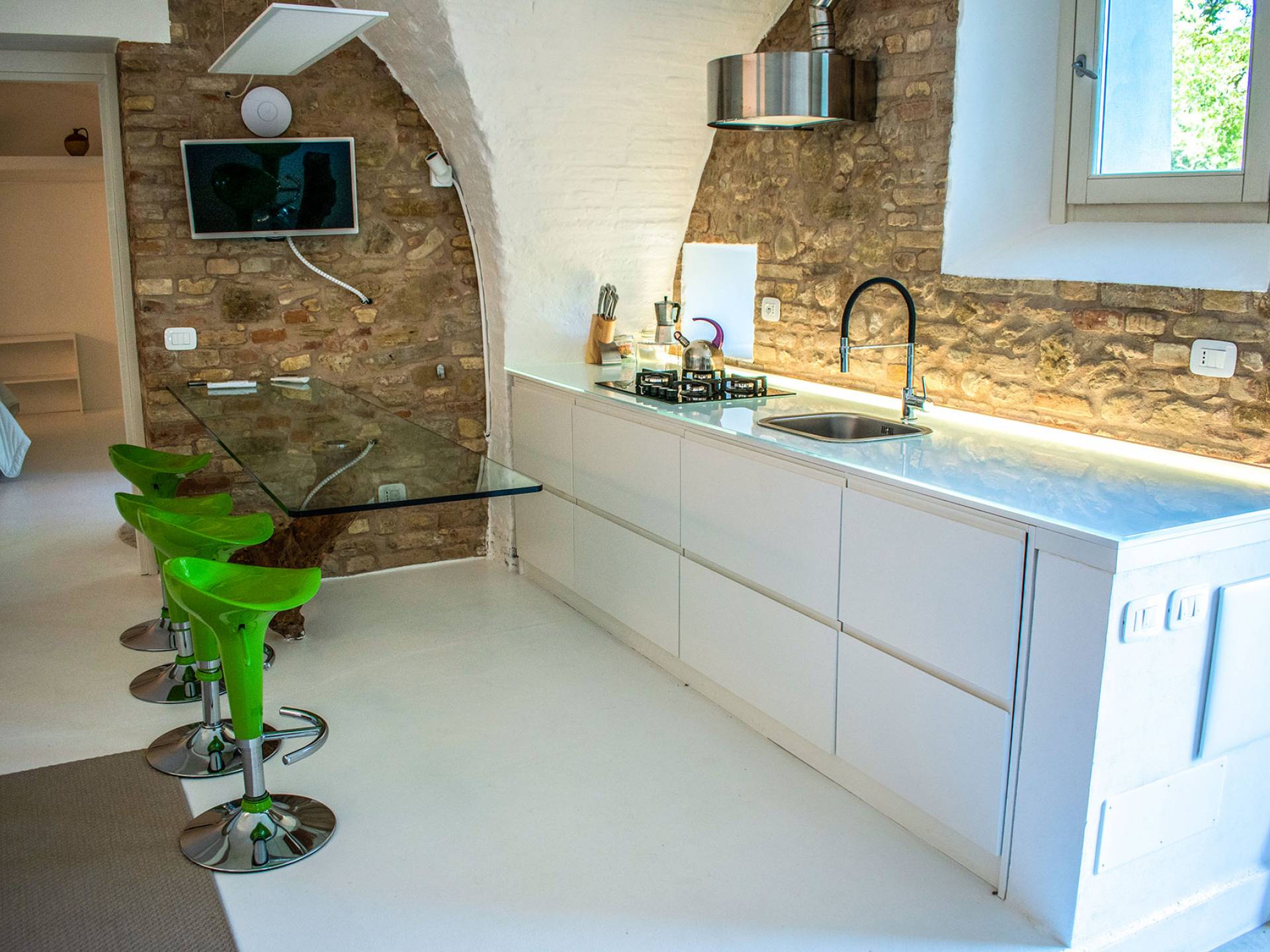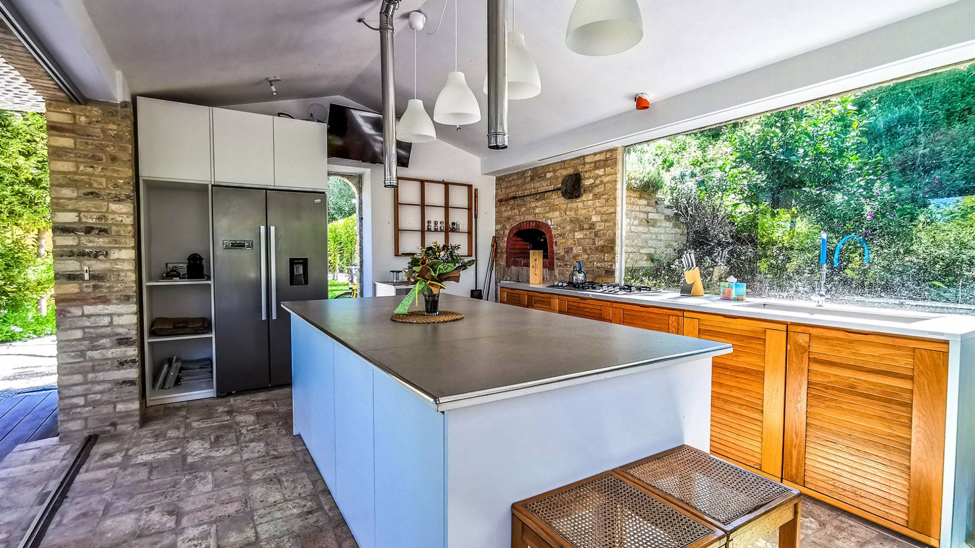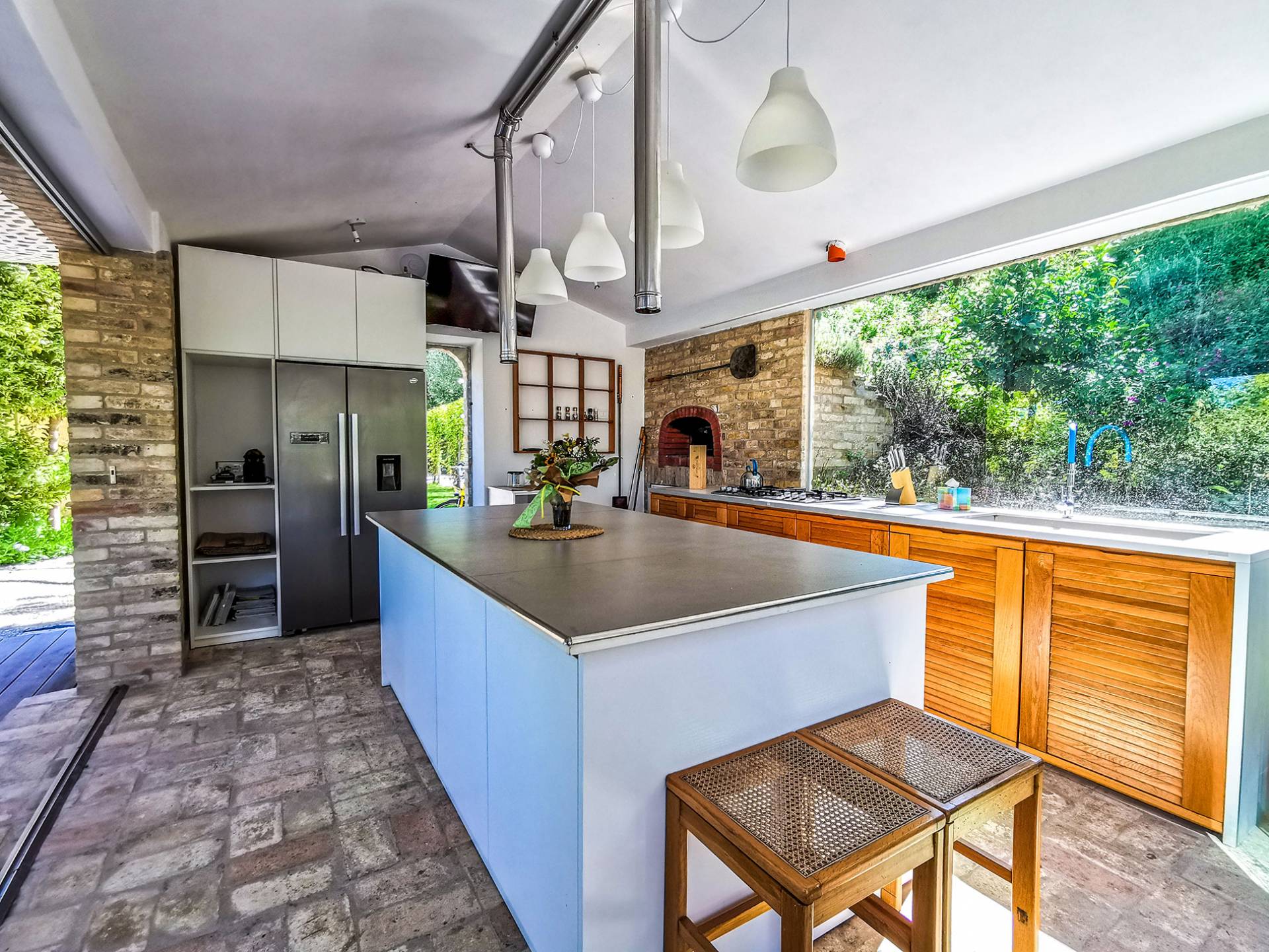 Composed of four apartments, able to accommodate two to six people each and all equipped with an independent kitchen, Villa Picena can accommodate, up to a maximum of twelve people. But it is in the large outdoor kitchen, directly overlooking the garden, that the Villa lives a second life. Here, up to twenty people can be accommodated. The large stone block that characterizes this part of the building has large windows and is served by a convenient and functional wood-burning oven and, at the same time, also offers the possibility of lighting up to an outdoor barbeque. Here too we find travertine, a typical material of this area which also includes the interior floors, together with lots