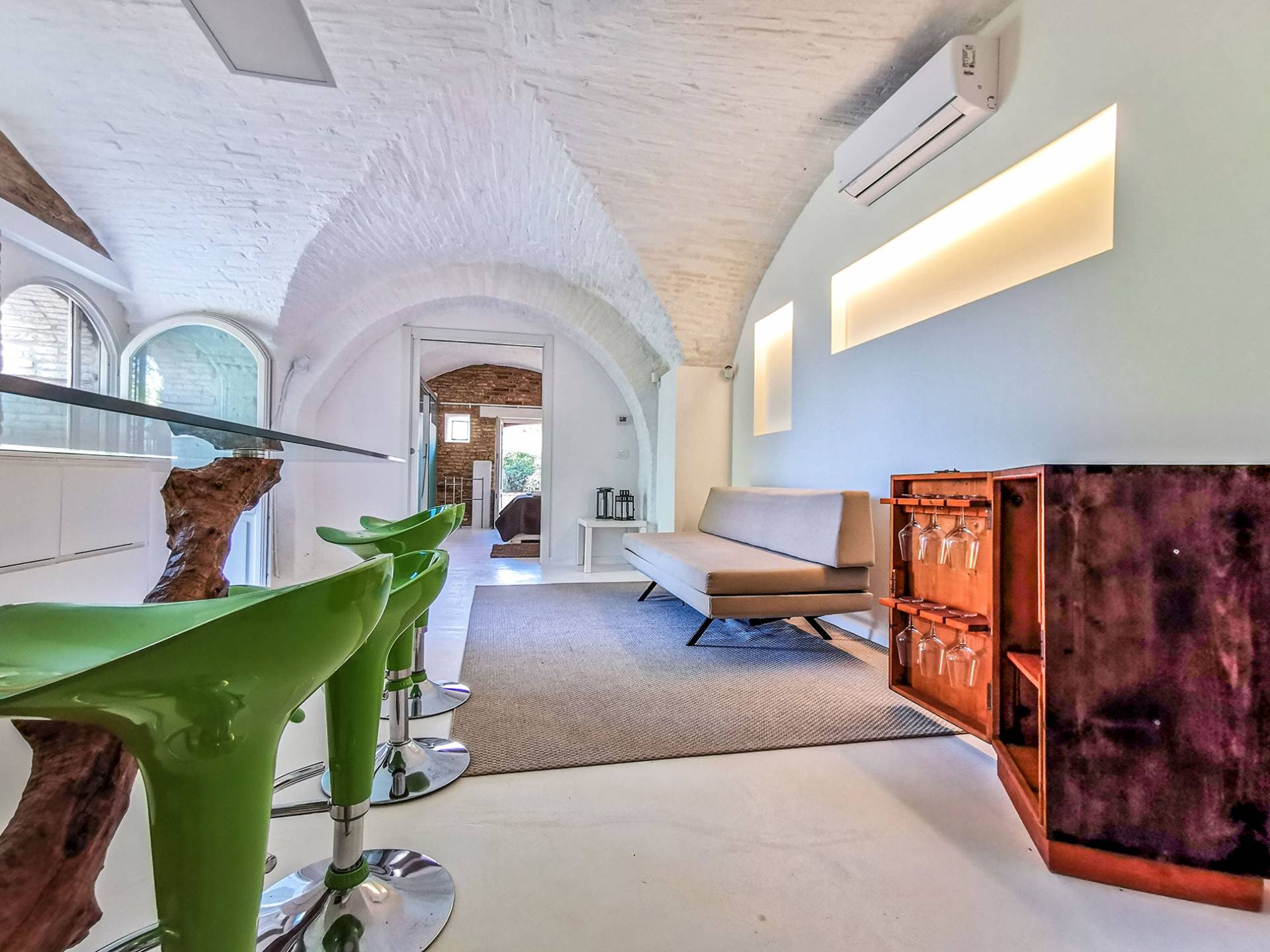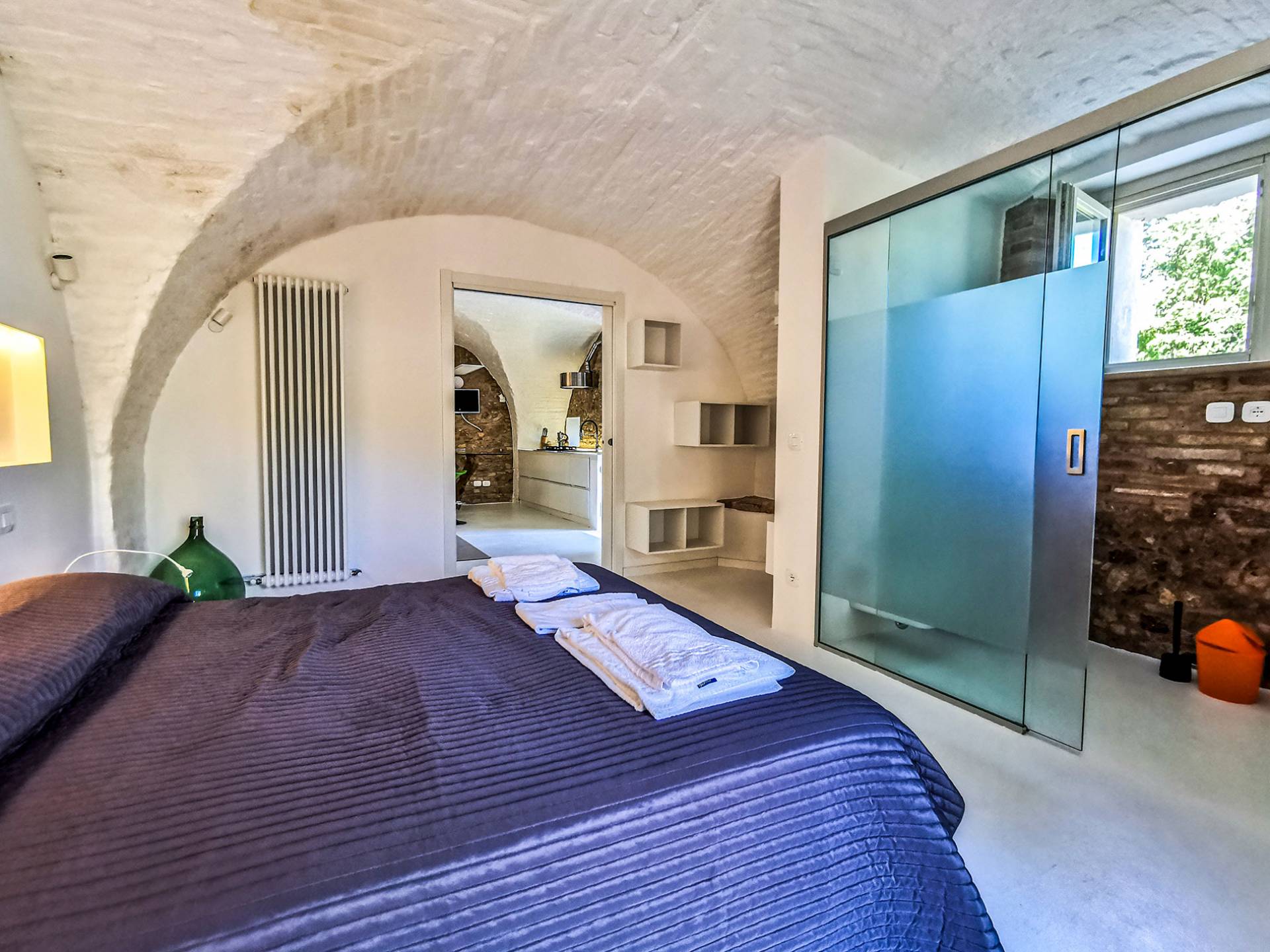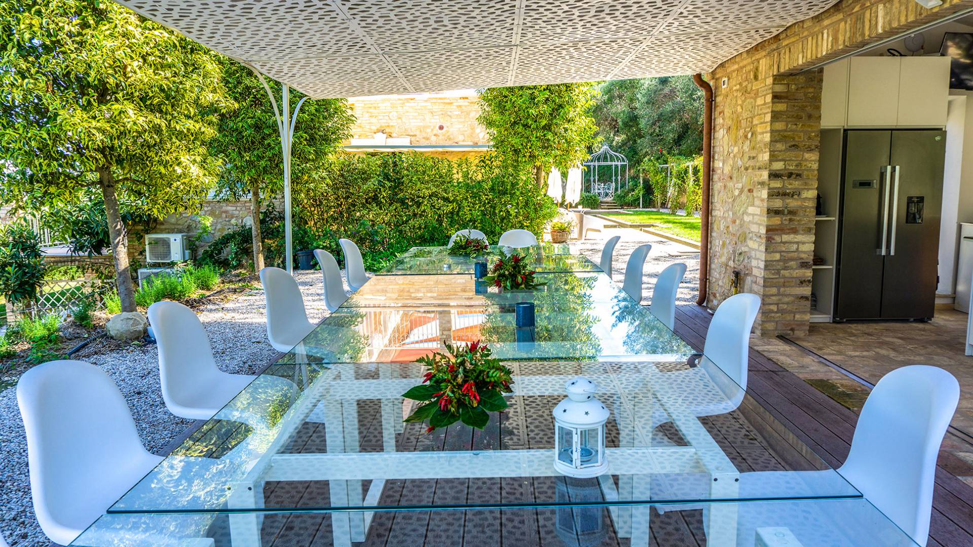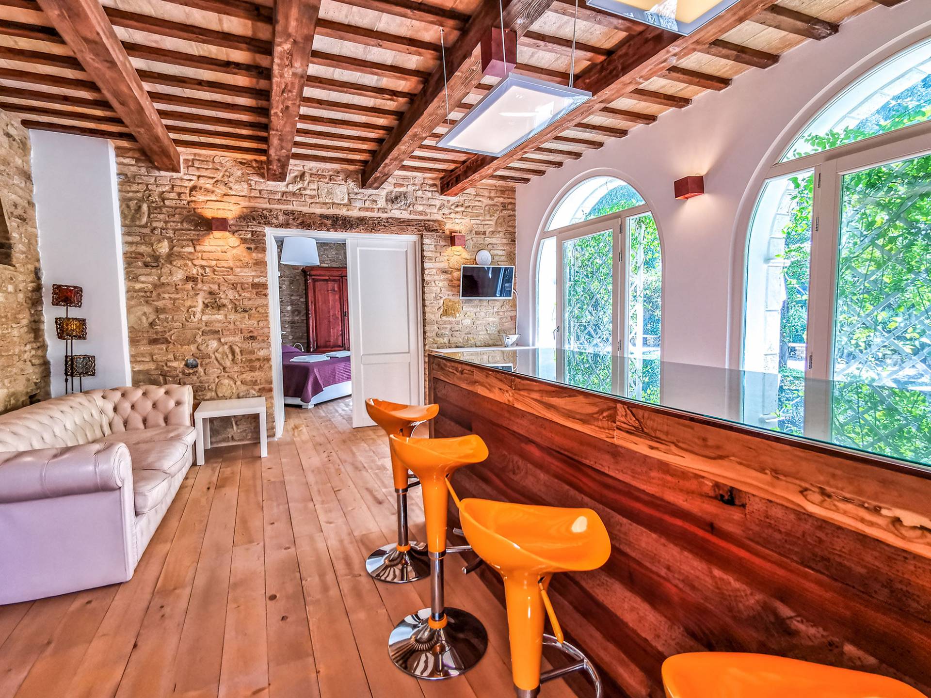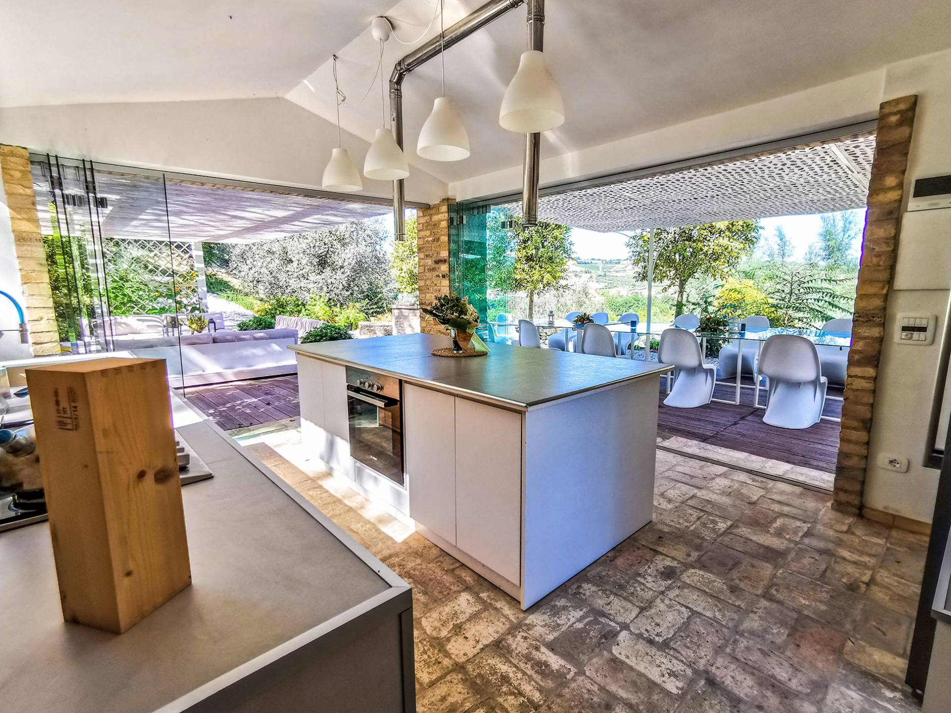 Composed of four apartments, able to accommodate two to six people each and all equipped with an independent kitchen, Villa Picena can accommodate, up to a maximum of twelve people. But it is in the large outdoor kitchen, directly overlooking the garden, that the Villa lives a second life. Here, up to twenty people can be accommodated. The large stone block that characterizes this part of the building has large windows and is served by a convenient and functional wood-burning oven and, at the same time, also offers the possibility of lighting up to an outdoor barbeque. Here too we find travertine, a typical material of this area which also includes the interior floors, together with lots