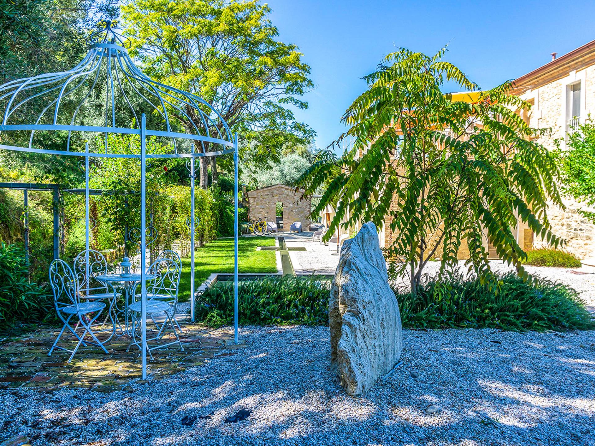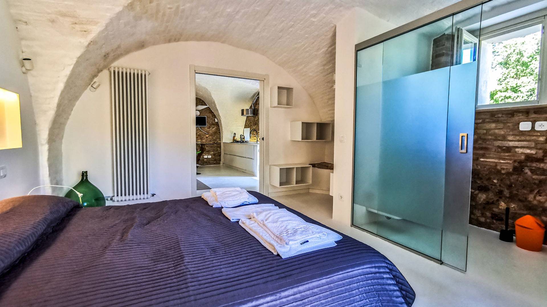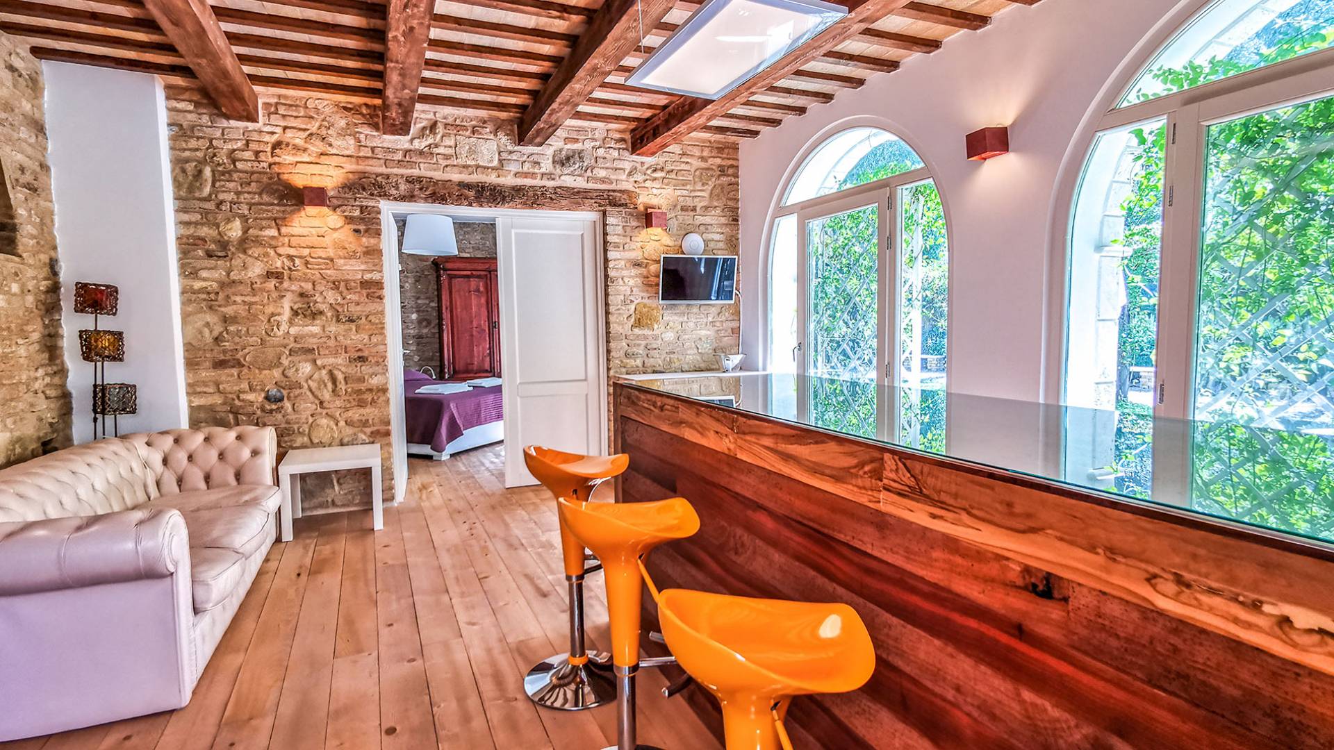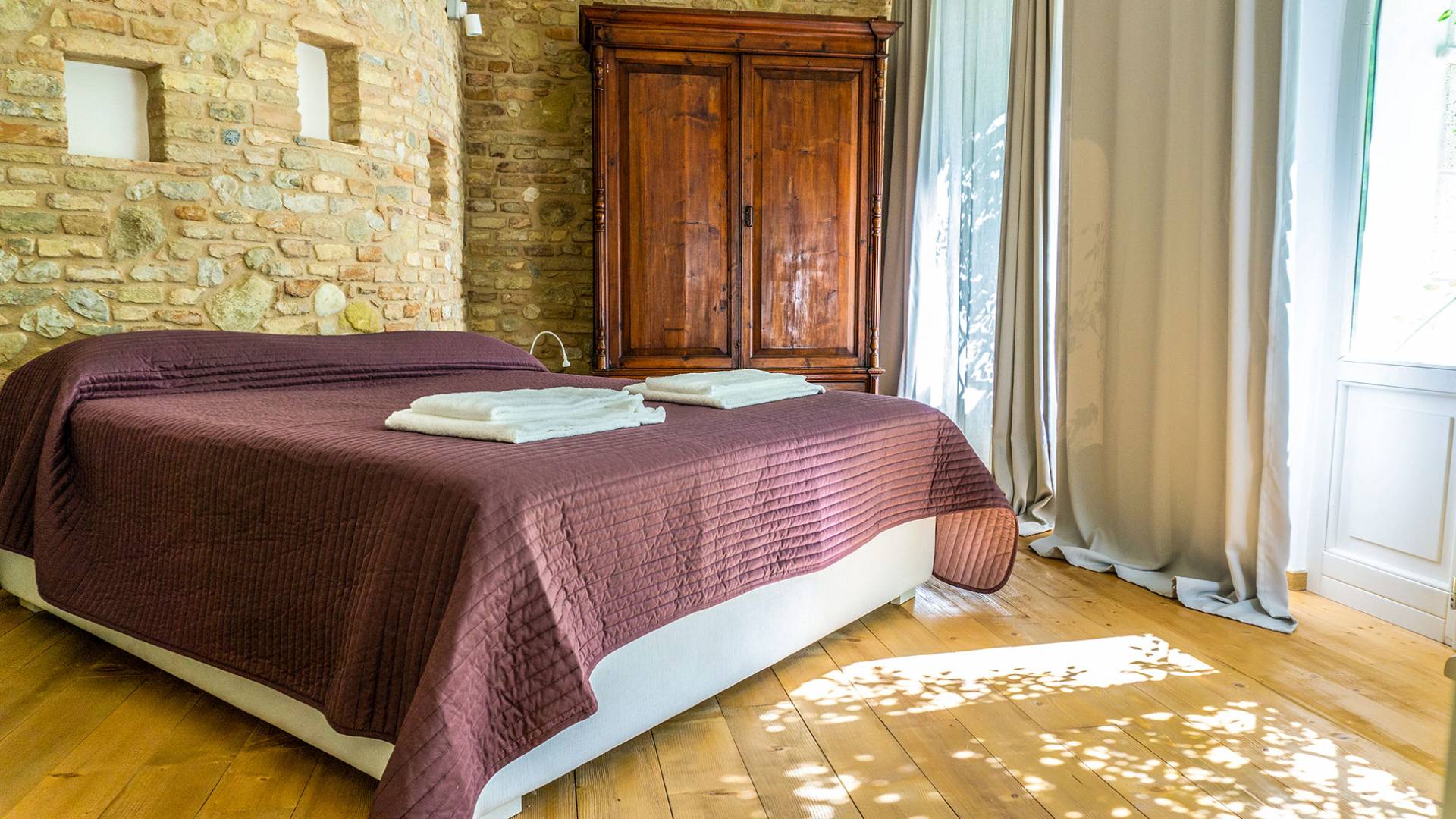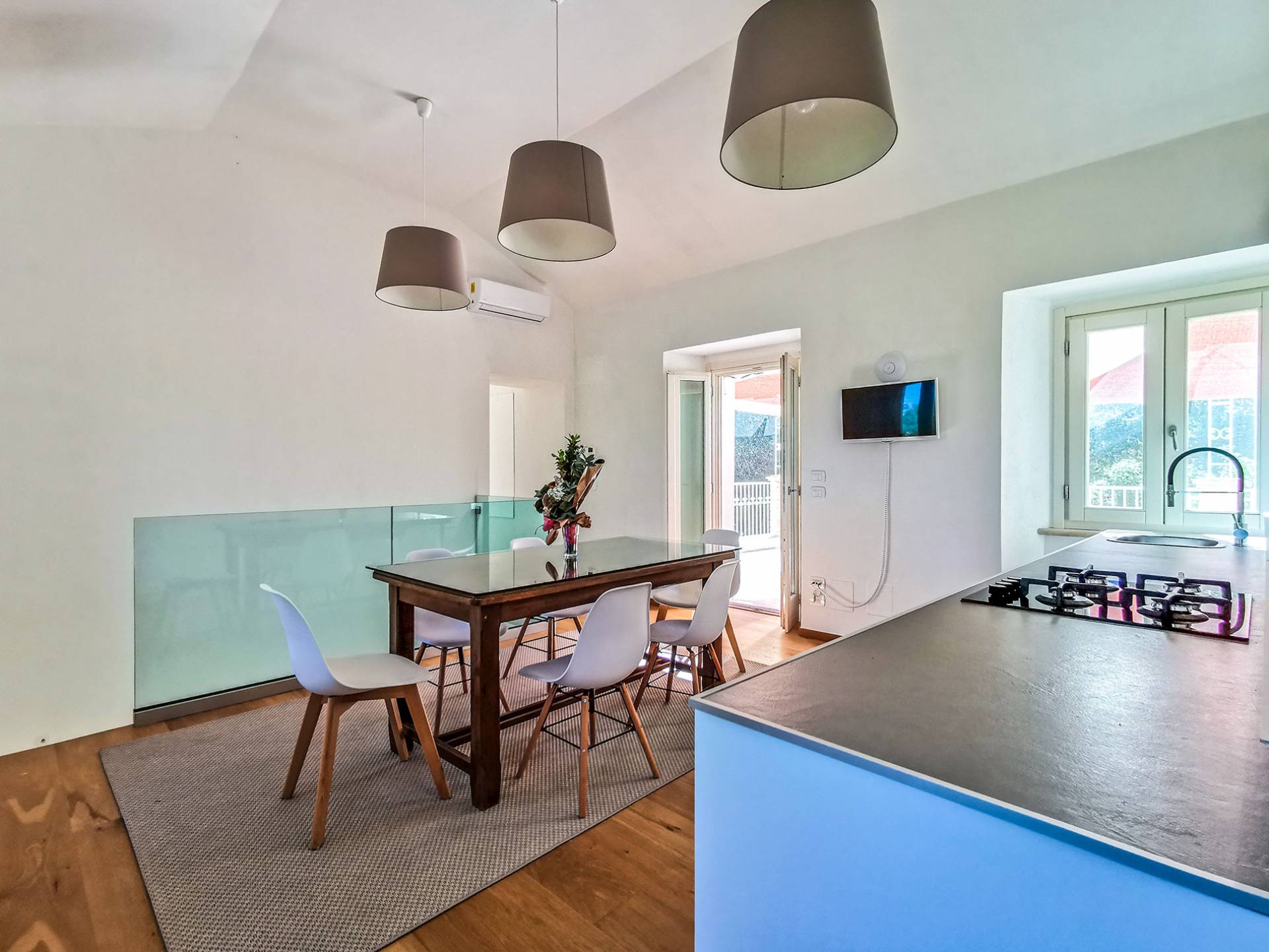 Composed of four apartments, able to accommodate two to six people each and all equipped with an independent kitchen, Villa Picena can accommodate, up to a maximum of twelve people. But it is in the large outdoor kitchen, directly overlooking the garden, that the Villa lives a second life. Here, up to twenty people can be accommodated. The large stone block that characterizes this part of the building has large windows and is served by a convenient and functional wood-burning oven and, at the same time, also offers the possibility of lighting up to an outdoor barbeque. Here too we find travertine, a typical material of this area which also includes the interior floors, together with lots