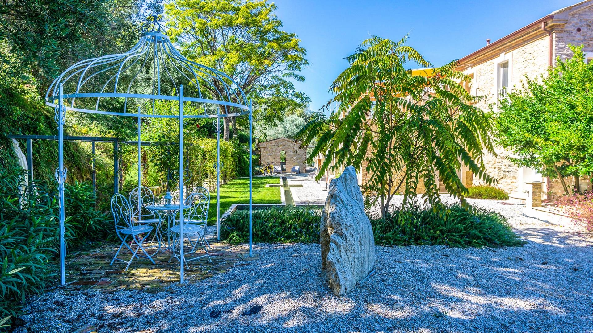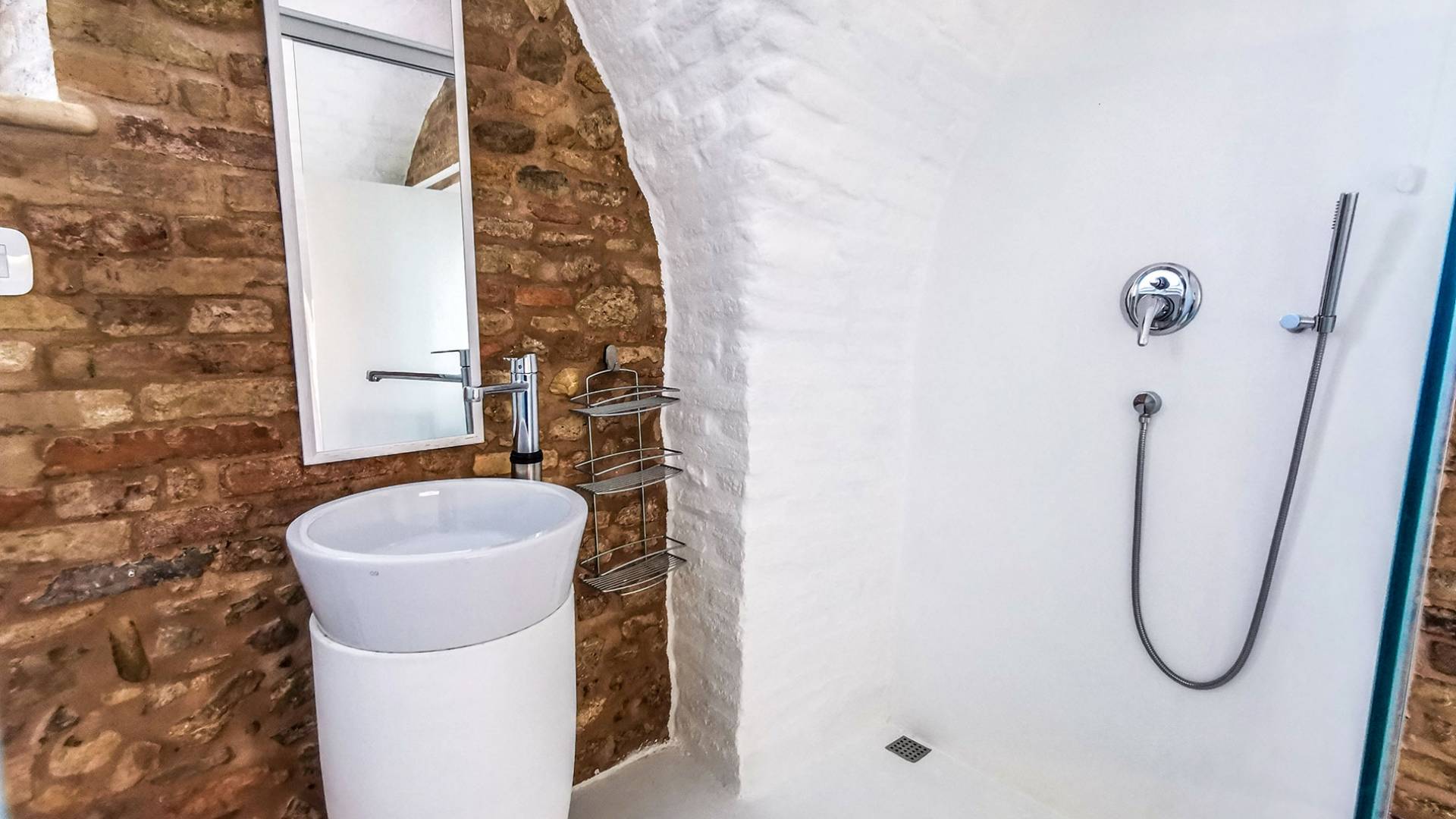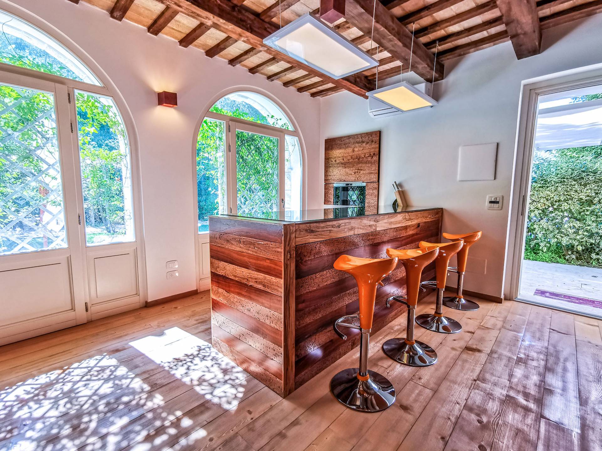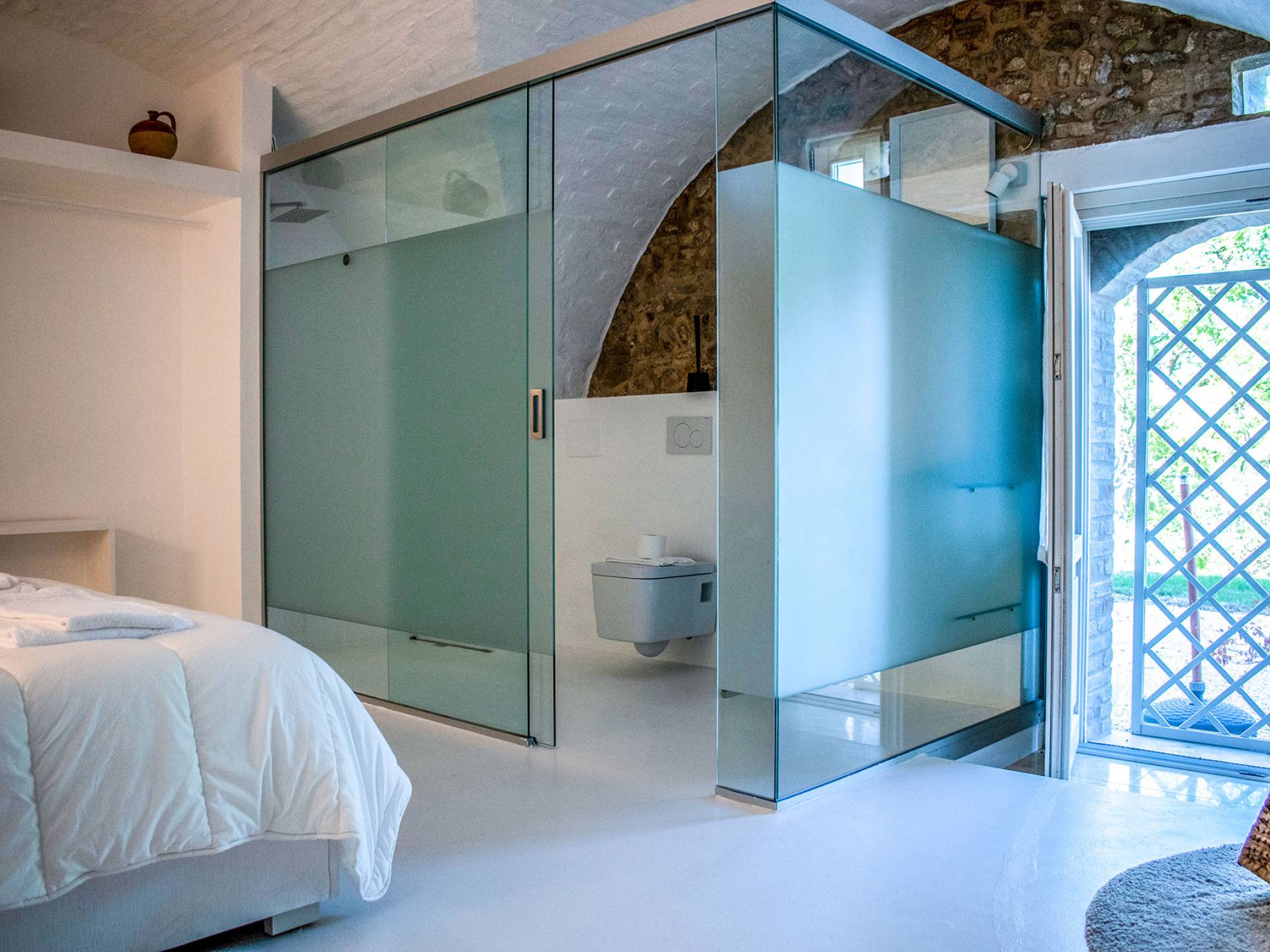 Composed of four apartments, able to accommodate two to six people each and all equipped with an independent kitchen, Villa Picena can accommodate, up to a maximum of twelve people. But it is in the large outdoor kitchen, directly overlooking the garden, that the Villa lives a second life. Here, up to twenty people can be accommodated. The large stone block that characterizes this part of the building has large windows and is served by a convenient and functional wood-burning oven and, at the same time, also offers the possibility of lighting up to an outdoor barbeque. Here too we find travertine, a typical material of this area which also includes the interior floors, together with lots