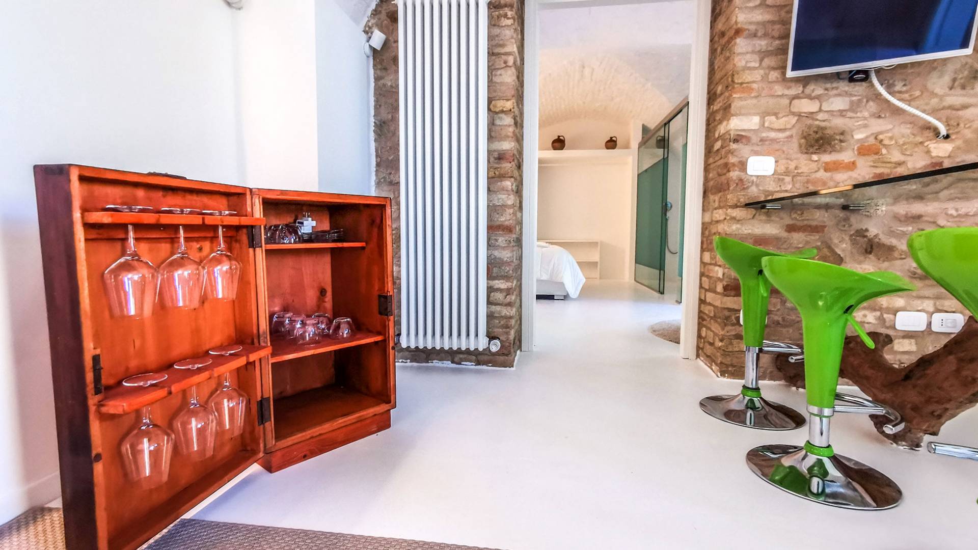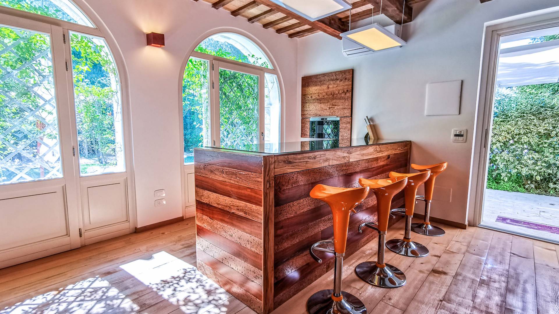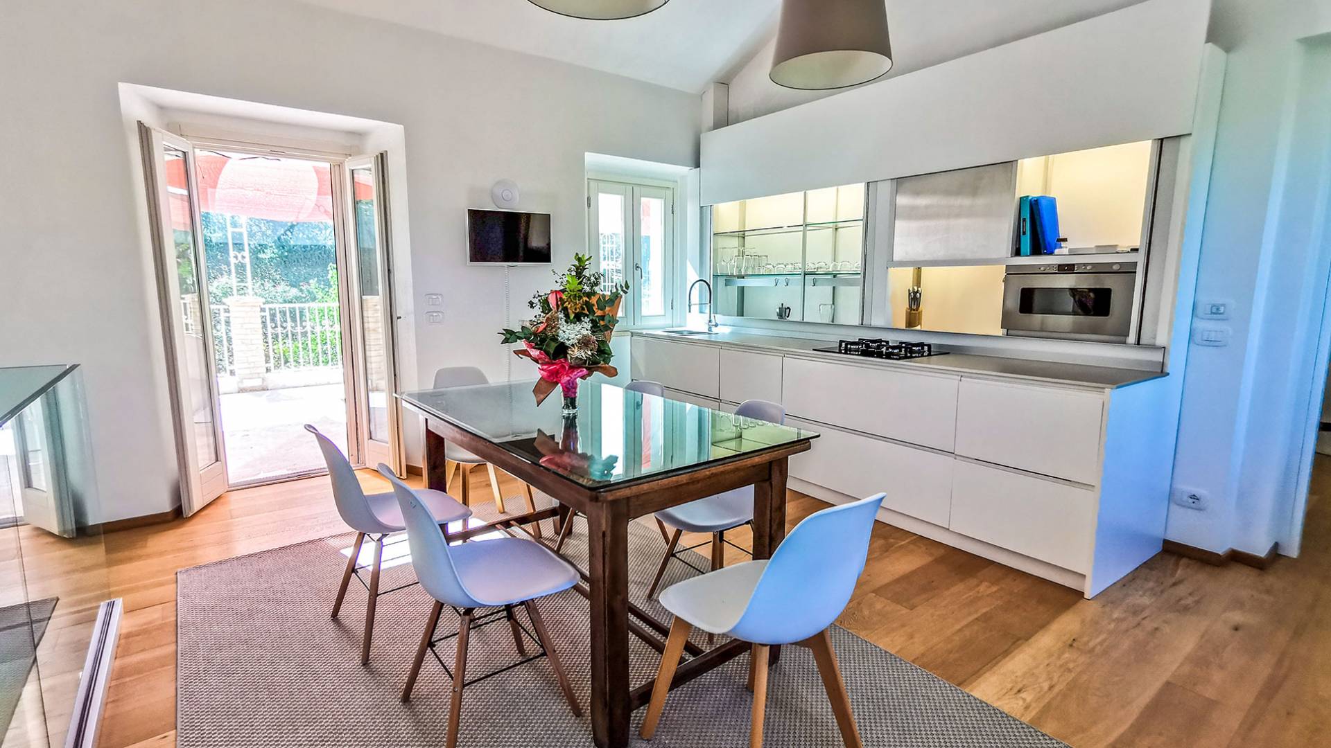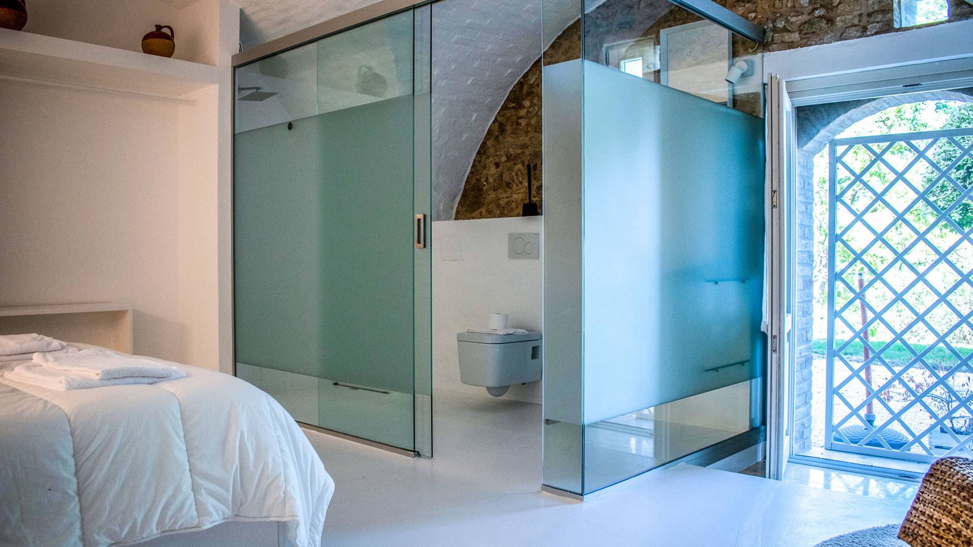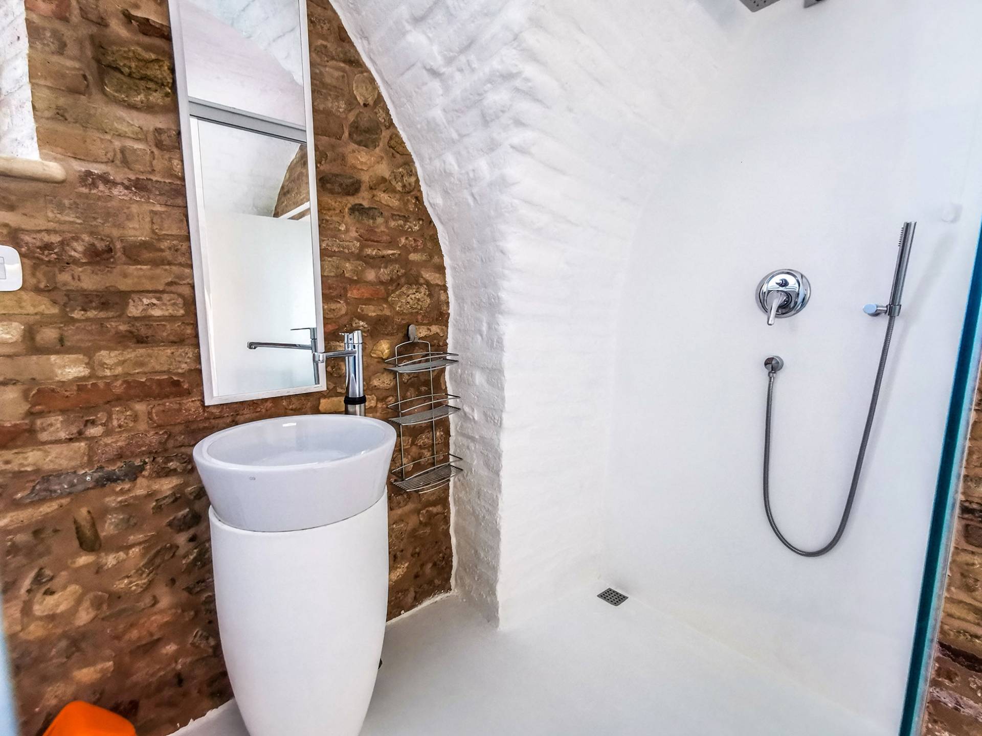 Composed of four apartments, able to accommodate two to six people each and all equipped with an independent kitchen, Villa Picena can accommodate, up to a maximum of twelve people. But it is in the large outdoor kitchen, directly overlooking the garden, that the Villa lives a second life. Here, up to twenty people can be accommodated. The large stone block that characterizes this part of the building has large windows and is served by a convenient and functional wood-burning oven and, at the same time, also offers the possibility of lighting up to an outdoor barbeque. Here too we find travertine, a typical material of this area which also includes the interior floors, together with lots