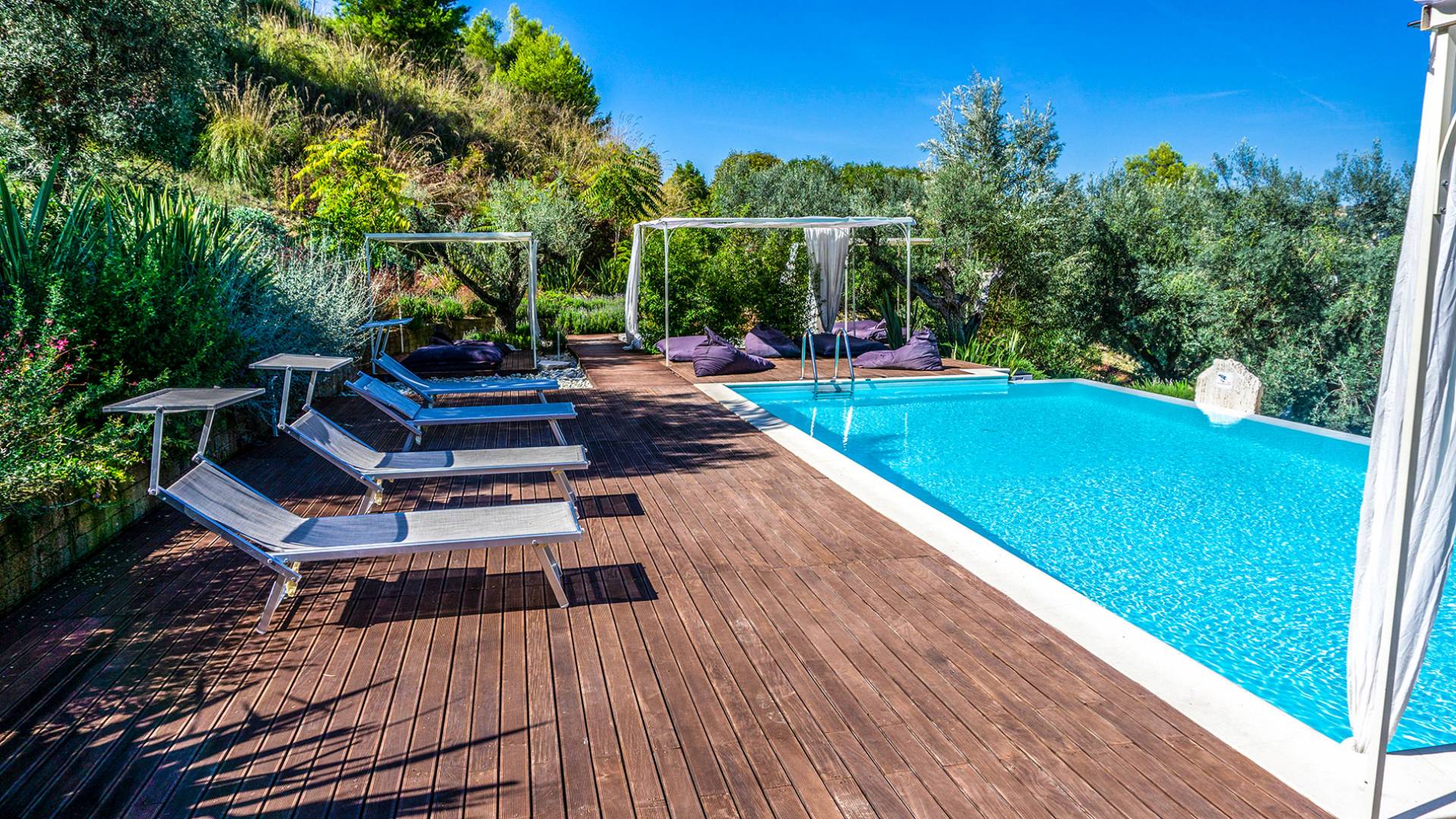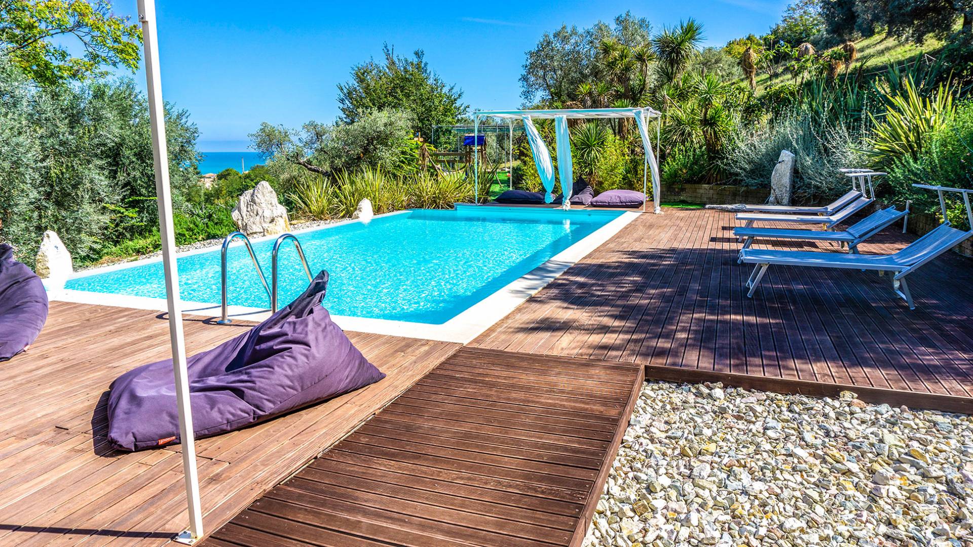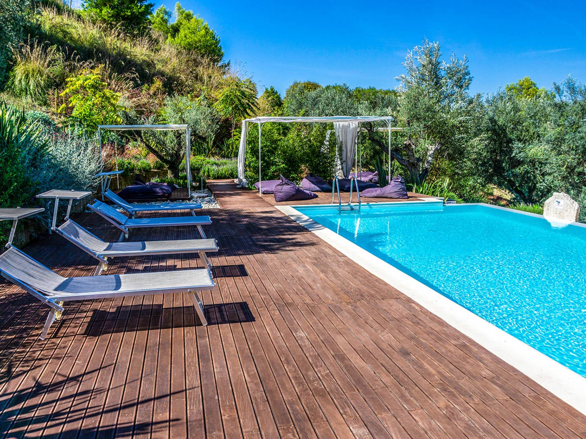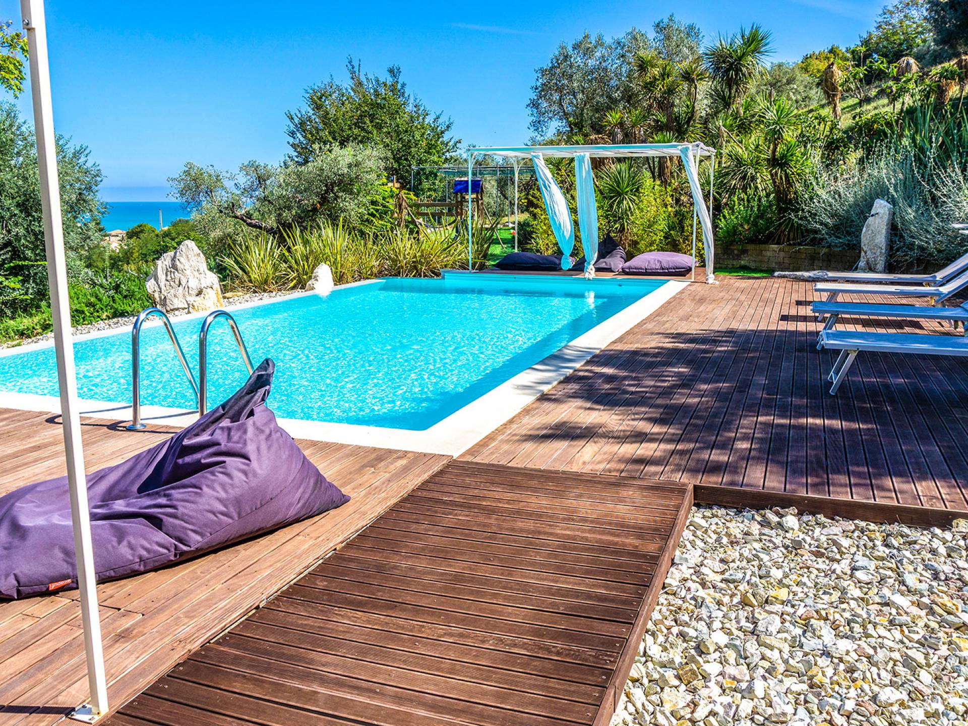 of wood in what, as a final result, is a great mix between modern and ancient. Outside, very suggestive, even the fountain – amazing to see it light up at night – which is almost the futuristic re-creation of an ancient ditch to defend the sumptuous property. The large garden is the ideal place to read a book, have a drink, take a walk, or drive into real sunbaths or in the enchanting pool overlooking the sea. All around, in the large wooden walkway, you can stretch out on the comfortable deck chairs able to accommodate the many guests who will surely find the residence of their dreams at Villa Picena.
