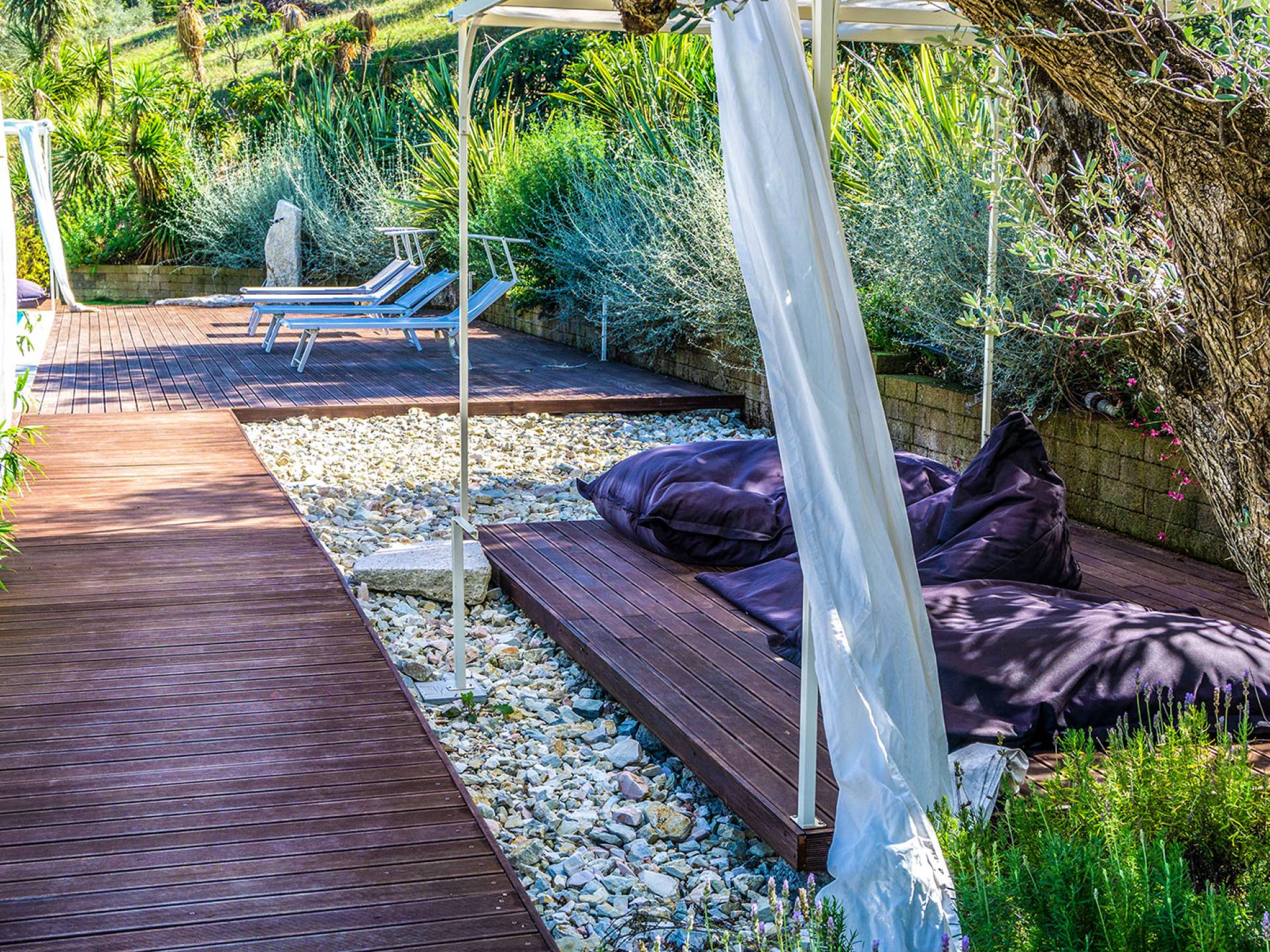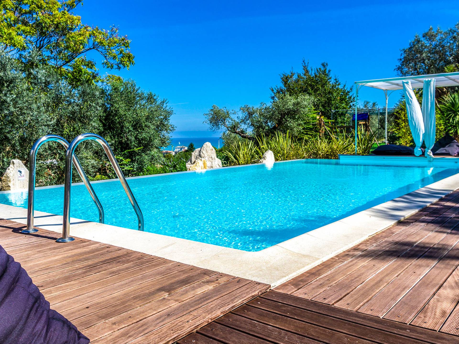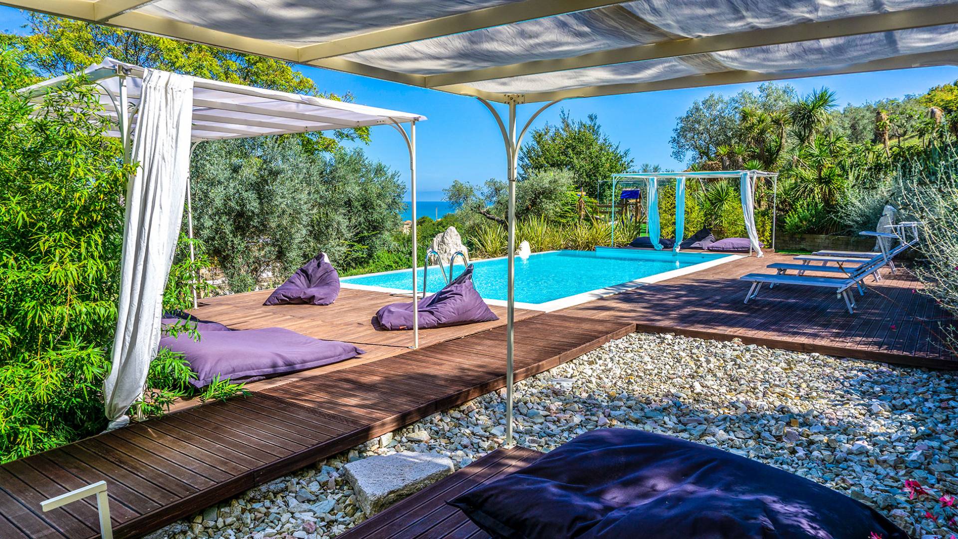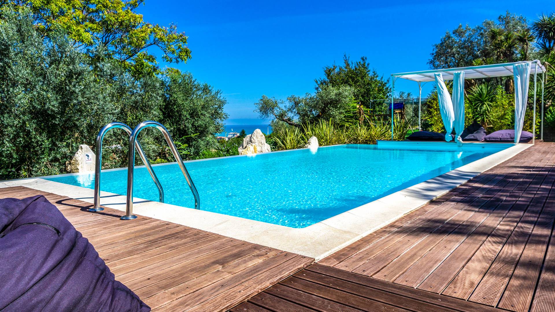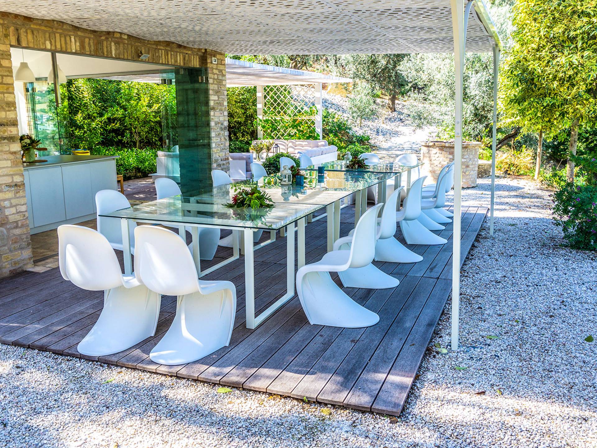 of wood in what, as a final result, is a great mix between modern and ancient. Outside, very suggestive, even the fountain – amazing to see it light up at night – which is almost the futuristic re-creation of an ancient ditch to defend the sumptuous property. The large garden is the ideal place to read a book, have a drink, take a walk, or drive into real sunbaths or in the enchanting pool overlooking the sea. All around, in the large wooden walkway, you can stretch out on the comfortable deck chairs able to accommodate the many guests who will surely find the residence of their dreams at Villa Picena.