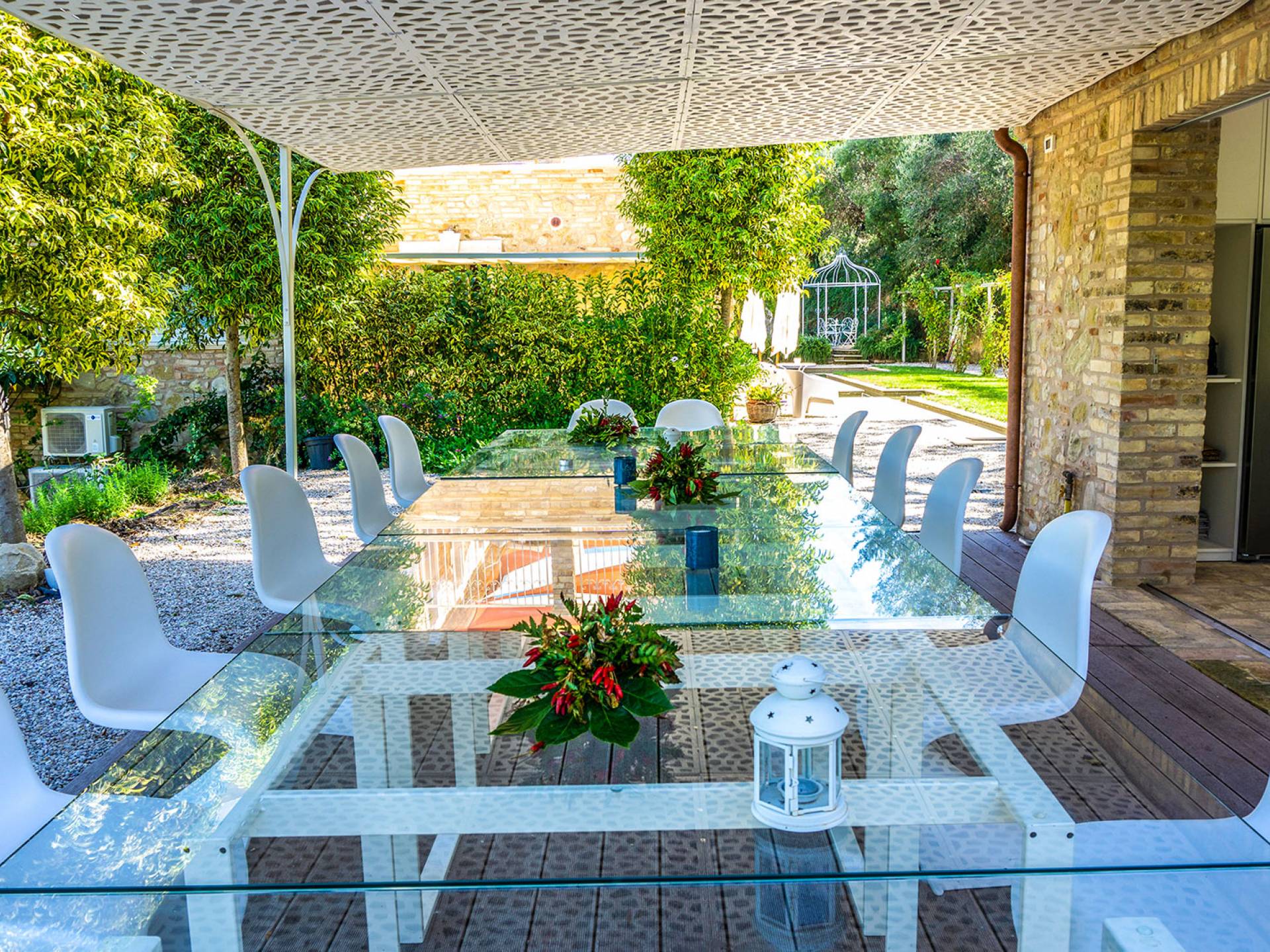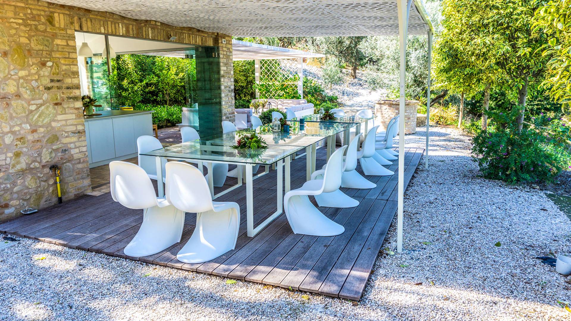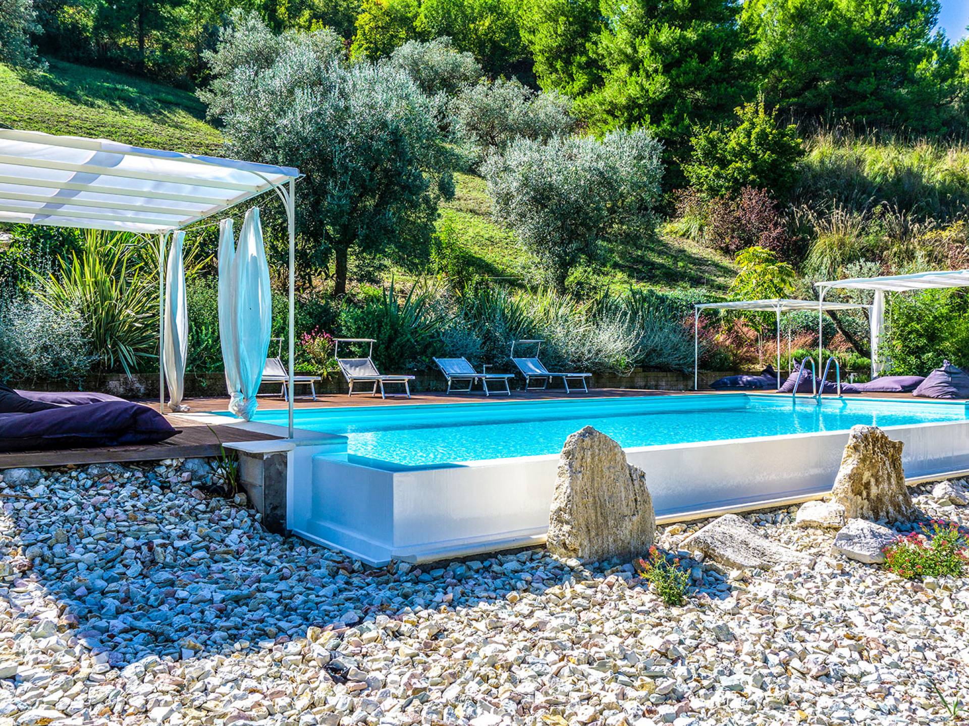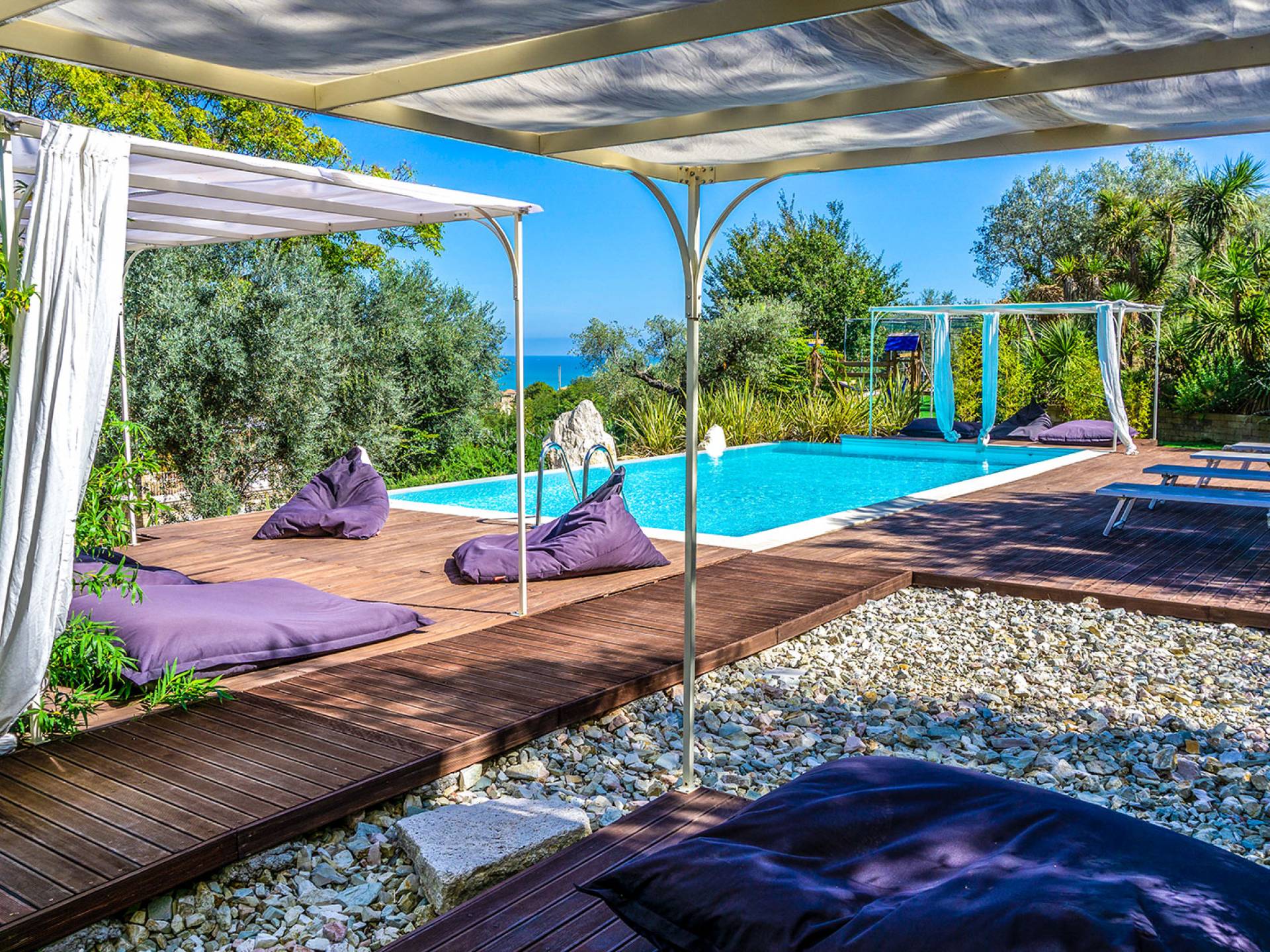 of wood in what, as a final result, is a great mix between modern and ancient. Outside, very suggestive, even the fountain – amazing to see it light up at night – which is almost the futuristic re-creation of an ancient ditch to defend the sumptuous property. The large garden is the ideal place to read a book, have a drink, take a walk, or drive into real sunbaths or in the enchanting pool overlooking the sea. All around, in the large wooden walkway, you can stretch out on the comfortable deck chairs able to accommodate the many guests who will surely find the residence of their dreams at Villa Picena.