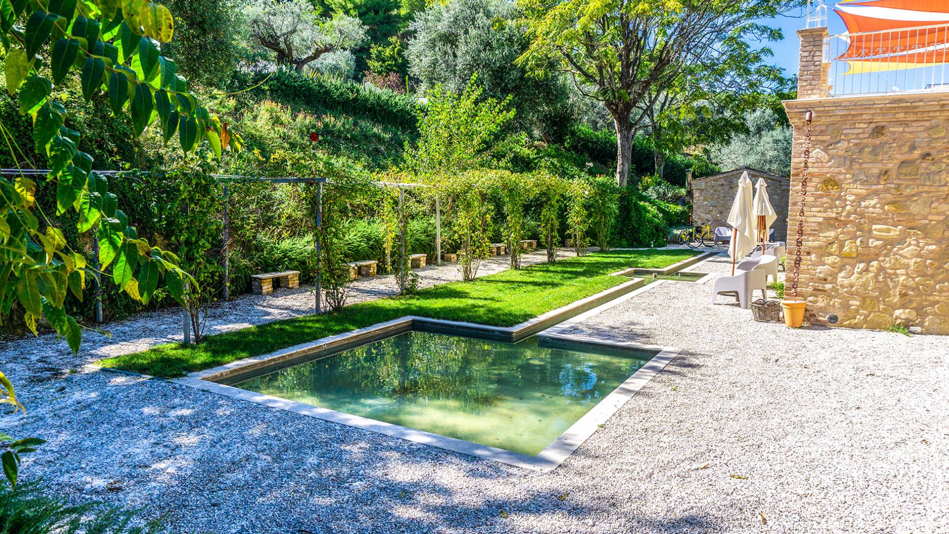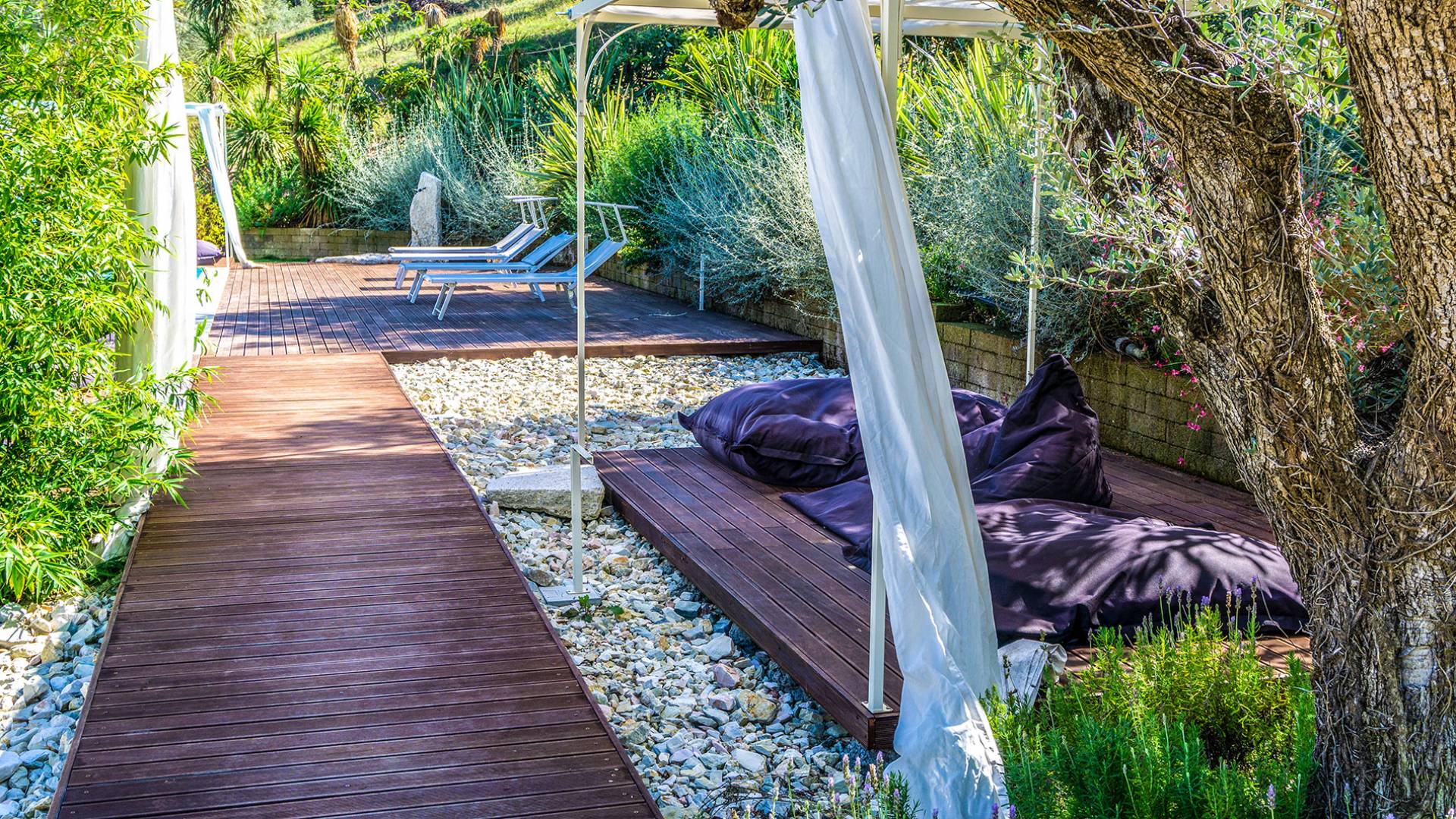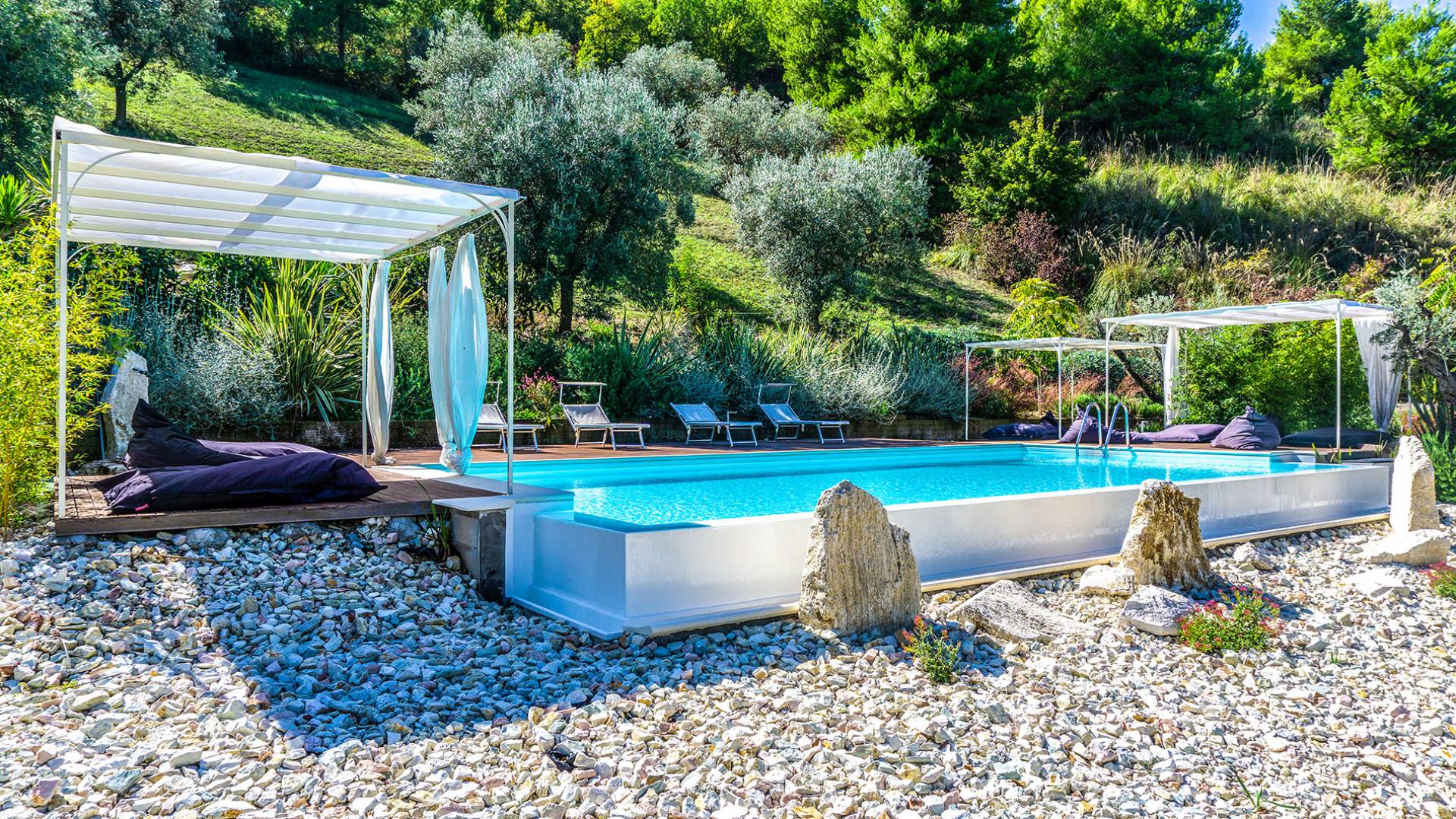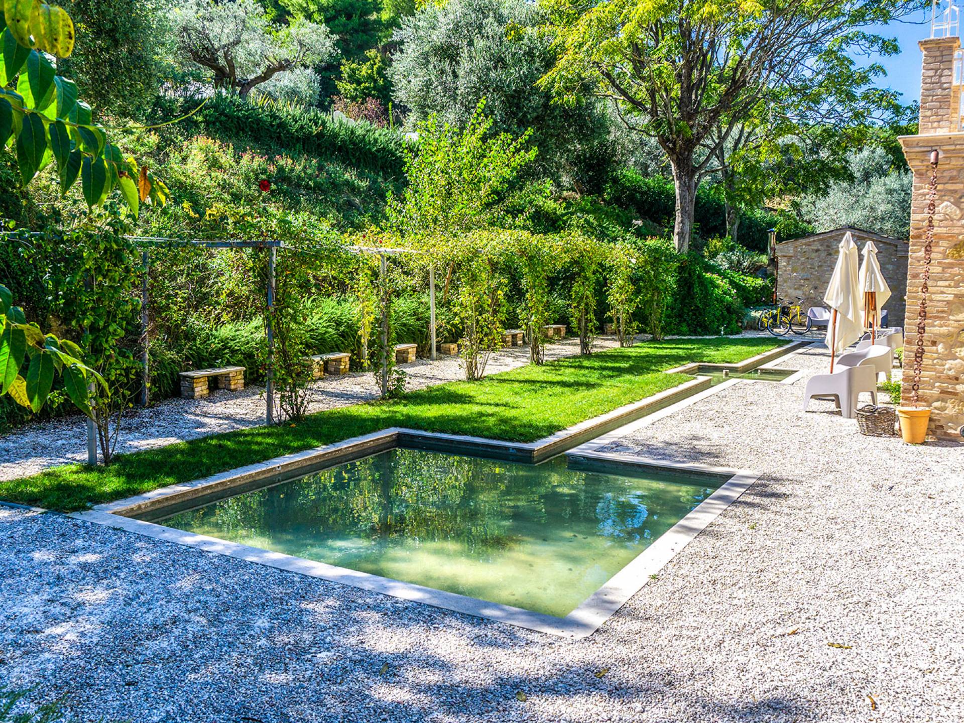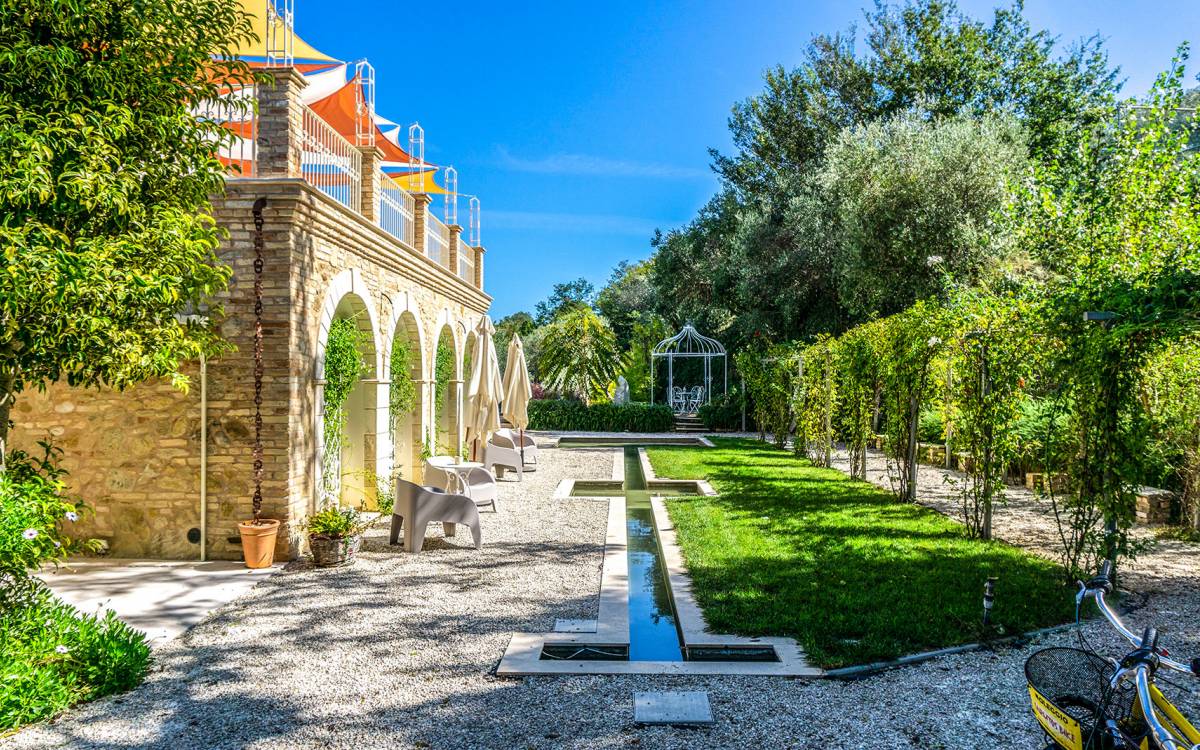 of wood in what, as a final result, is a great mix between modern and ancient. Outside, very suggestive, even the fountain – amazing to see it light up at night – which is almost the futuristic re-creation of an ancient ditch to defend the sumptuous property. The large garden is the ideal place to read a book, have a drink, take a walk, or drive into real sunbaths or in the enchanting pool overlooking the sea. All around, in the large wooden walkway, you can stretch out on the comfortable deck chairs able to accommodate the many guests who will surely find the residence of their dreams at Villa Picena.