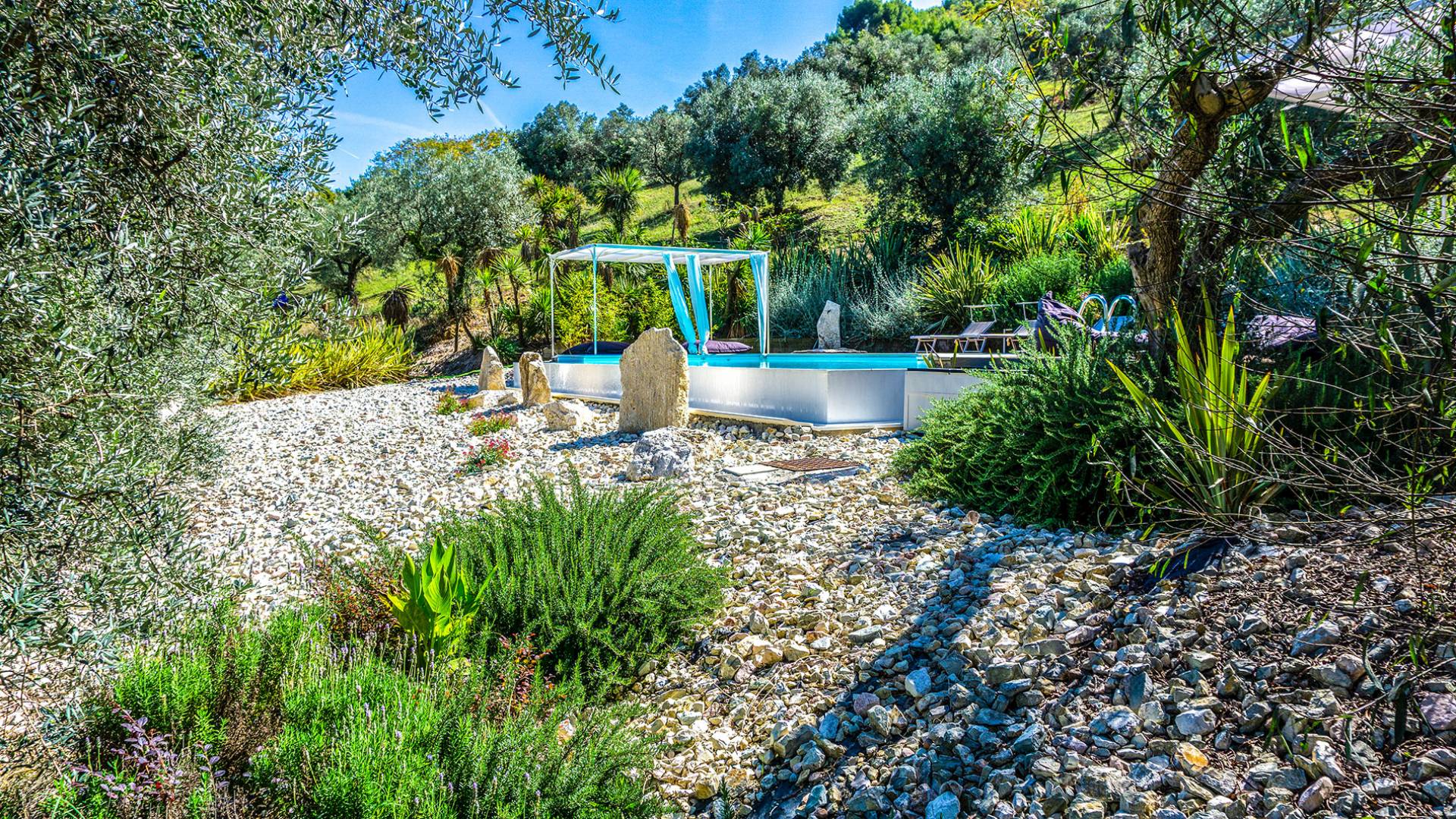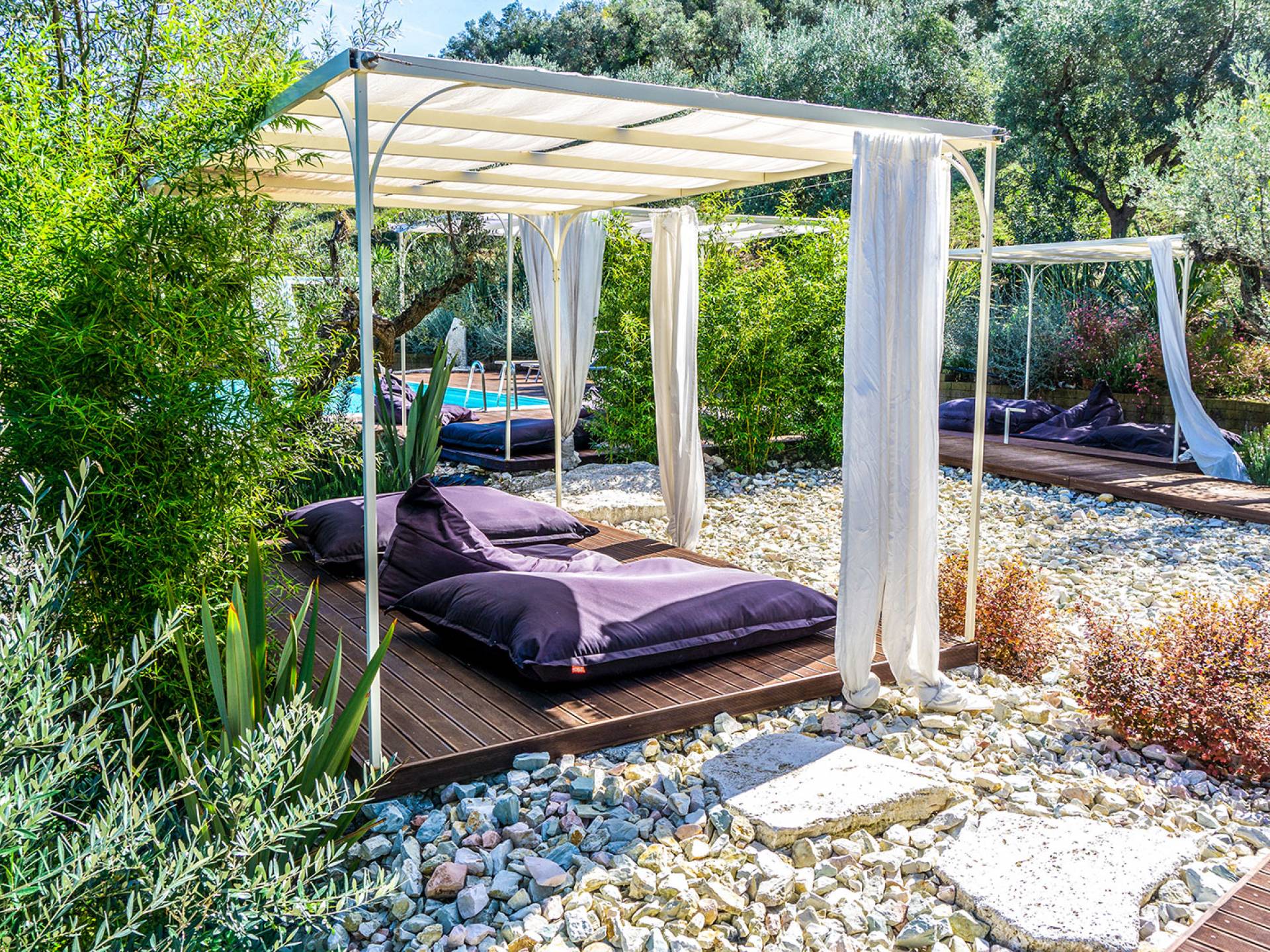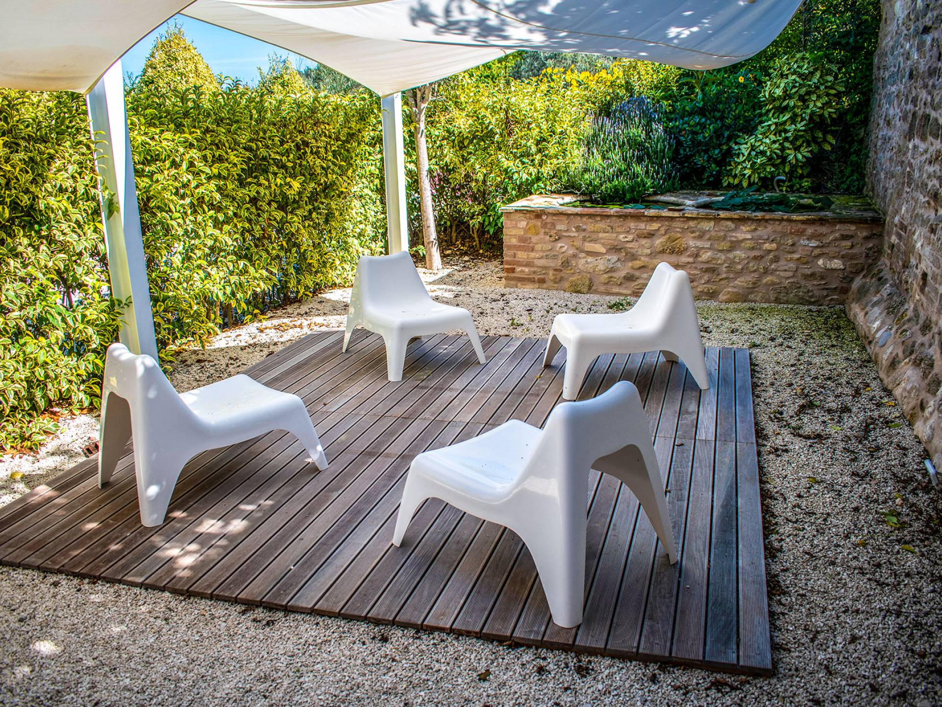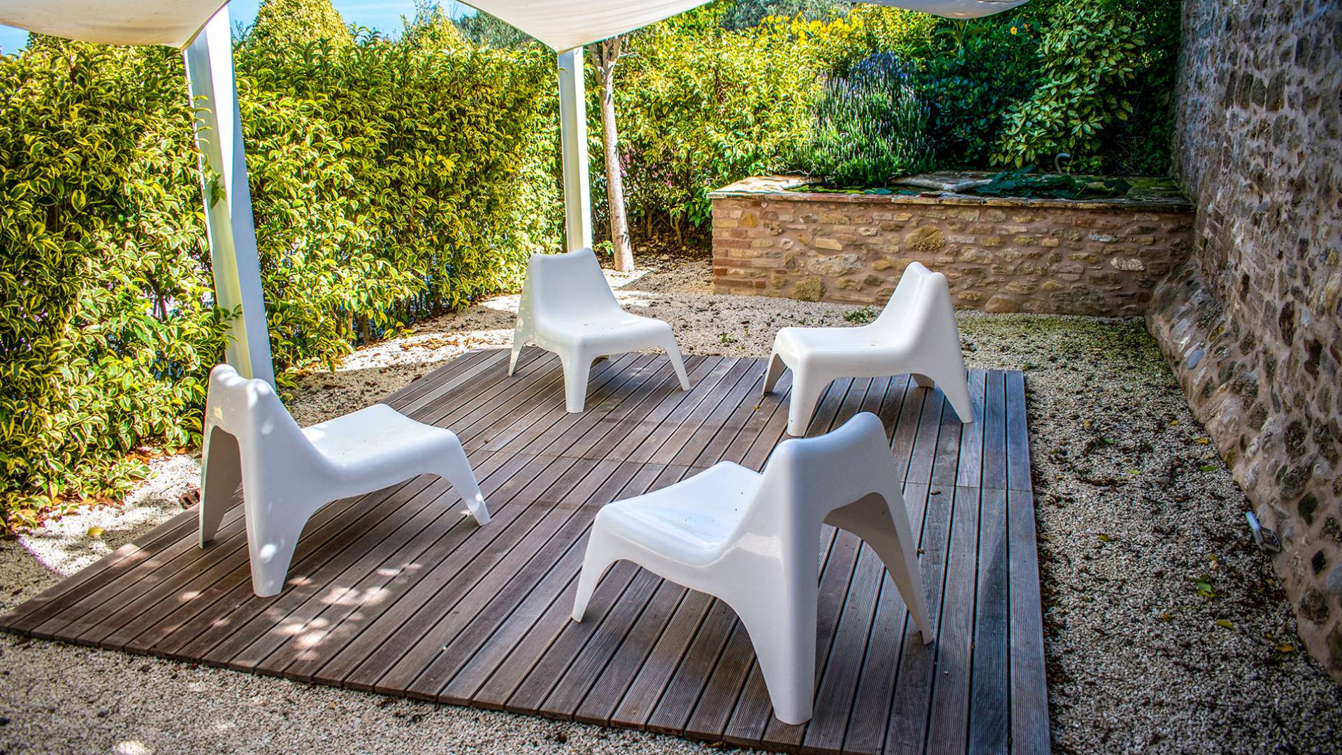 of wood in what, as a final result, is a great mix between modern and ancient. Outside, very suggestive, even the fountain – amazing to see it light up at night – which is almost the futuristic re-creation of an ancient ditch to defend the sumptuous property. The large garden is the ideal place to read a book, have a drink, take a walk, or drive into real sunbaths or in the enchanting pool overlooking the sea. All around, in the large wooden walkway, you can stretch out on the comfortable deck chairs able to accommodate the many guests who will surely find the residence of their dreams at Villa Picena.