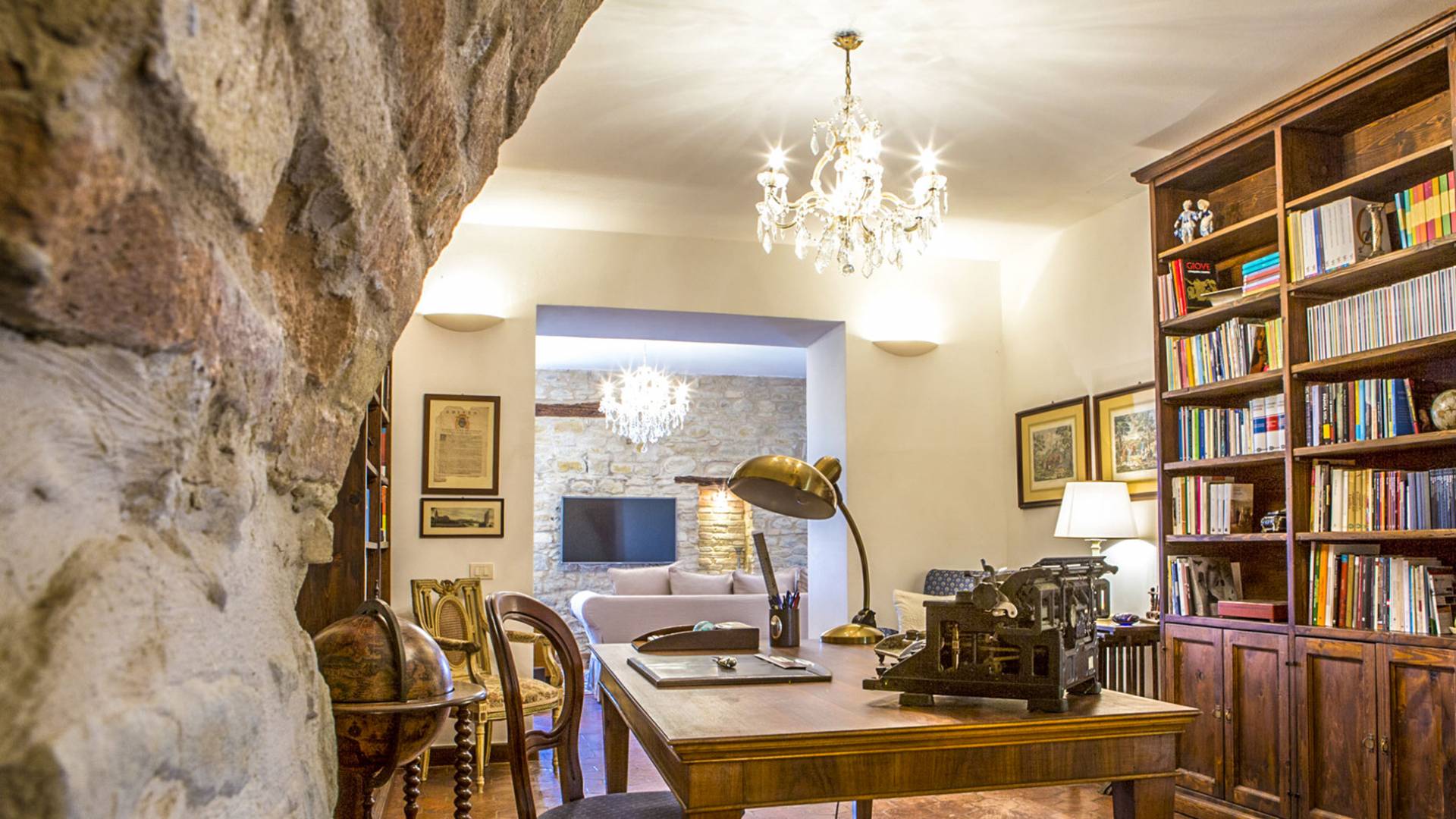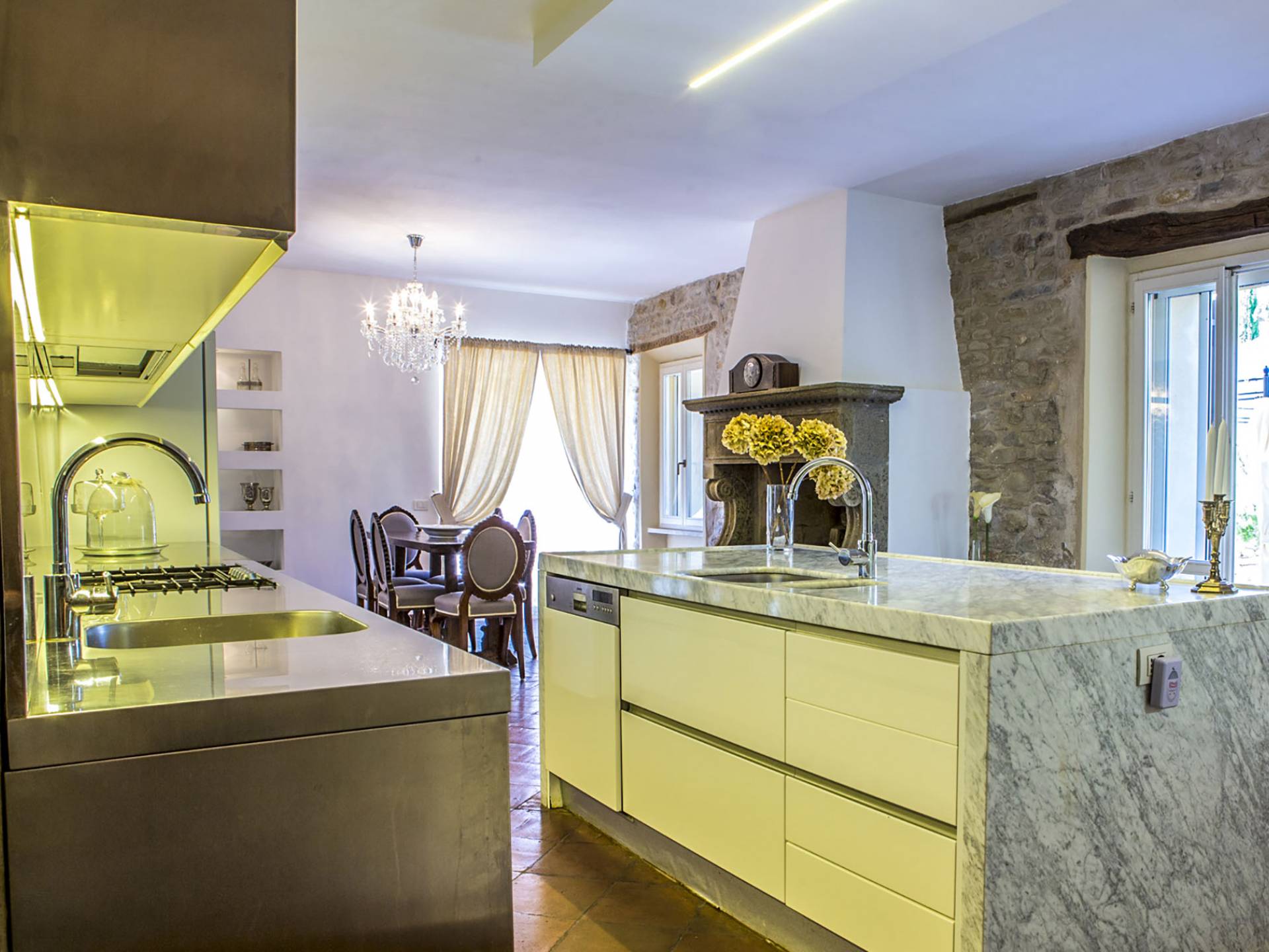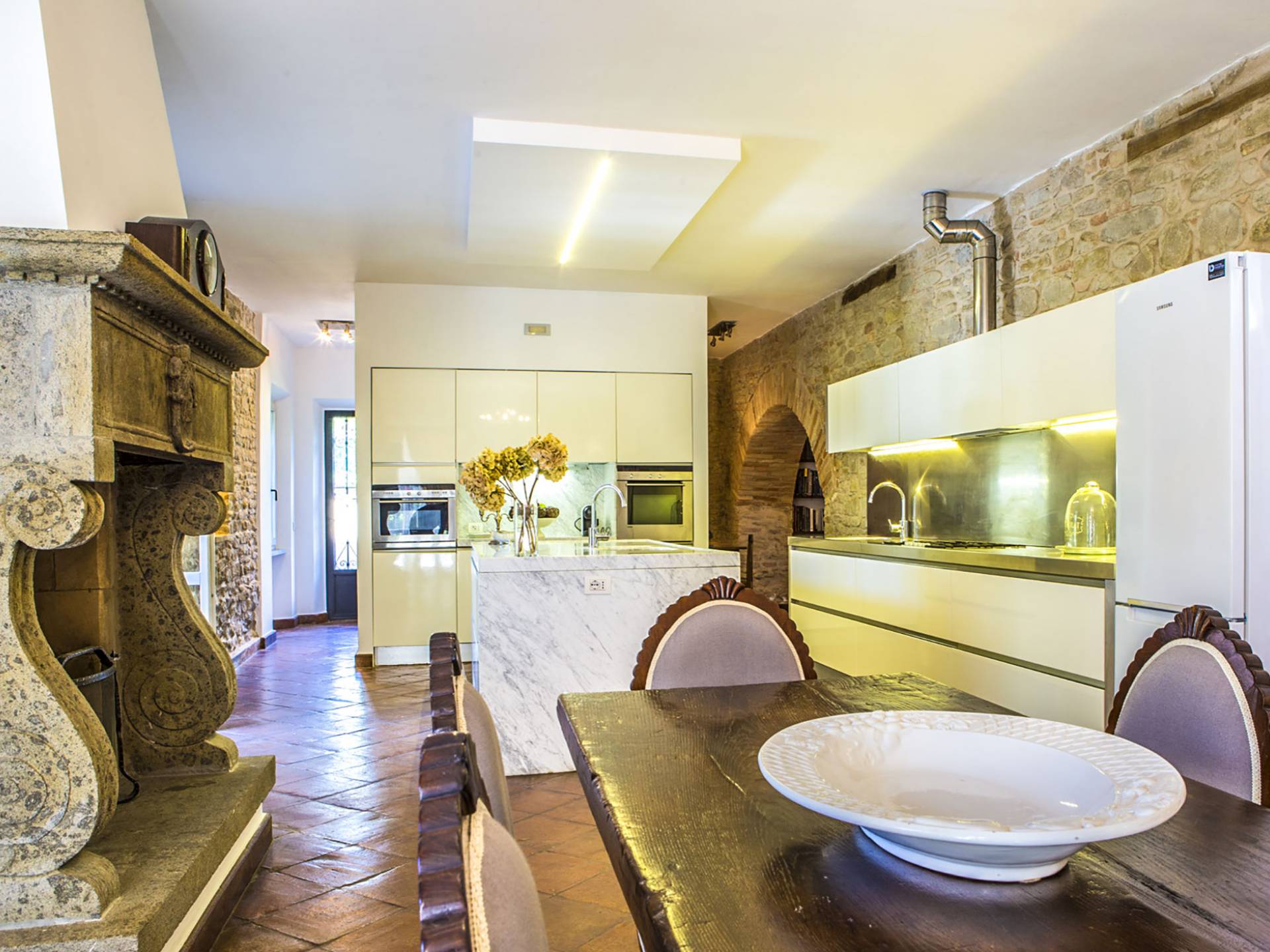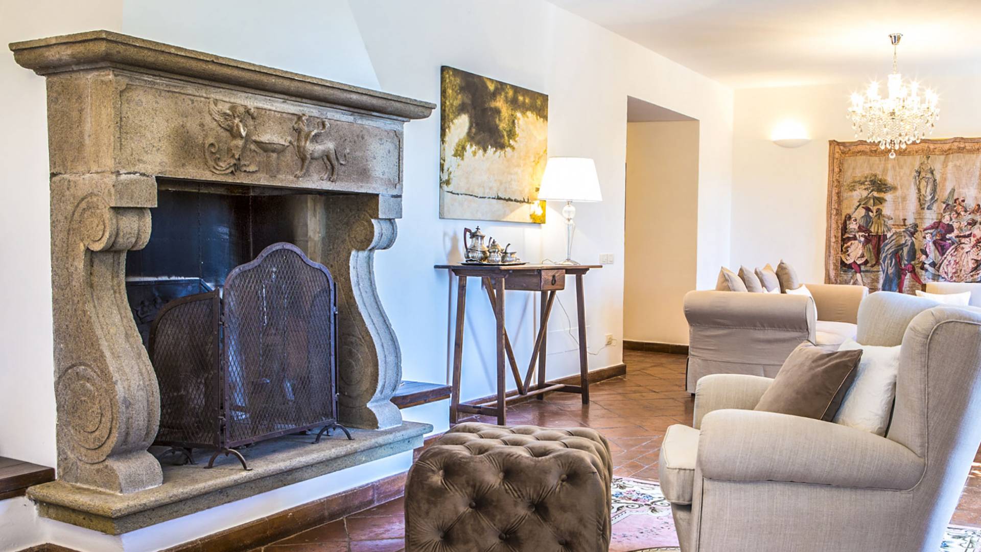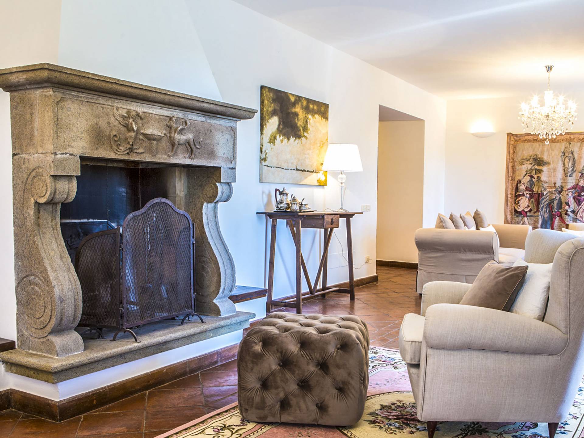 On the ground floor, there is a large entrance hall, a large living room with Smart TV, and a stone fireplace. Another beautiful stone fireplace is located in the large modern and well-equipped kitchen. Then there is the reading room, a service bathroom, and the laundry area. On the first floor, there is another reading room, made out from the balcony, the master bedroom with an en-suite bathroom, a second and a third double bedroom, the latter with a mezzanine floor. The last two bedrooms are served by a large bathroom with a tub and shower. Inside, high-quality furniture and styles create an elegant and very welcoming atmosphere.