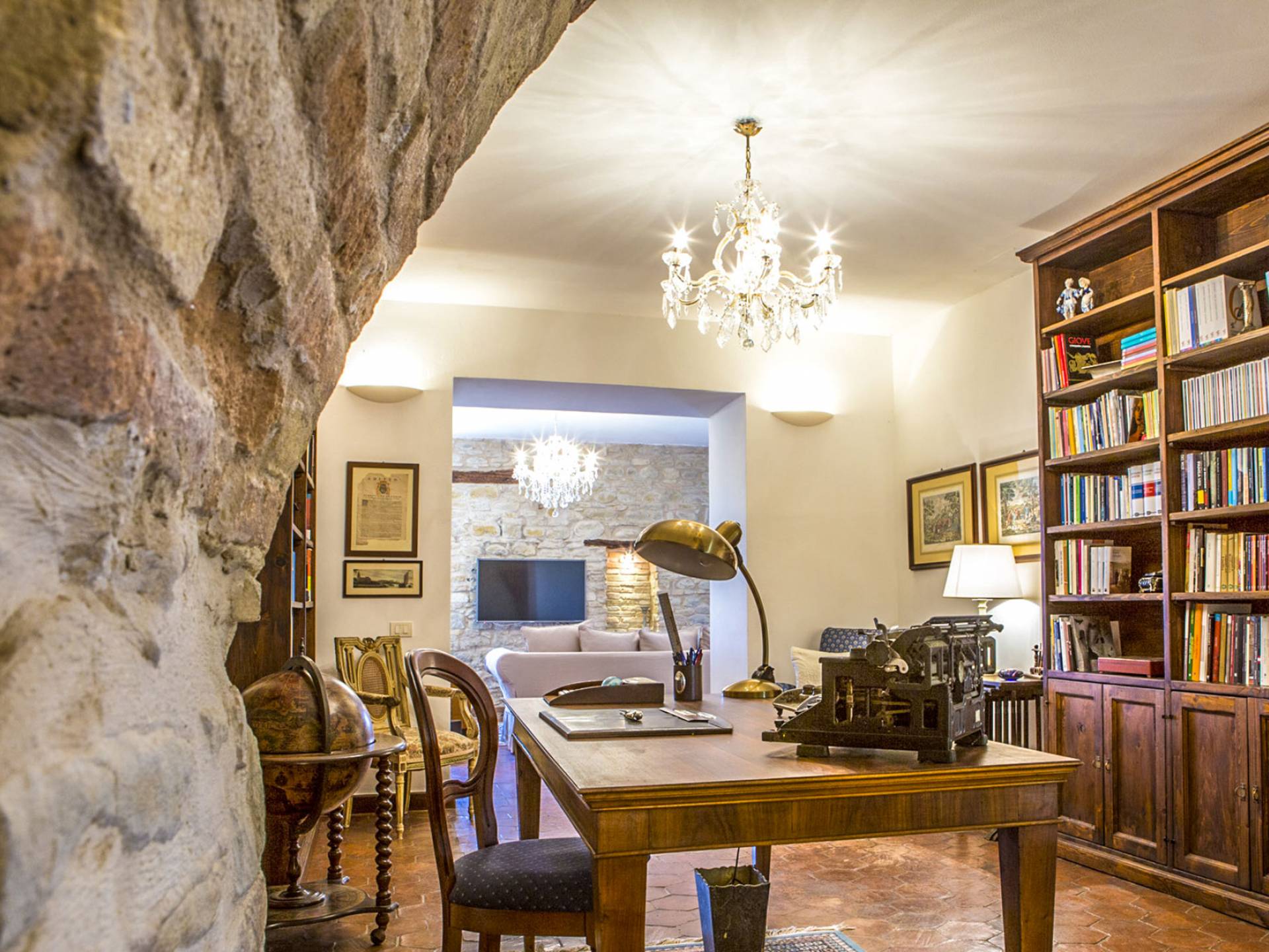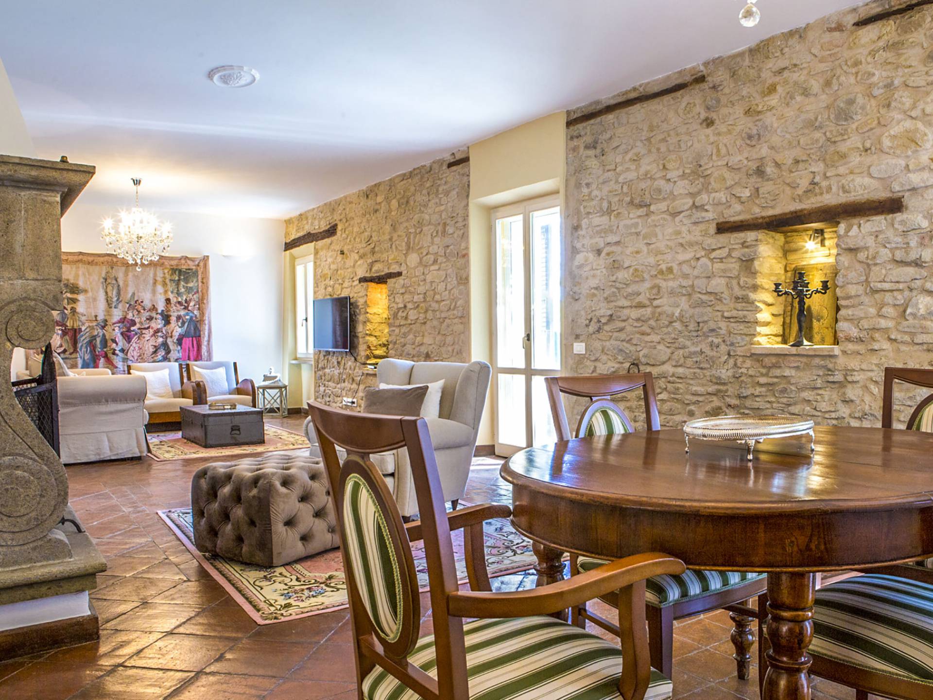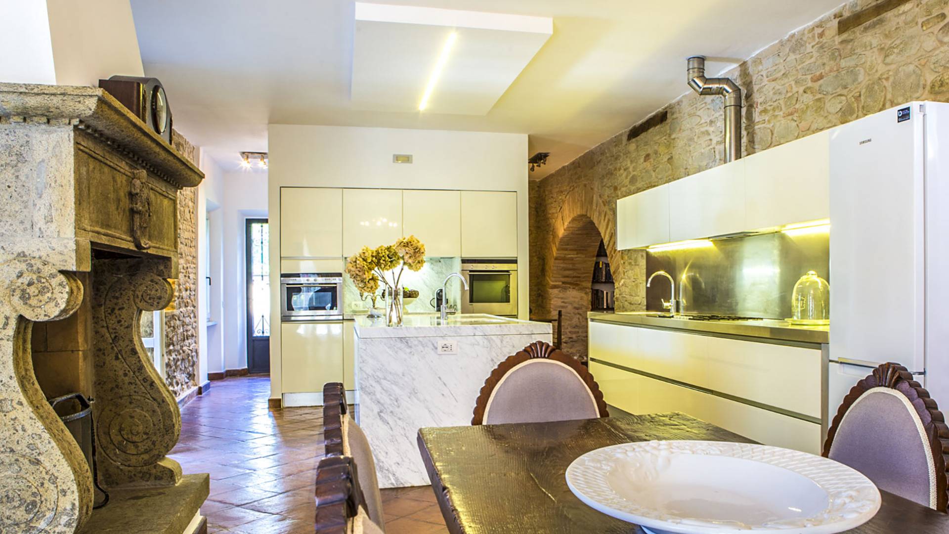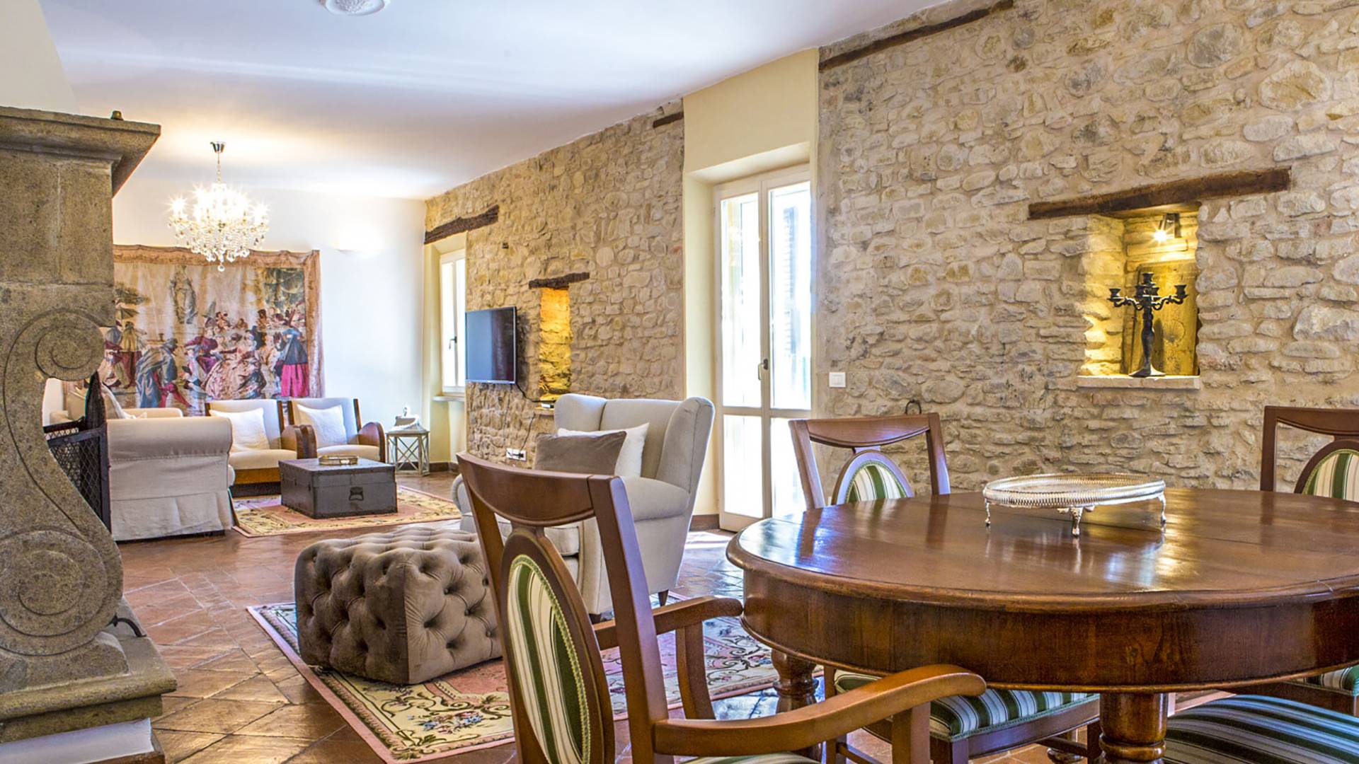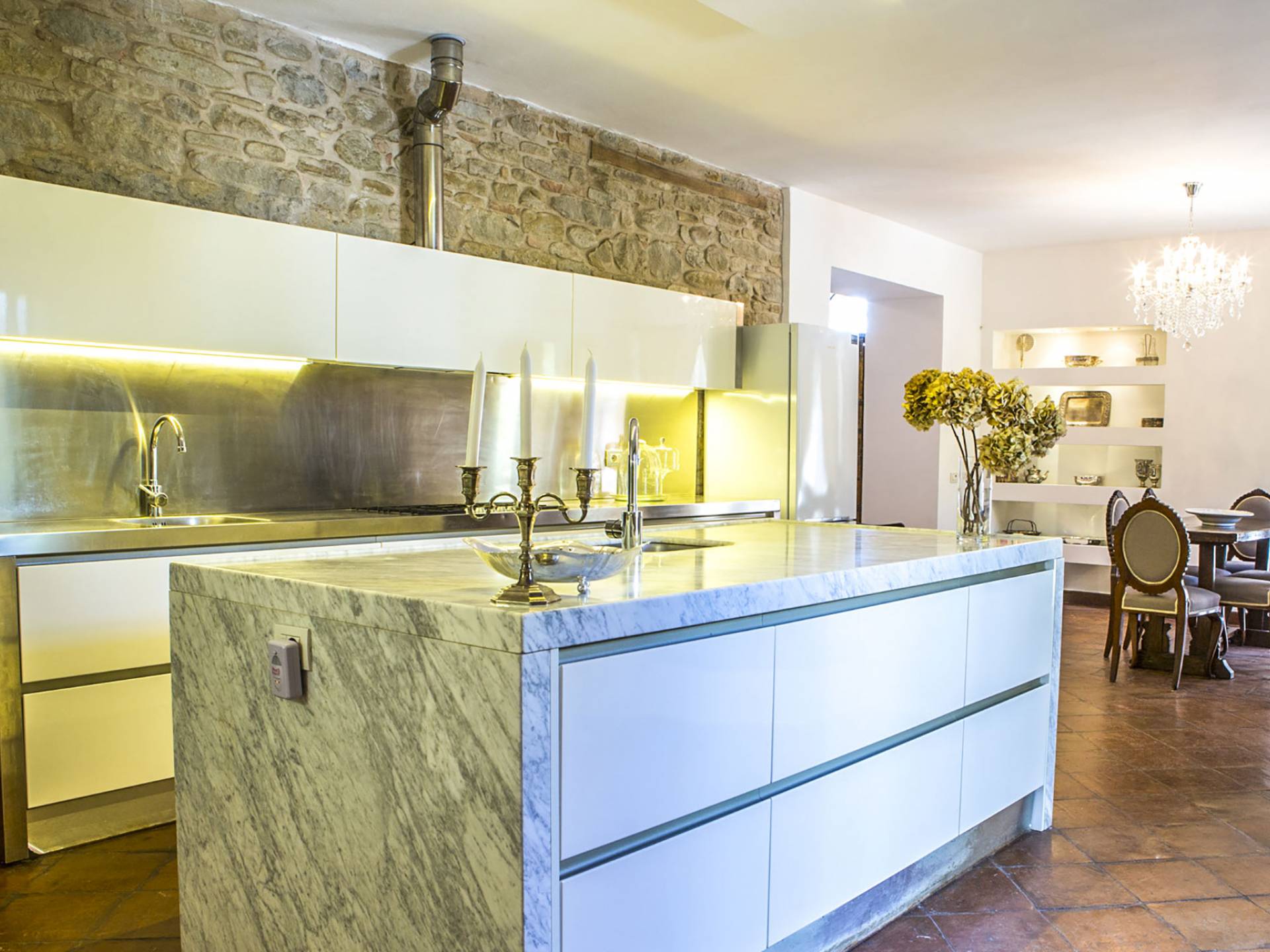 On the ground floor, there is a large entrance hall, a large living room with Smart TV, and a stone fireplace. Another beautiful stone fireplace is located in the large modern and well-equipped kitchen. Then there is the reading room, a service bathroom, and the laundry area. On the first floor, there is another reading room, made out from the balcony, the master bedroom with an en-suite bathroom, a second and a third double bedroom, the latter with a mezzanine floor. The last two bedrooms are served by a large bathroom with a tub and shower. Inside, high-quality furniture and styles create an elegant and very welcoming atmosphere.