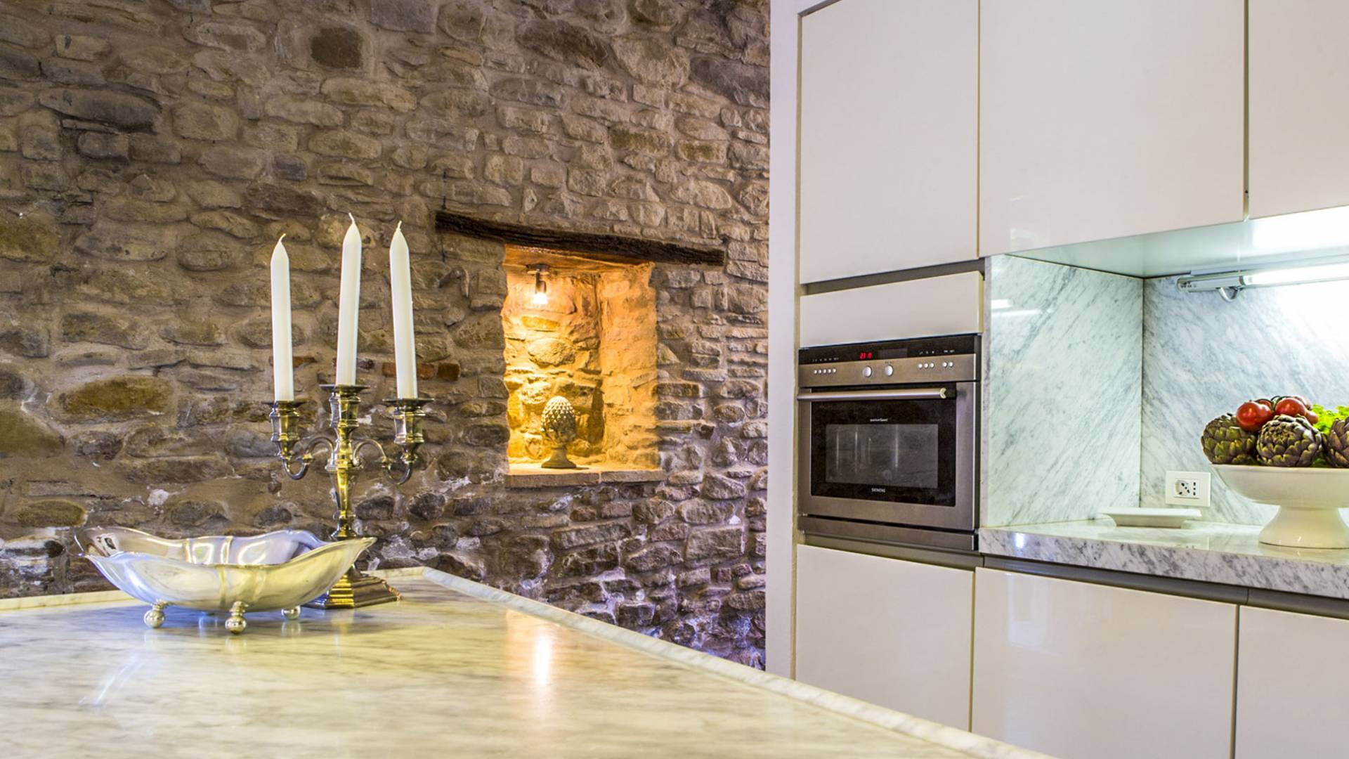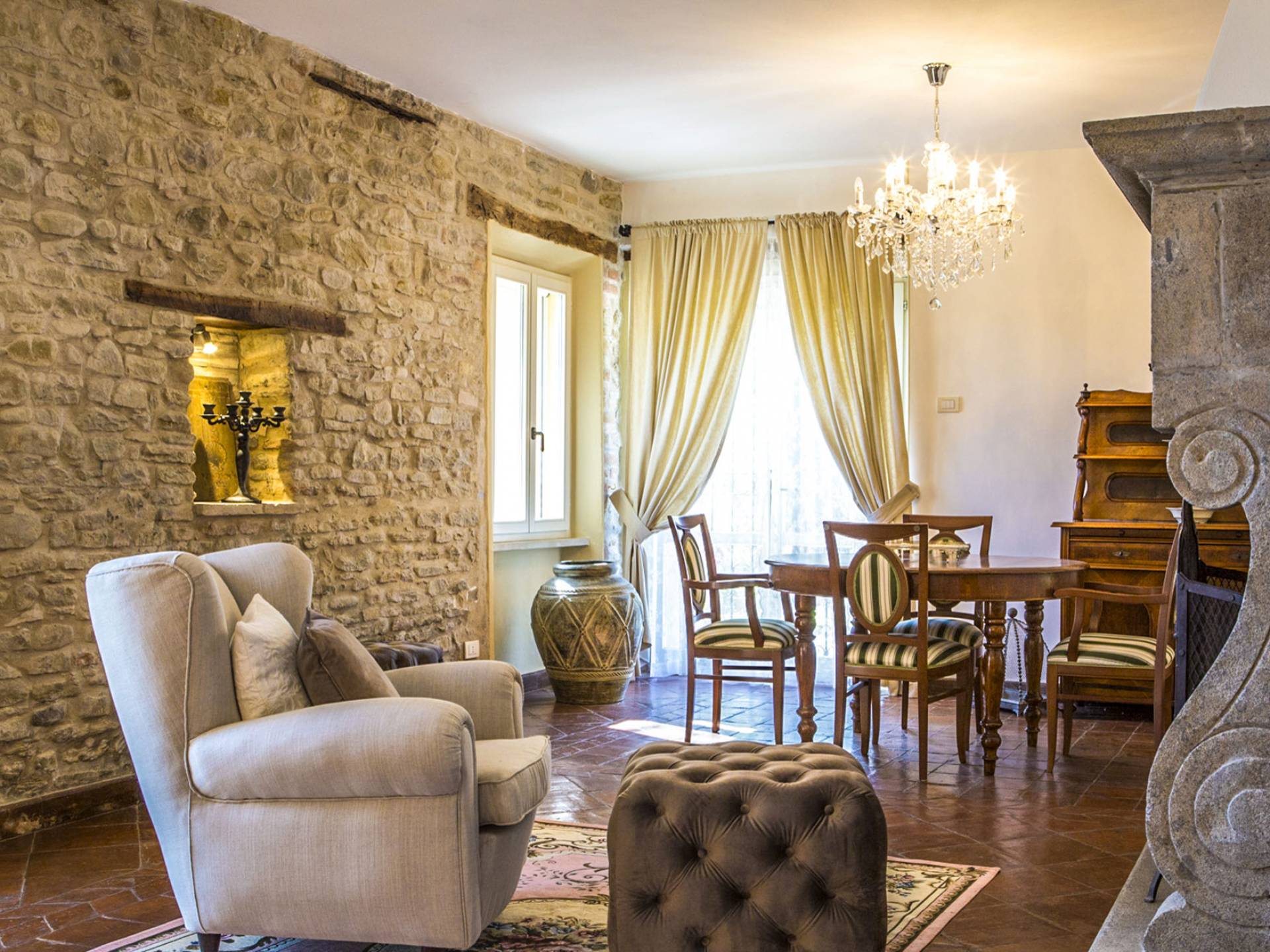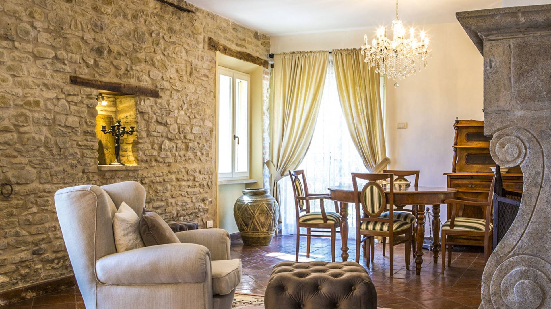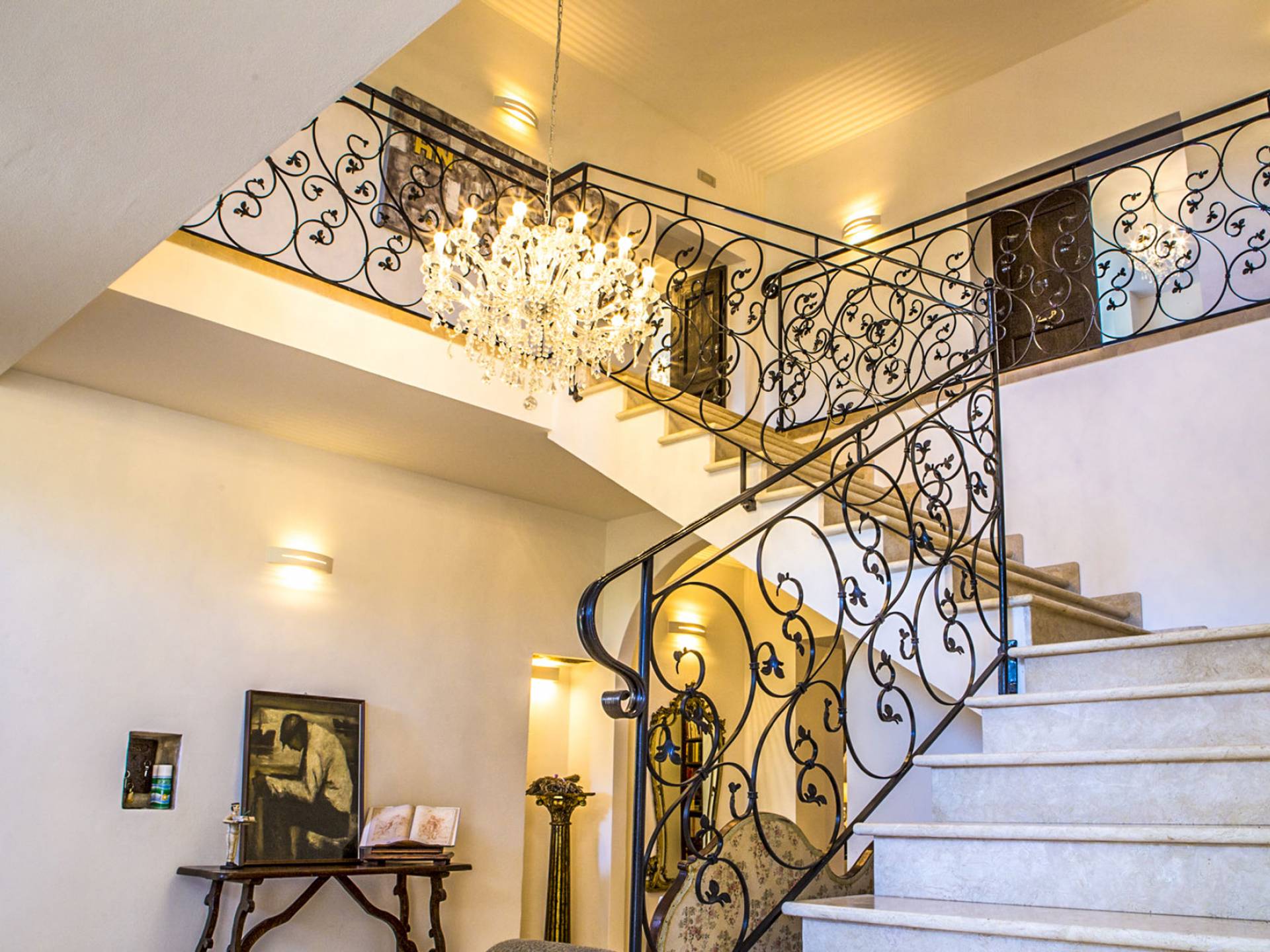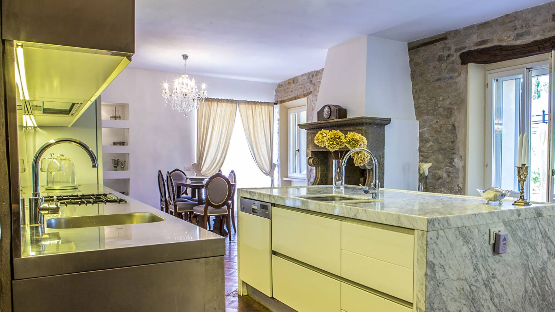 On the ground floor, there is a large entrance hall, a large living room with Smart TV, and a stone fireplace. Another beautiful stone fireplace is located in the large modern and well-equipped kitchen. Then there is the reading room, a service bathroom, and the laundry area. On the first floor, there is another reading room, made out from the balcony, the master bedroom with an en-suite bathroom, a second and a third double bedroom, the latter with a mezzanine floor. The last two bedrooms are served by a large bathroom with a tub and shower. Inside, high-quality furniture and styles create an elegant and very welcoming atmosphere.