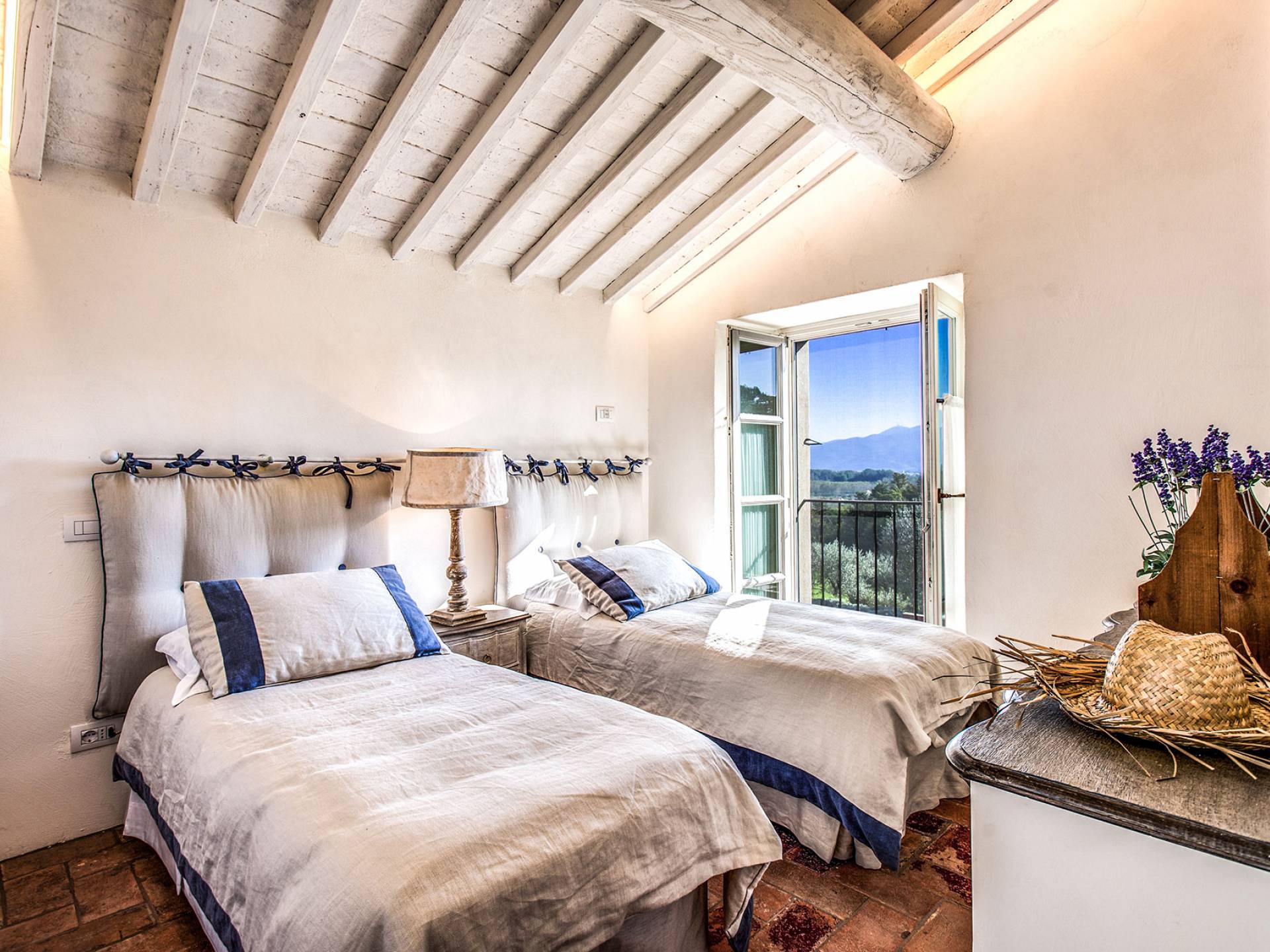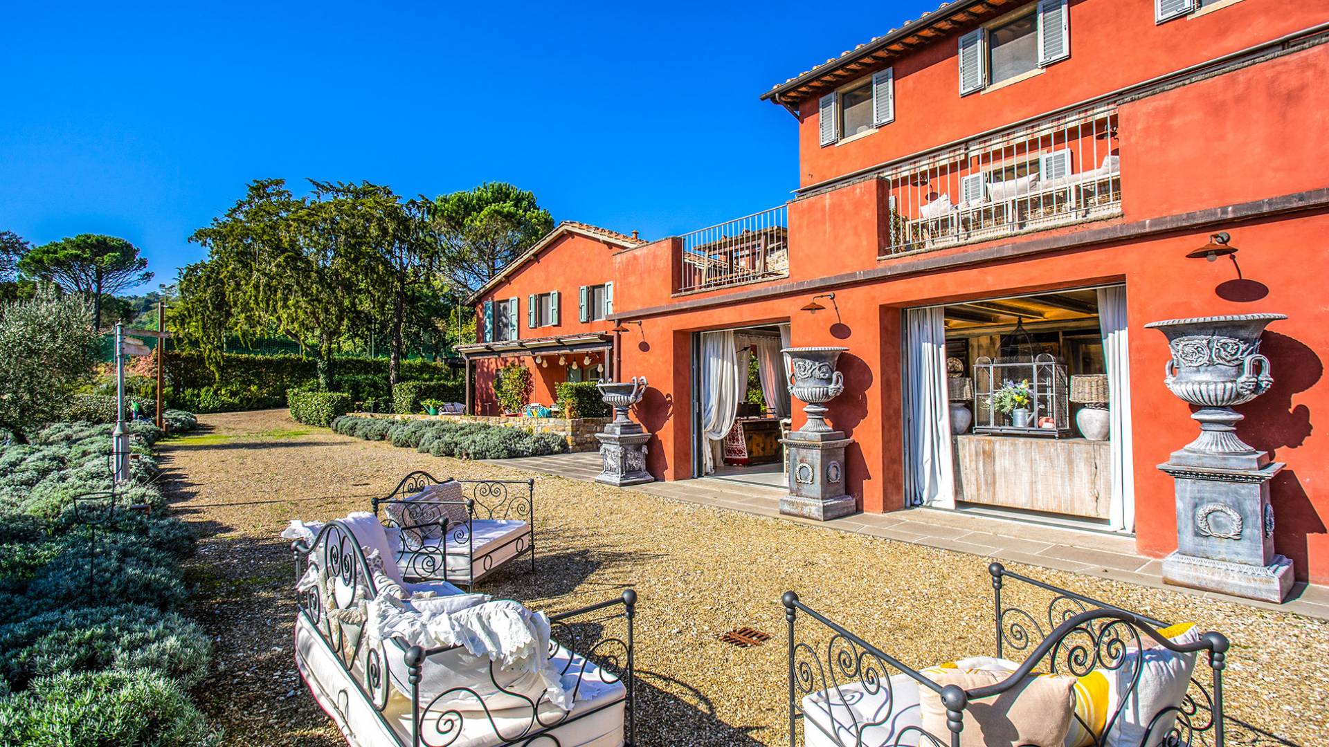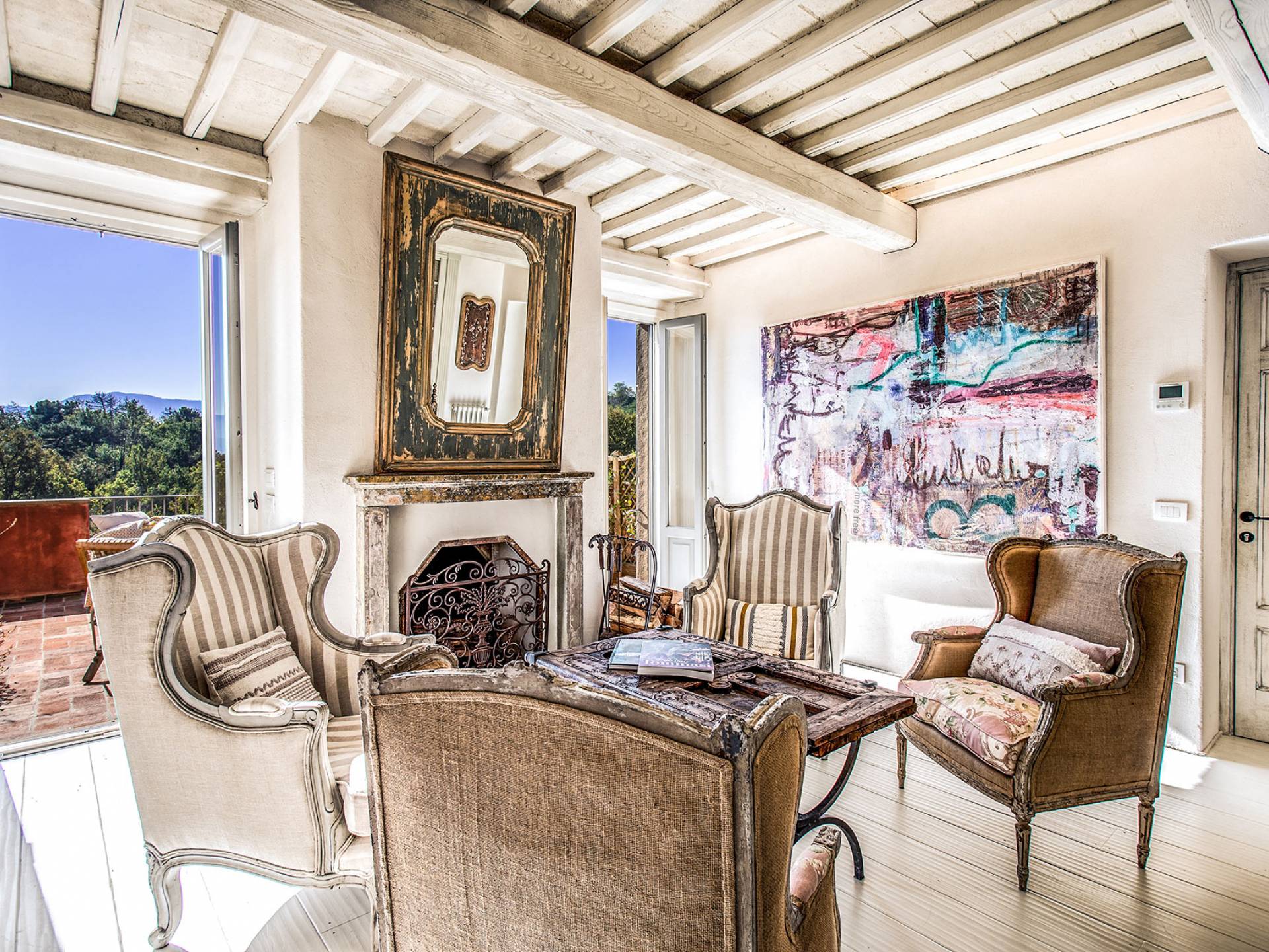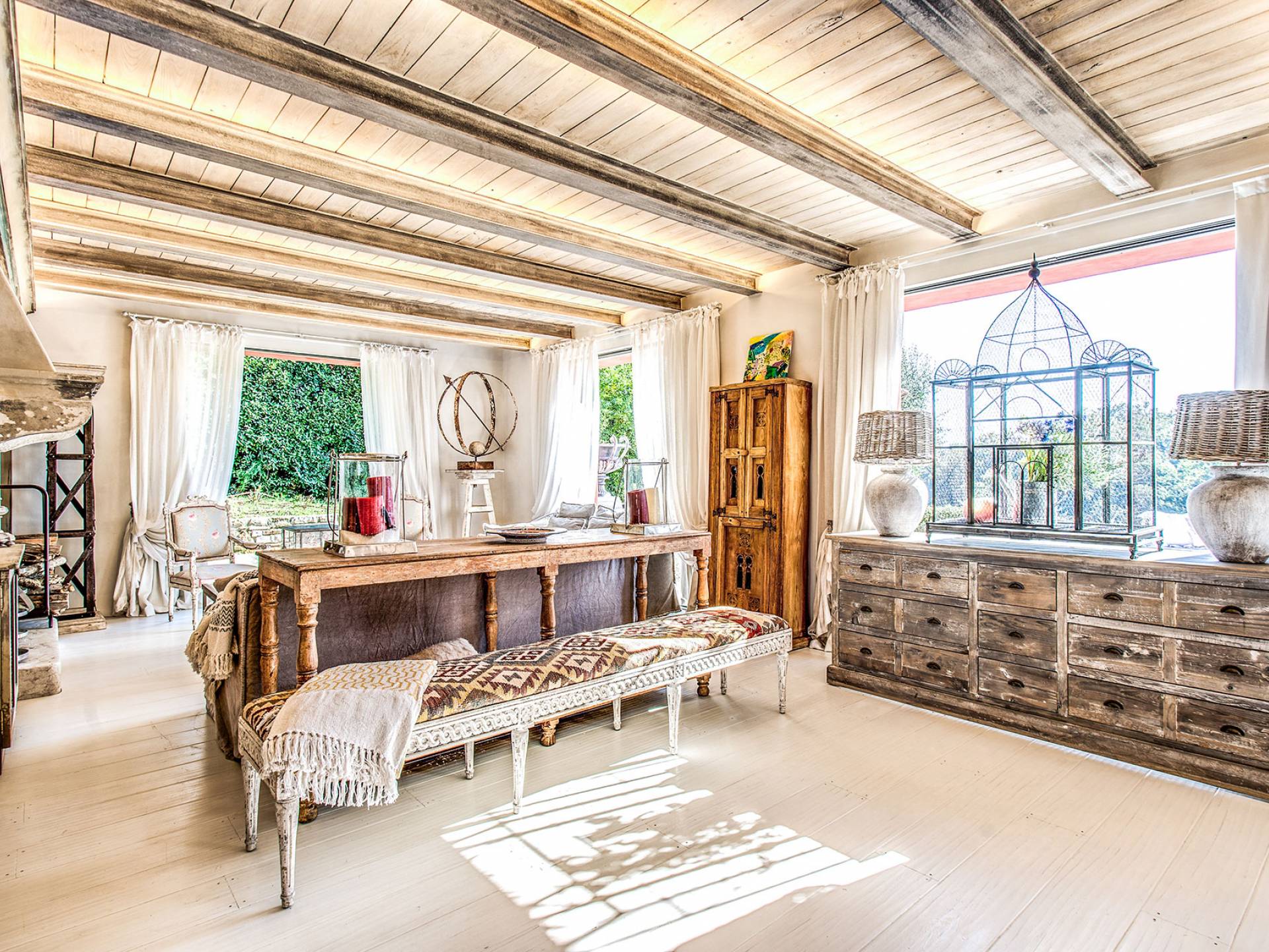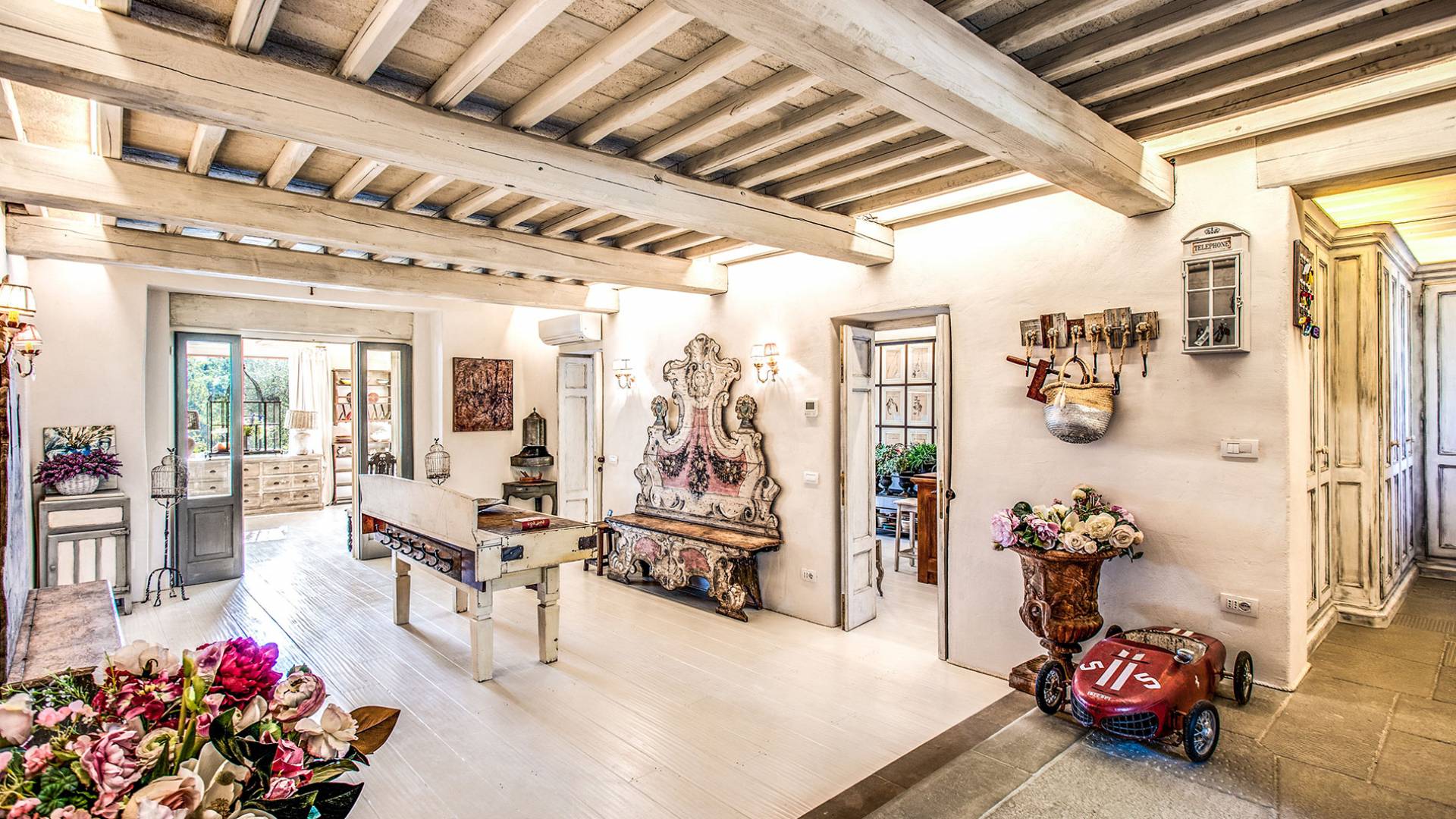 It is decorated in new-classic style with washed walls in pale shades, pietra serena and Italian wood. Countrymodern, the bohemian aesthetic of the property reflects its light and welcoming vibe: fresh and vintage, it oozes tranquillity and a home-like feeling which was exactly the intention of the owners, a couple of young artists and entrepreneurs dividing their time between Lucca, Forte dei Marmi, Ibiza and Geneva. The style encompasses traditional elements brought into the now with updated add-on’s for today’s lifestyles, offering a tennis court, a soccer field, a helipad, a pizza woodenoven and a security system with controlled circuit. Environmentally friendly and ecorestored, it also features a twenty metres heated swimming pool with view on the estate vineyards.