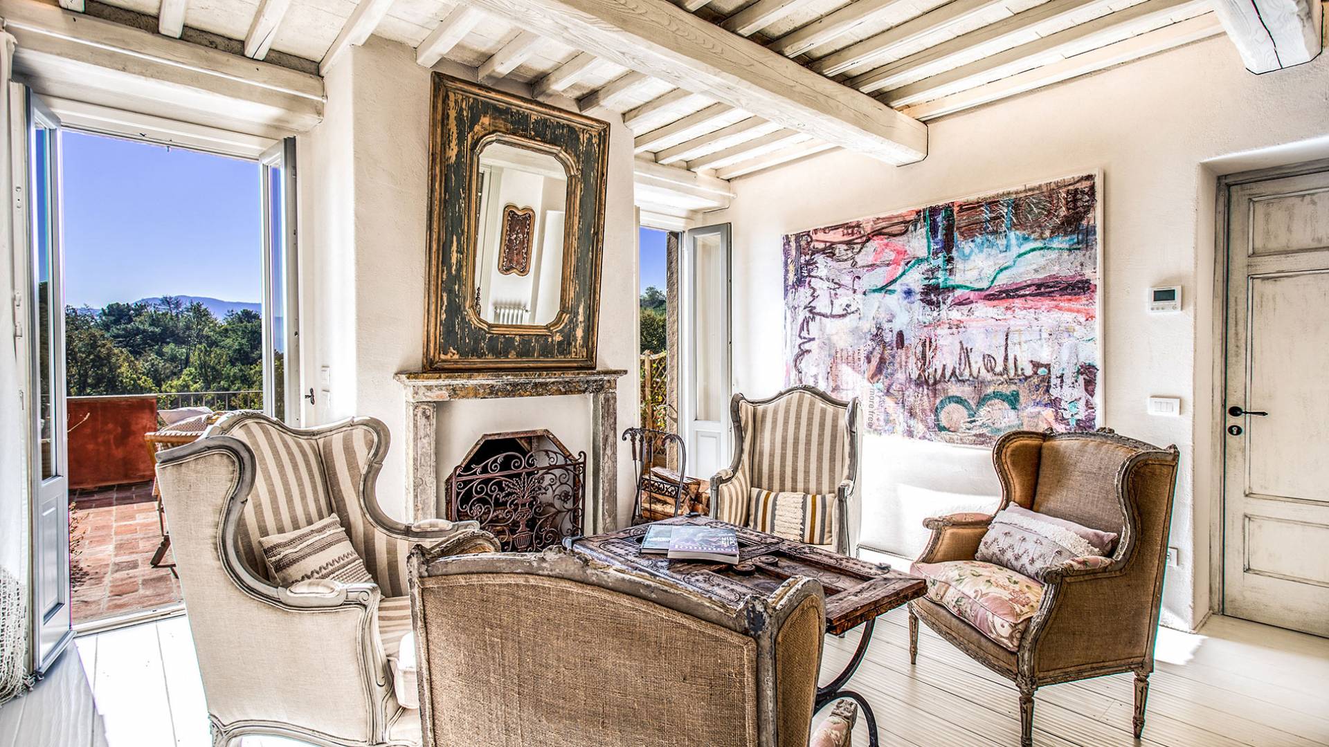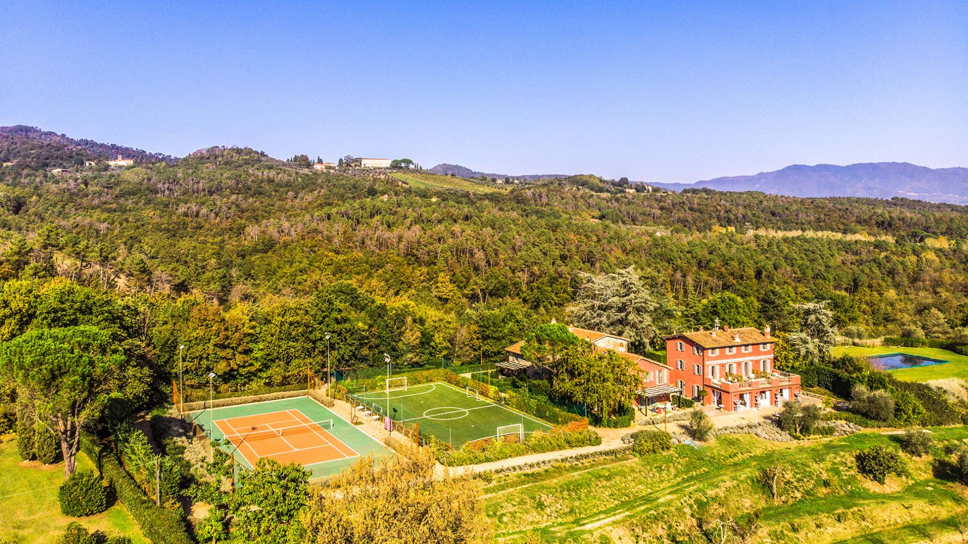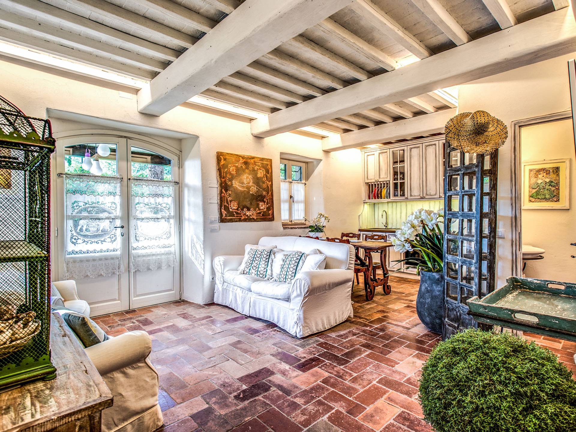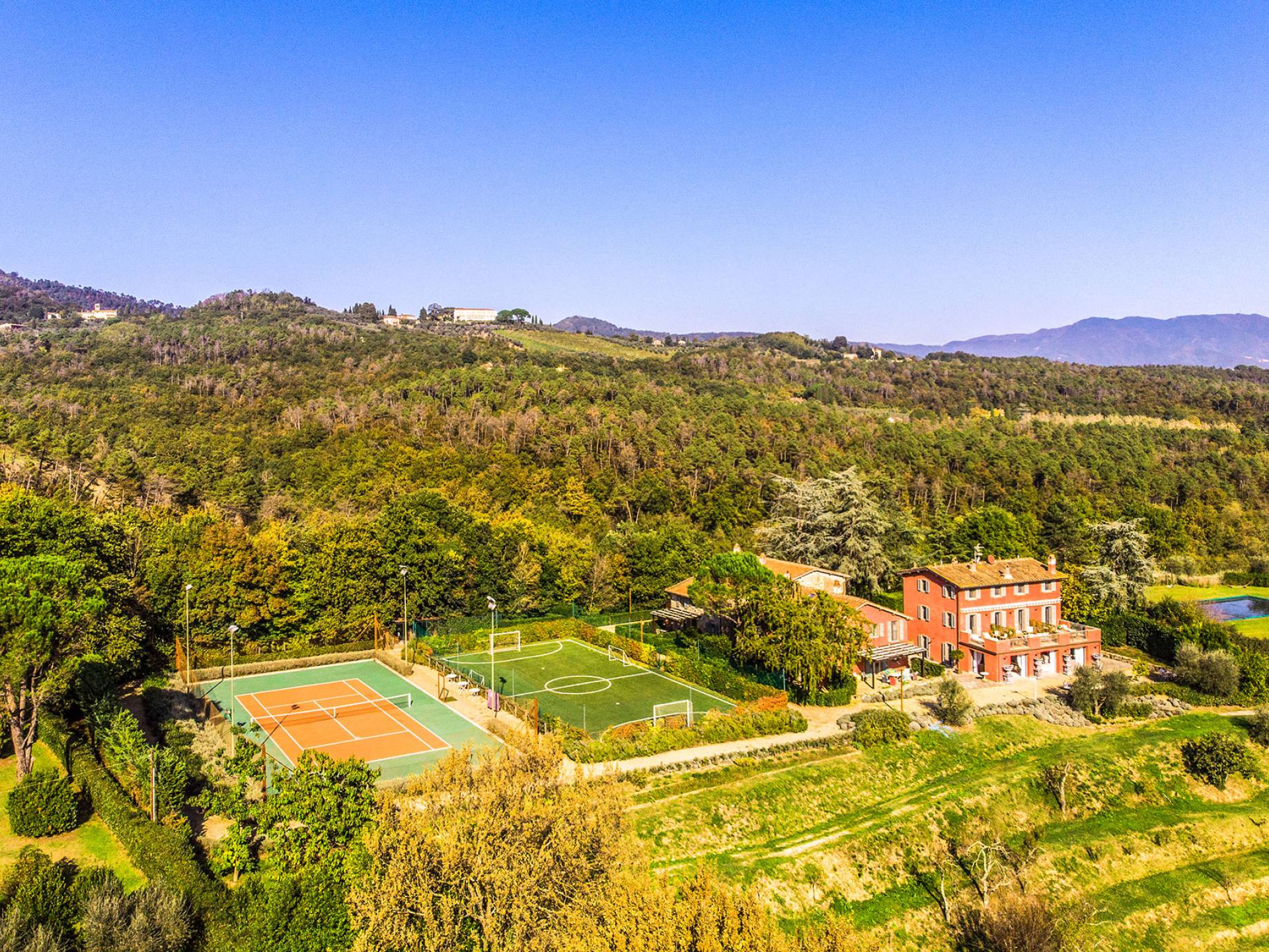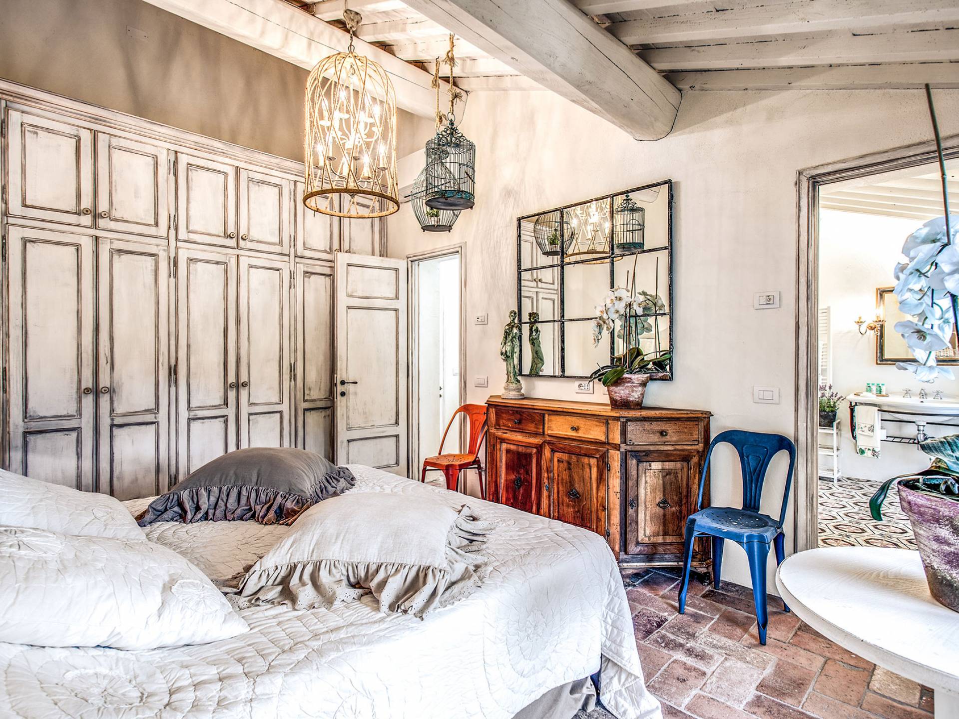 It is decorated in new-classic style with washed walls in pale shades, pietra serena and Italian wood. Countrymodern, the bohemian aesthetic of the property reflects its light and welcoming vibe: fresh and vintage, it oozes tranquillity and a home-like feeling which was exactly the intention of the owners, a couple of young artists and entrepreneurs dividing their time between Lucca, Forte dei Marmi, Ibiza and Geneva. The style encompasses traditional elements brought into the now with updated add-on’s for today’s lifestyles, offering a tennis court, a soccer field, a helipad, a pizza woodenoven and a security system with controlled circuit. Environmentally friendly and ecorestored, it also features a twenty metres heated swimming pool with view on the estate vineyards.