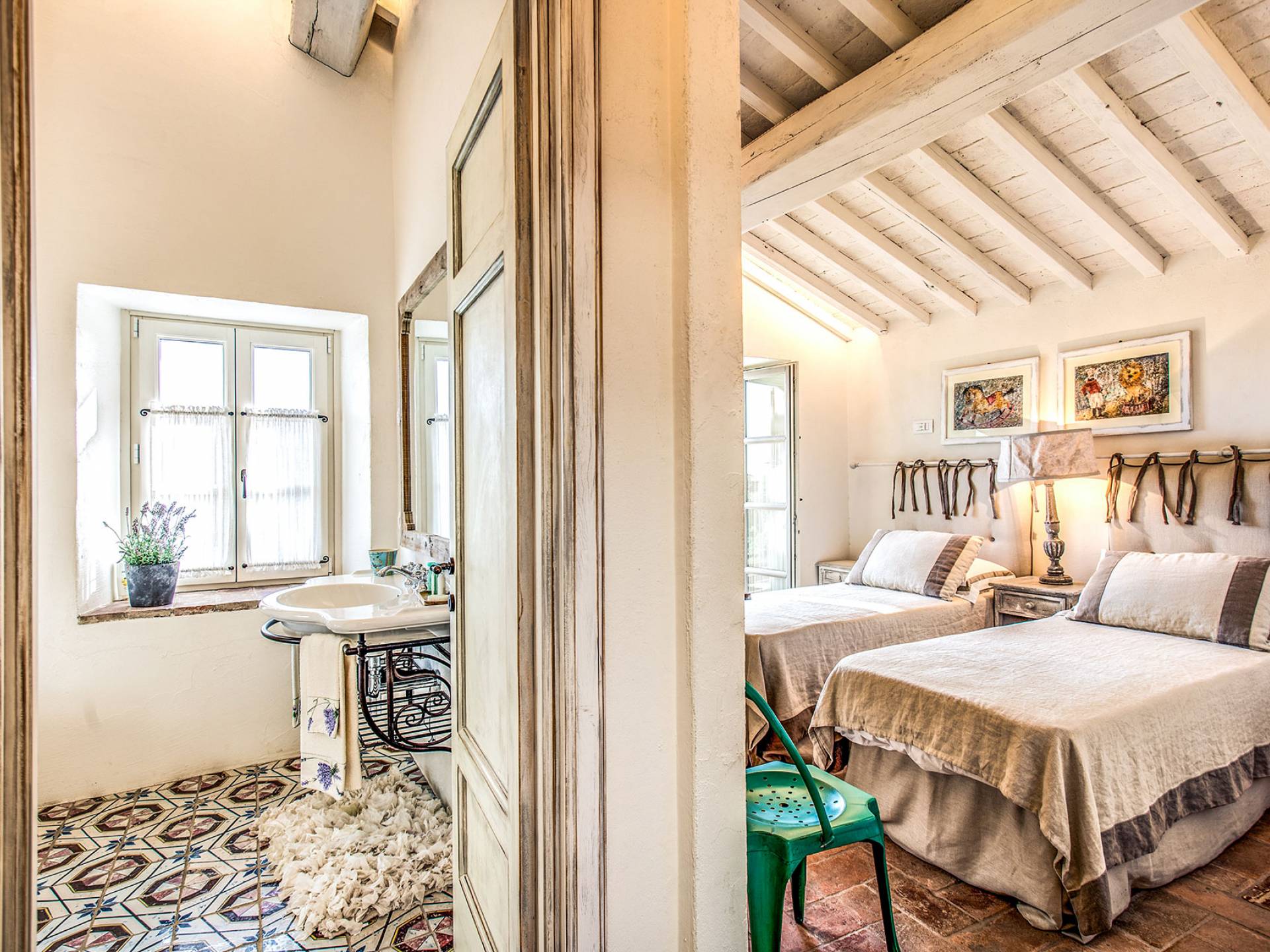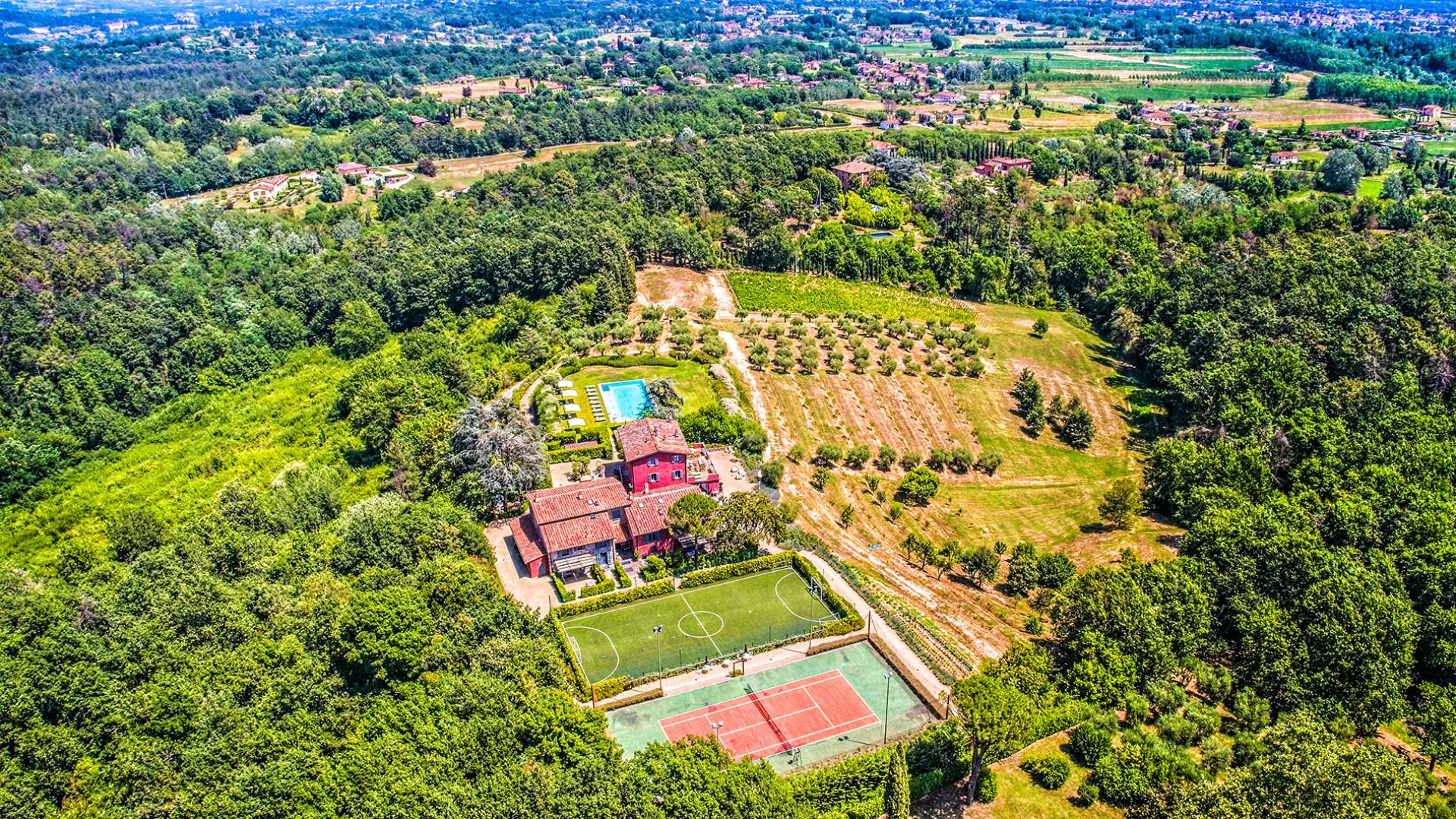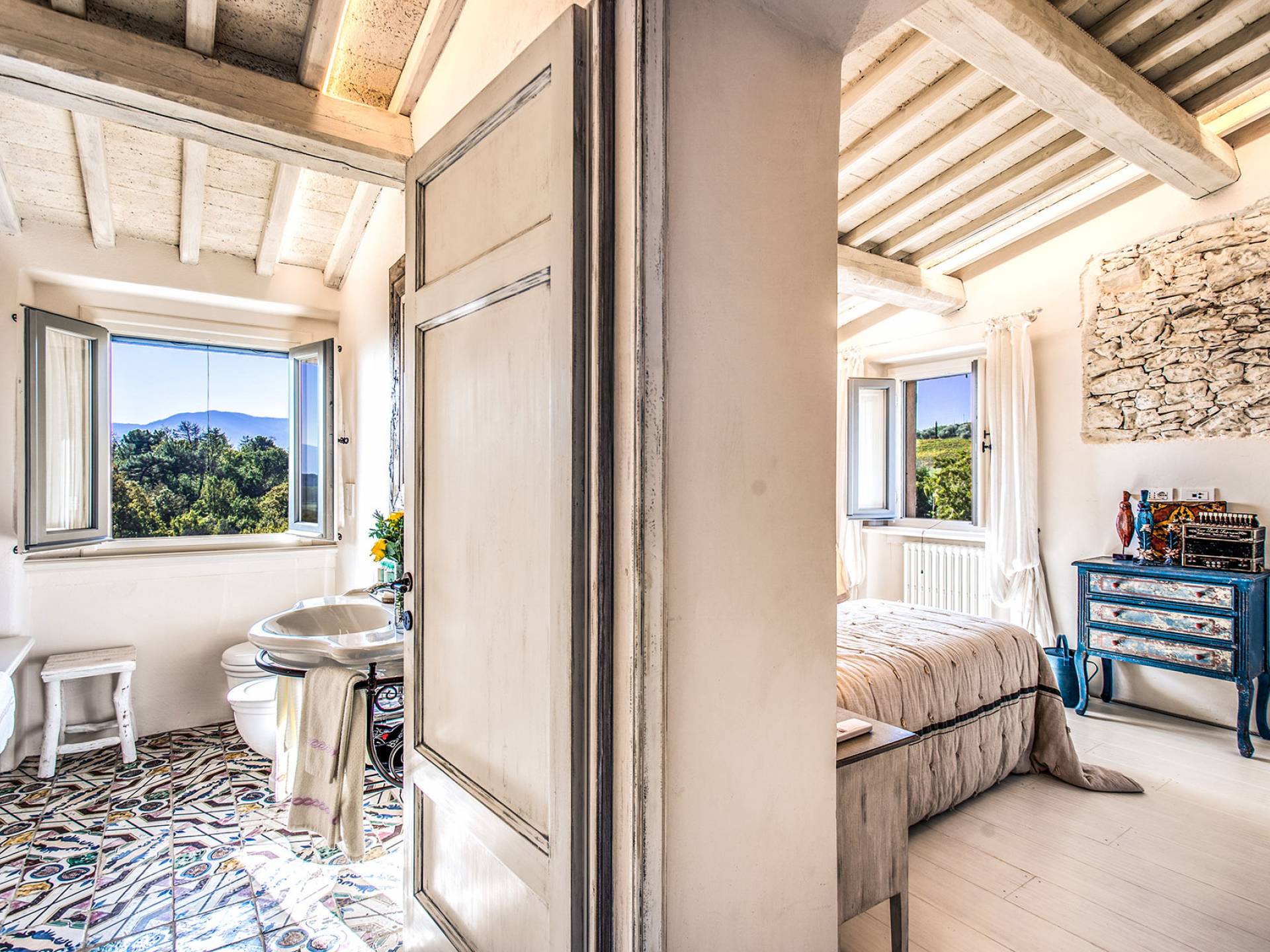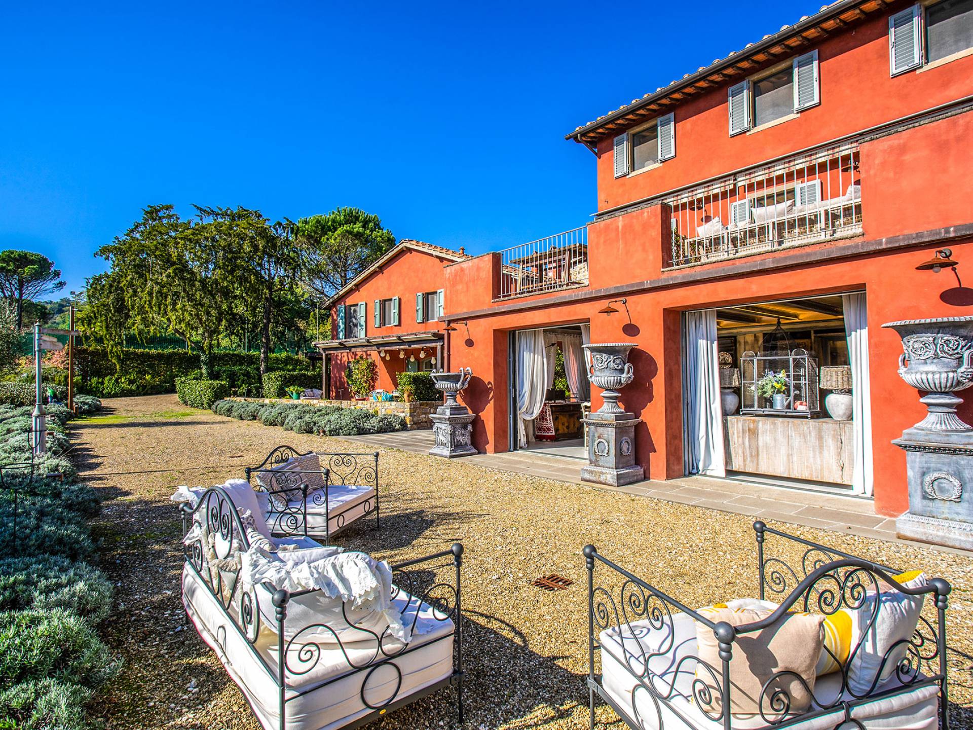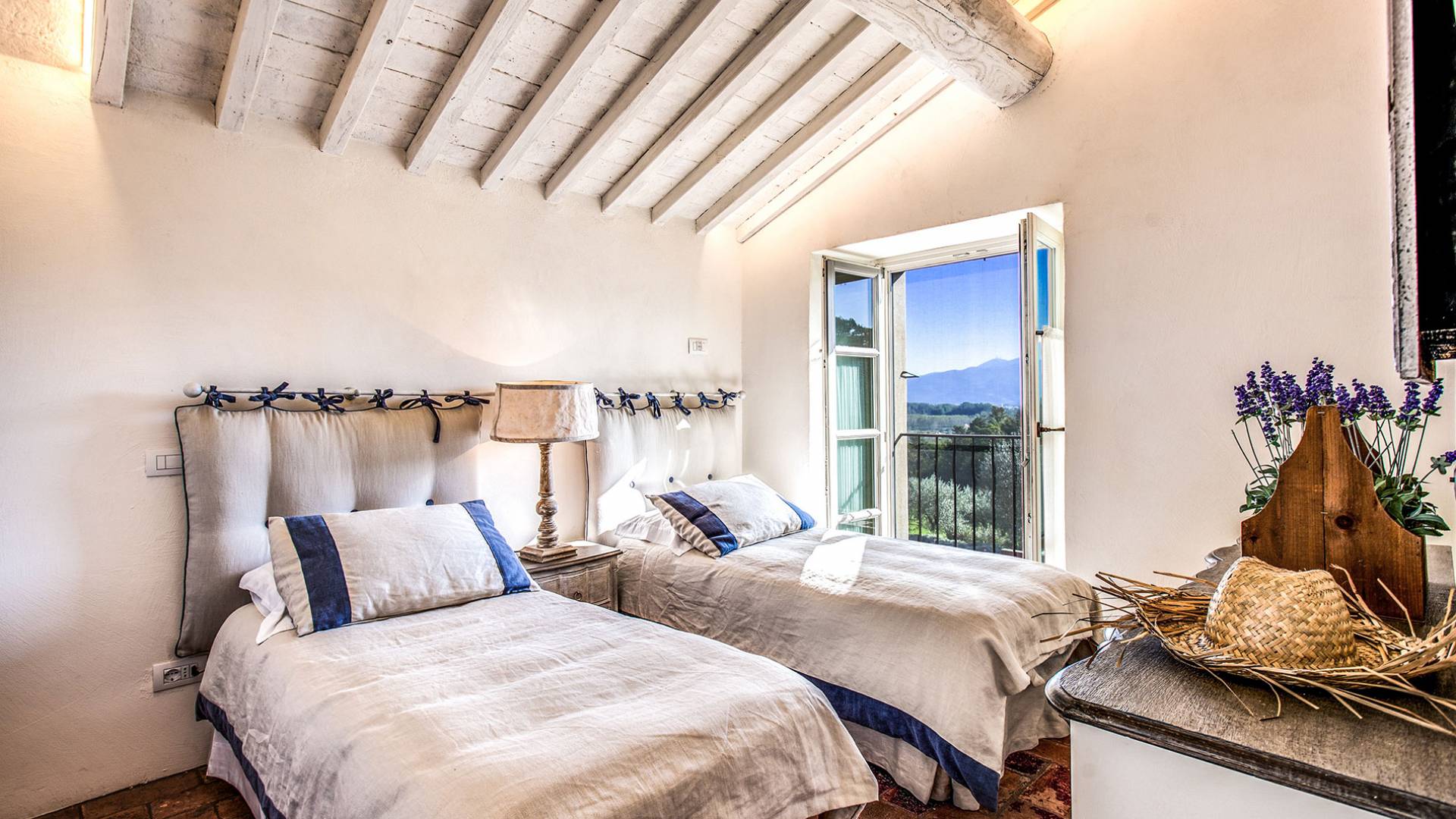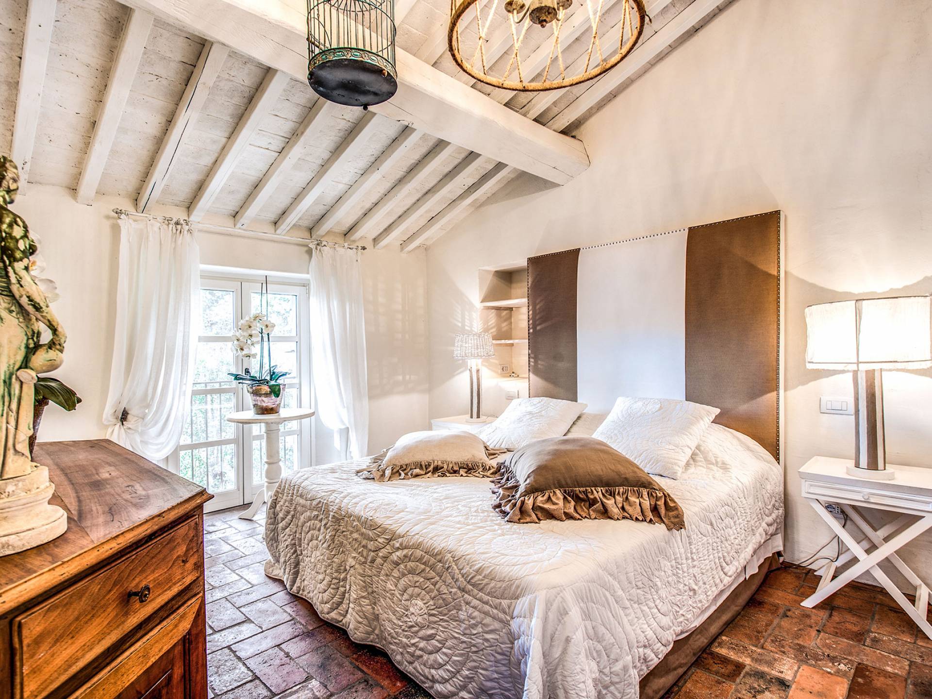 It is decorated in new-classic style with washed walls in pale shades, pietra serena and Italian wood. Countrymodern, the bohemian aesthetic of the property reflects its light and welcoming vibe: fresh and vintage, it oozes tranquillity and a home-like feeling which was exactly the intention of the owners, a couple of young artists and entrepreneurs dividing their time between Lucca, Forte dei Marmi, Ibiza and Geneva. The style encompasses traditional elements brought into the now with updated add-on’s for today’s lifestyles, offering a tennis court, a soccer field, a helipad, a pizza woodenoven and a security system with controlled circuit. Environmentally friendly and ecorestored, it also features a twenty metres heated swimming pool with view on the estate vineyards.