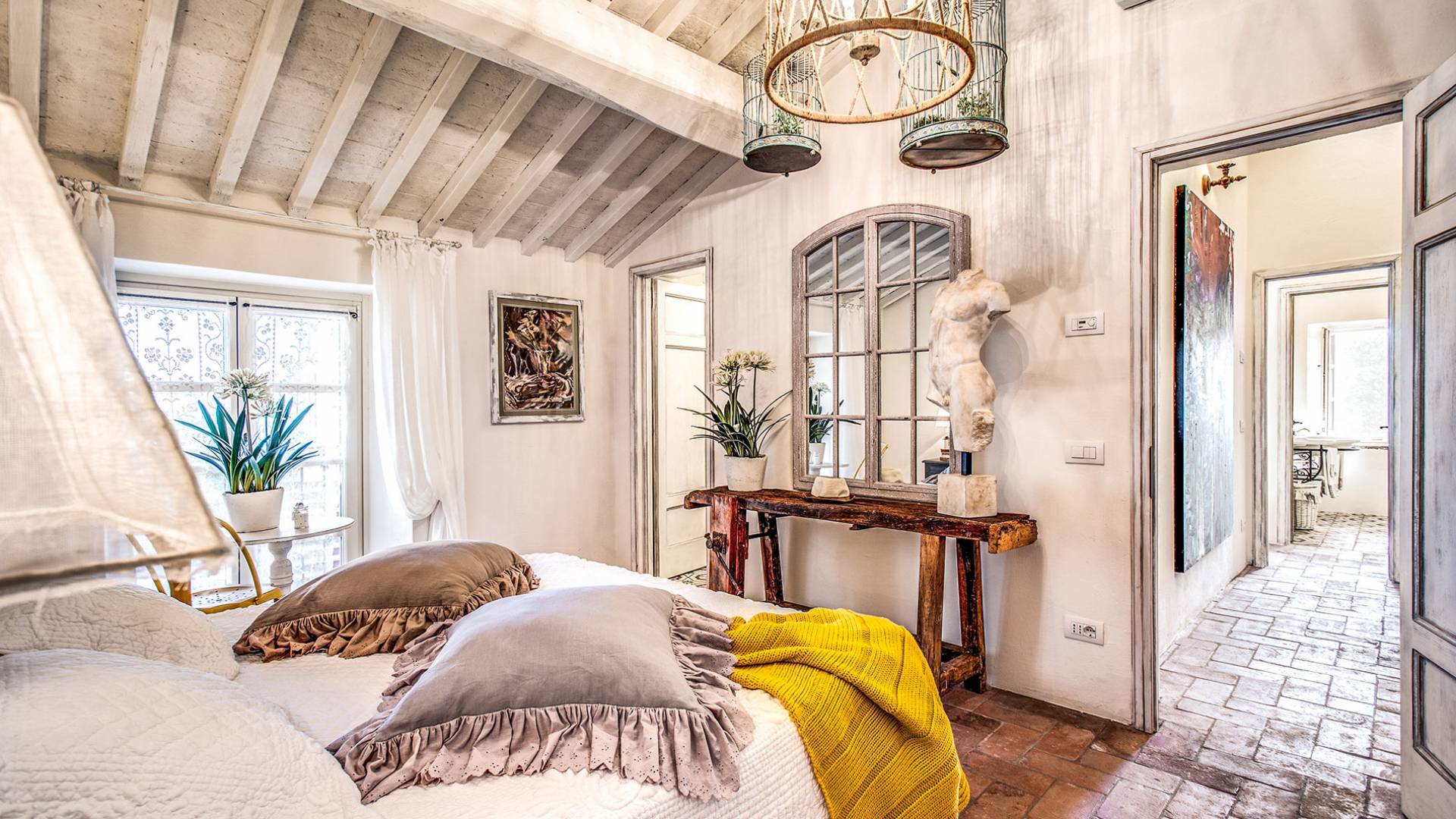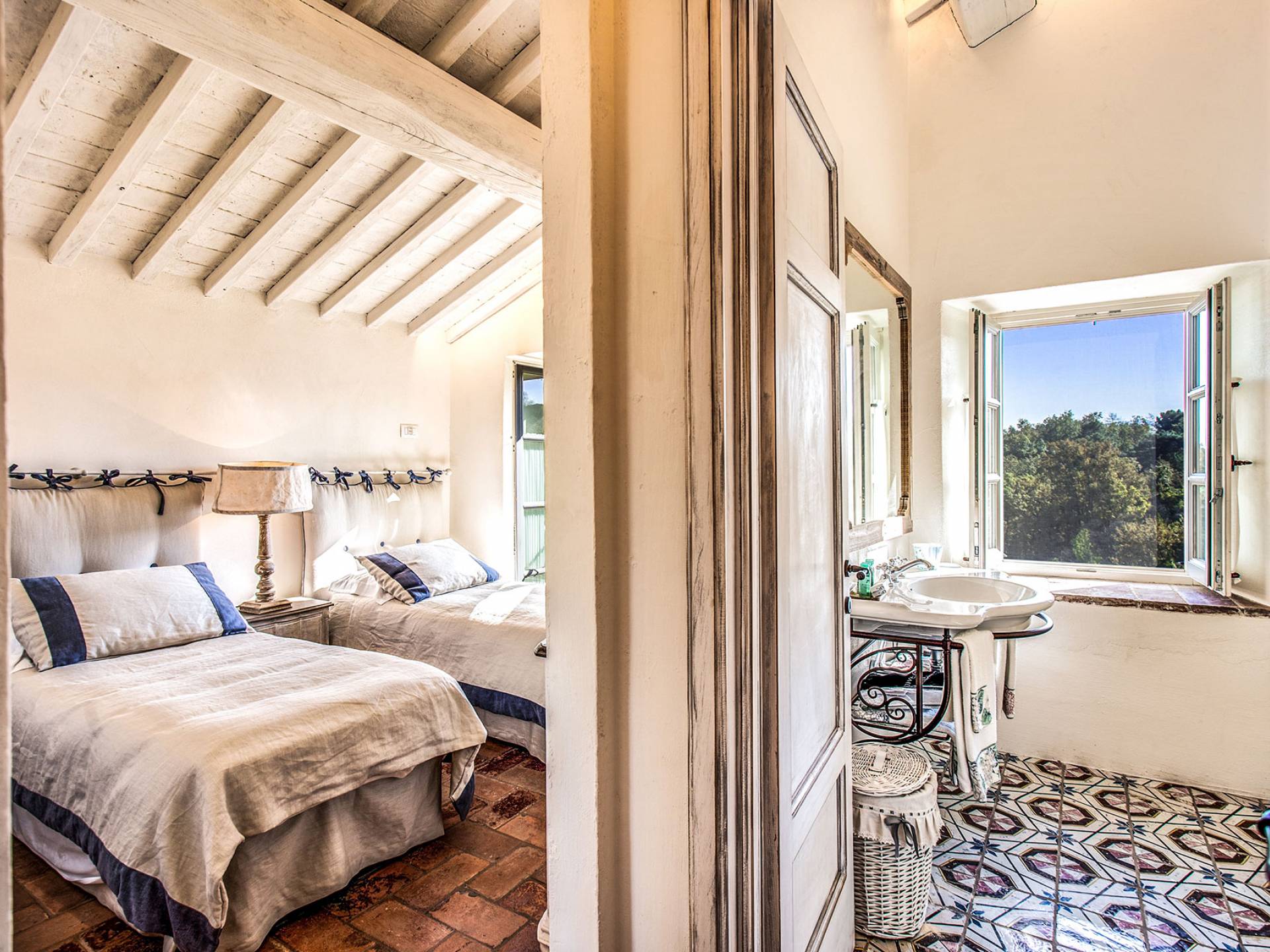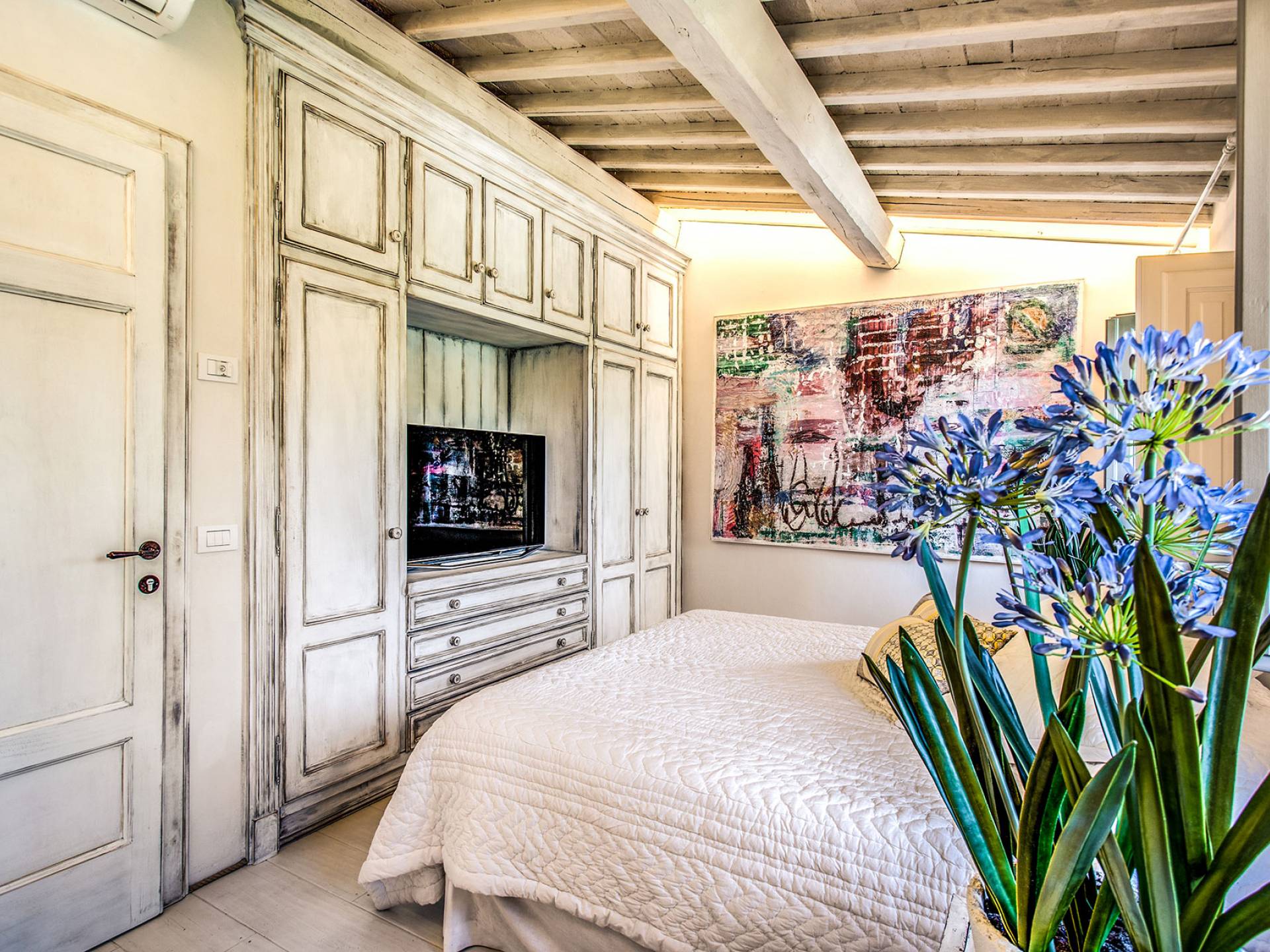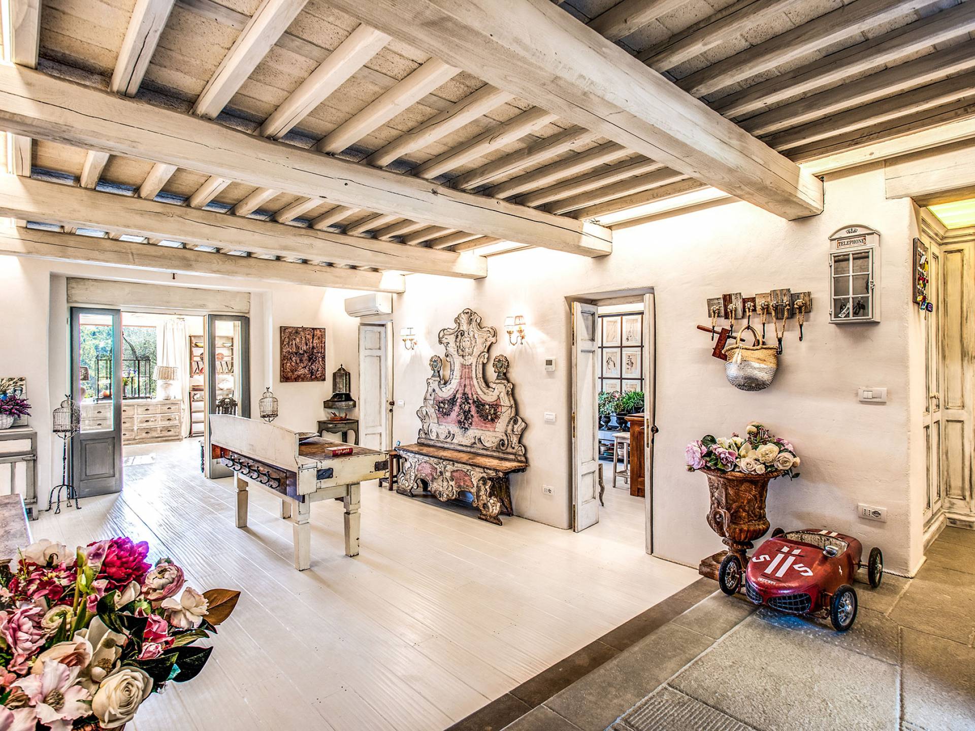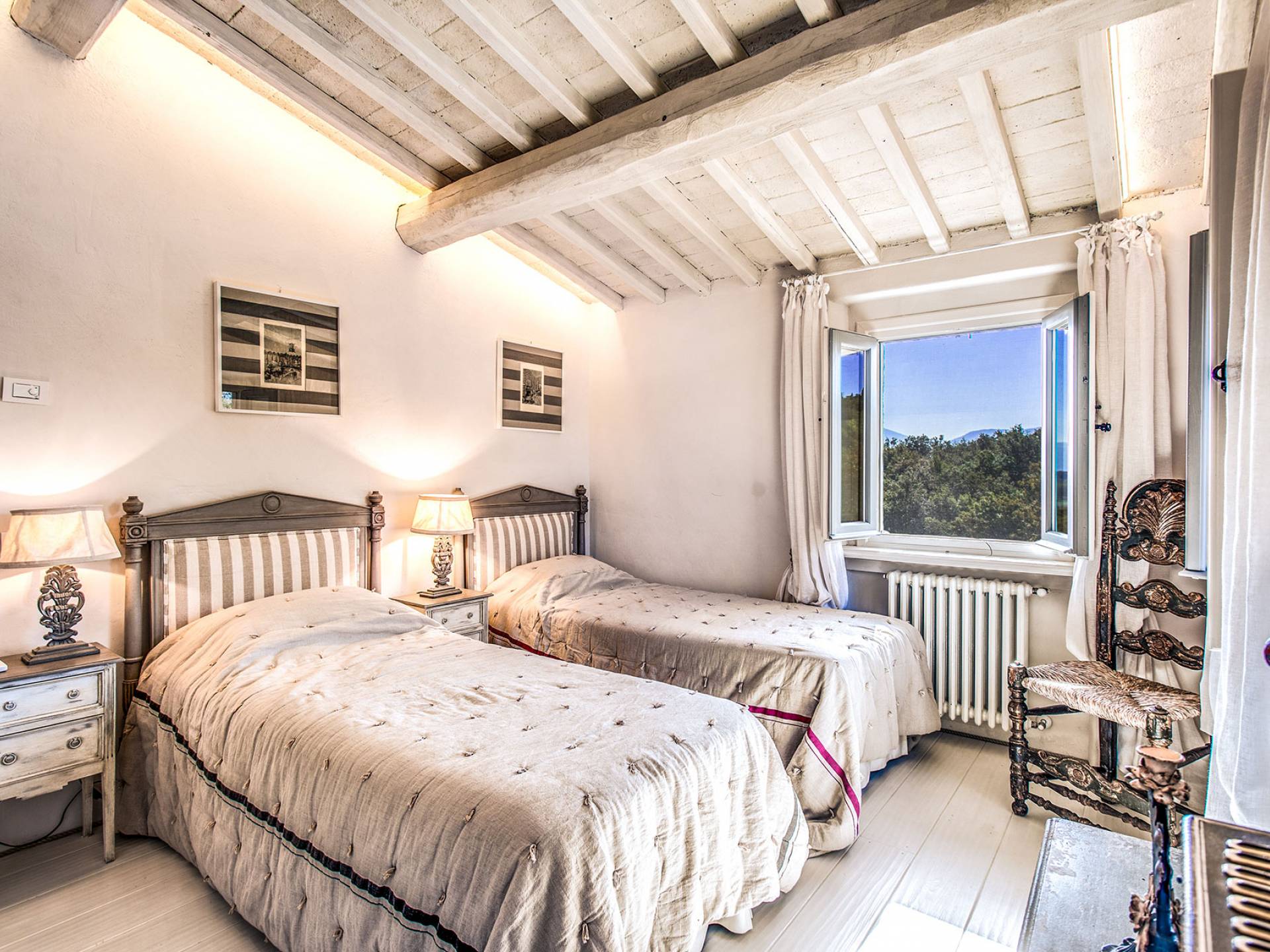 It is decorated in new-classic style with washed walls in pale shades, pietra serena and Italian wood. Countrymodern, the bohemian aesthetic of the property reflects its light and welcoming vibe: fresh and vintage, it oozes tranquillity and a home-like feeling which was exactly the intention of the owners, a couple of young artists and entrepreneurs dividing their time between Lucca, Forte dei Marmi, Ibiza and Geneva. The style encompasses traditional elements brought into the now with updated add-on’s for today’s lifestyles, offering a tennis court, a soccer field, a helipad, a pizza woodenoven and a security system with controlled circuit. Environmentally friendly and ecorestored, it also features a twenty metres heated swimming pool with view on the estate vineyards.