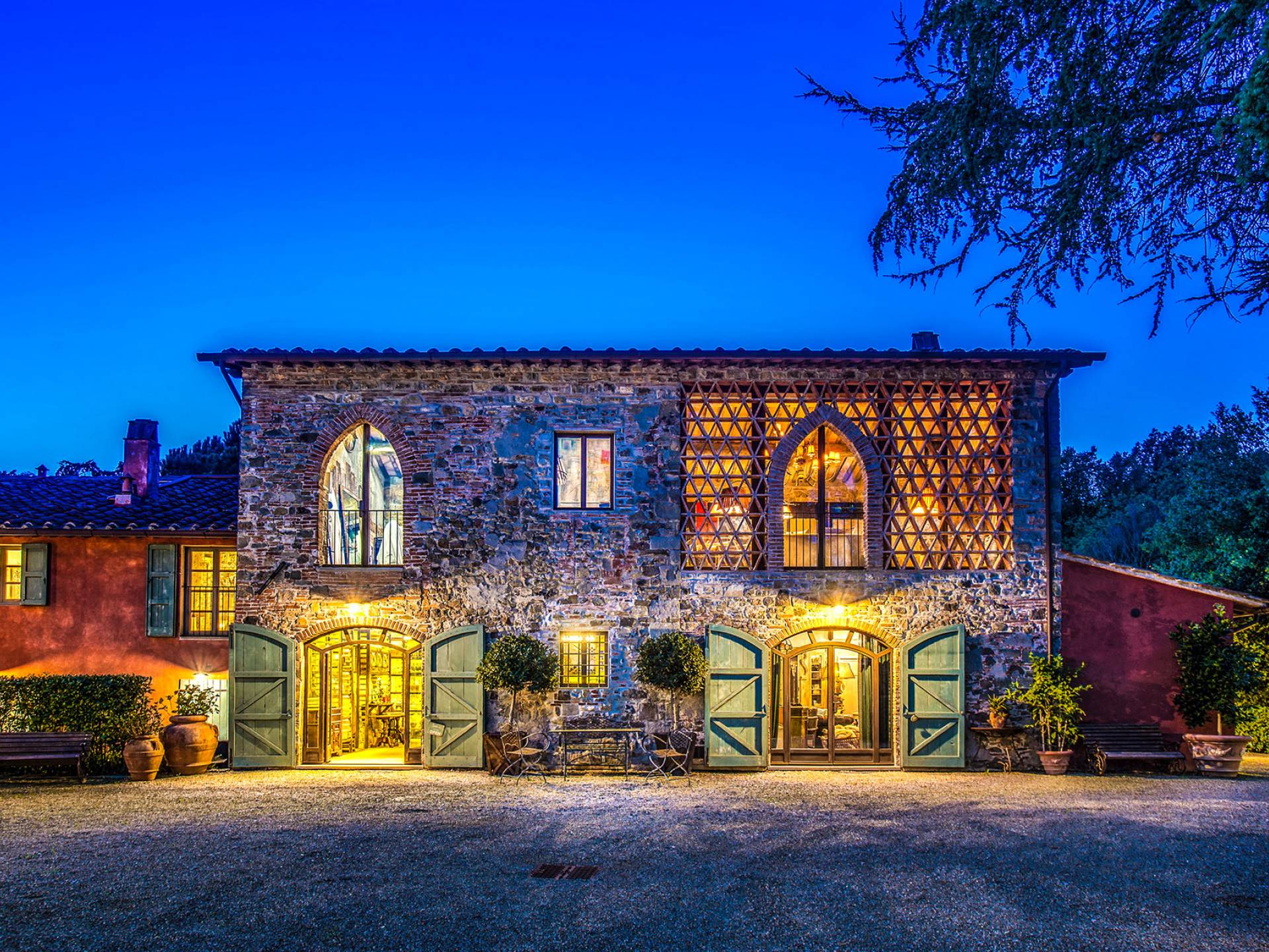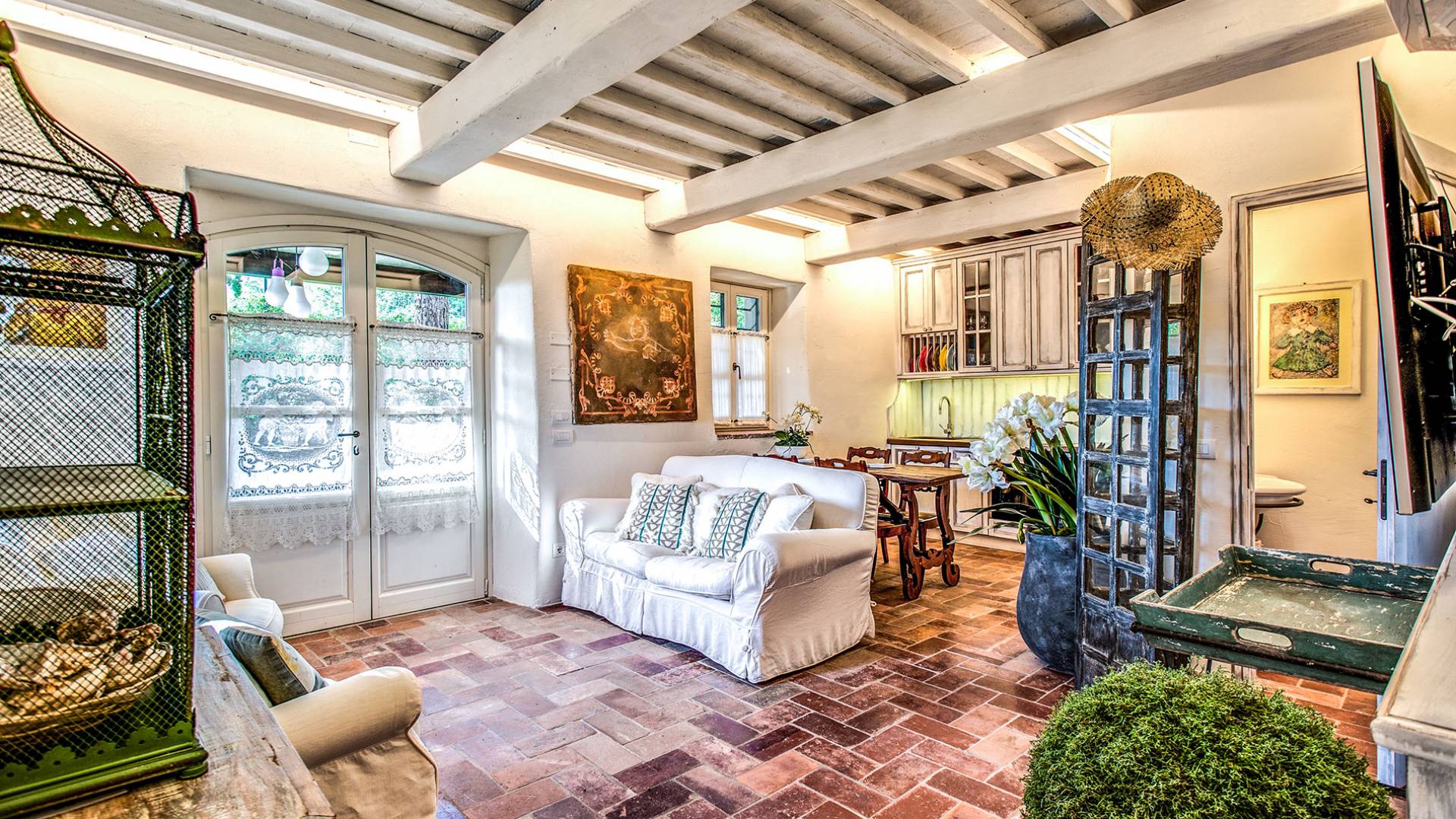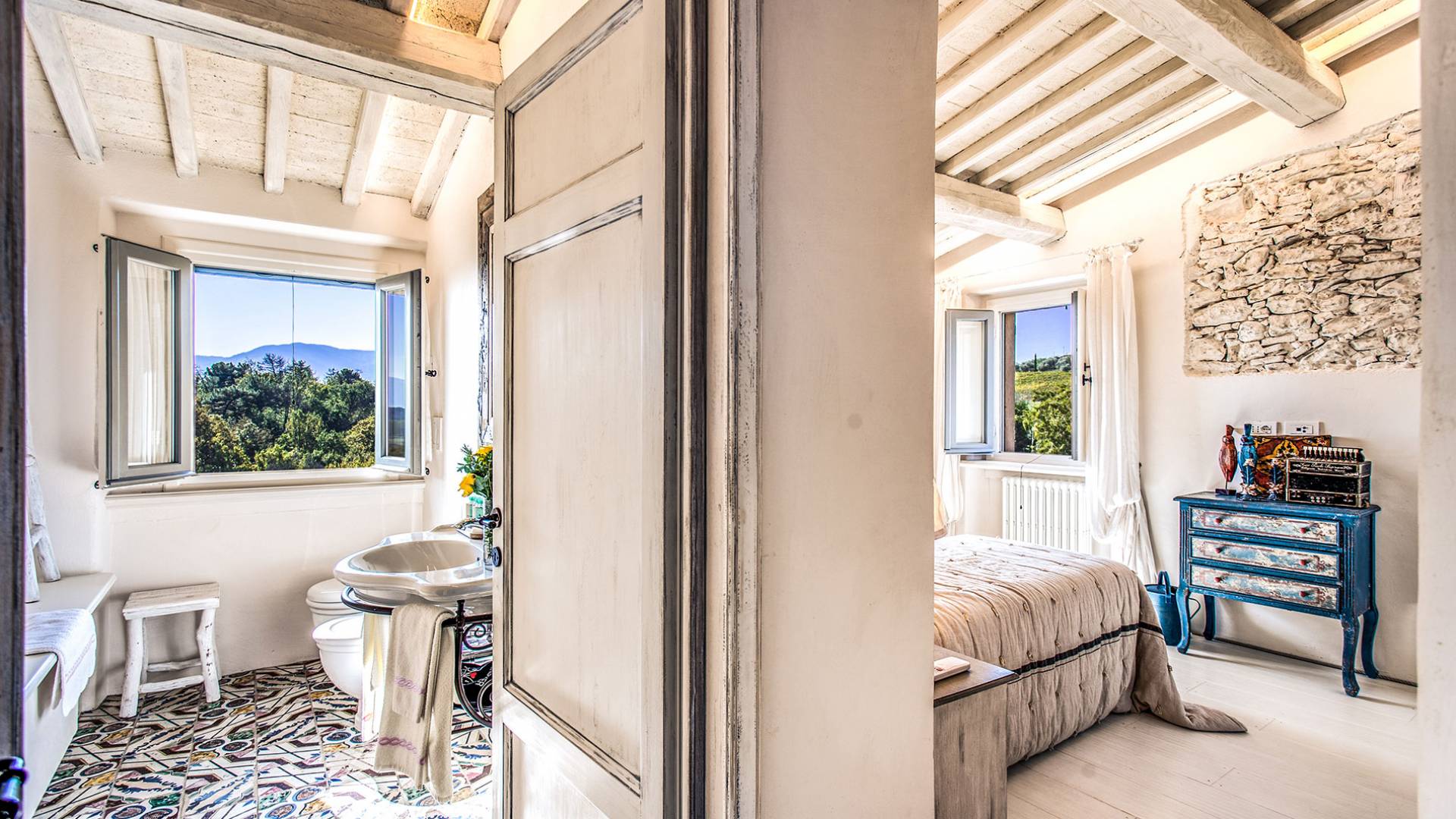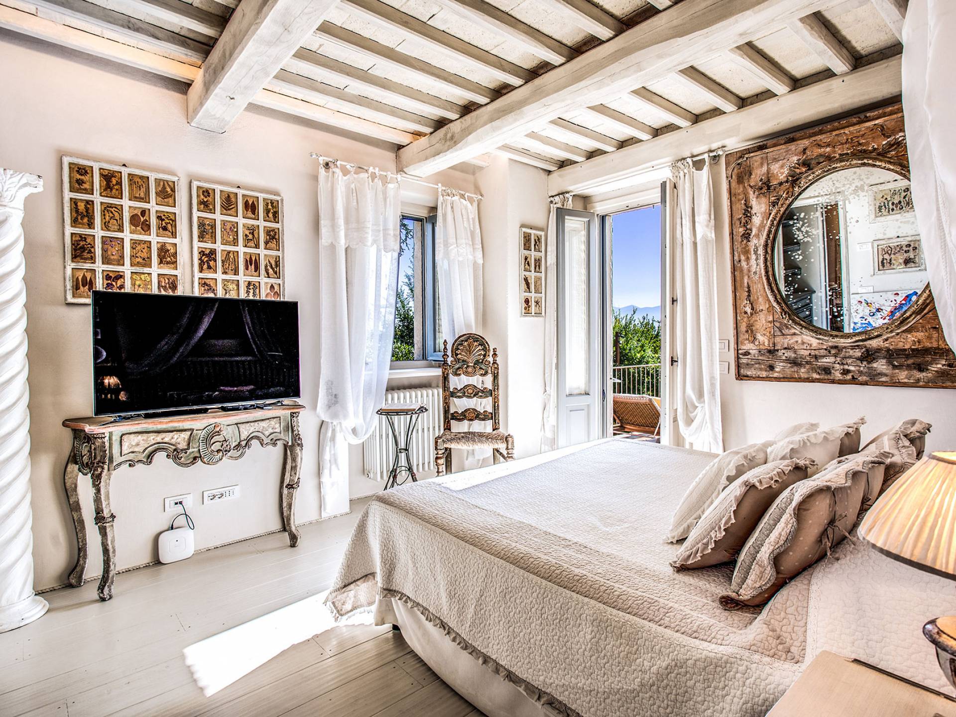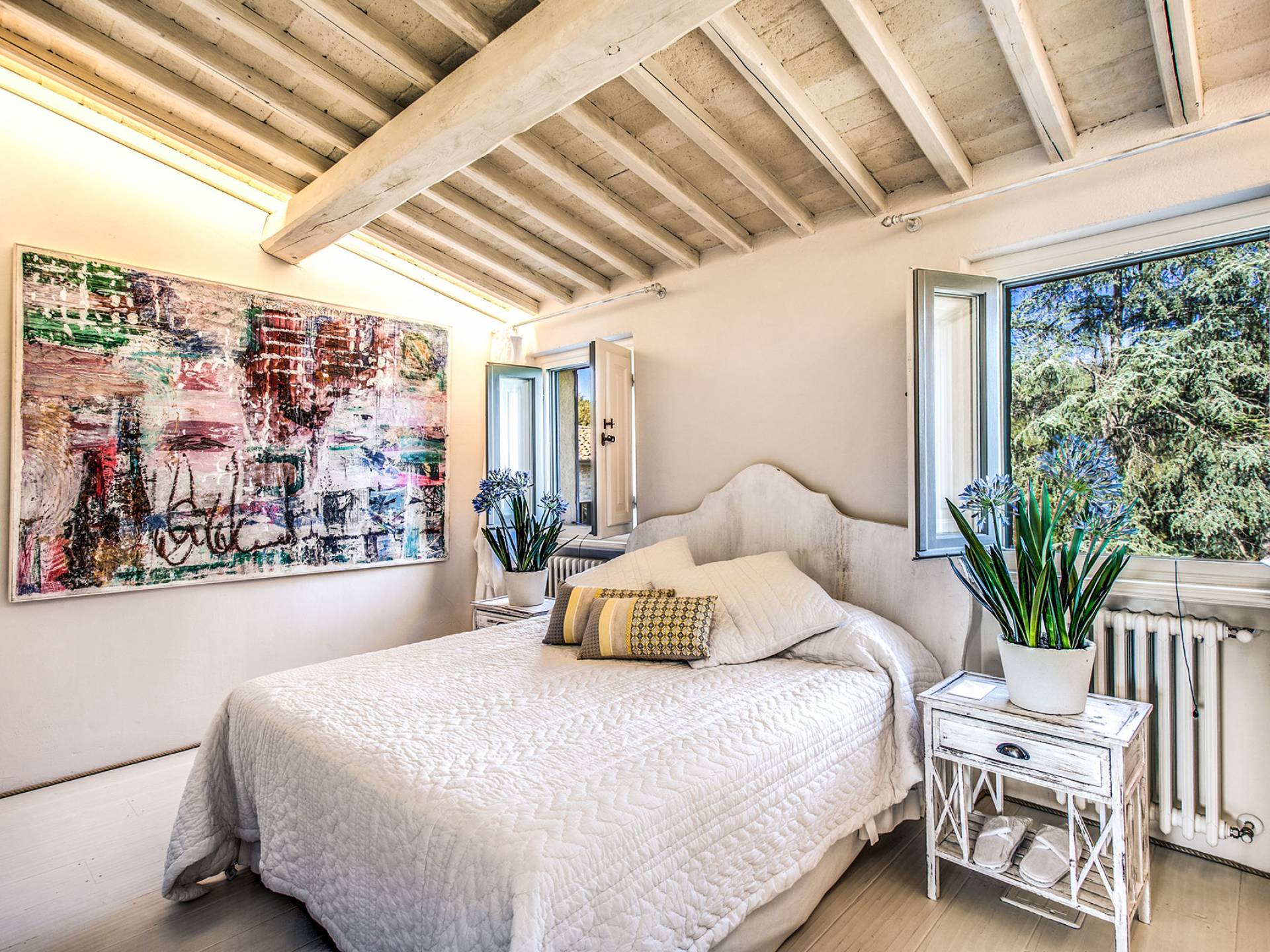 It is decorated in new-classic style with washed walls in pale shades, pietra serena and Italian wood. Countrymodern, the bohemian aesthetic of the property reflects its light and welcoming vibe: fresh and vintage, it oozes tranquillity and a home-like feeling which was exactly the intention of the owners, a couple of young artists and entrepreneurs dividing their time between Lucca, Forte dei Marmi, Ibiza and Geneva. The style encompasses traditional elements brought into the now with updated add-on’s for today’s lifestyles, offering a tennis court, a soccer field, a helipad, a pizza woodenoven and a security system with controlled circuit. Environmentally friendly and ecorestored, it also features a twenty metres heated swimming pool with view on the estate vineyards.