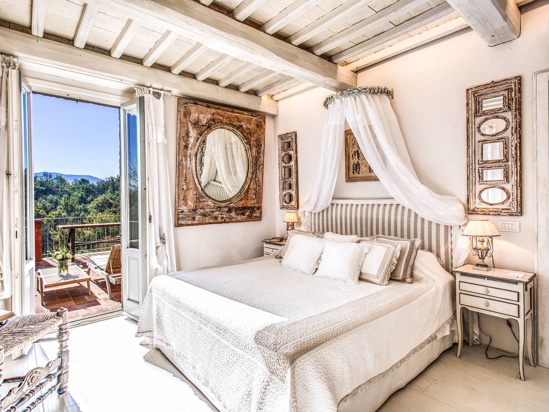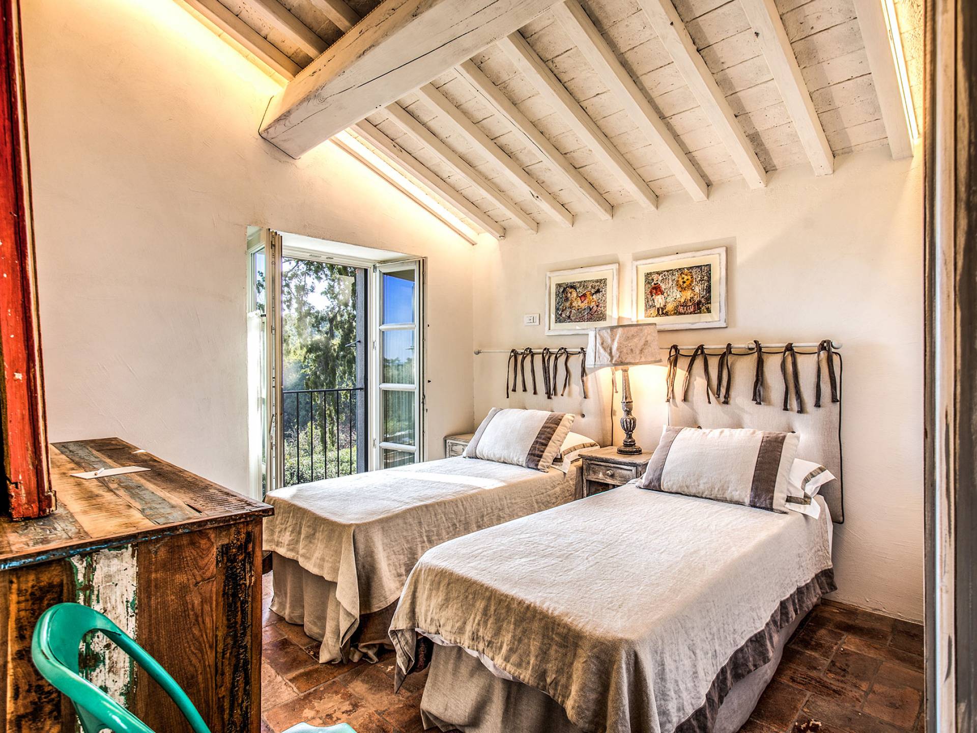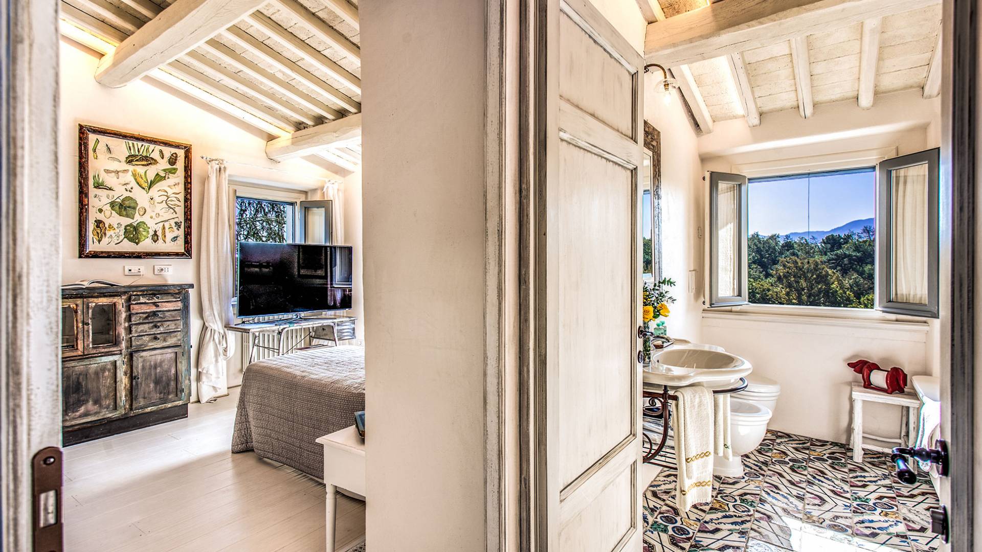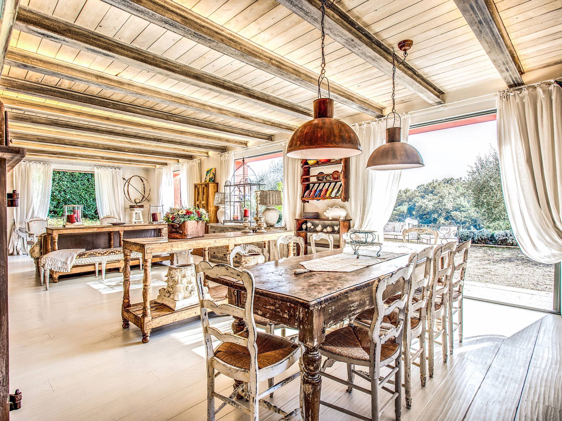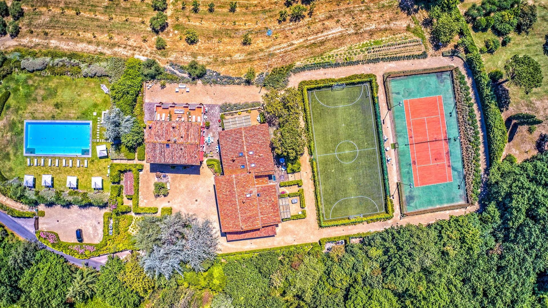 It is decorated in new-classic style with washed walls in pale shades, pietra serena and Italian wood. Countrymodern, the bohemian aesthetic of the property reflects its light and welcoming vibe: fresh and vintage, it oozes tranquillity and a home-like feeling which was exactly the intention of the owners, a couple of young artists and entrepreneurs dividing their time between Lucca, Forte dei Marmi, Ibiza and Geneva. The style encompasses traditional elements brought into the now with updated add-on’s for today’s lifestyles, offering a tennis court, a soccer field, a helipad, a pizza woodenoven and a security system with controlled circuit. Environmentally friendly and ecorestored, it also features a twenty metres heated swimming pool with view on the estate vineyards.