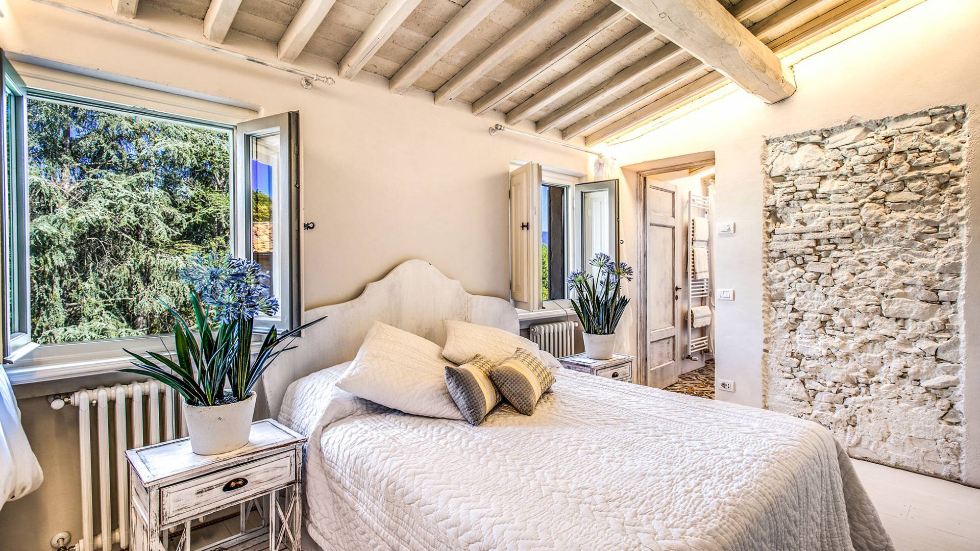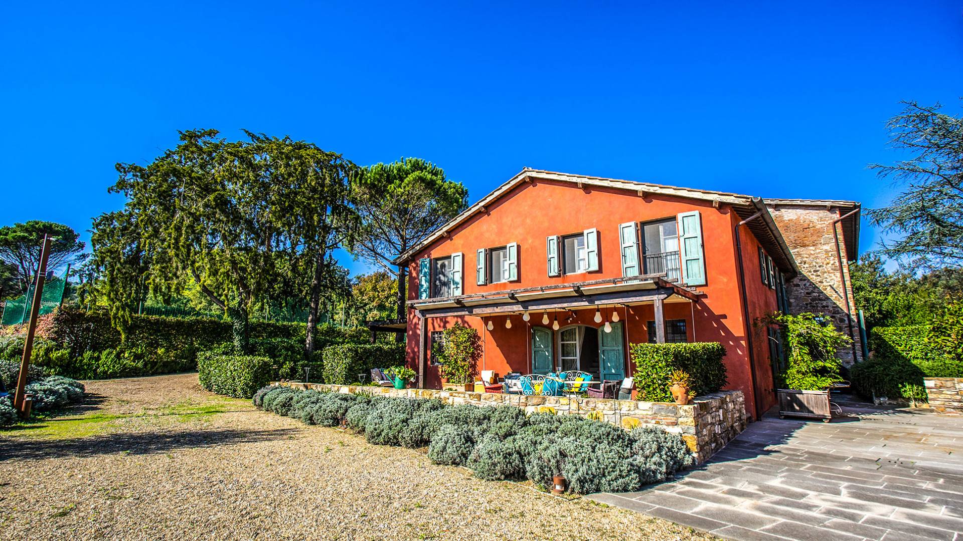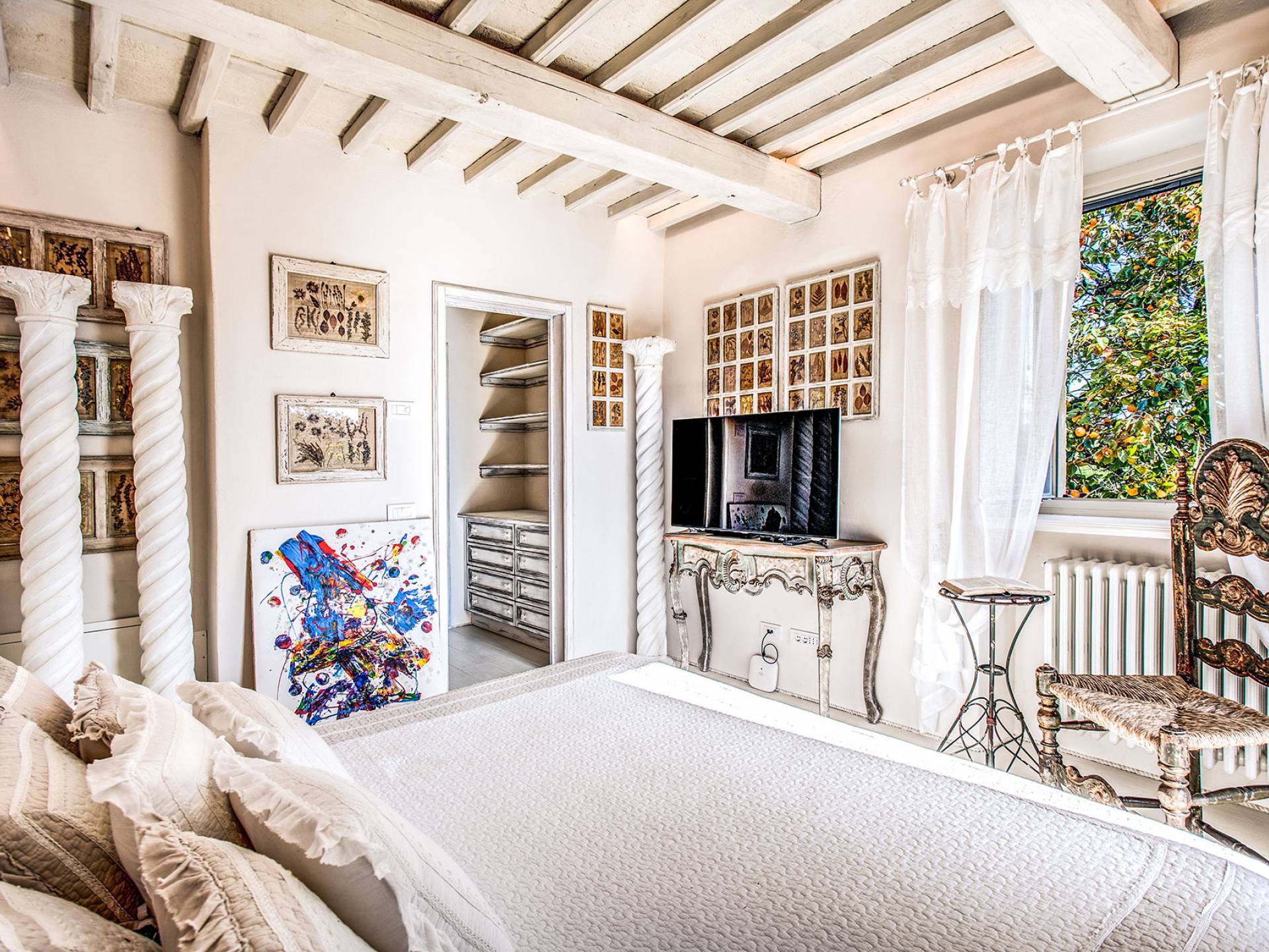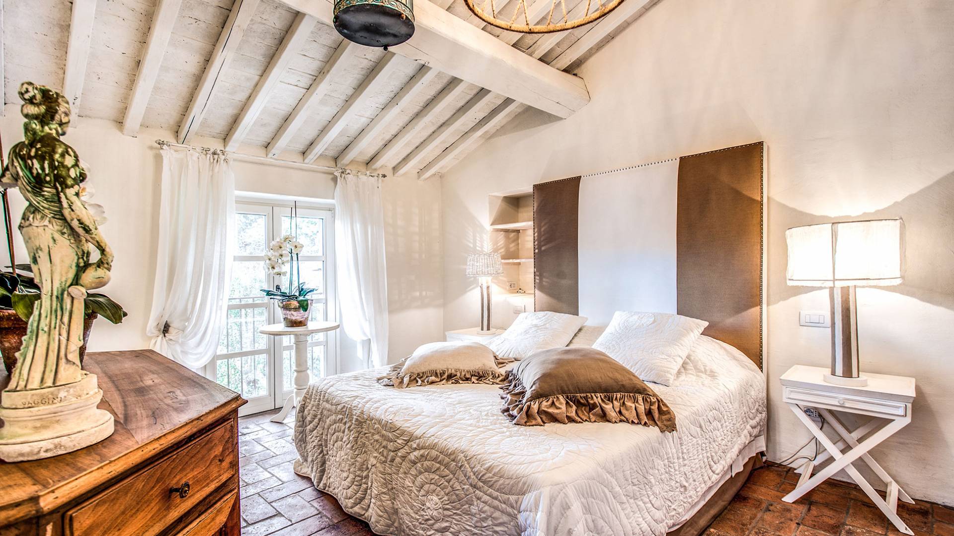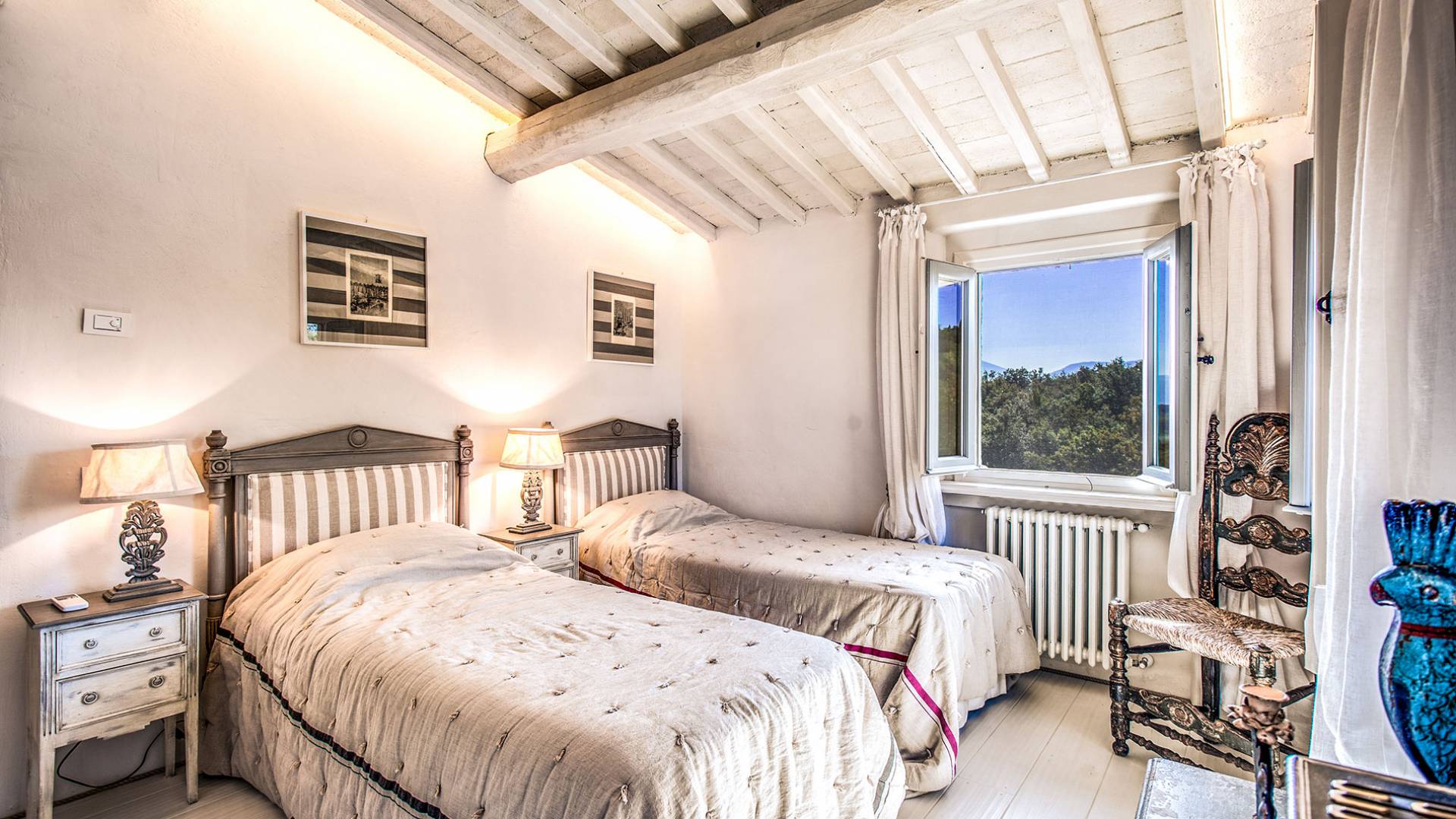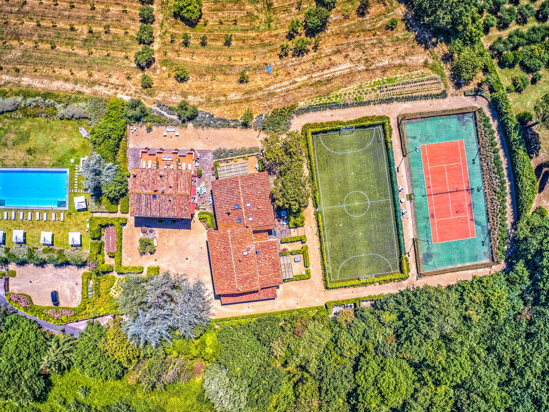 It is decorated in new-classic style with washed walls in pale shades, pietra serena and Italian wood. Countrymodern, the bohemian aesthetic of the property reflects its light and welcoming vibe: fresh and vintage, it oozes tranquillity and a home-like feeling which was exactly the intention of the owners, a couple of young artists and entrepreneurs dividing their time between Lucca, Forte dei Marmi, Ibiza and Geneva. The style encompasses traditional elements brought into the now with updated add-on’s for today’s lifestyles, offering a tennis court, a soccer field, a helipad, a pizza woodenoven and a security system with controlled circuit. Environmentally friendly and ecorestored, it also features a twenty metres heated swimming pool with view on the estate vineyards.
