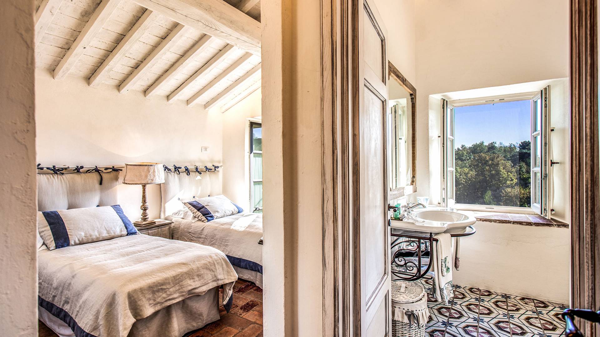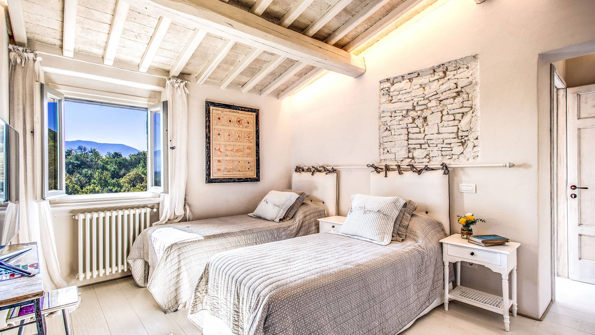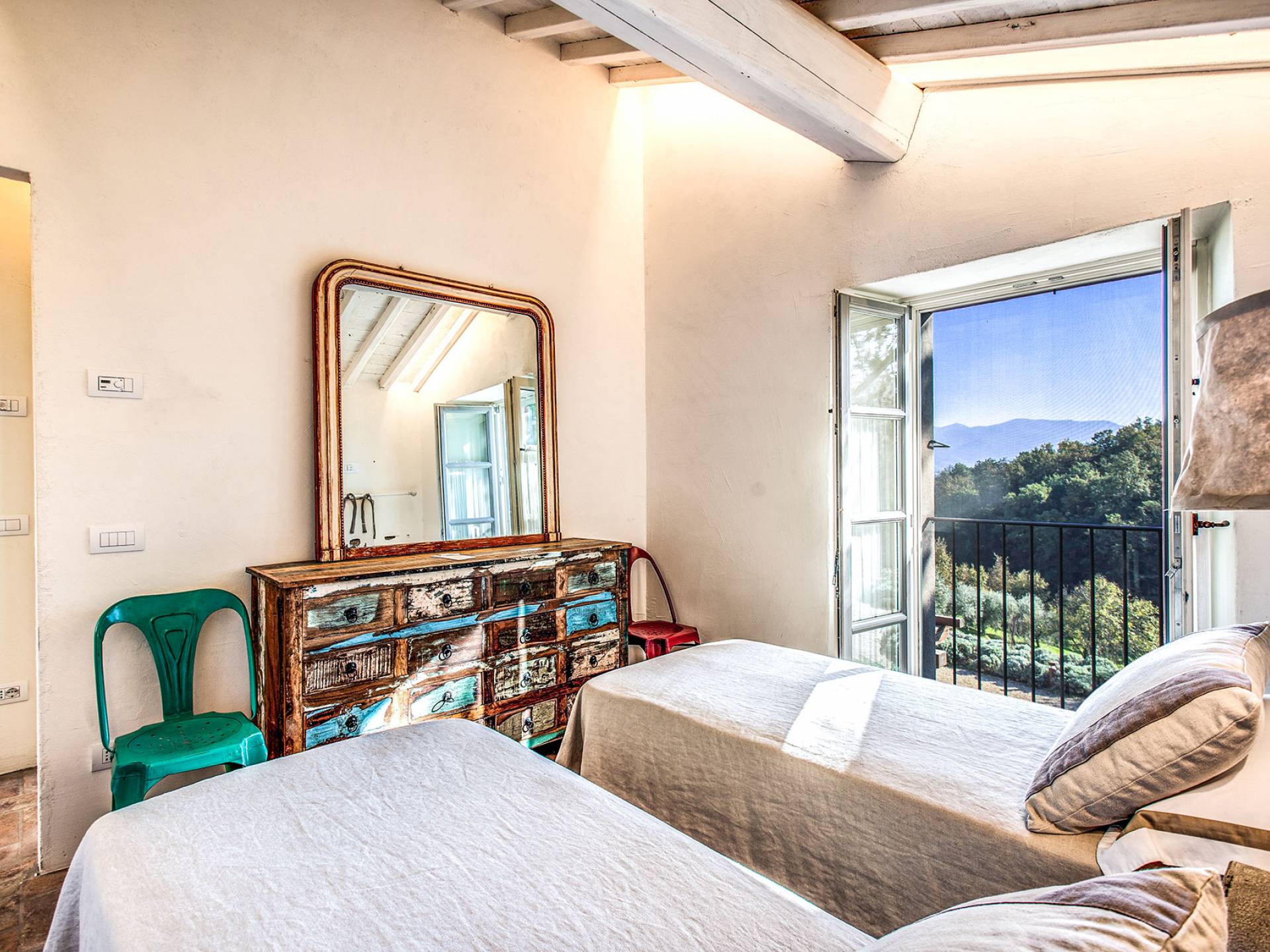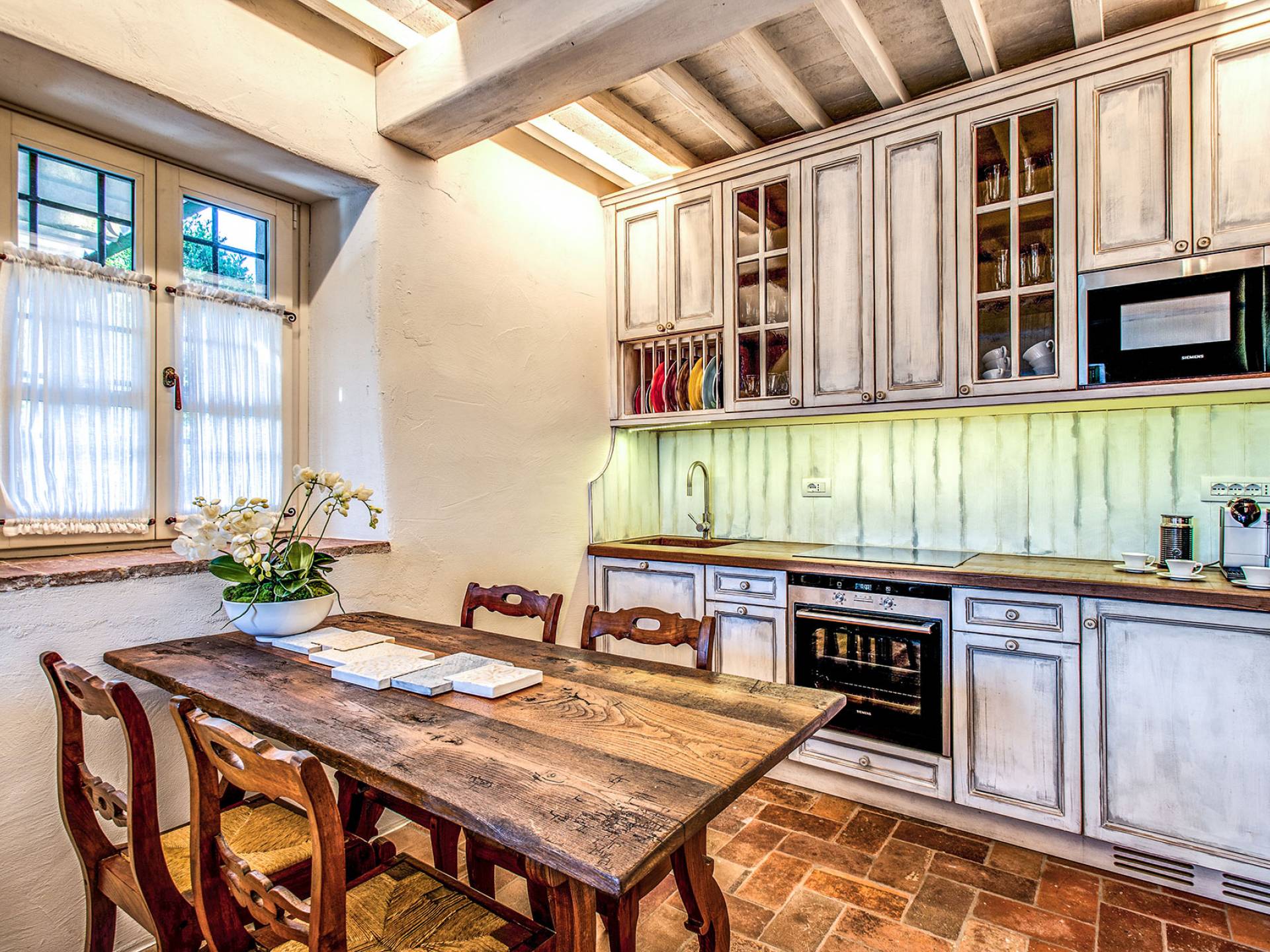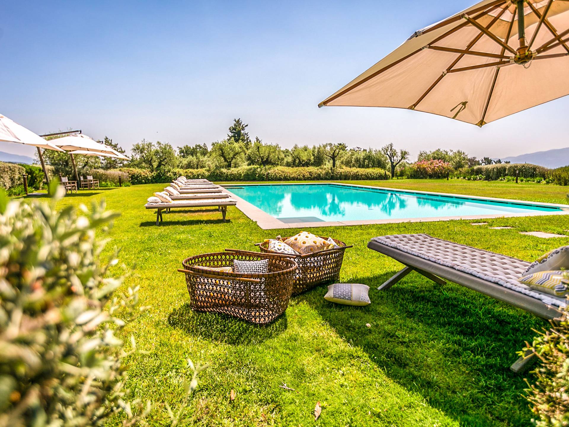 It is decorated in new-classic style with washed walls in pale shades, pietra serena and Italian wood. Countrymodern, the bohemian aesthetic of the property reflects its light and welcoming vibe: fresh and vintage, it oozes tranquillity and a home-like feeling which was exactly the intention of the owners, a couple of young artists and entrepreneurs dividing their time between Lucca, Forte dei Marmi, Ibiza and Geneva. The style encompasses traditional elements brought into the now with updated add-on’s for today’s lifestyles, offering a tennis court, a soccer field, a helipad, a pizza woodenoven and a security system with controlled circuit. Environmentally friendly and ecorestored, it also features a twenty metres heated swimming pool with view on the estate vineyards.