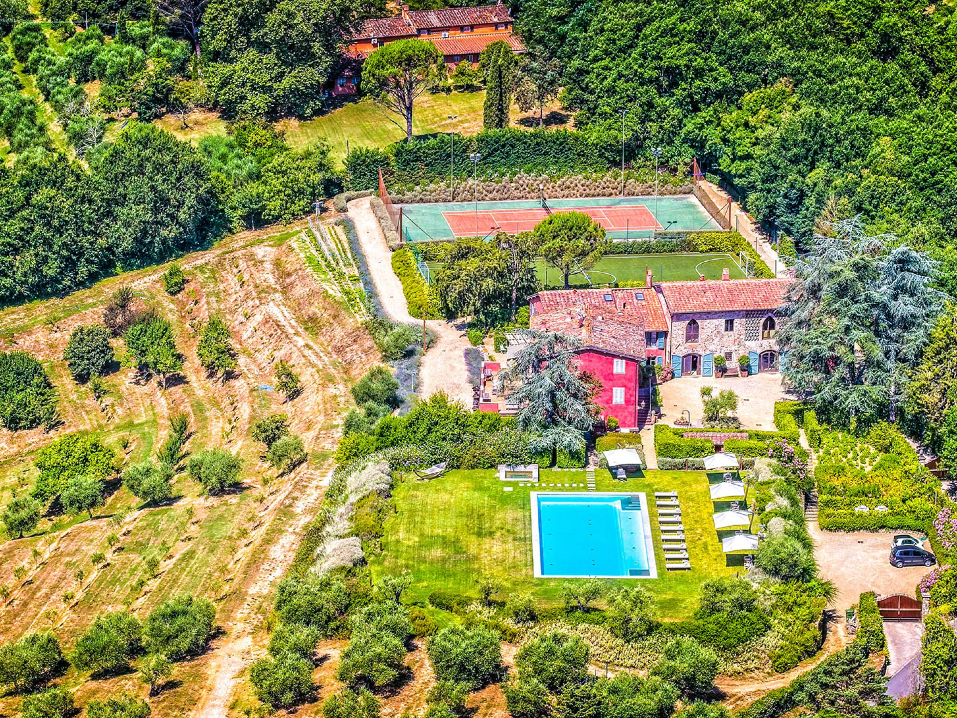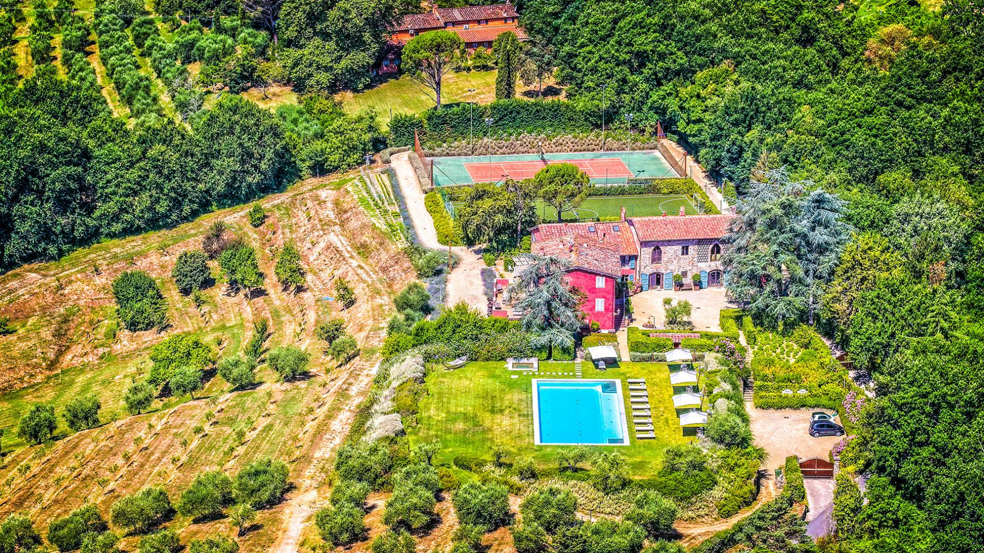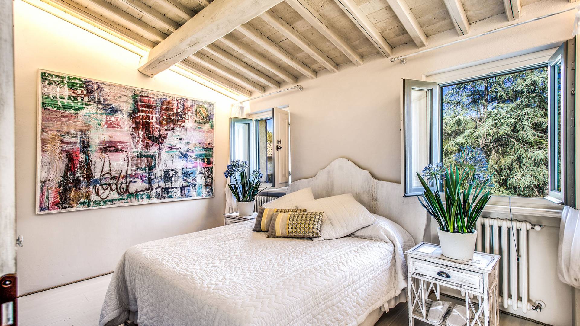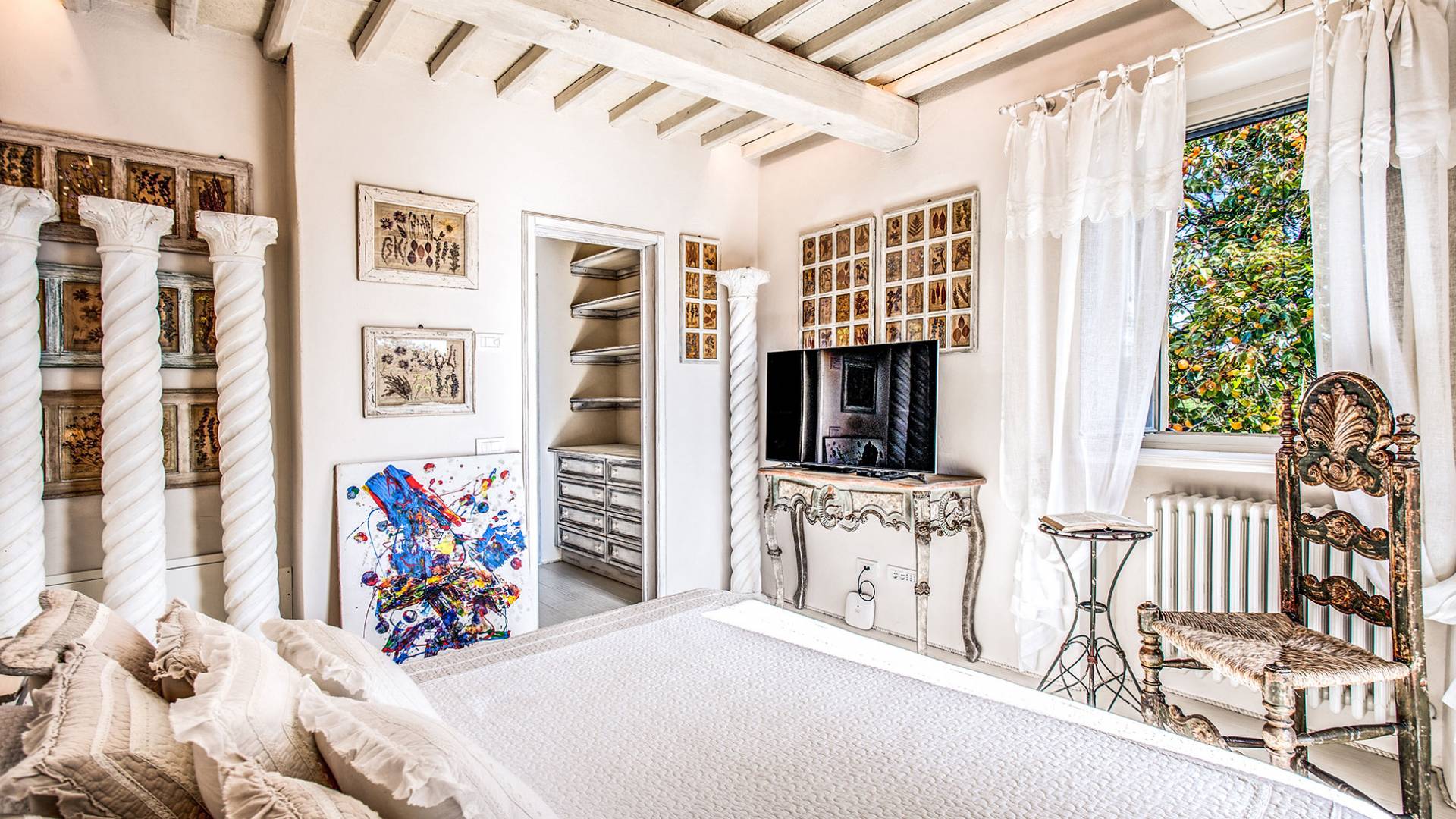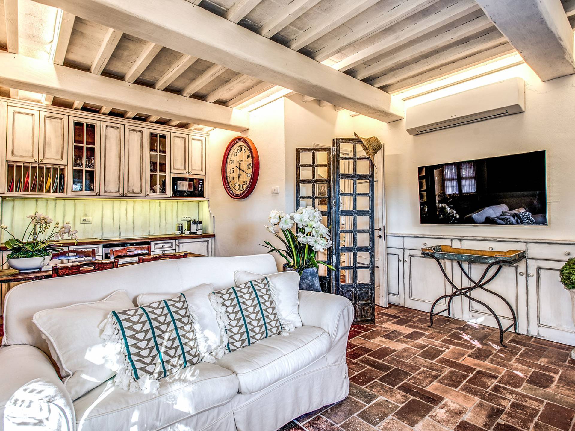 It is decorated in new-classic style with washed walls in pale shades, pietra serena and Italian wood. Countrymodern, the bohemian aesthetic of the property reflects its light and welcoming vibe: fresh and vintage, it oozes tranquillity and a home-like feeling which was exactly the intention of the owners, a couple of young artists and entrepreneurs dividing their time between Lucca, Forte dei Marmi, Ibiza and Geneva. The style encompasses traditional elements brought into the now with updated add-on’s for today’s lifestyles, offering a tennis court, a soccer field, a helipad, a pizza woodenoven and a security system with controlled circuit. Environmentally friendly and ecorestored, it also features a twenty metres heated swimming pool with view on the estate vineyards.